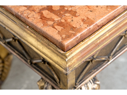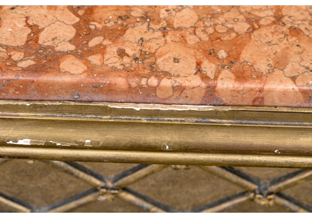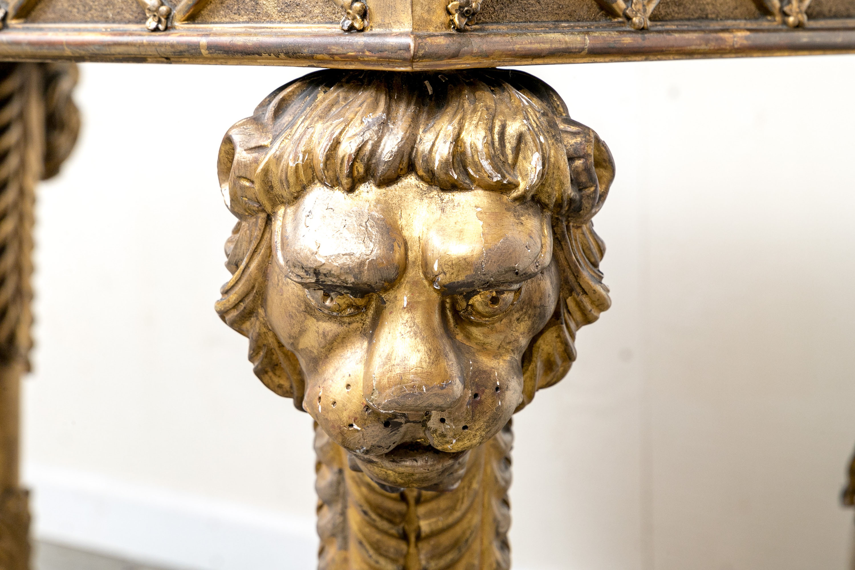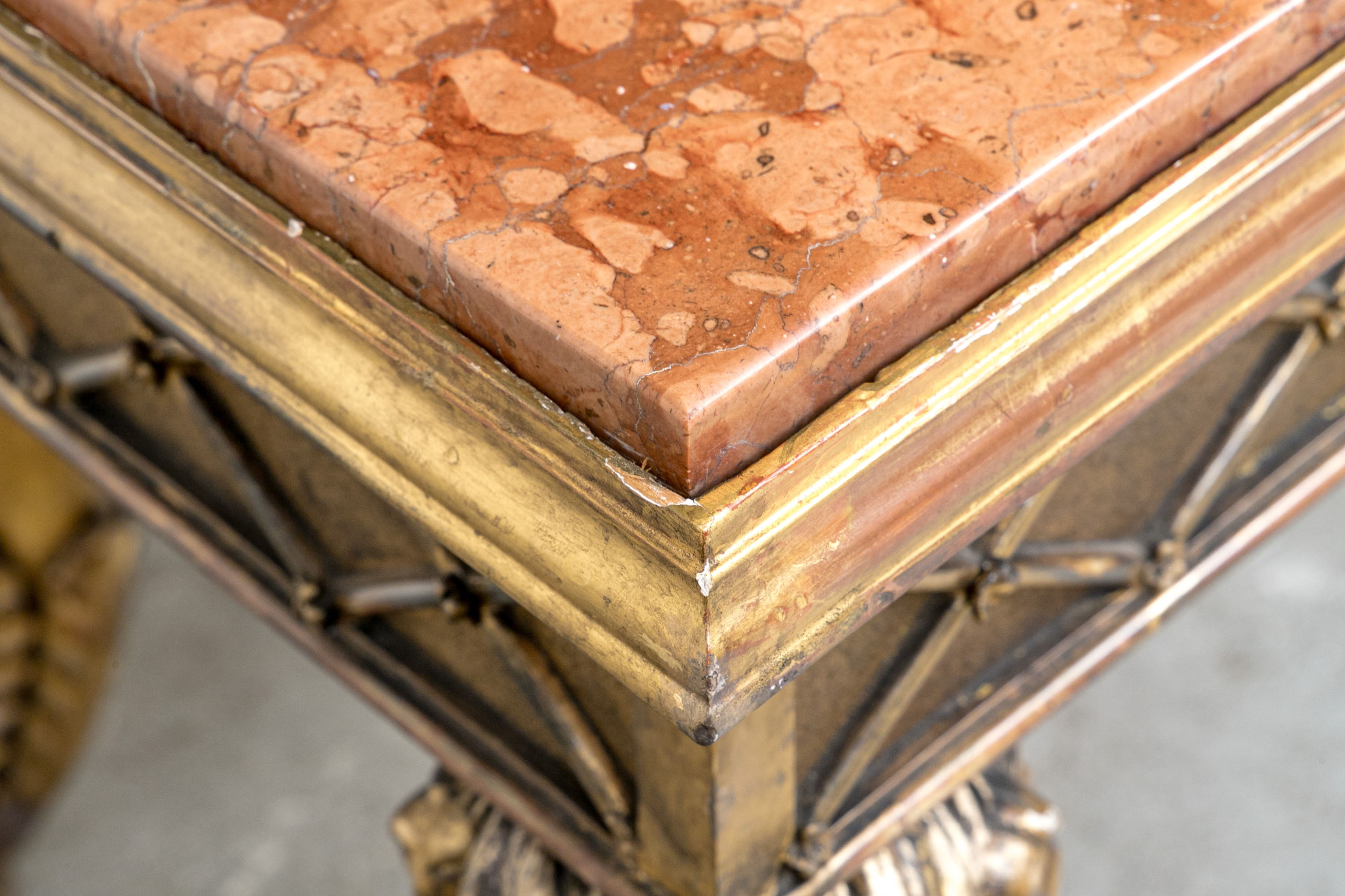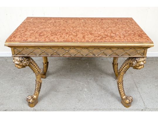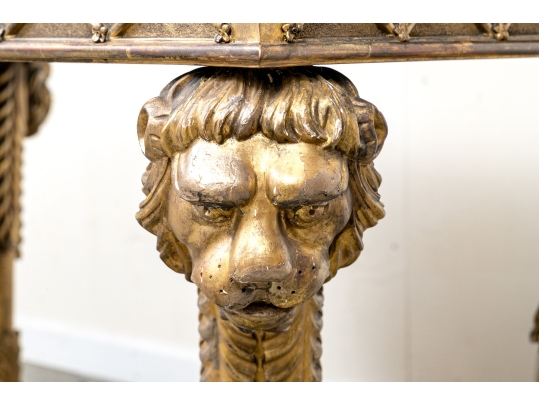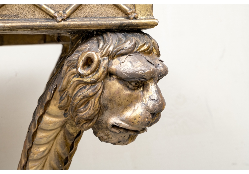 Pair of antique gilt console tables with inset rose marble tops. The console tables with raised lattice having flowers at intersections and surmounted on four open mouth lion head legs. The legs are carved and wrapped with dimensional leaves and terminating with bold paw feet on conforming plinths.