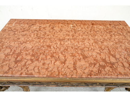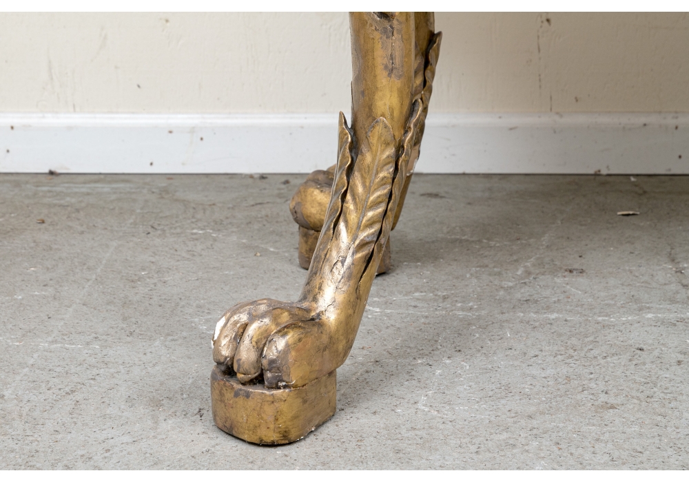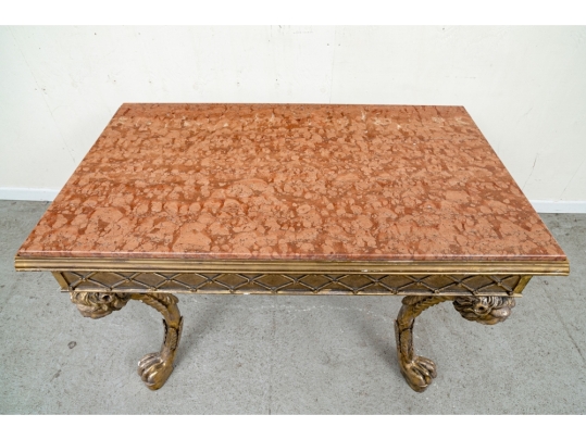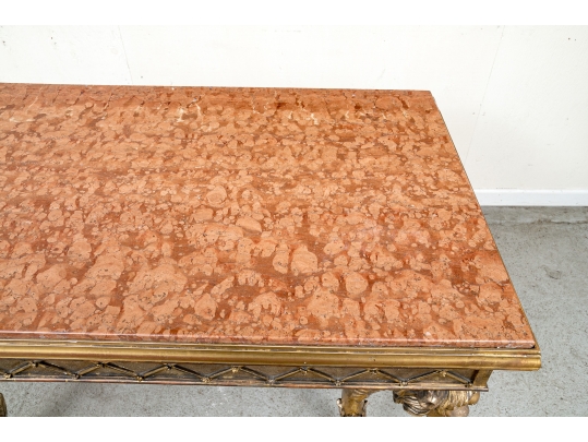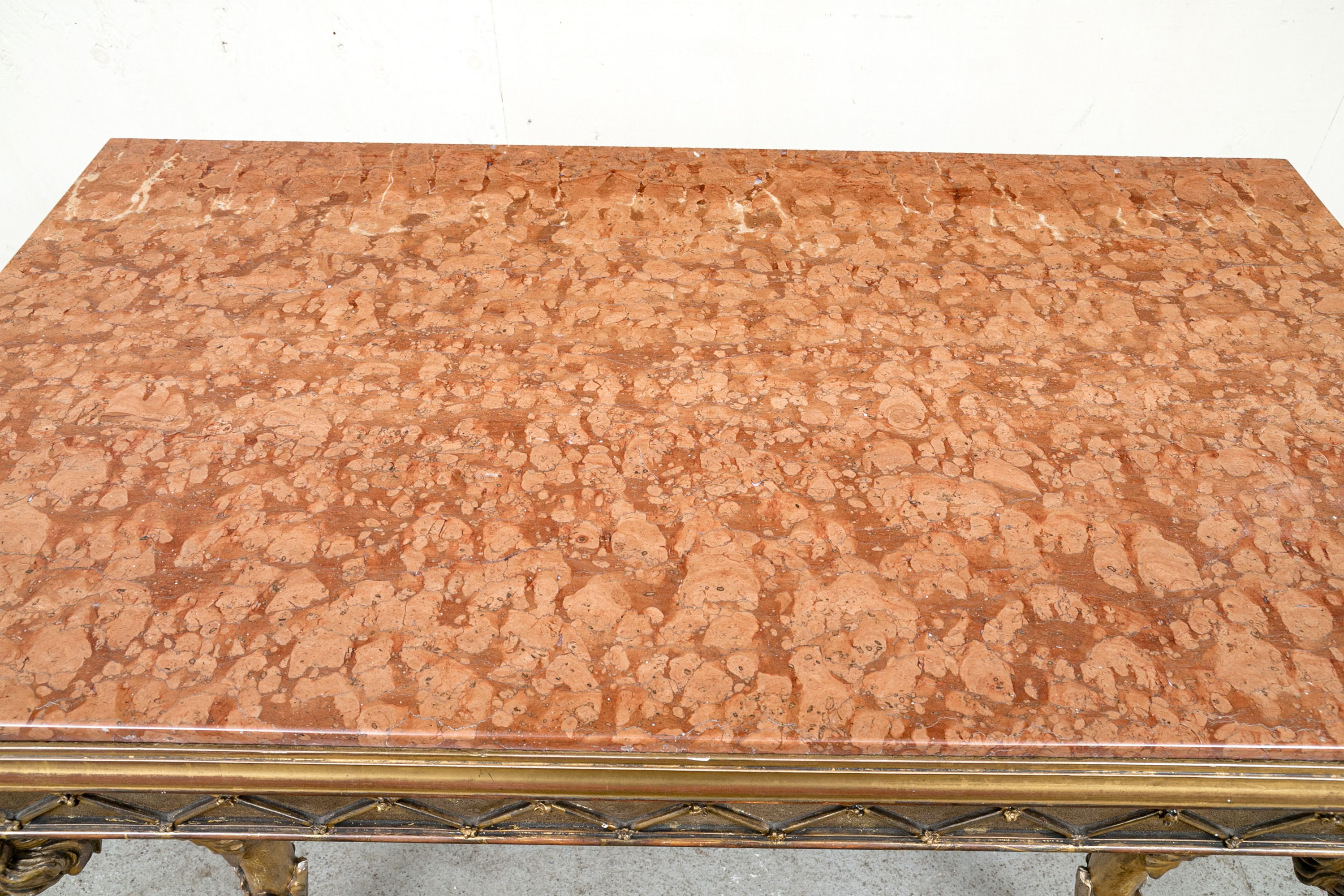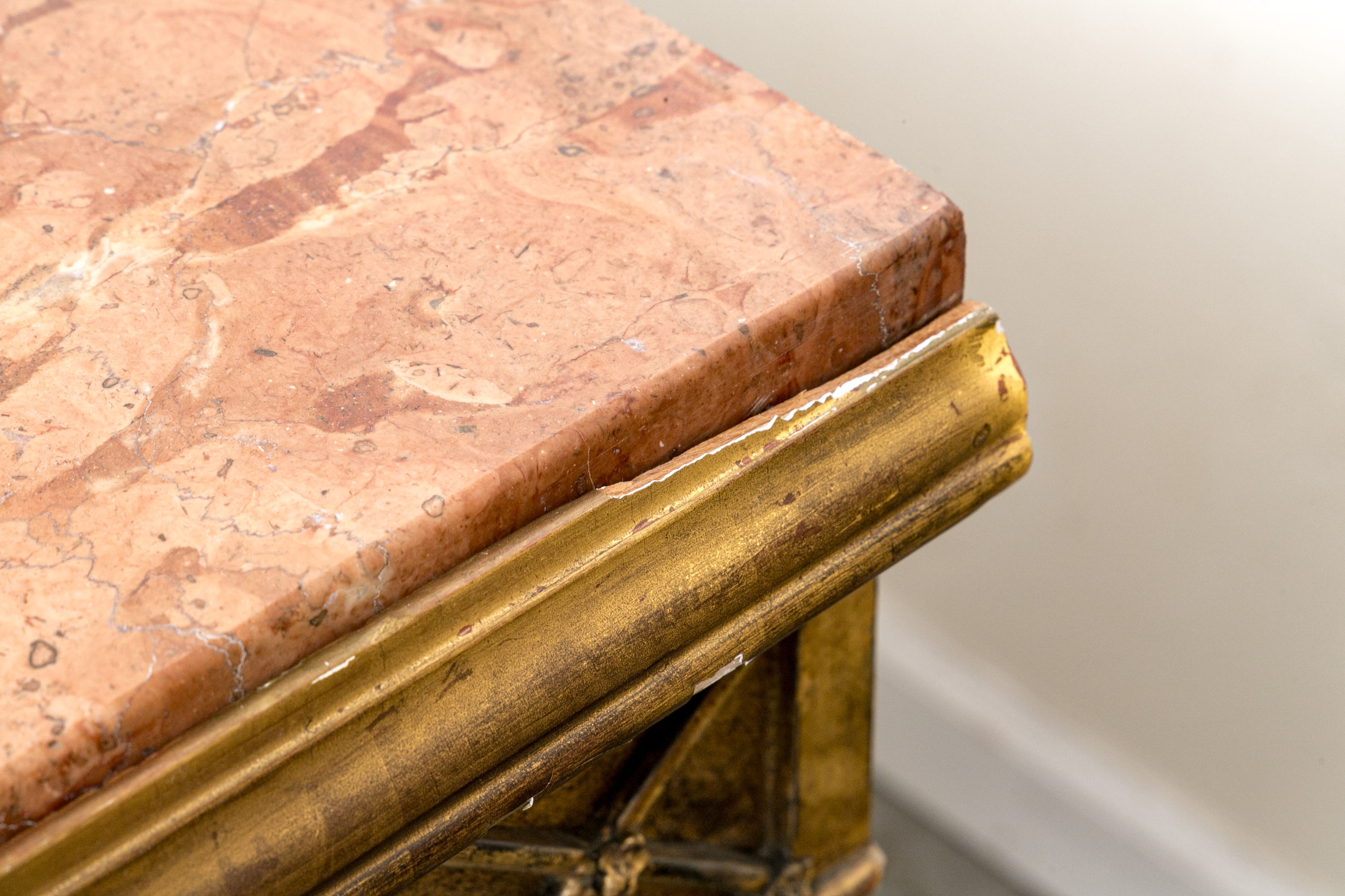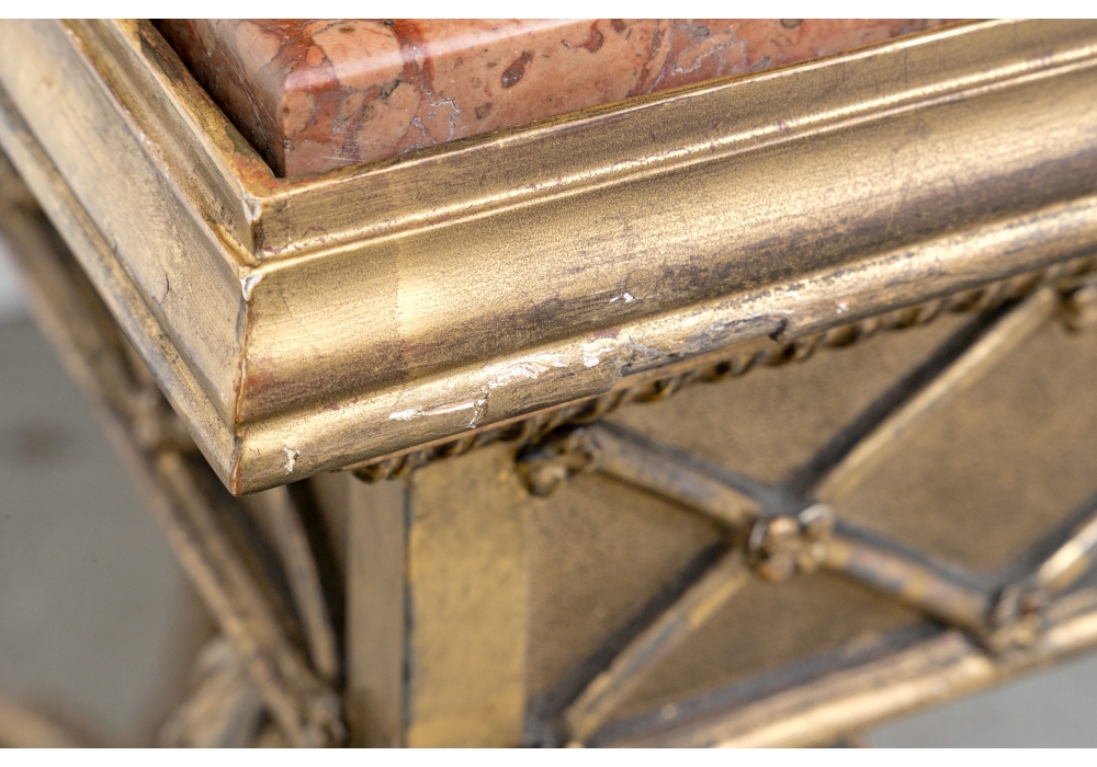 Pair of antique gilt console tables with inset rose marble tops. The console tables with raised lattice having flowers at intersections and surmounted on four open mouth lion head legs. The legs are carved and wrapped with dimensional leaves and terminating with bold paw feet on conforming plinths.