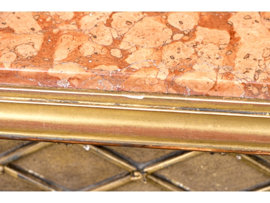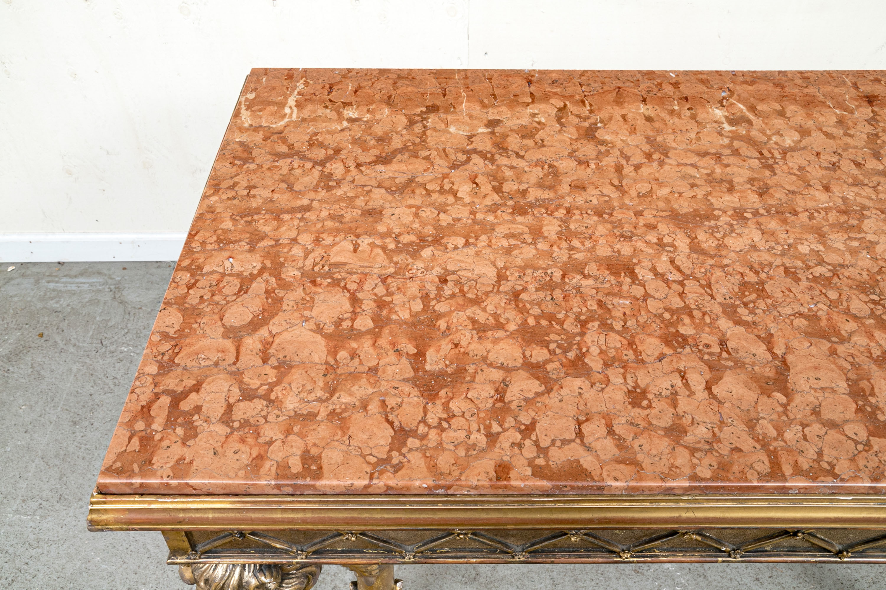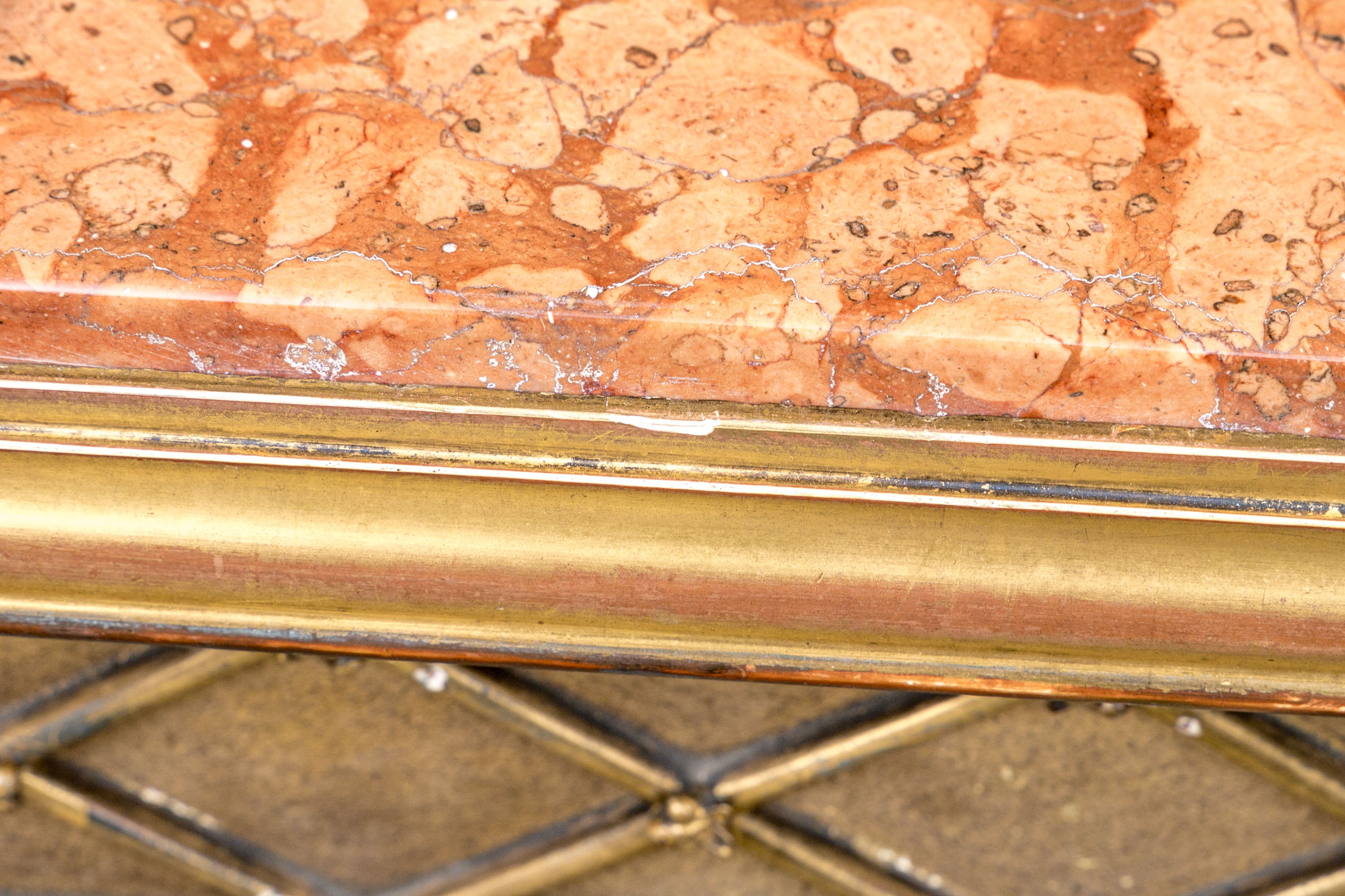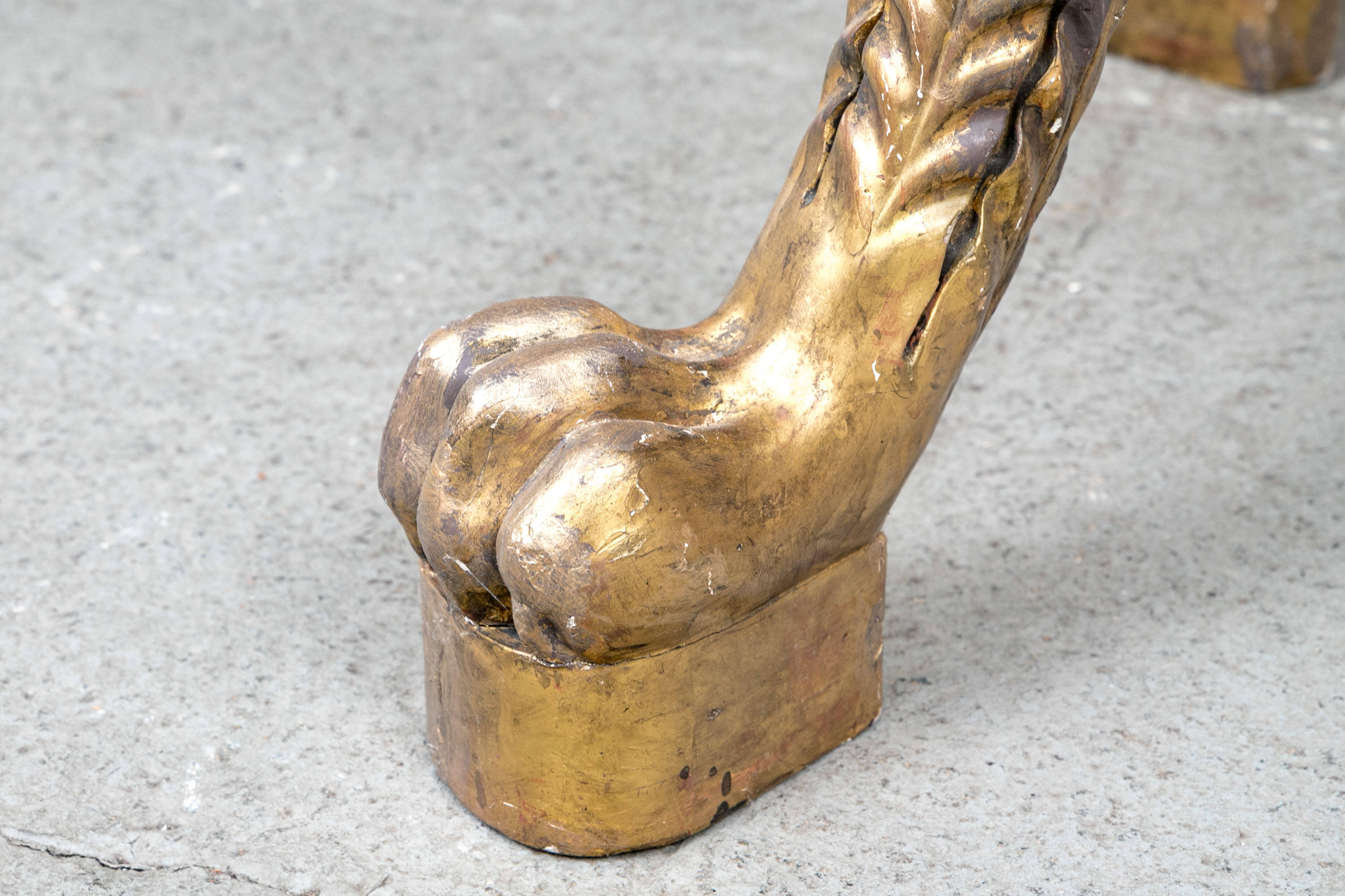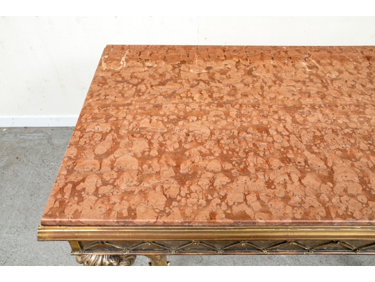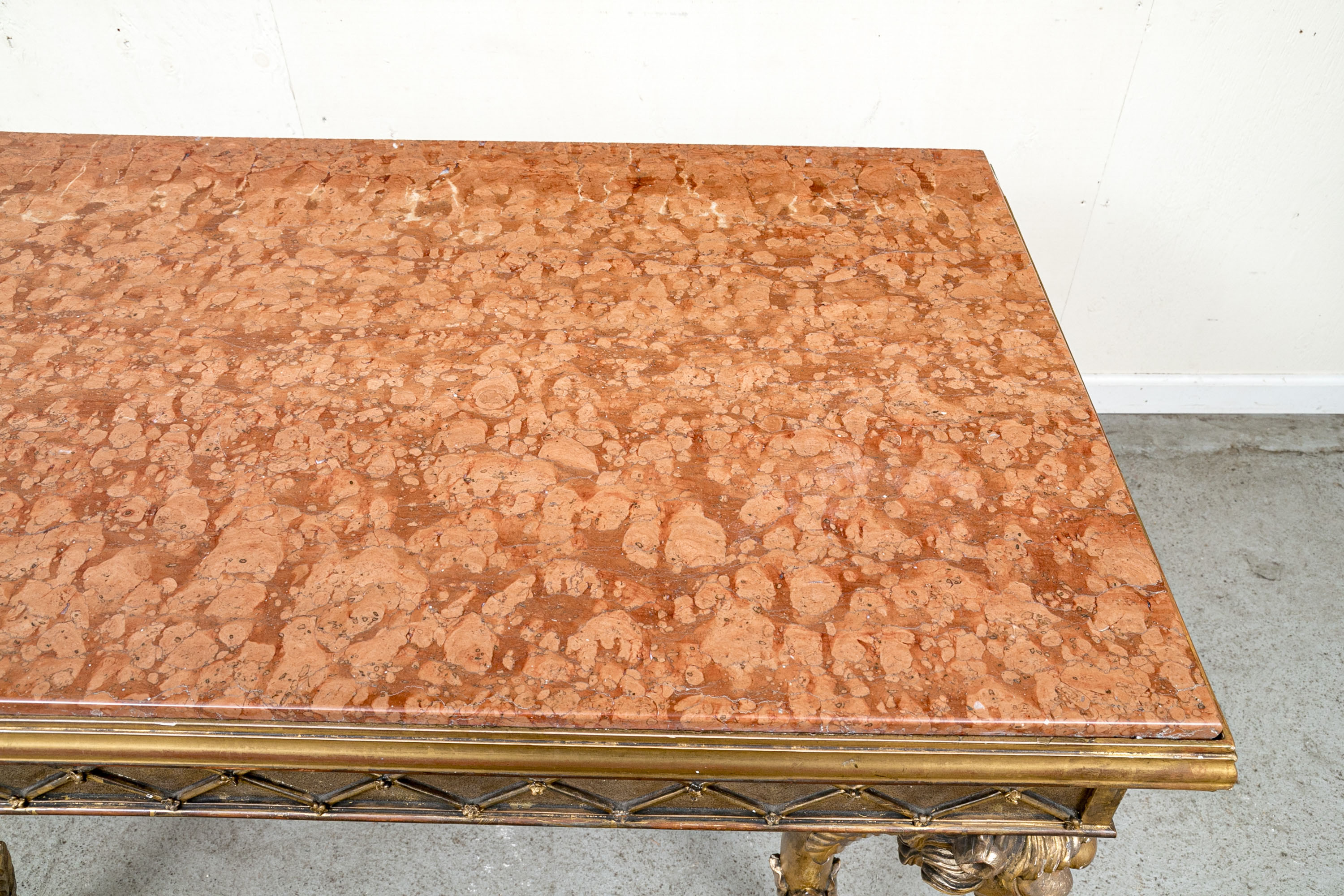 Pair of antique gilt console tables with inset rose marble tops. The console tables with raised lattice having flowers at intersections and surmounted on four open mouth lion head legs. The legs are carved and wrapped with dimensional leaves and terminating with bold paw feet on conforming plinths.