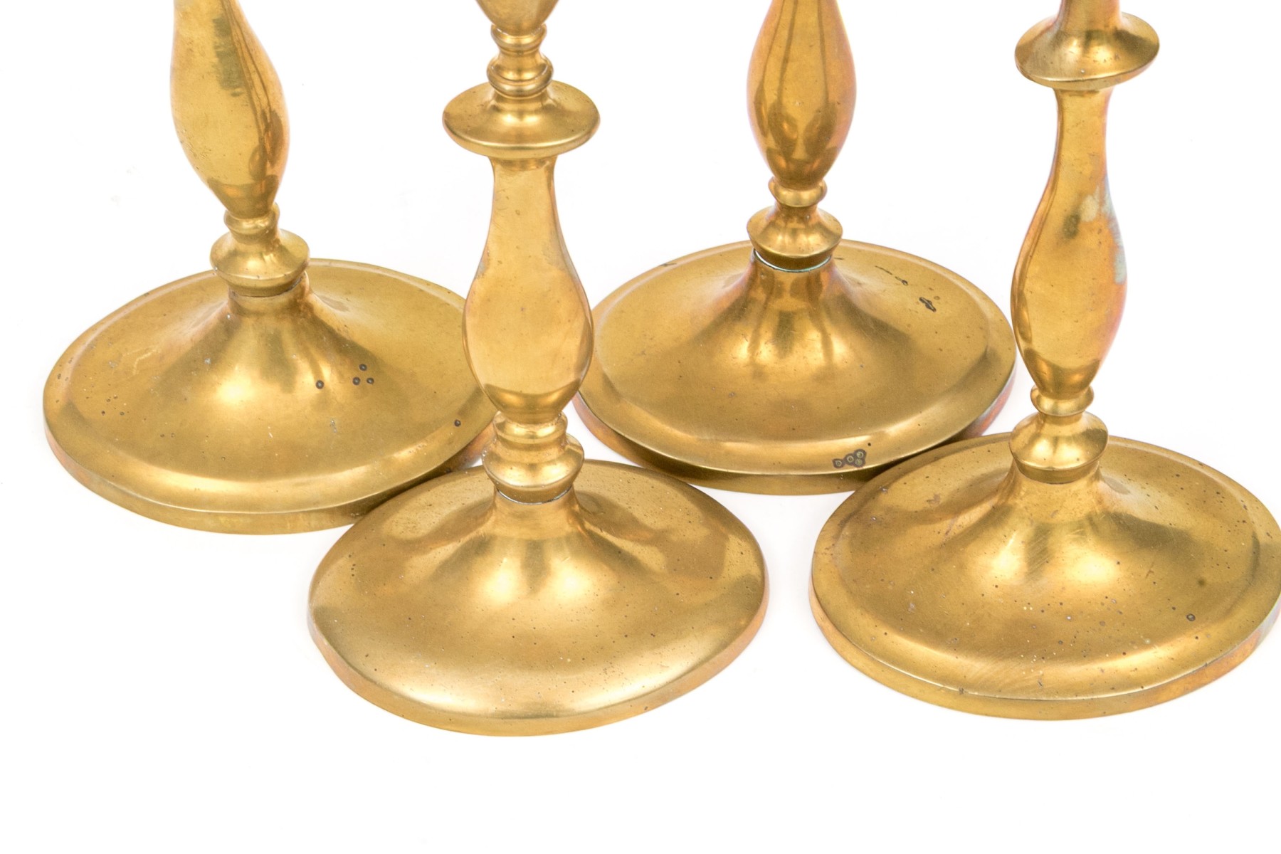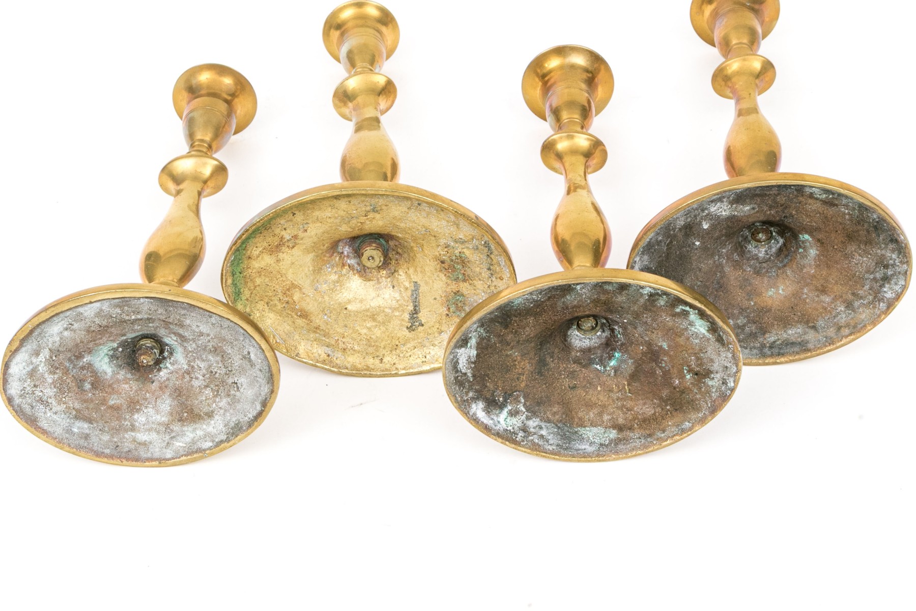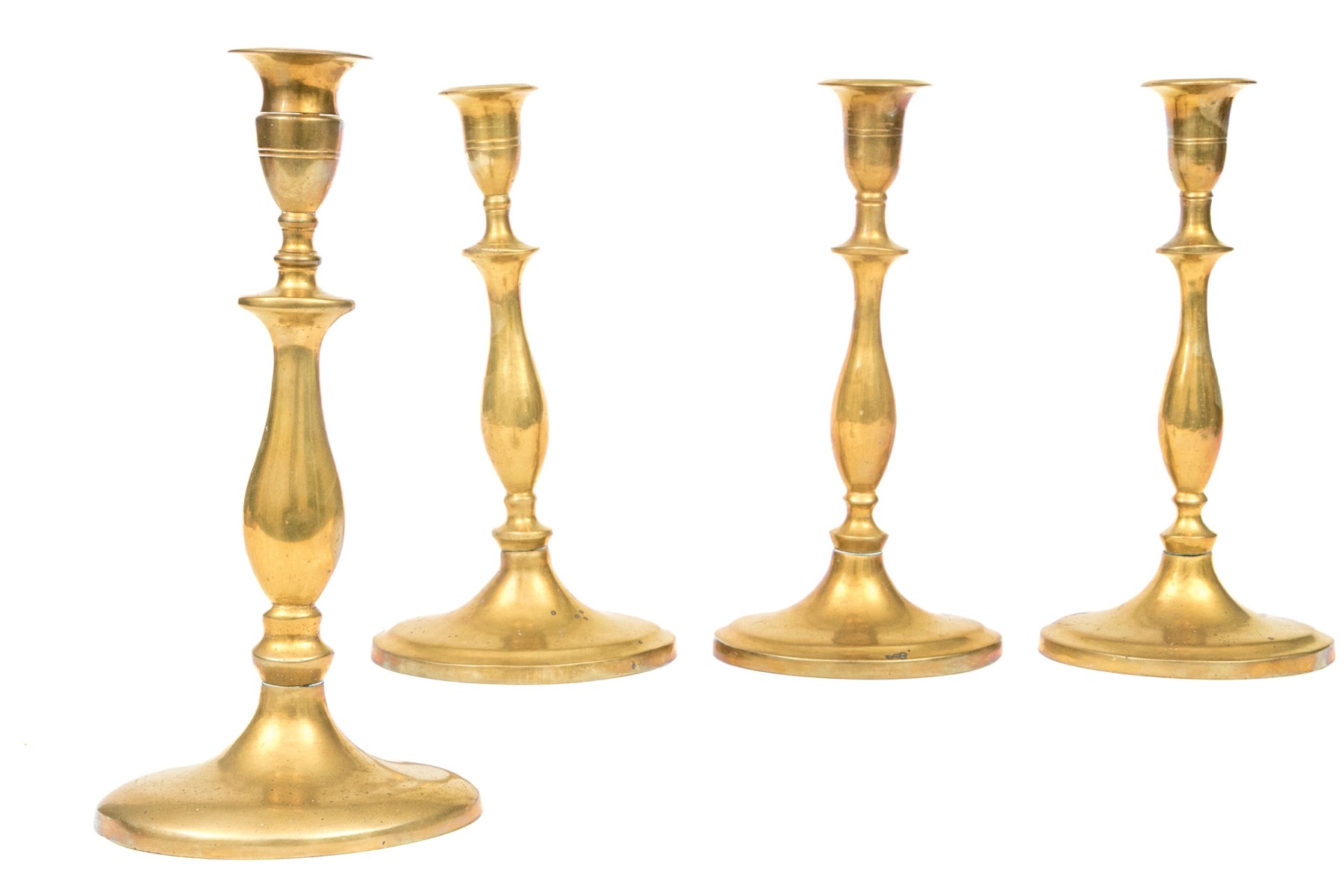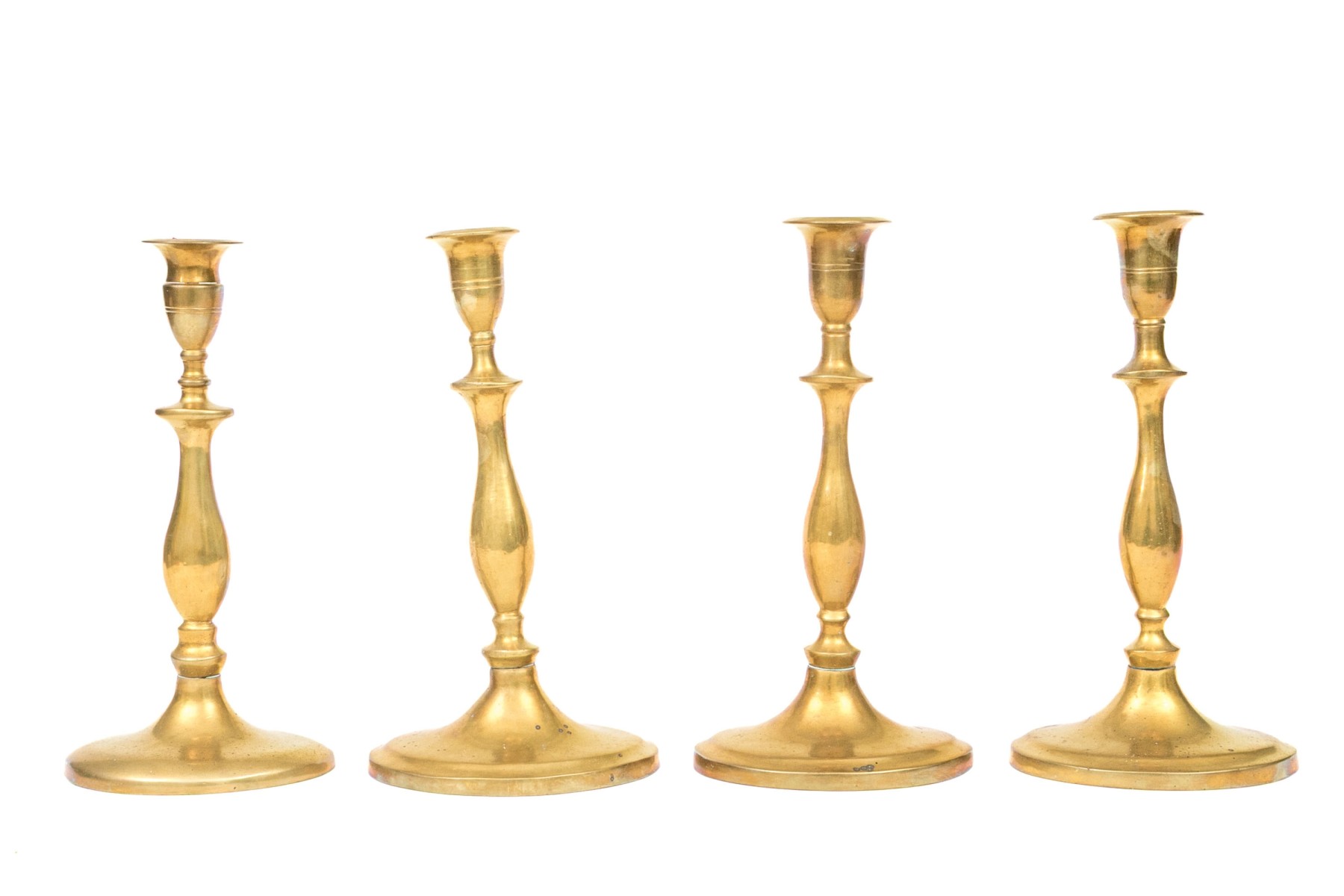 A lovely group of four antique brass candlesticks including three in matching form and one in a similar design.