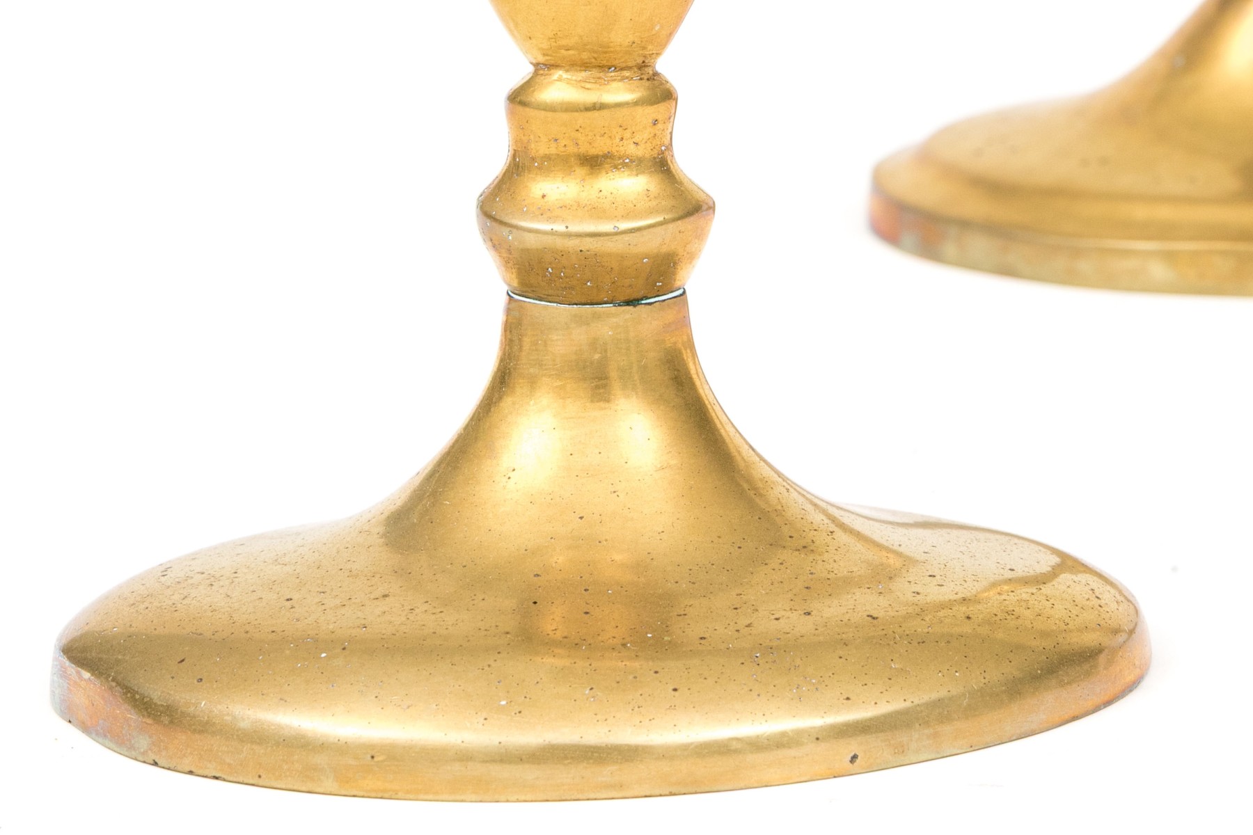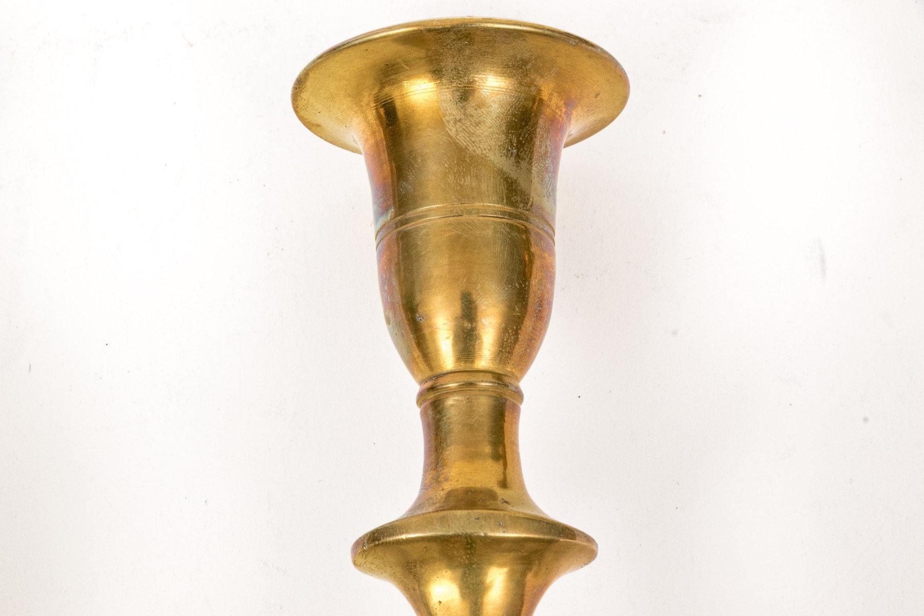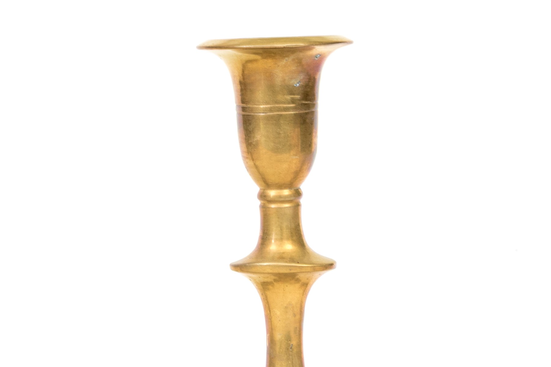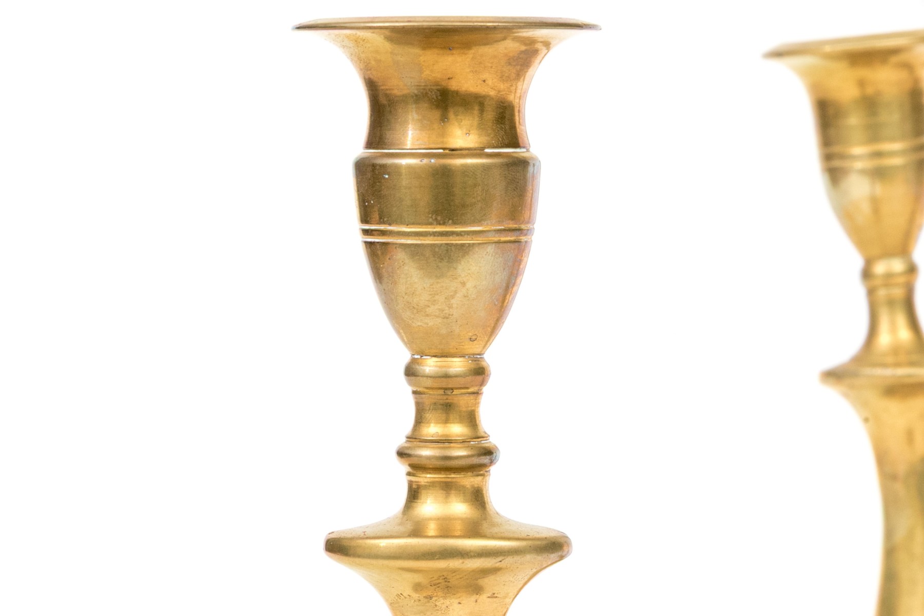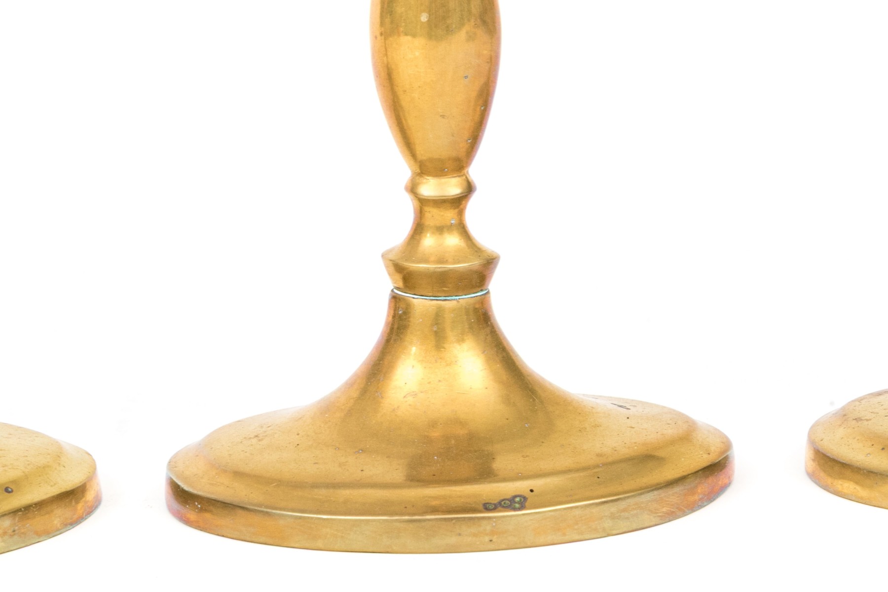 A lovely group of four antique brass candlesticks including three in matching form and one in a similar design.