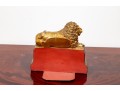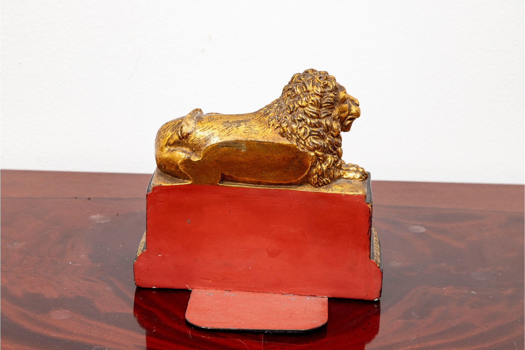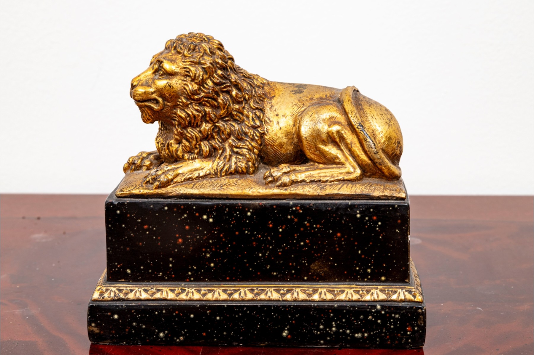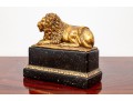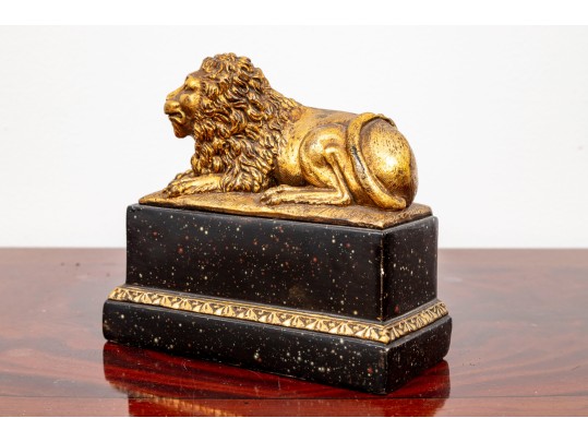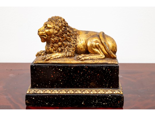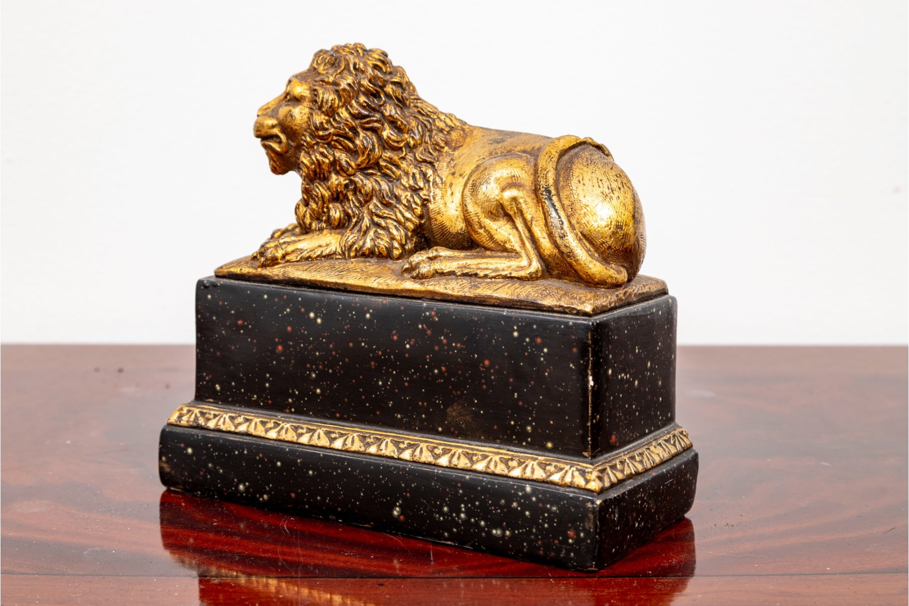 A single composite lion bookend, majestically poised atop a black pedestal base.