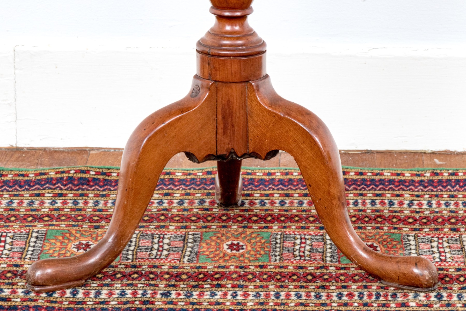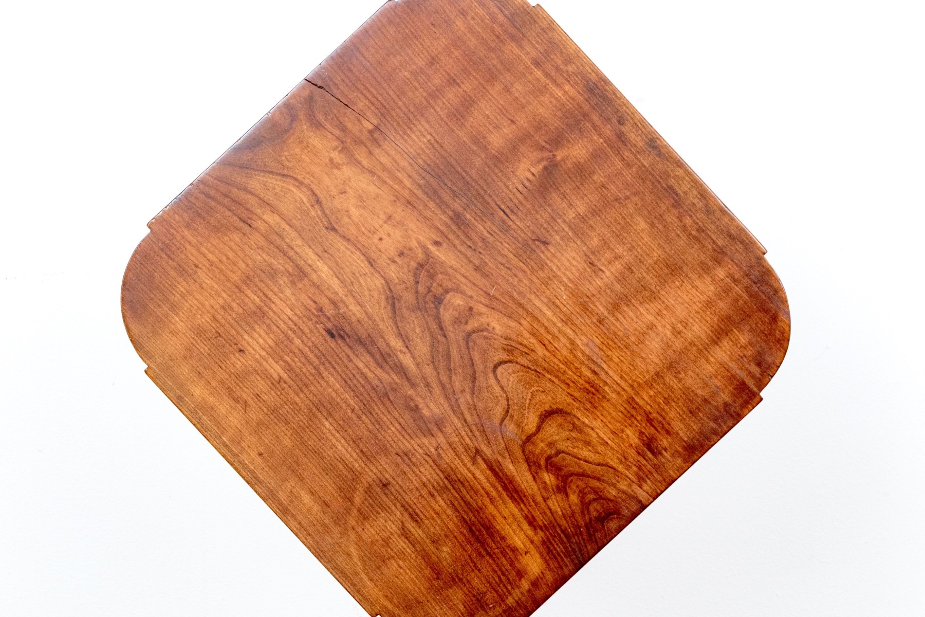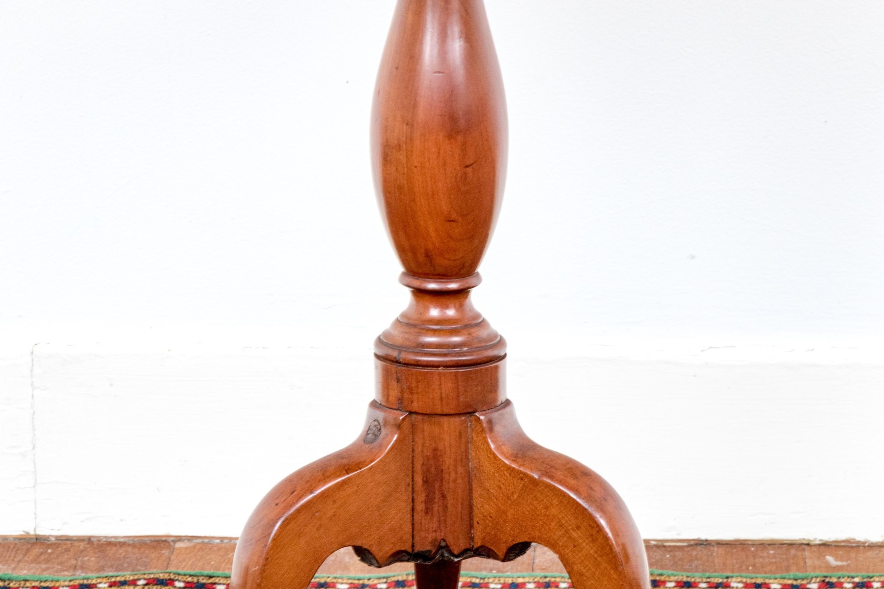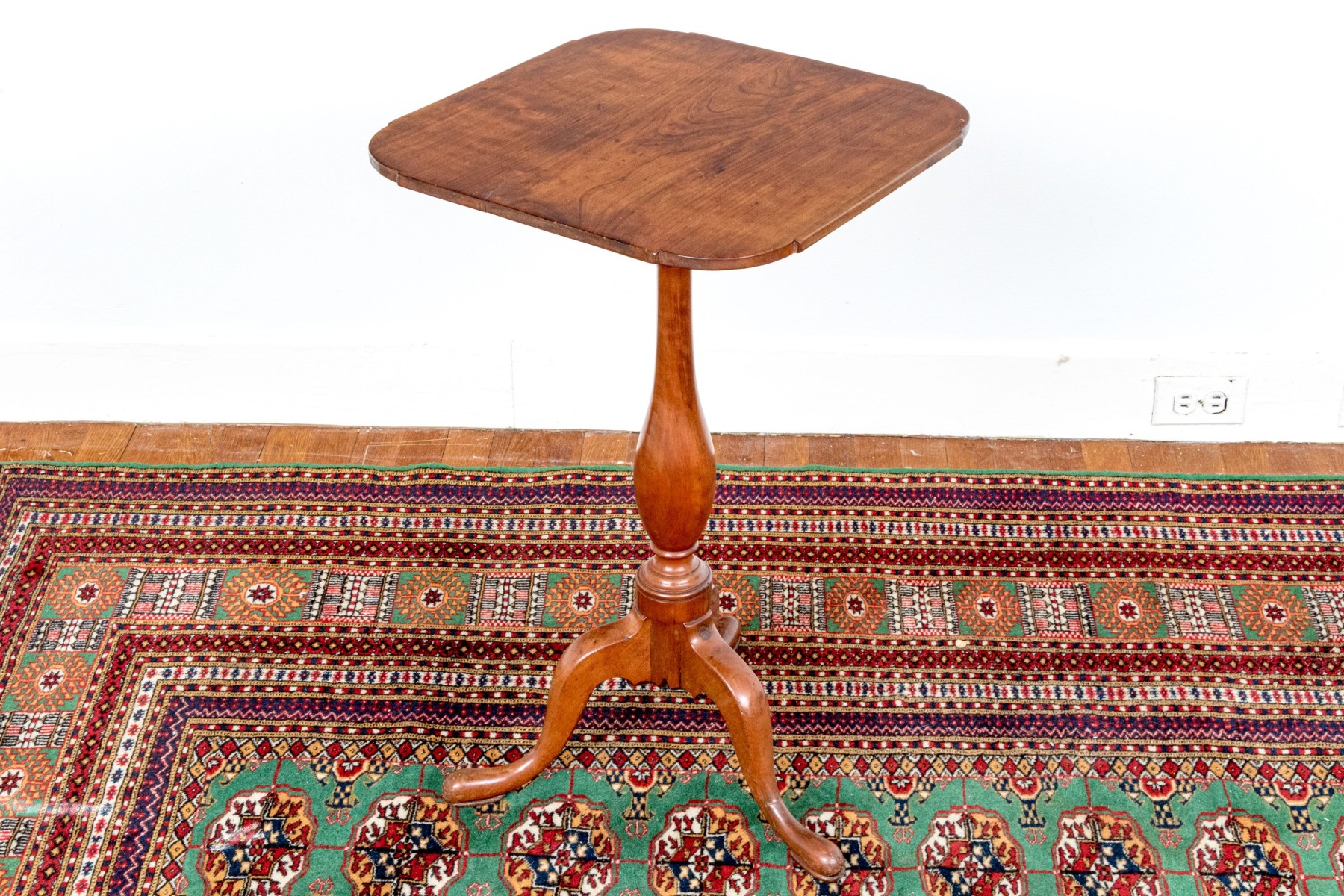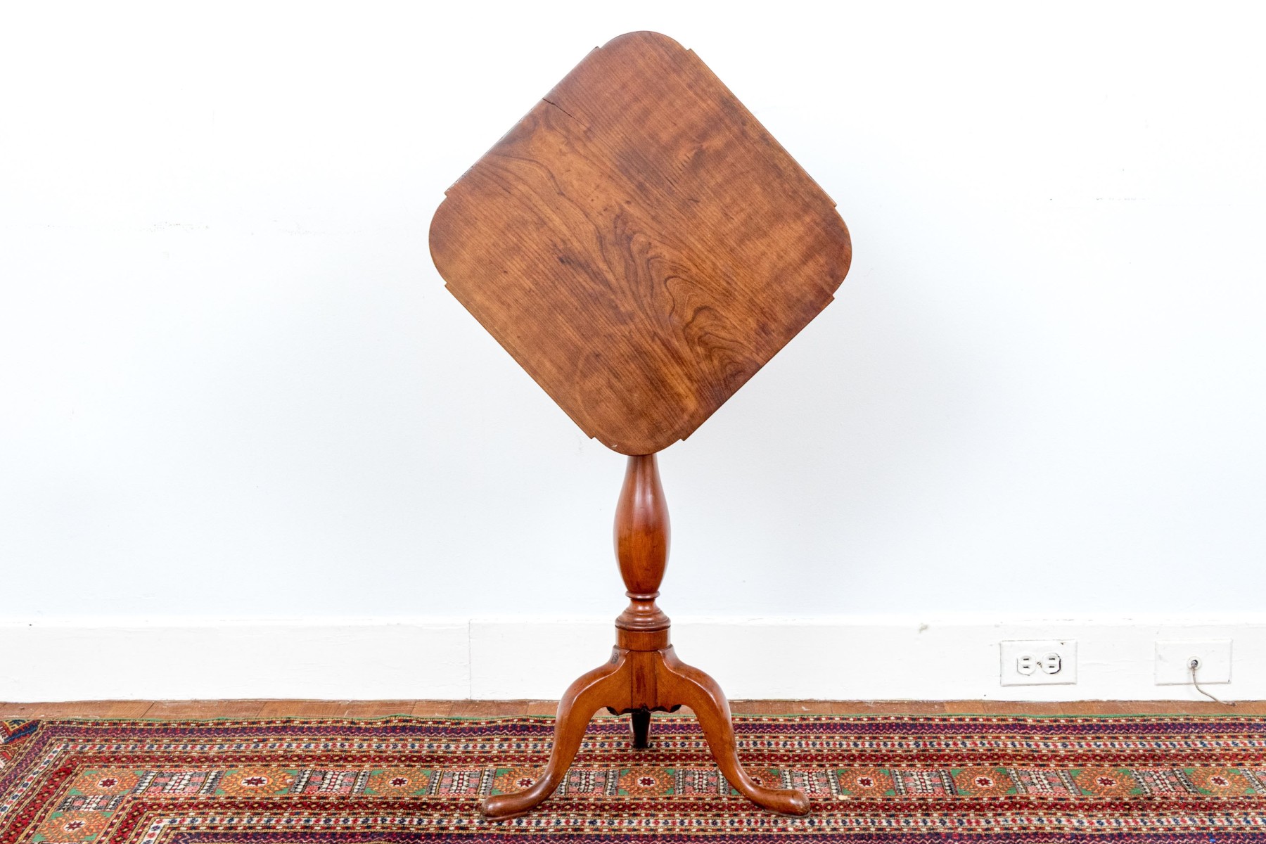 A handsome antique tilt top candle stand perfect for use as an end table, wine stand, or plant stand, well crafted in rich, warm-toned cherry wood. The table sports a square top with rounded corners and gorgeous wood grain supported by a baluster column atop three cabriole legs with slipper feet.