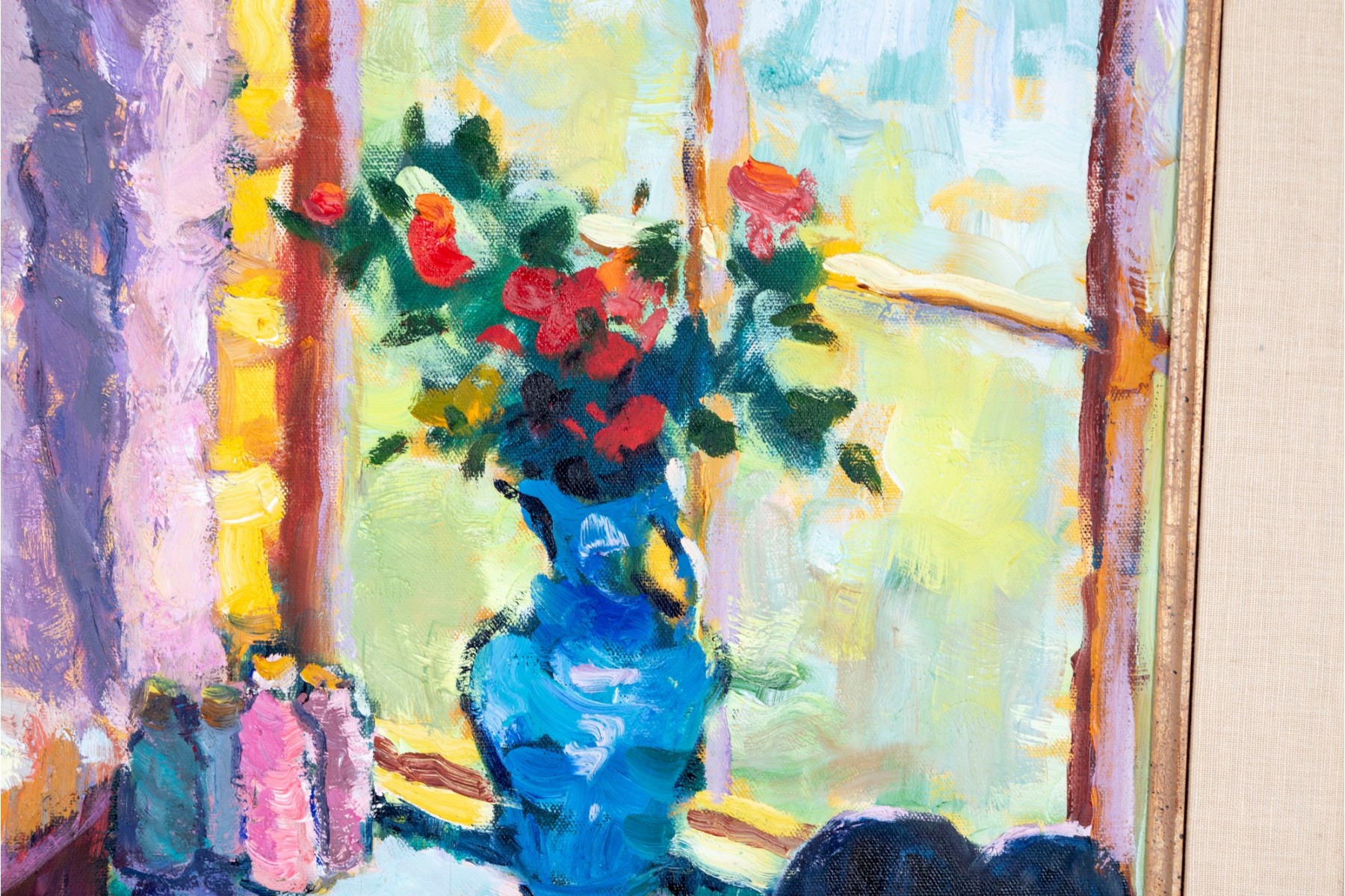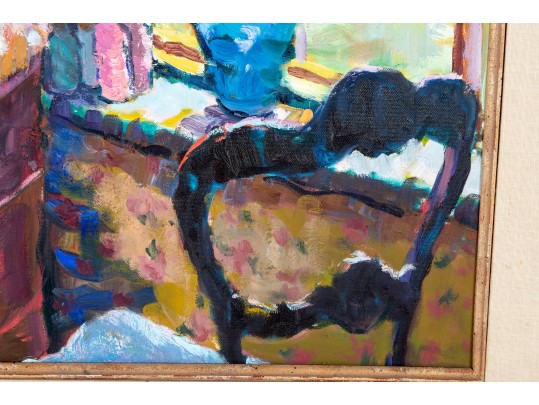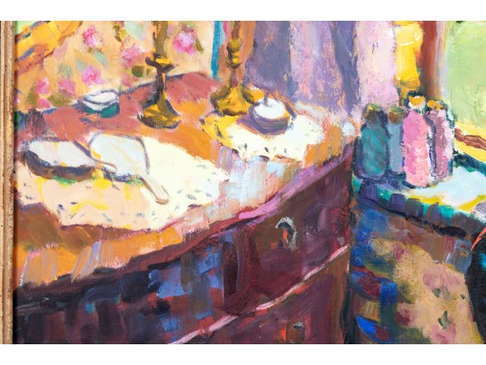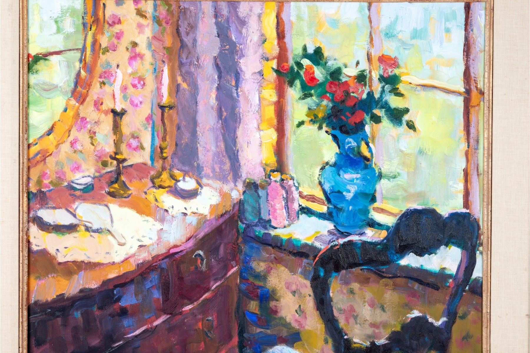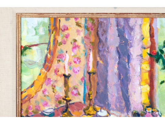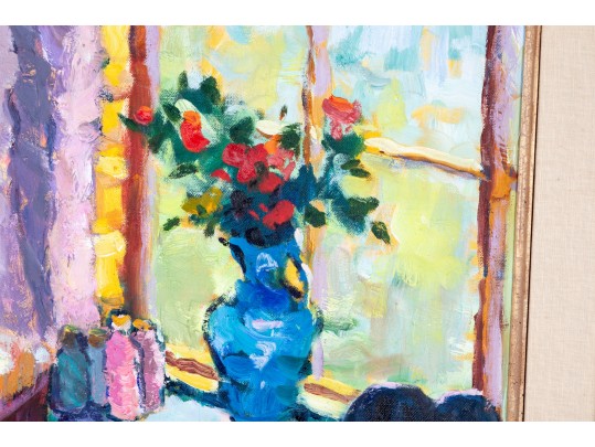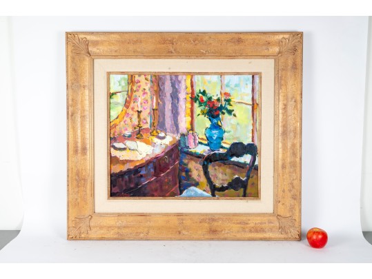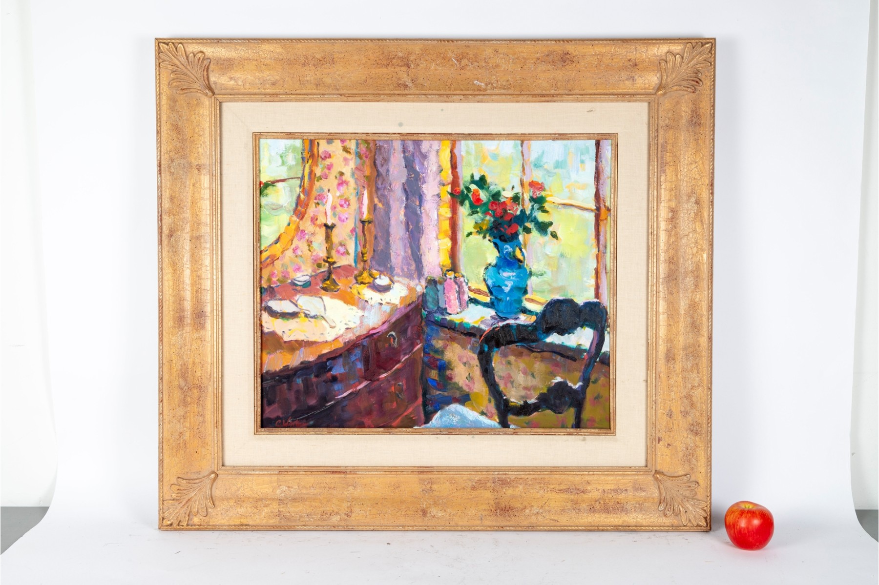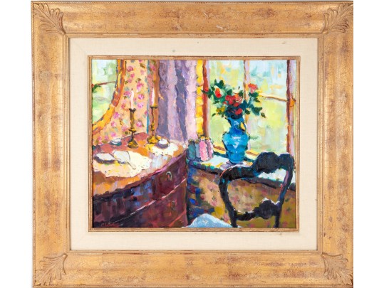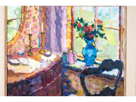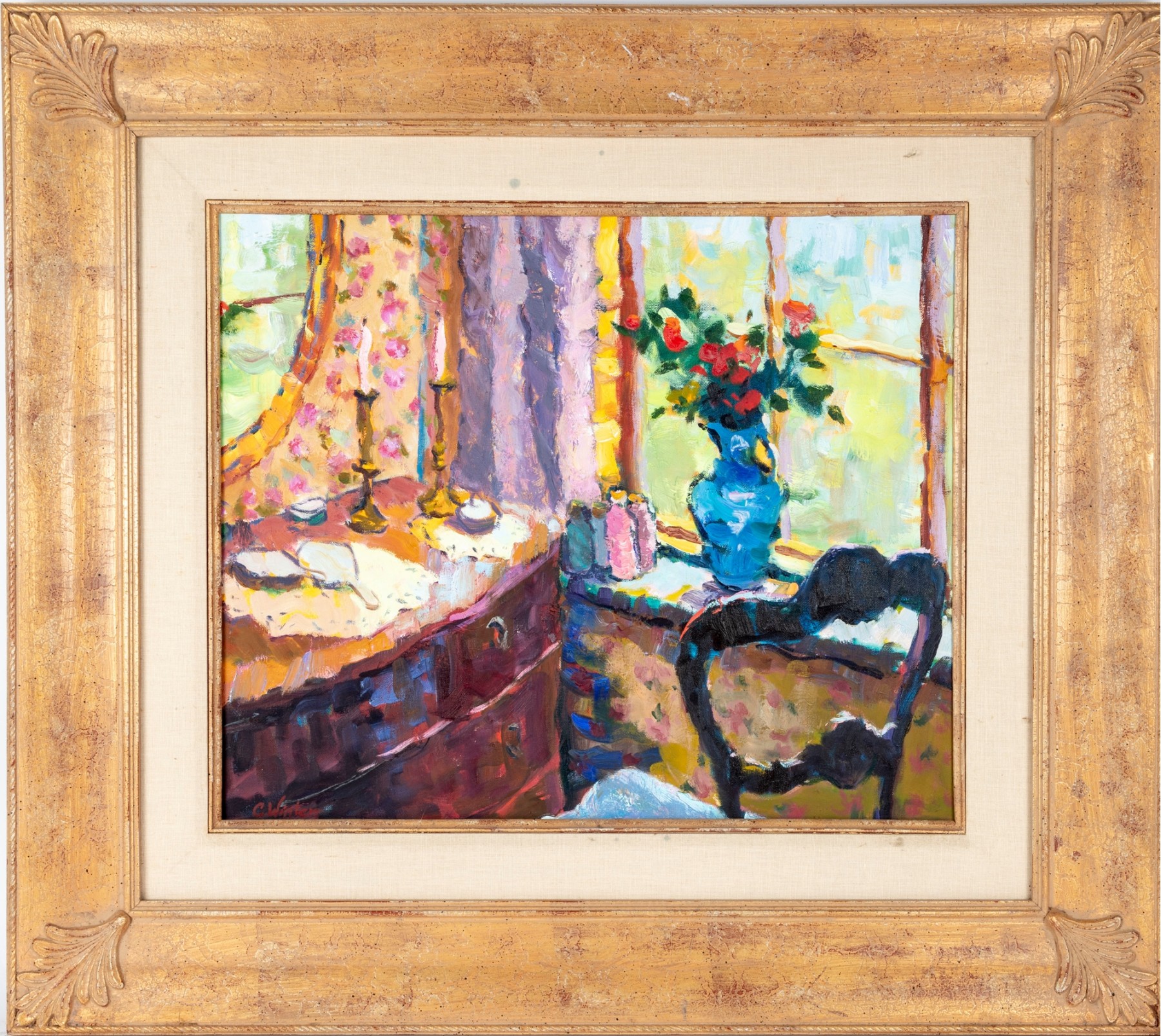 Connie Winters (American [NC], 20th C.) "Window Dressing" oil painting on canvas depicting a quaint interior scene with a chair near a bowfront dresser and round gilt mirror beside a windowsill decorated with a blue vase burgeoning with dappled red flowers, complementing yellow wallpaper with pink rose motifs. Signed lower left and on the canvas verso, titled on the stretcher.