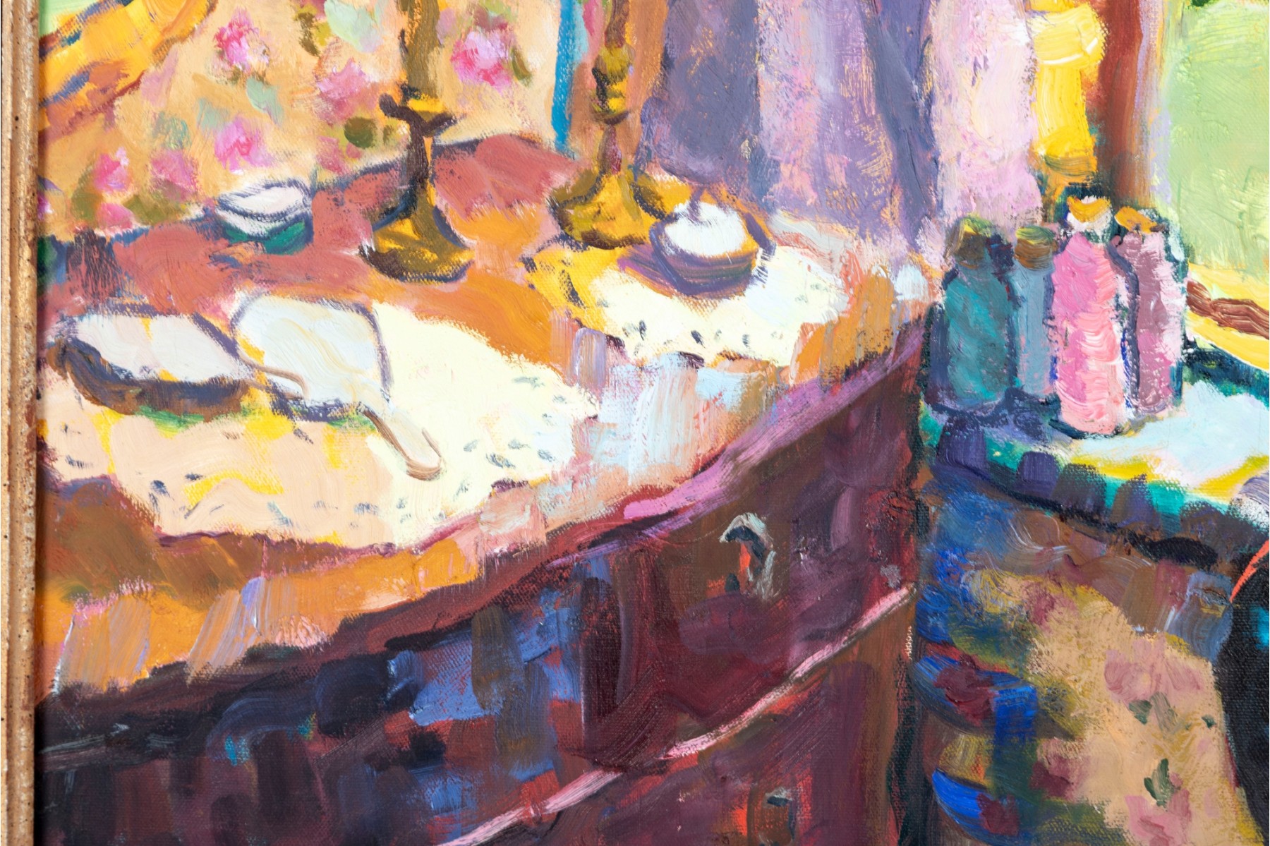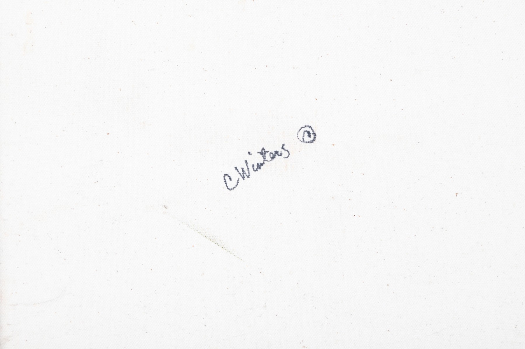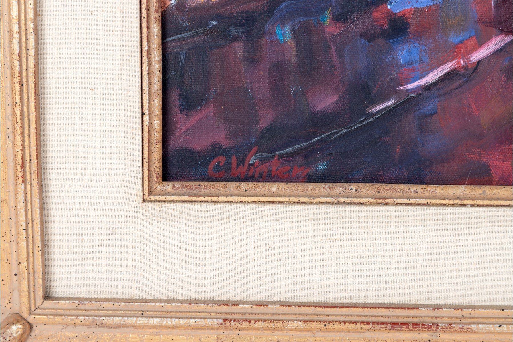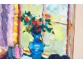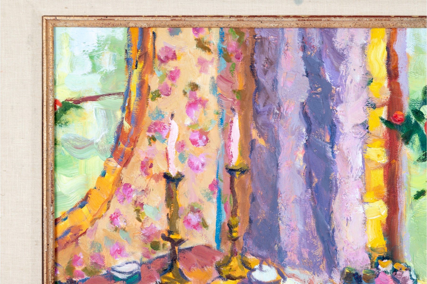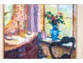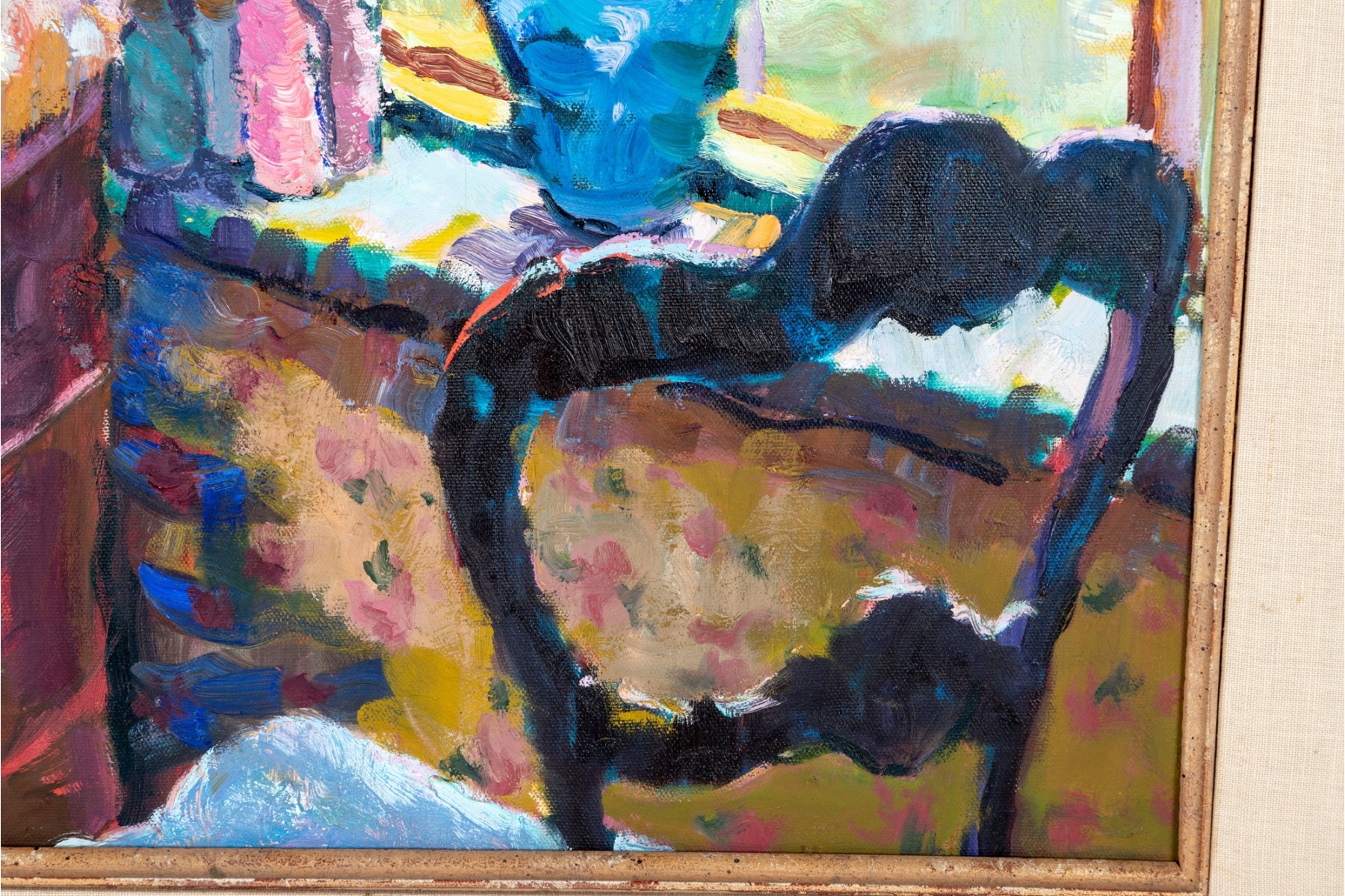 Connie Winters (American [NC], 20th C.) "Window Dressing" oil painting on canvas depicting a quaint interior scene with a chair near a bowfront dresser and round gilt mirror beside a windowsill decorated with a blue vase burgeoning with dappled red flowers, complementing yellow wallpaper with pink rose motifs. Signed lower left and on the canvas verso, titled on the stretcher.