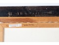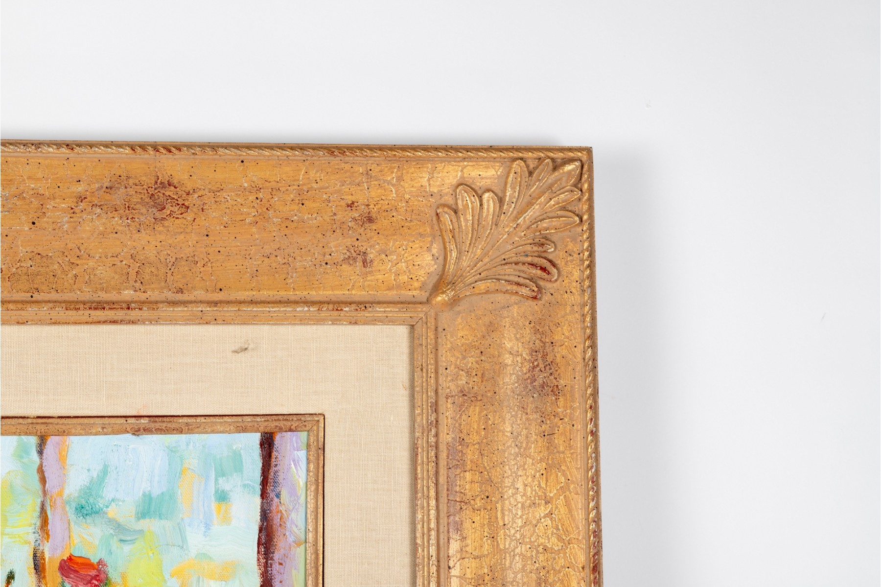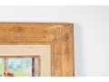 Displayed with a linen liner and fillet in a rustic gilt frame with carved leaf motifs at the corners.