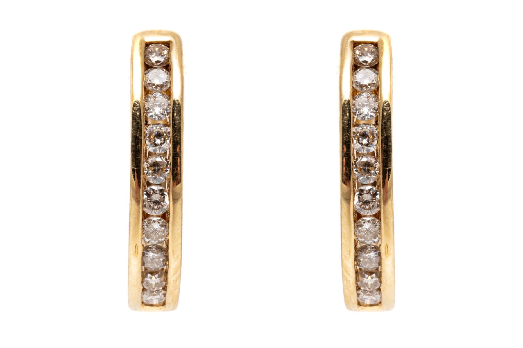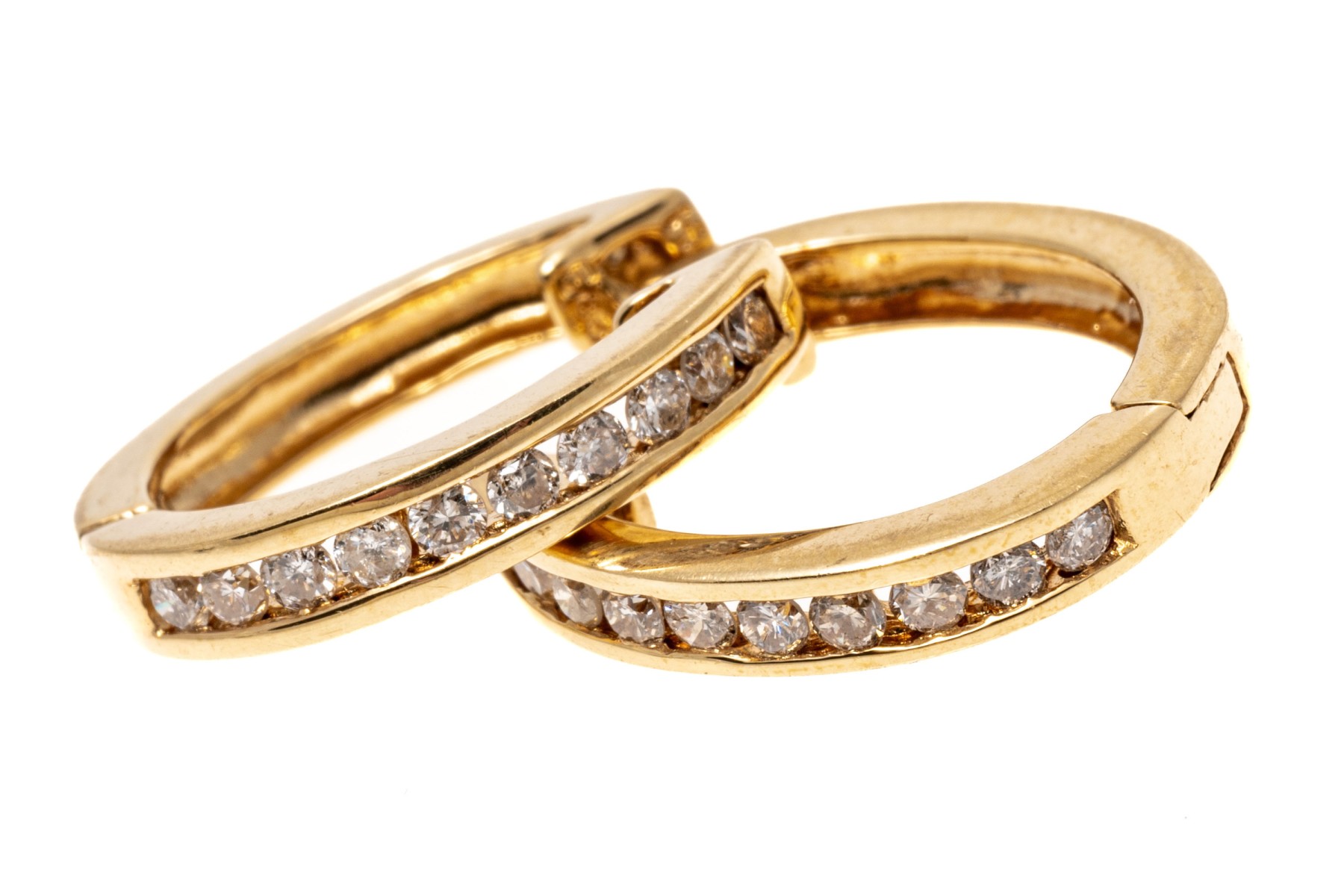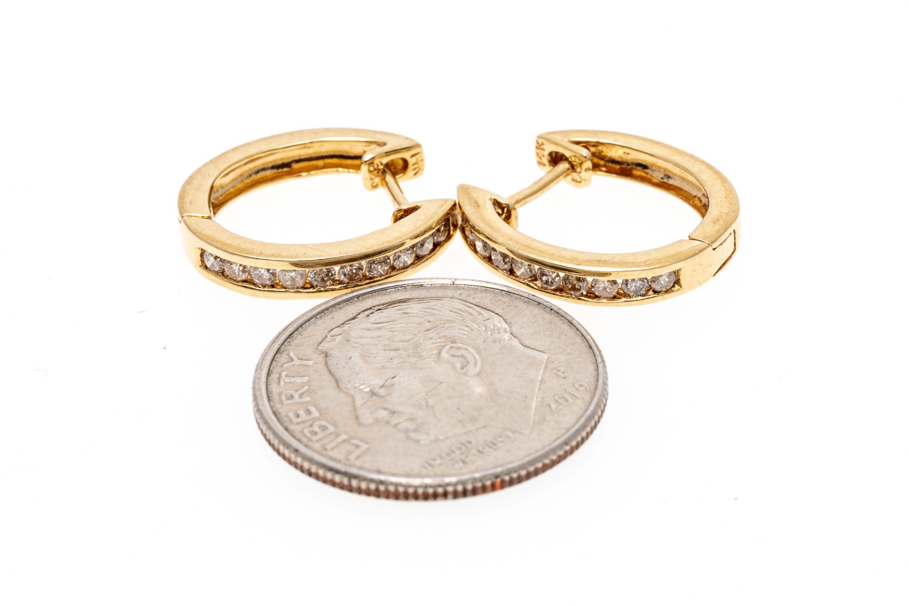 A pair of stylish, contemporary yellow gold huggie hoop earrings displaying front channels of round brilliant cut diamonds, approximately 0.36 TCW. Finished with latch back posts.