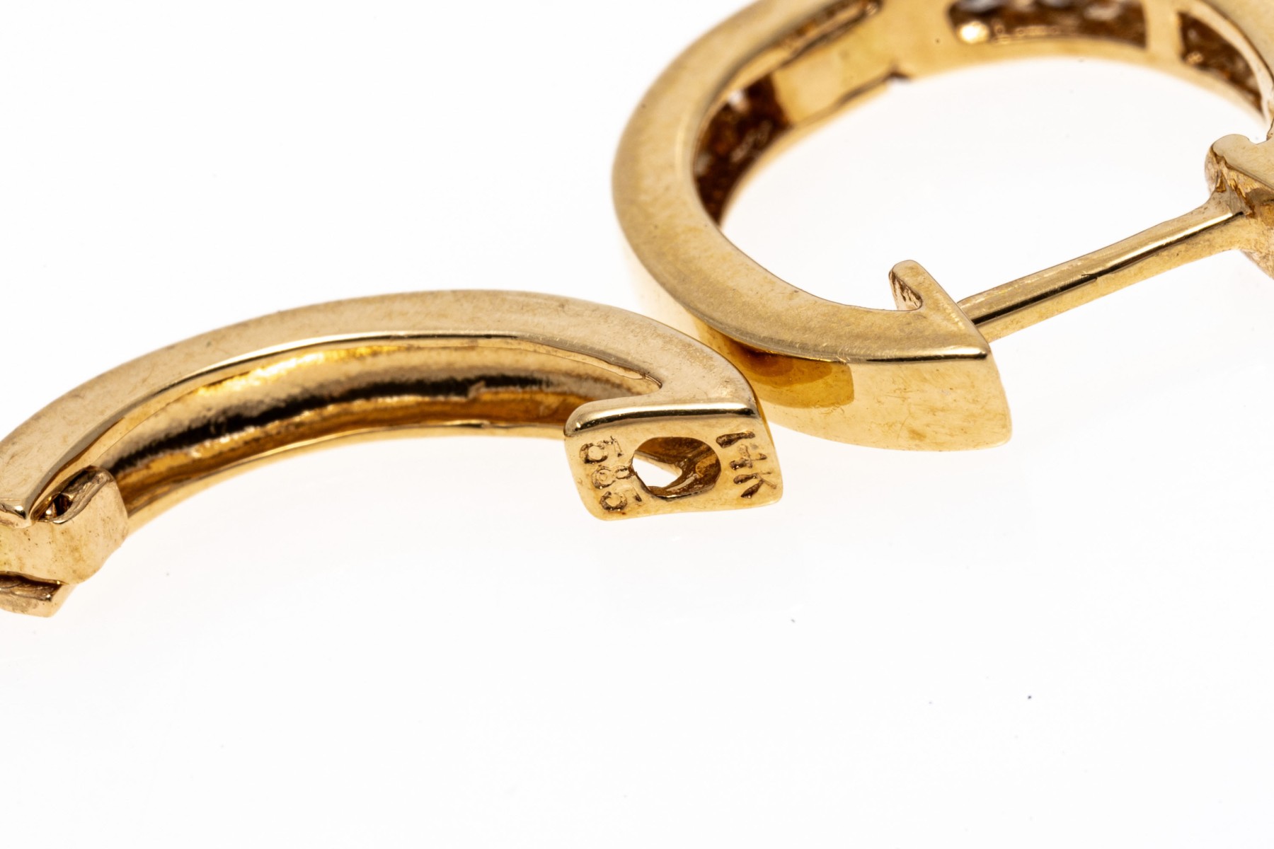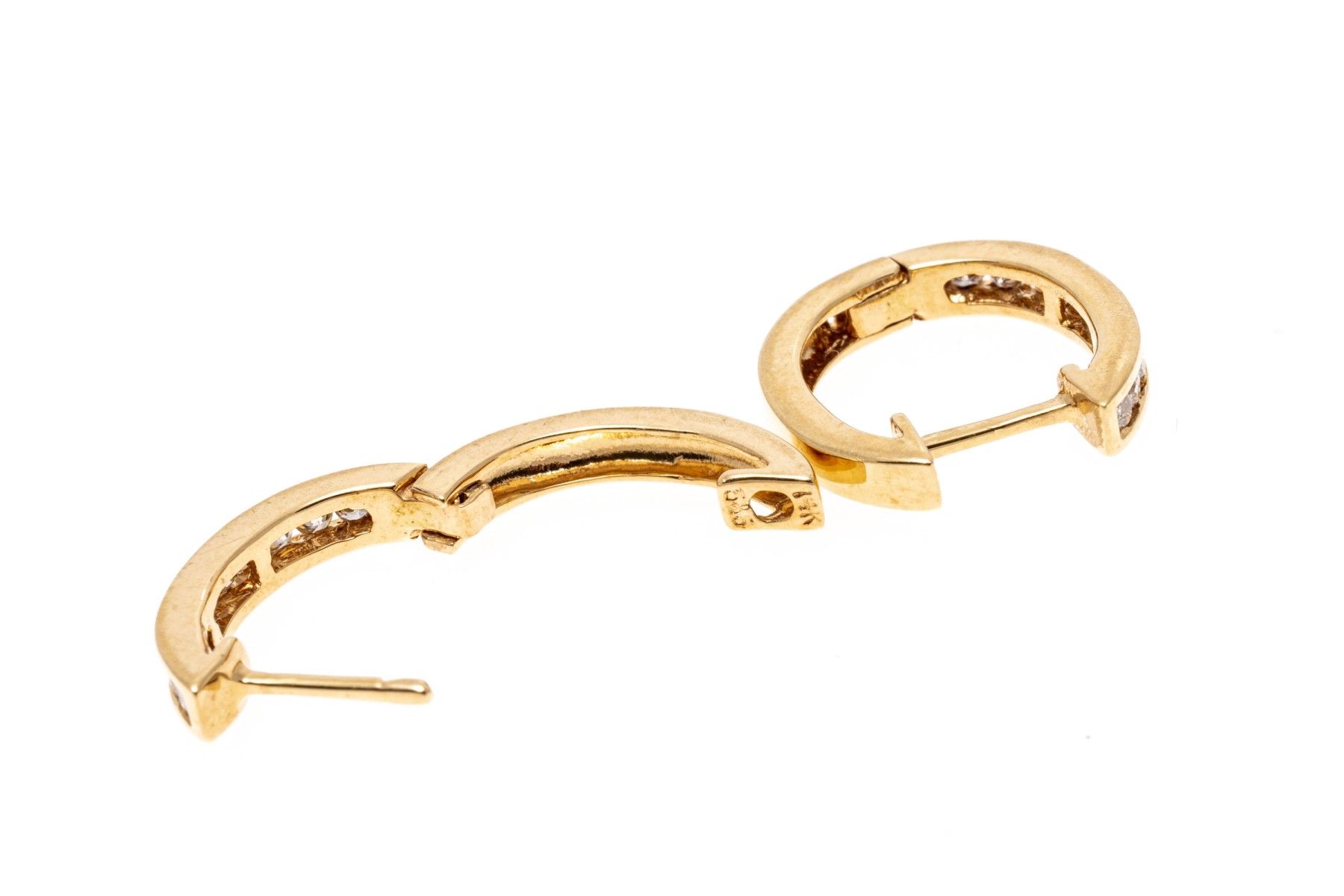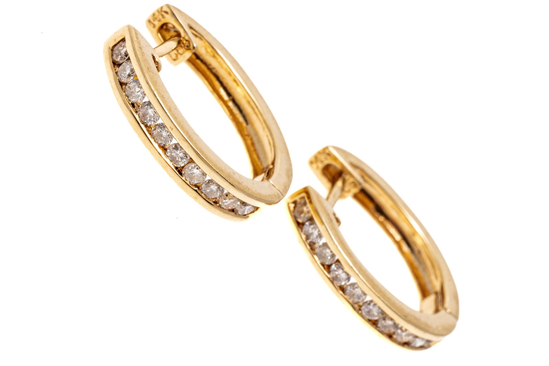 A pair of stylish, contemporary yellow gold huggie hoop earrings displaying front channels of round brilliant cut diamonds, approximately 0.36 TCW. Finished with latch back posts.
