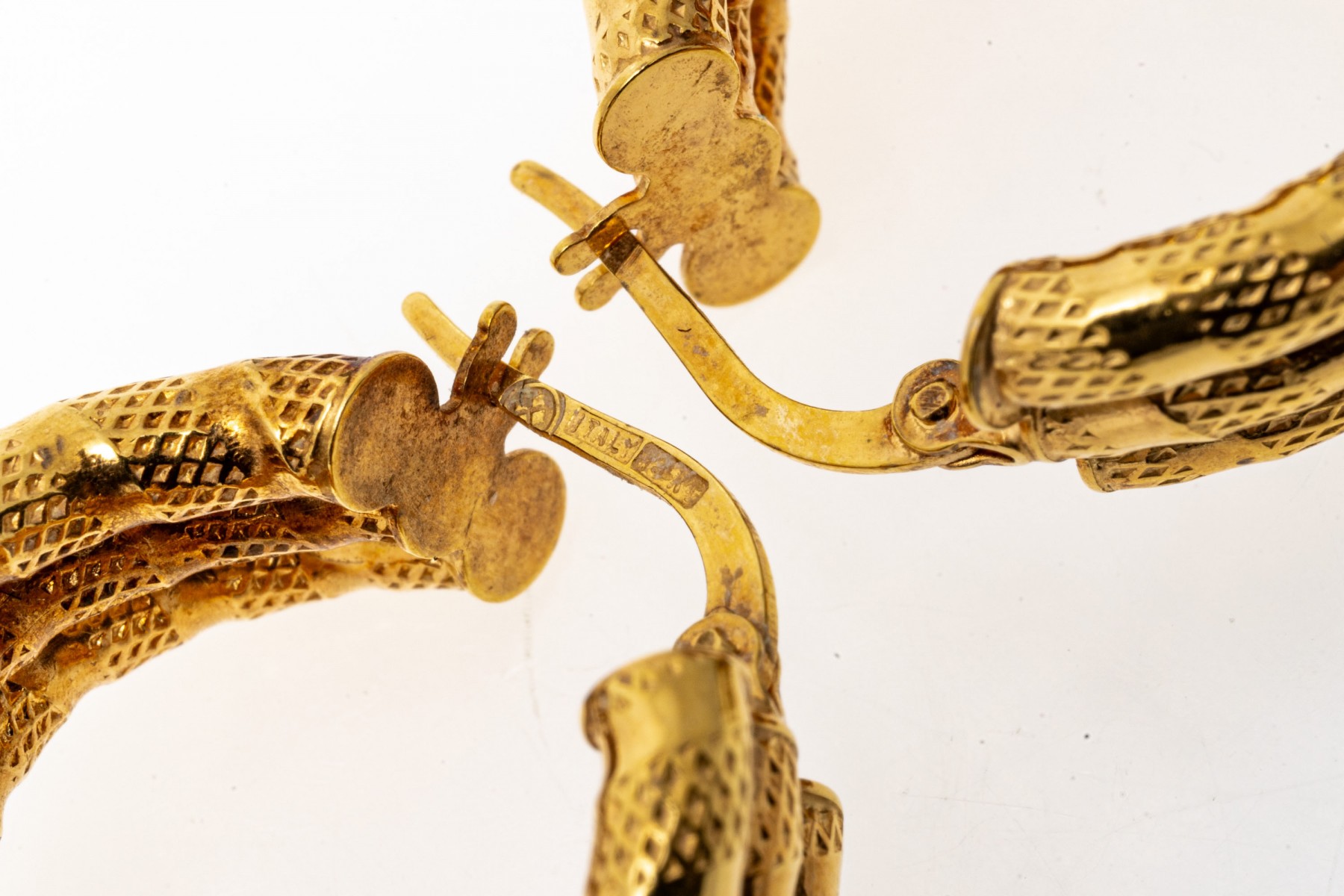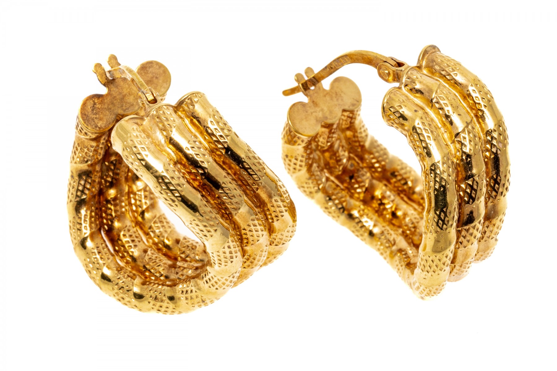 A pair of 14K yellow gold wave hoop earrings. These earrings have a ribbed design with a textured finish. Leaver post style backings.