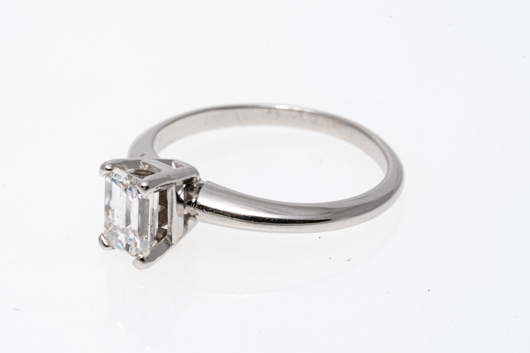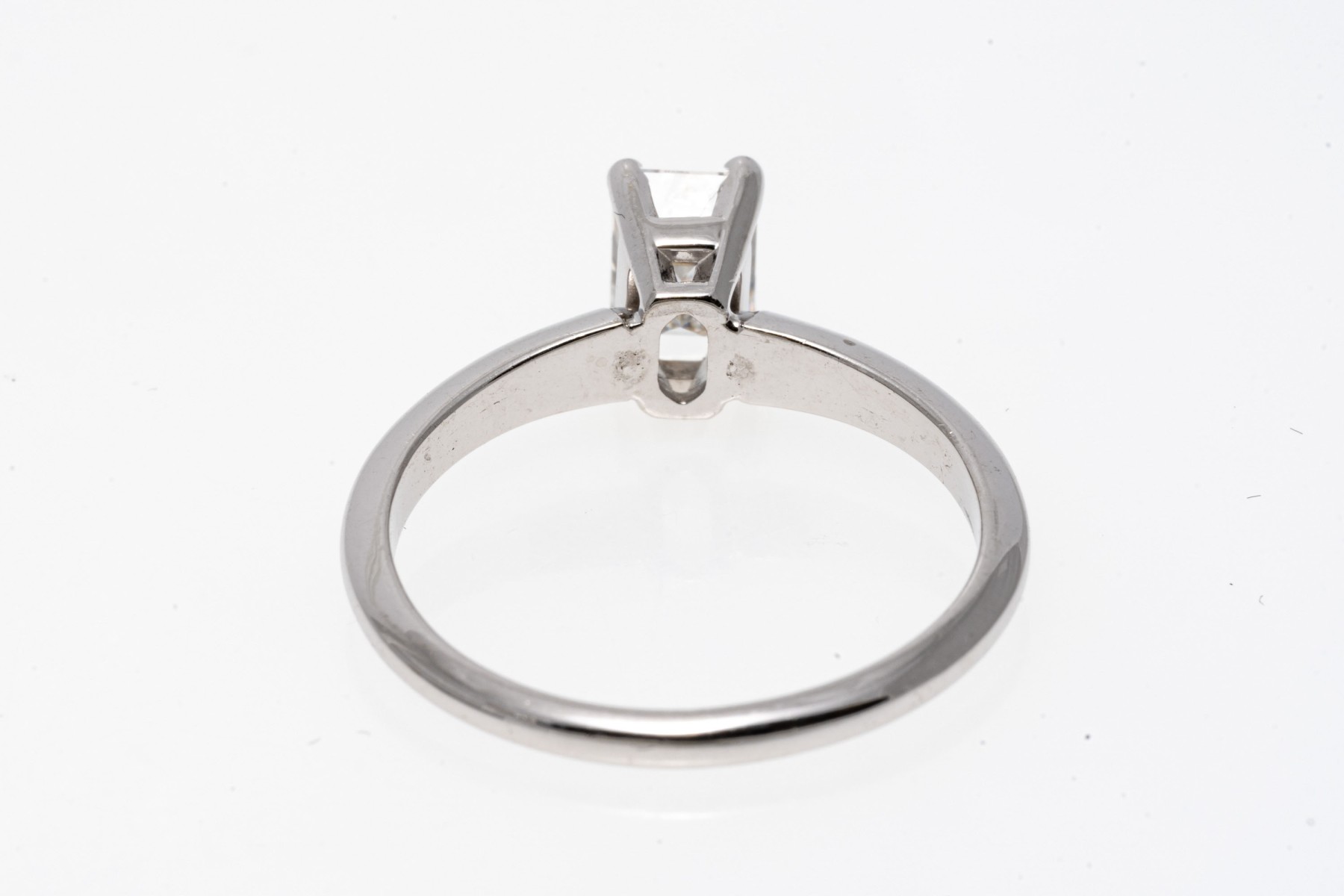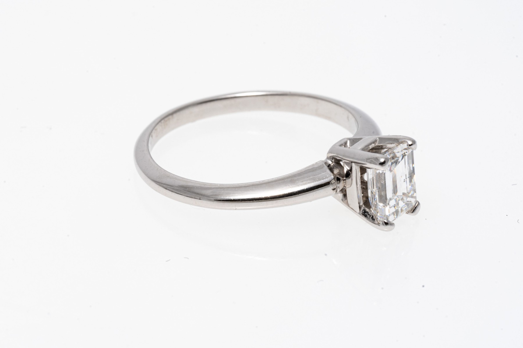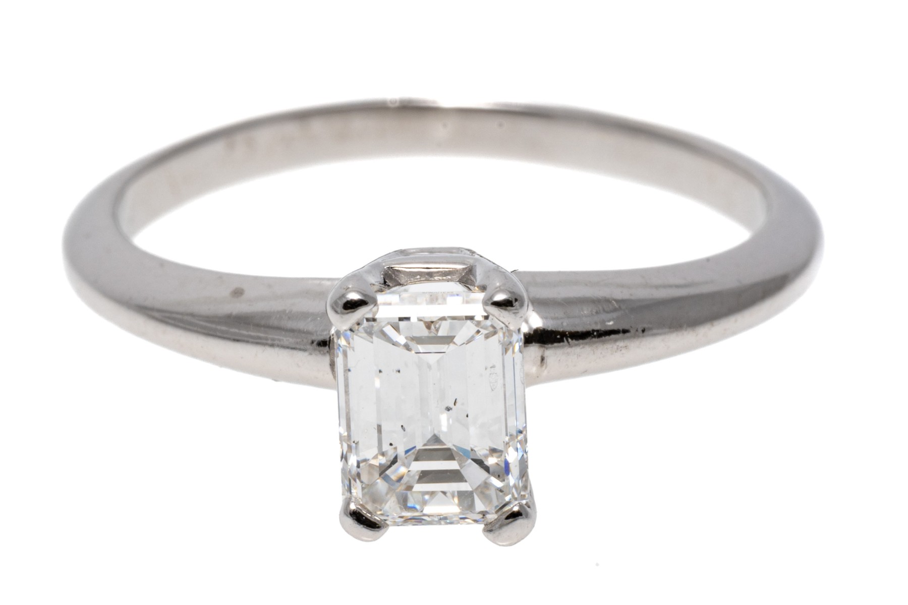 Contemporary 14K white gold ring. Prong set into the ring is a single emerald cut diamond, approximately 0.6 cts. Ring size 5.75+.