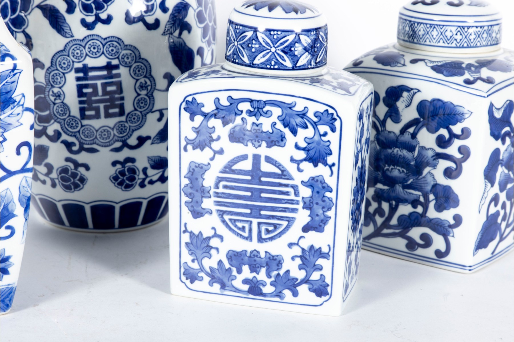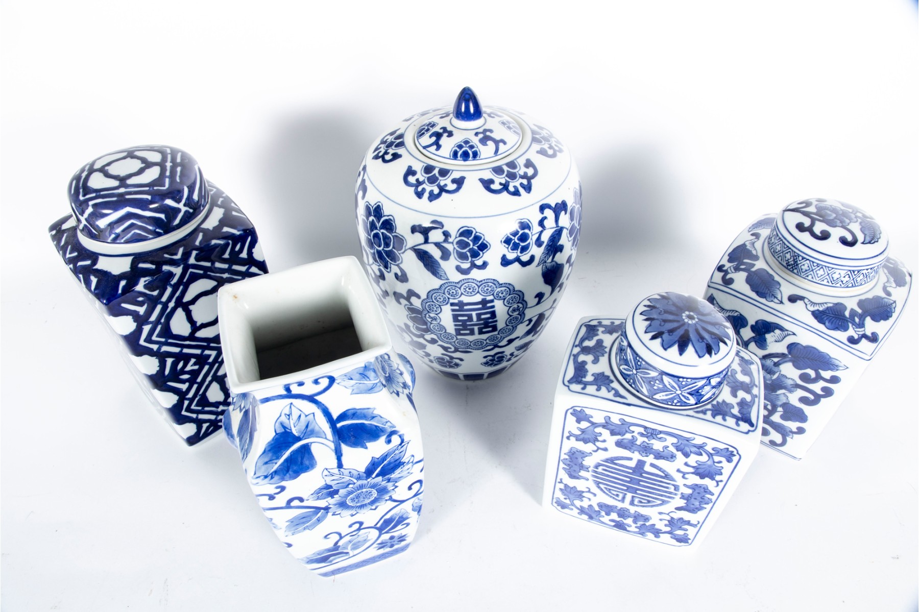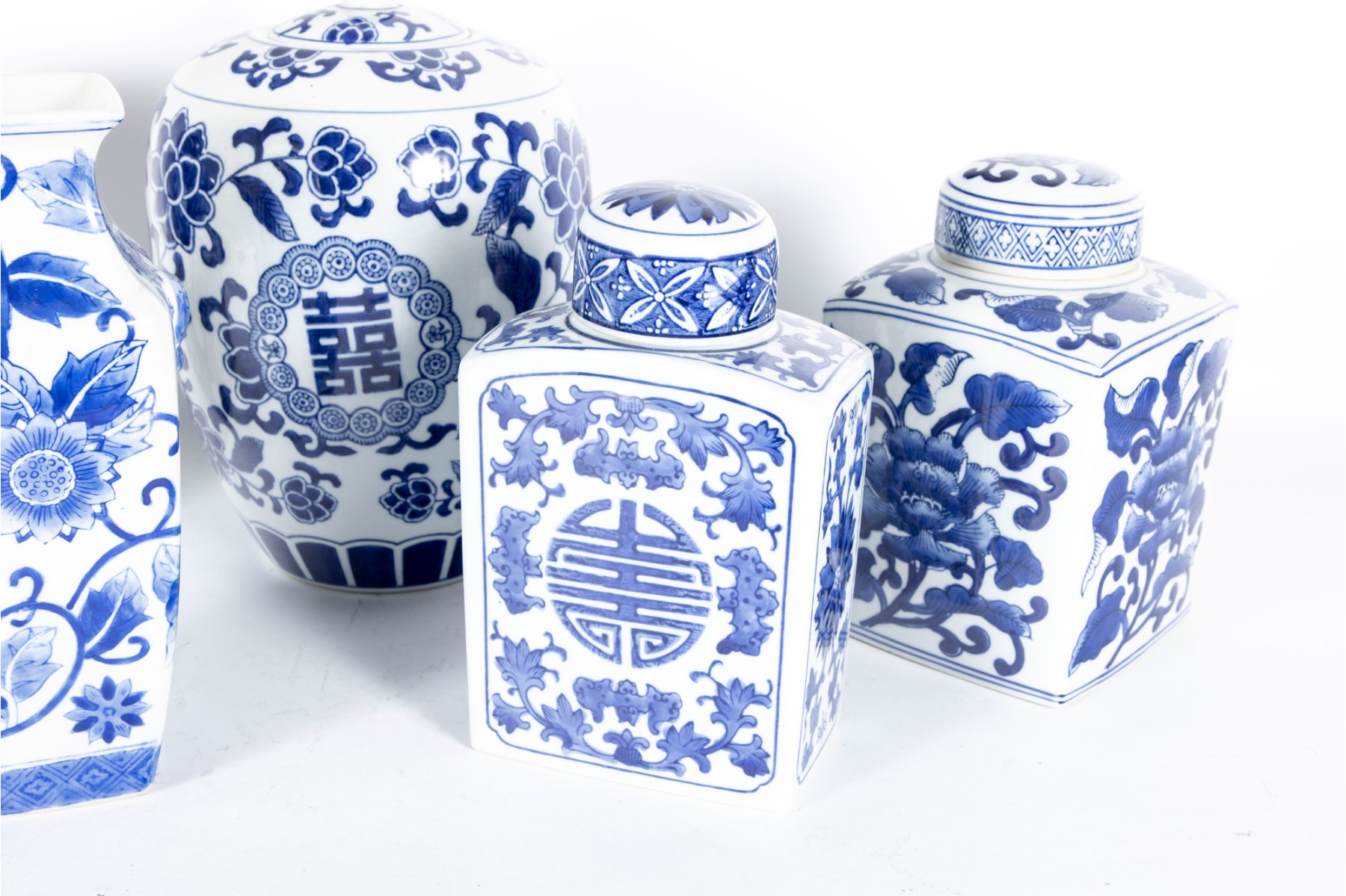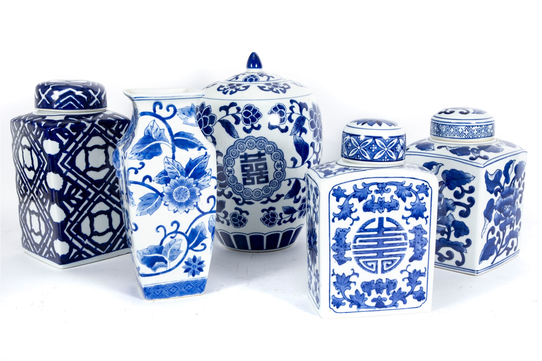 A wonderful group of contemporary Asian Ceramics in white and monochromatic blue, including vases, jars, and lidded canisters.