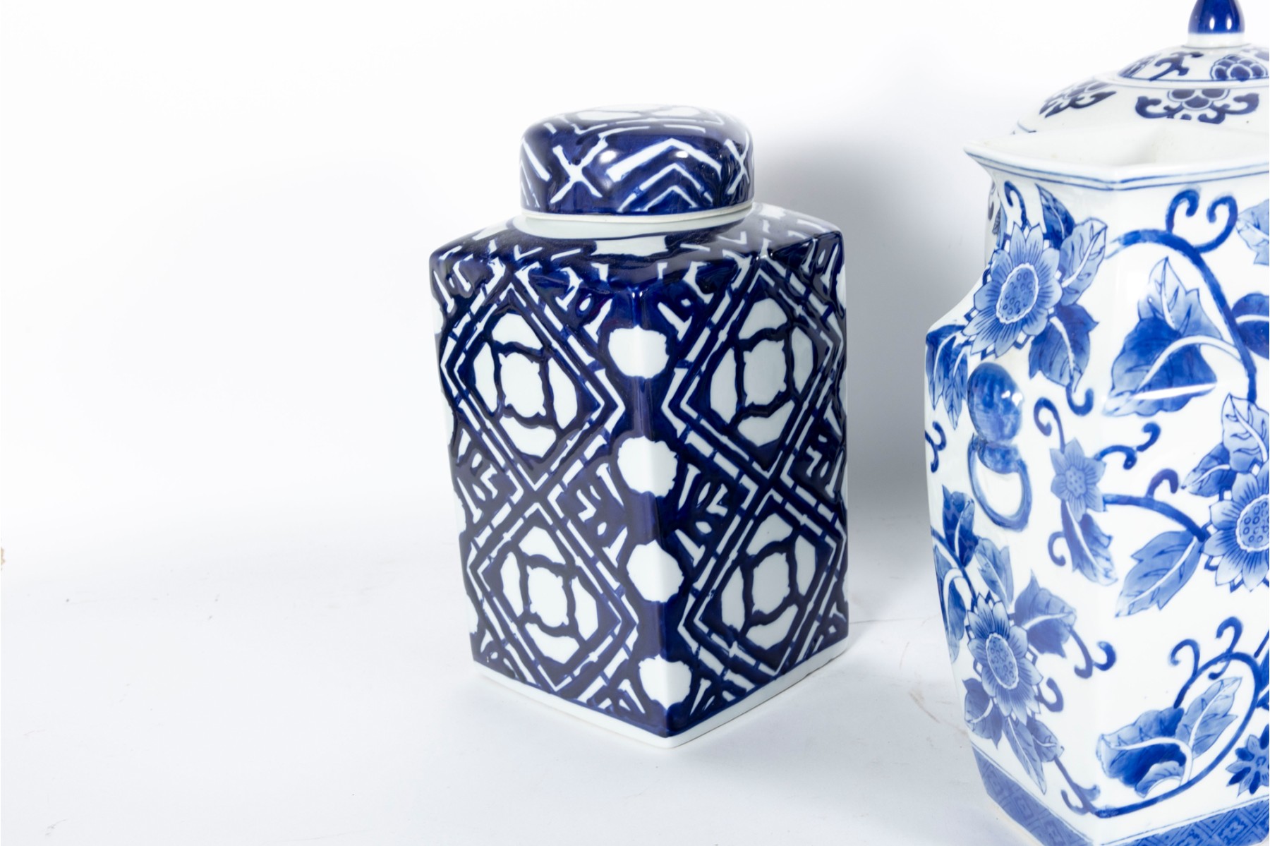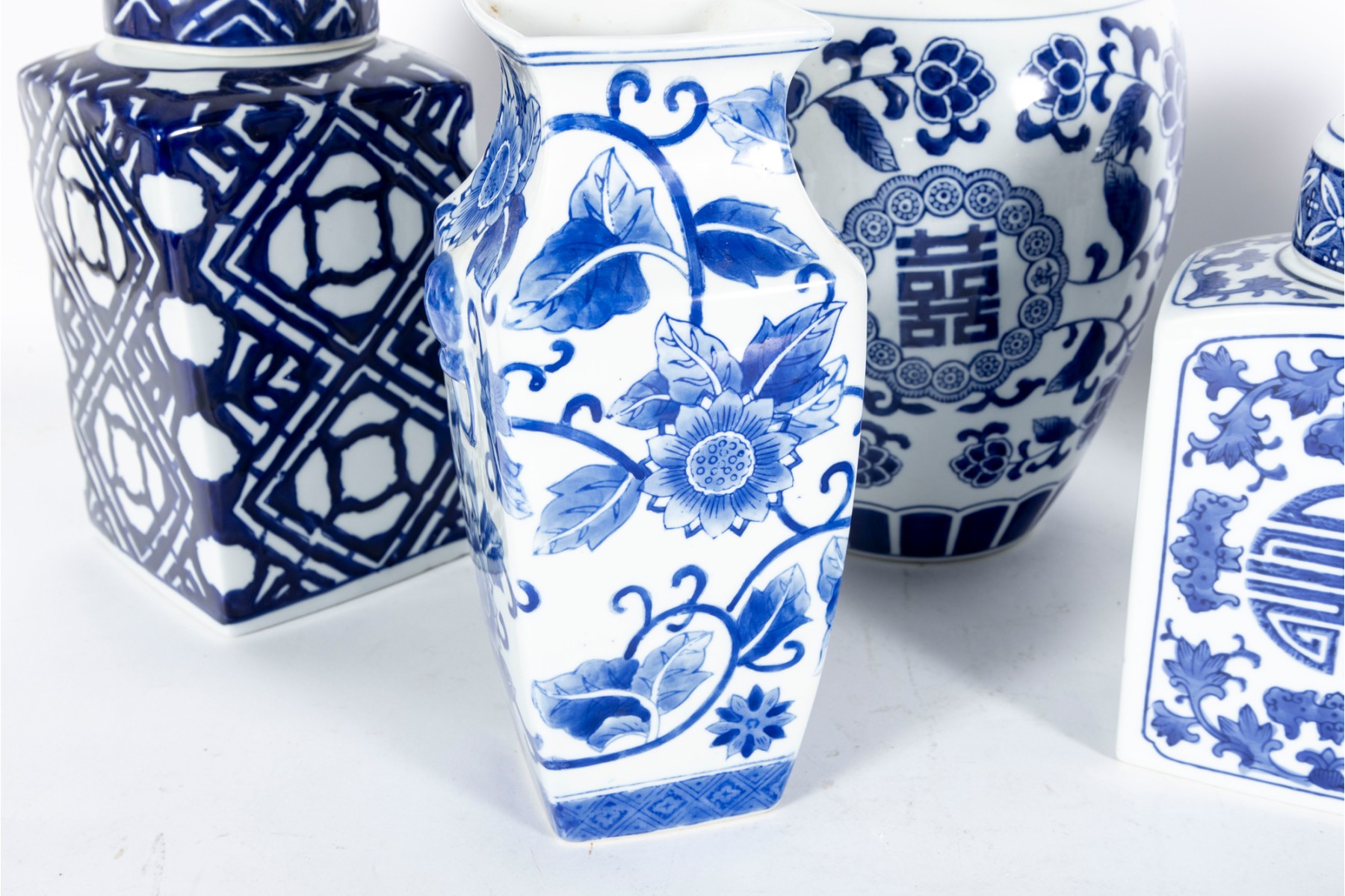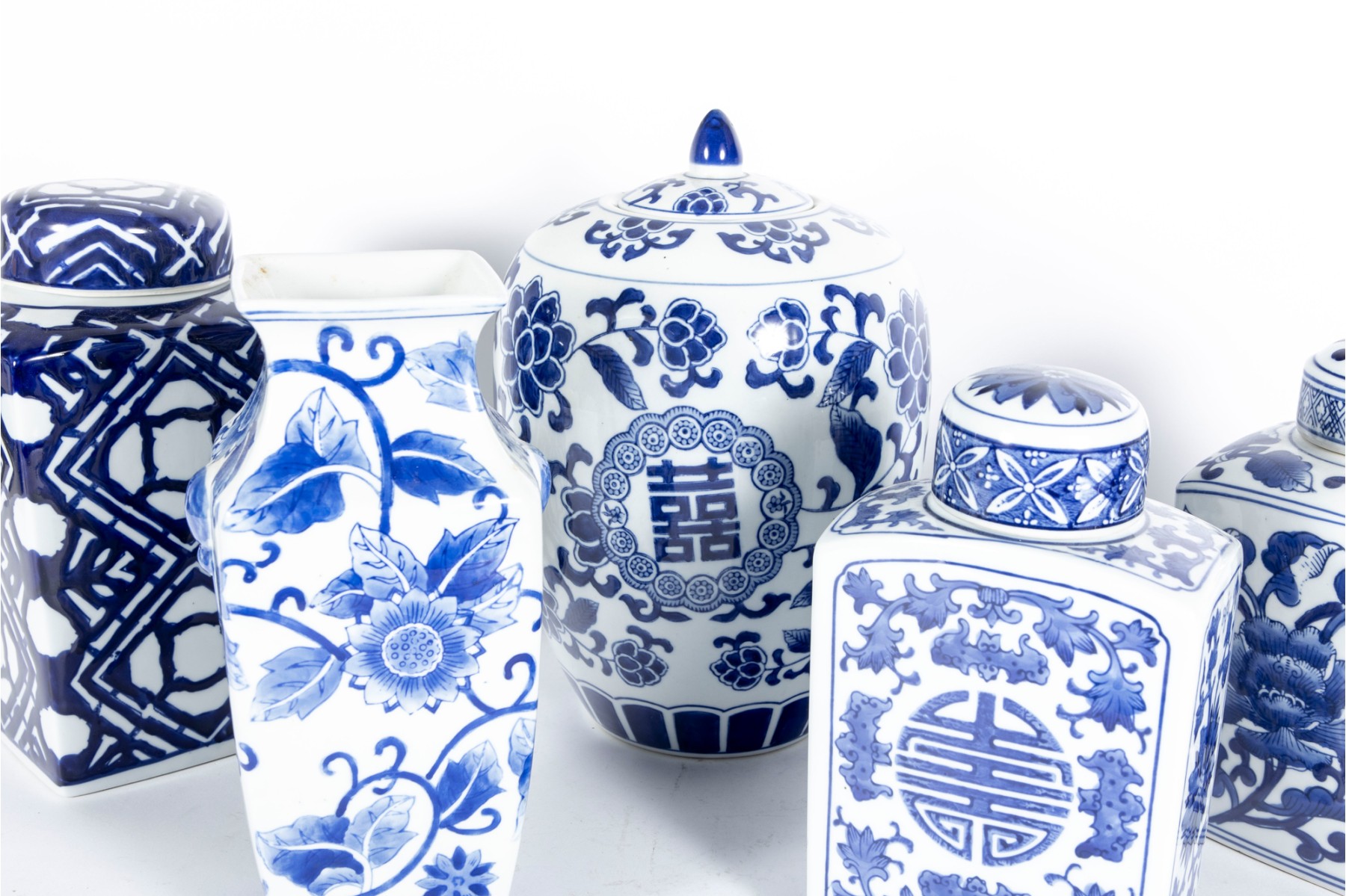 A wonderful group of contemporary Asian Ceramics in white and monochromatic blue, including vases, jars, and lidded canisters.
