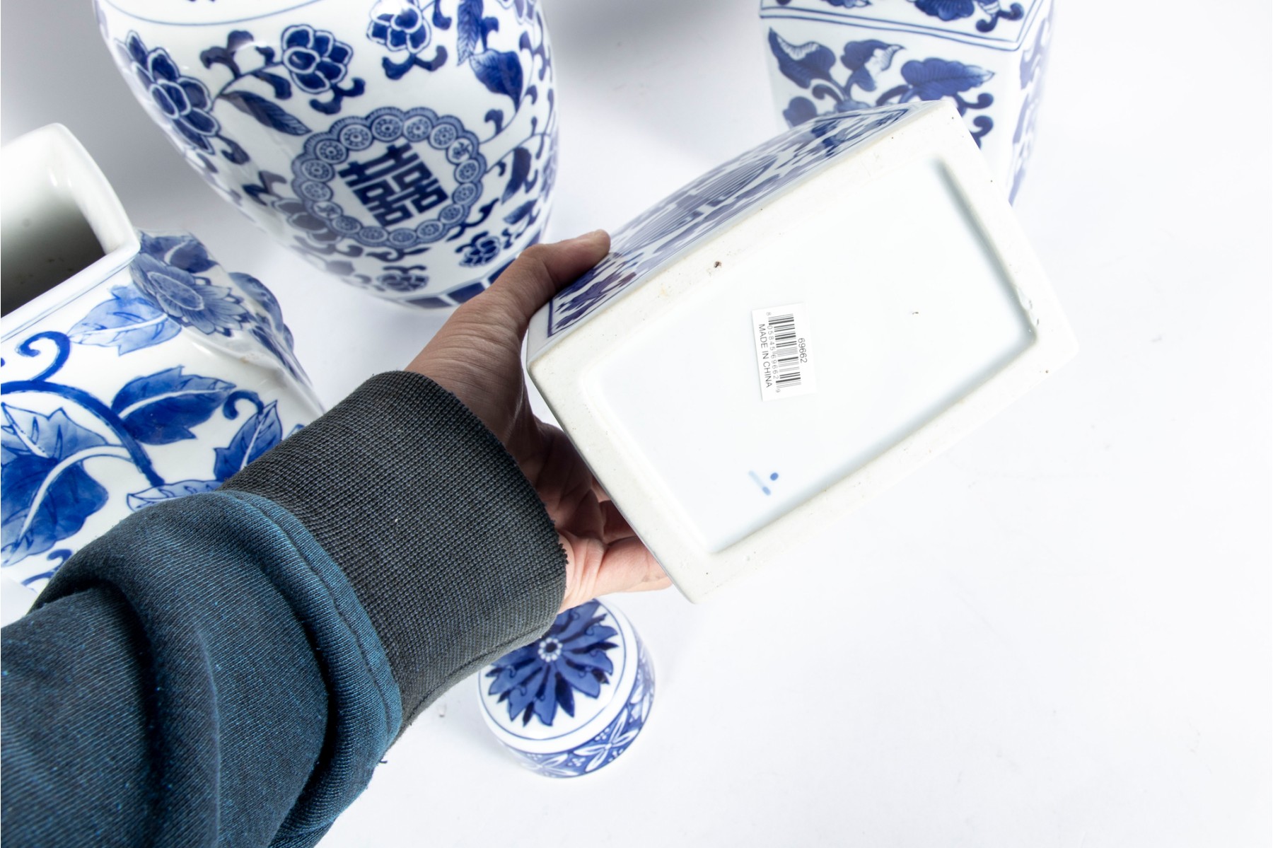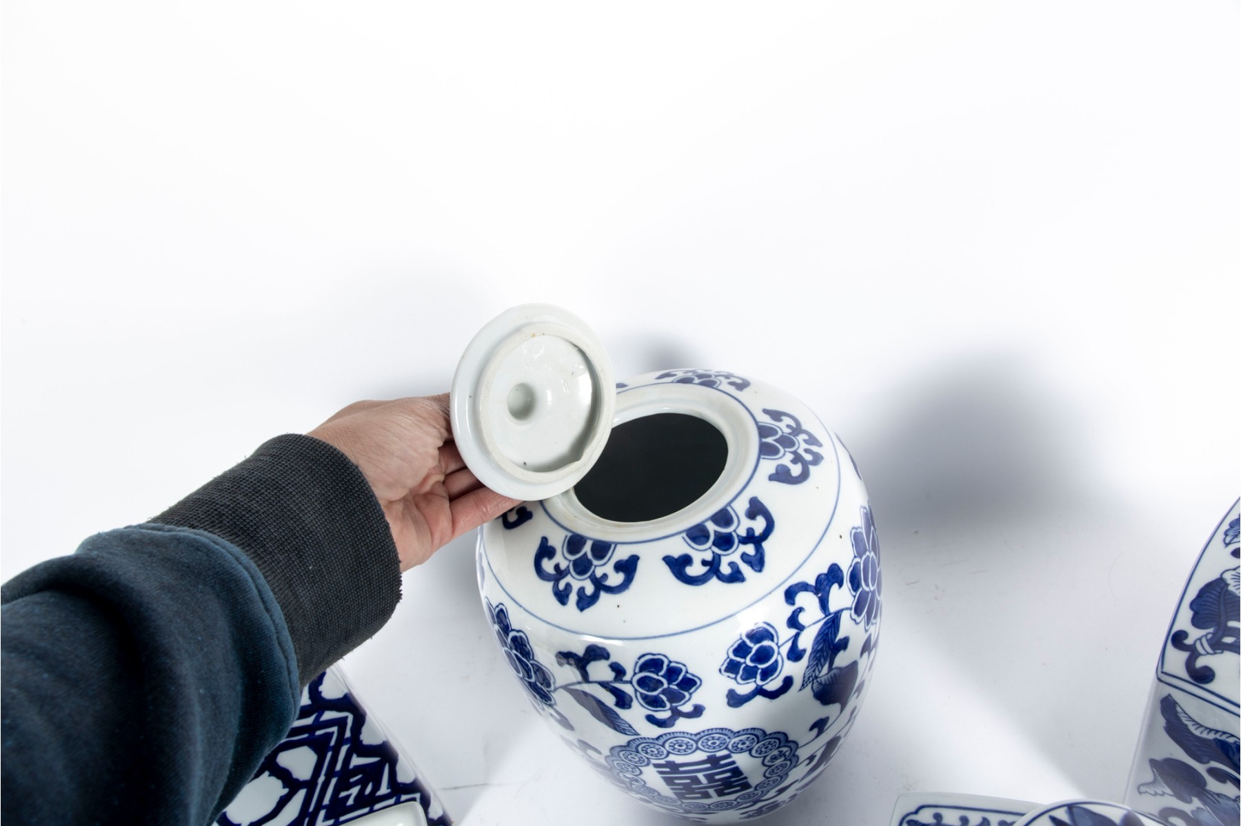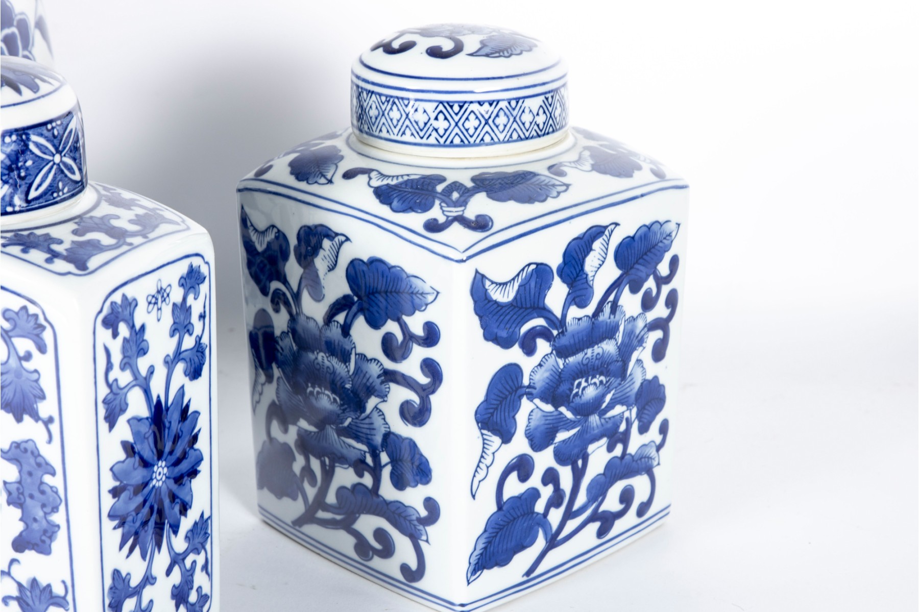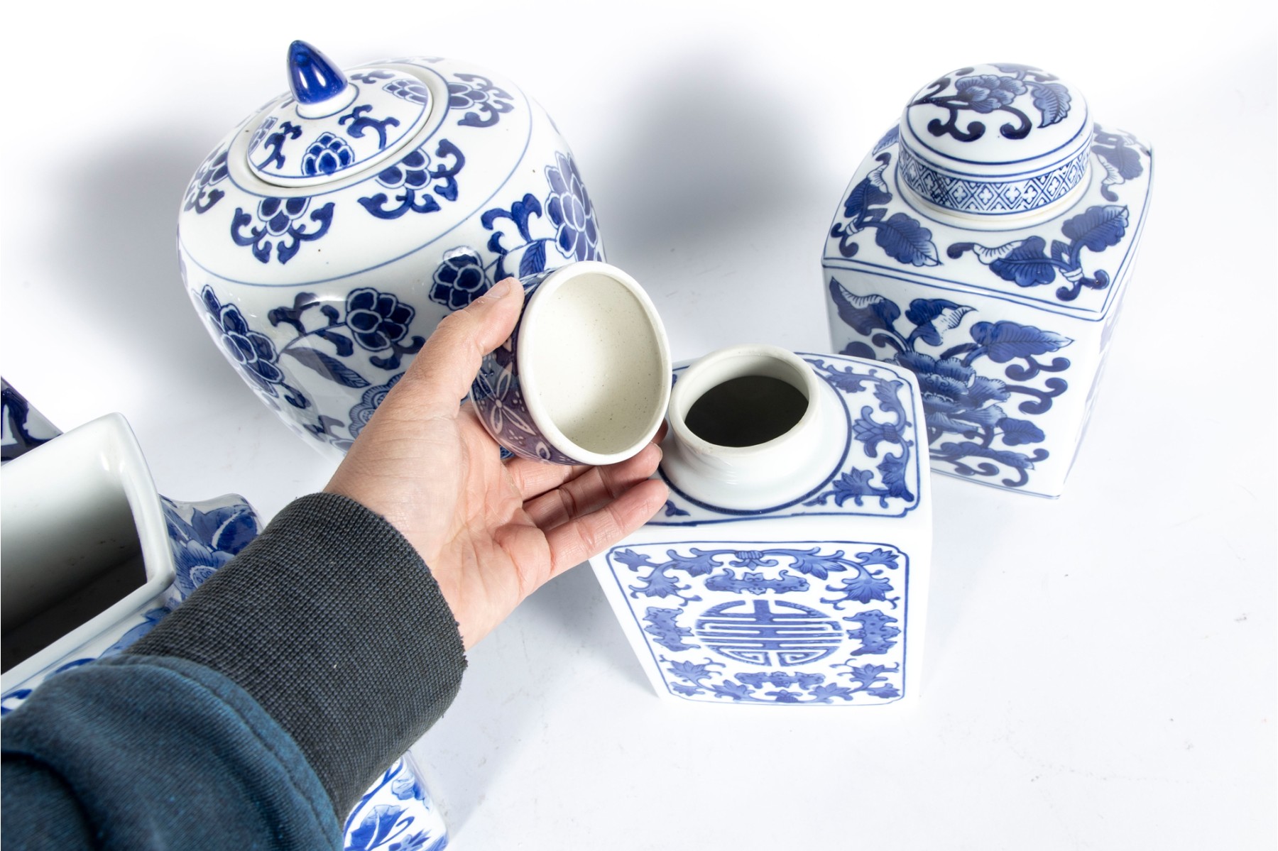 A wonderful group of contemporary Asian Ceramics in white and monochromatic blue, including vases, jars, and lidded canisters.