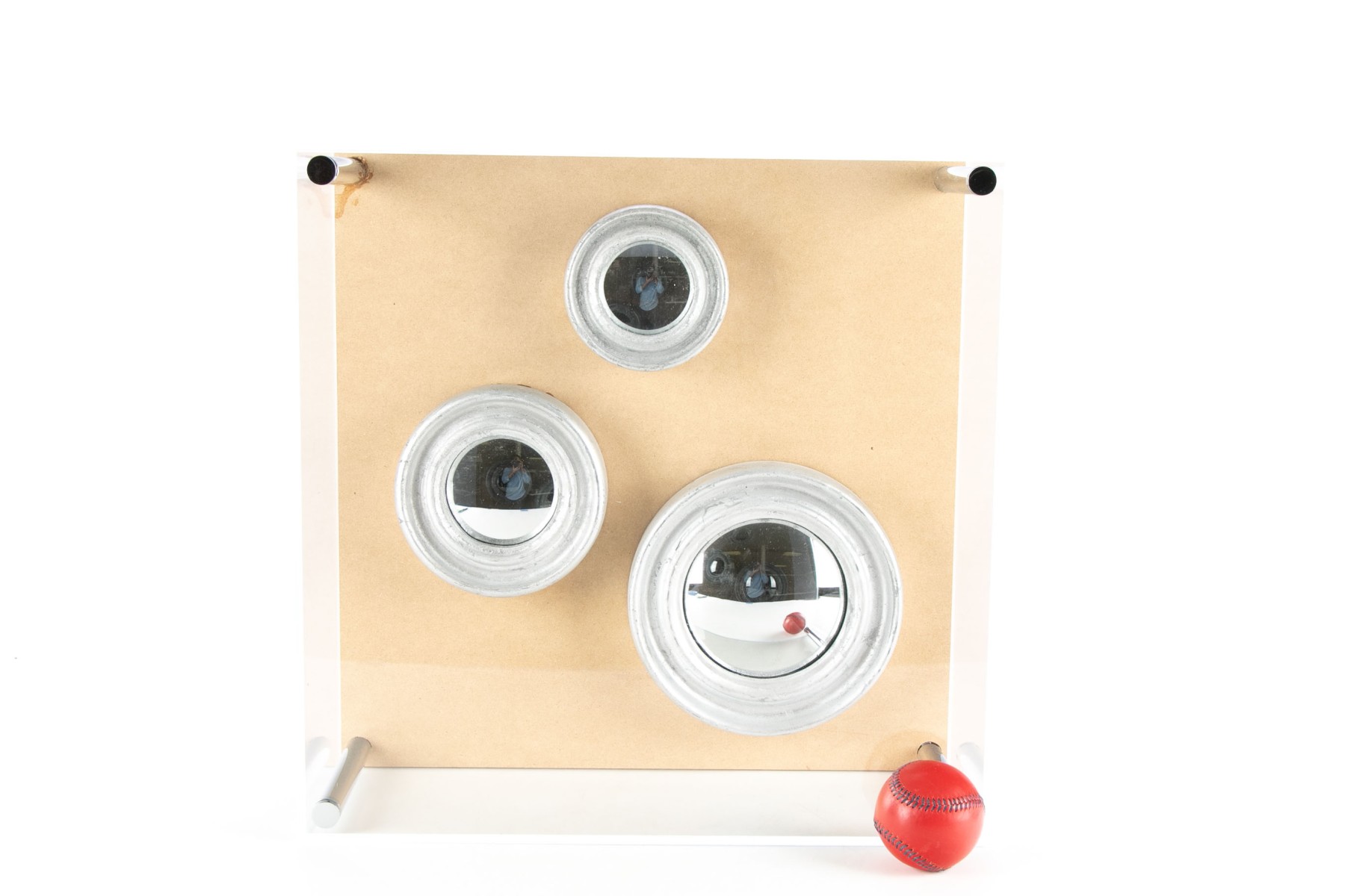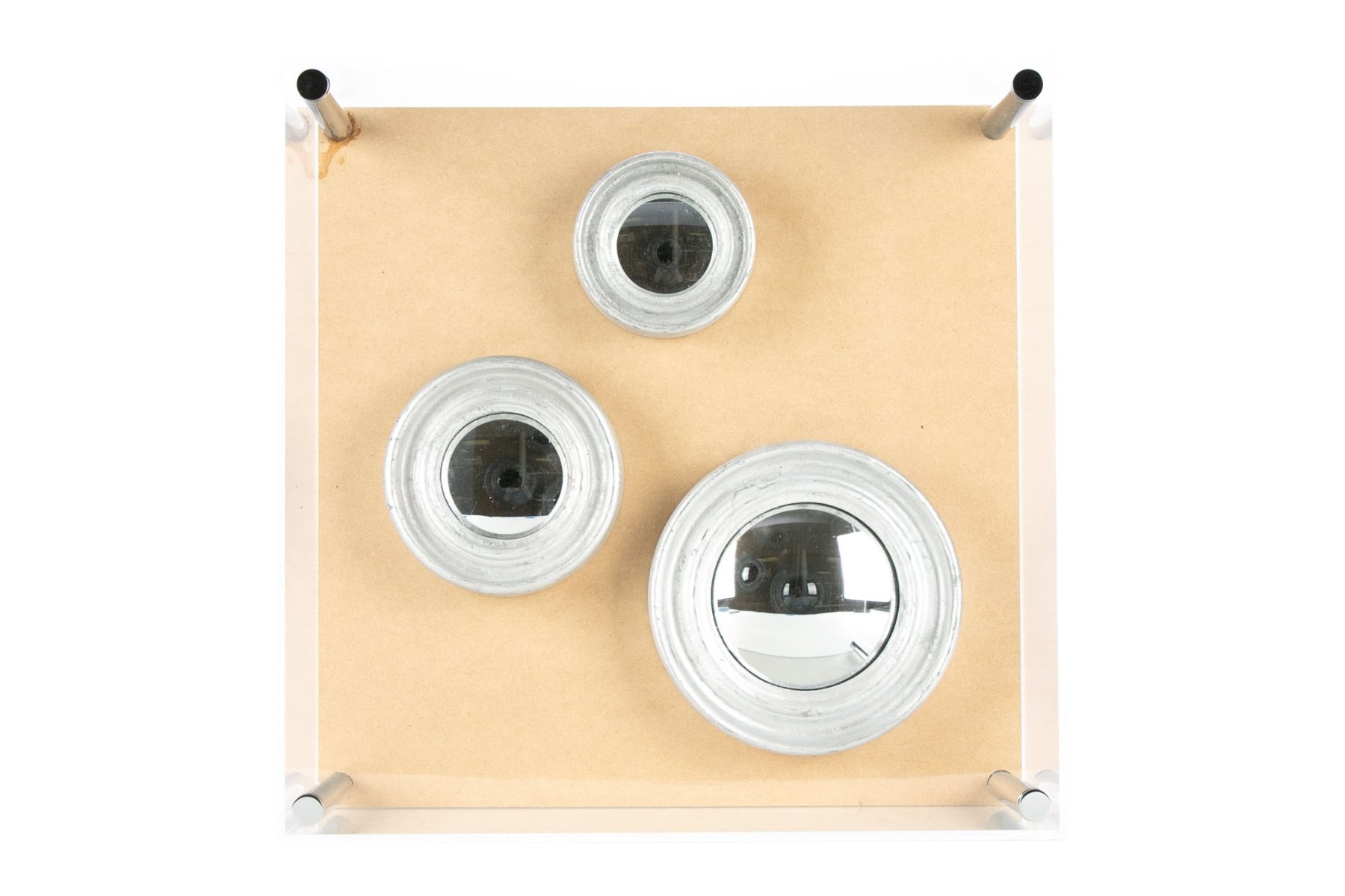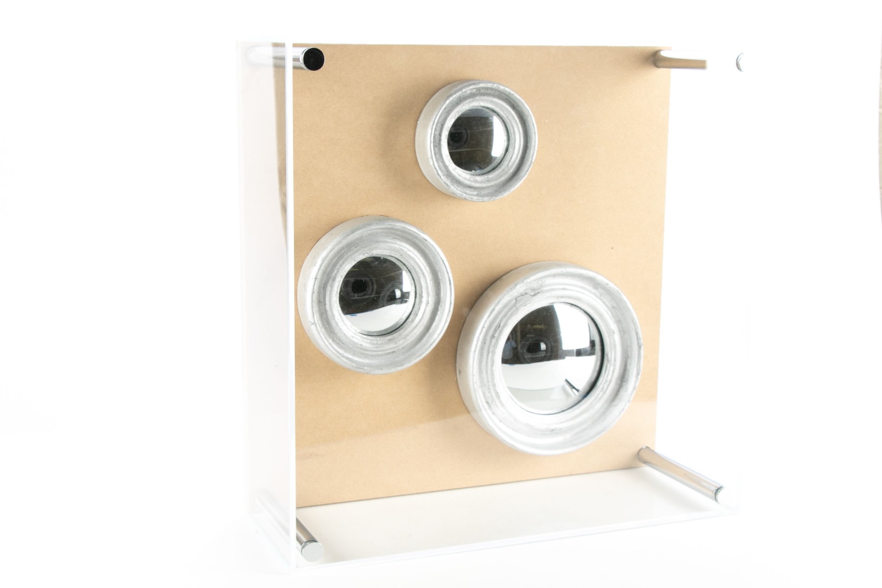 A plexiglass case with chrome rod supports. Silver painted frames for the three graduated convex mirrors mounted on tan board.
