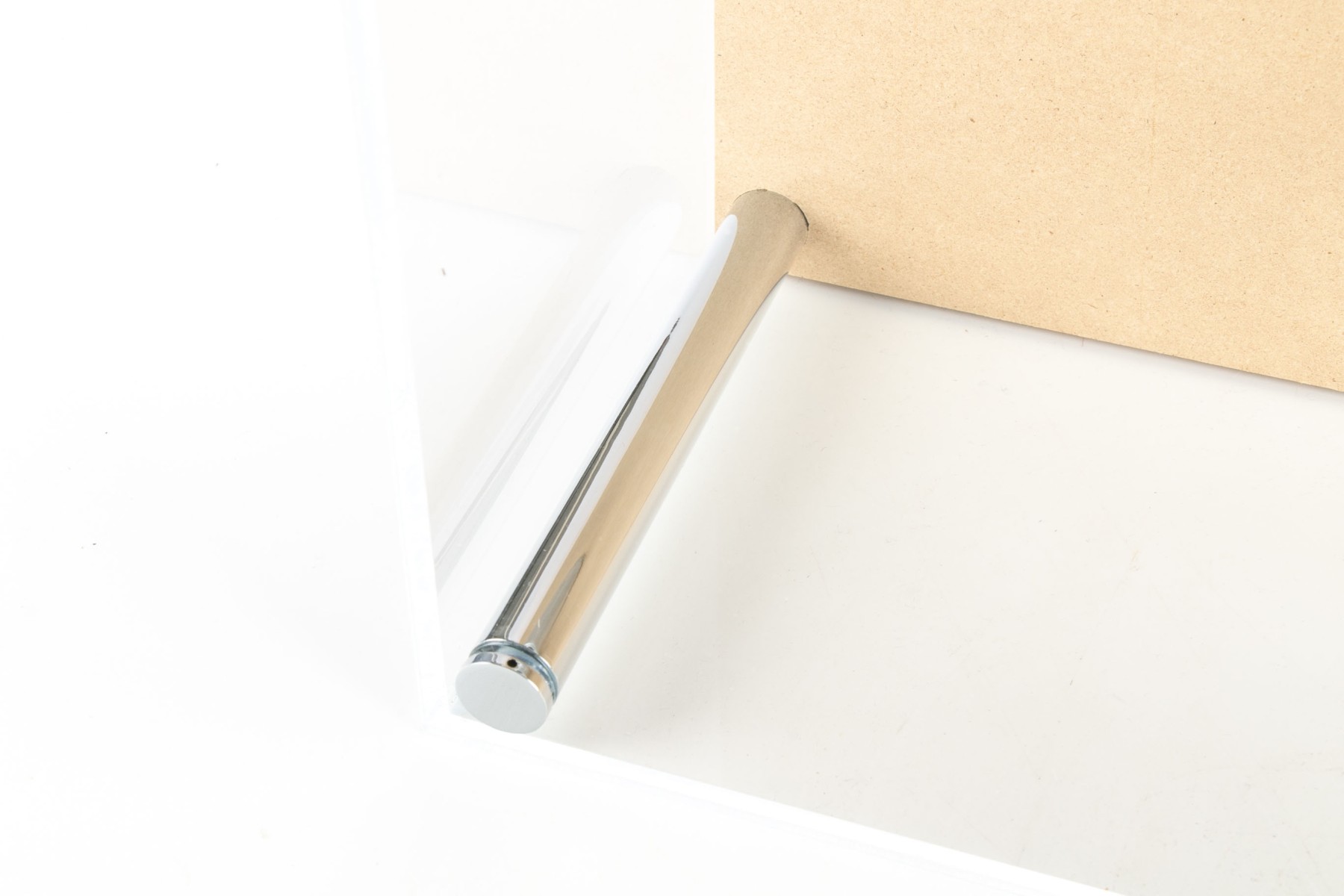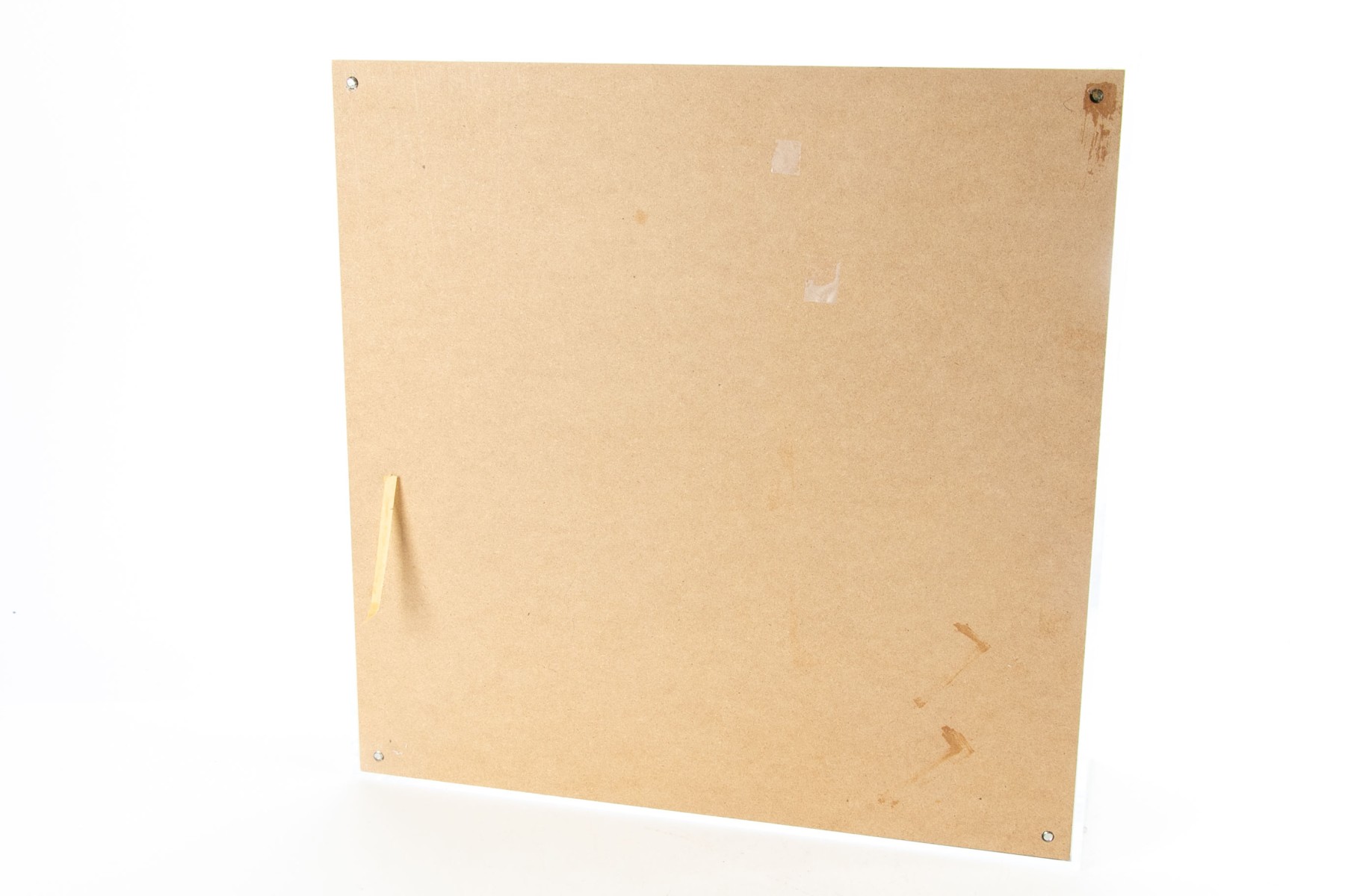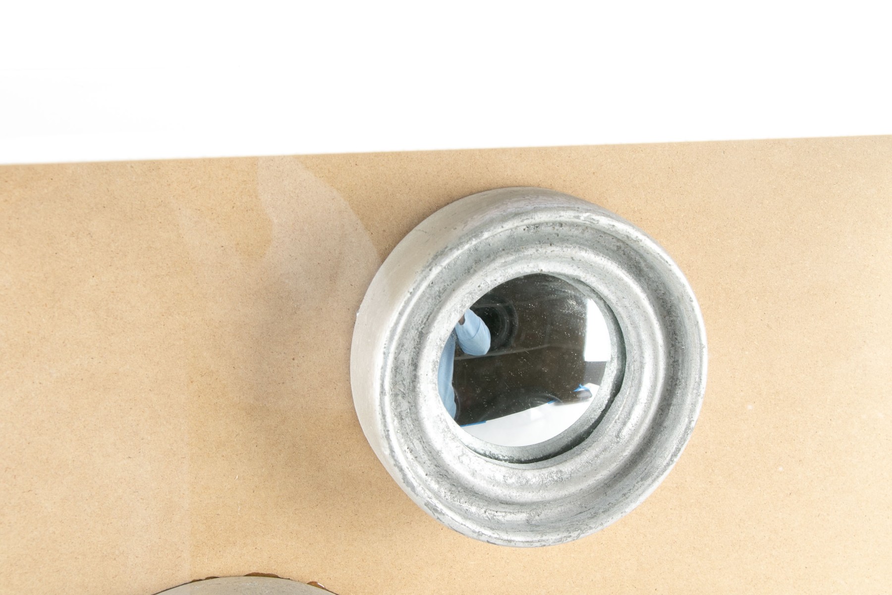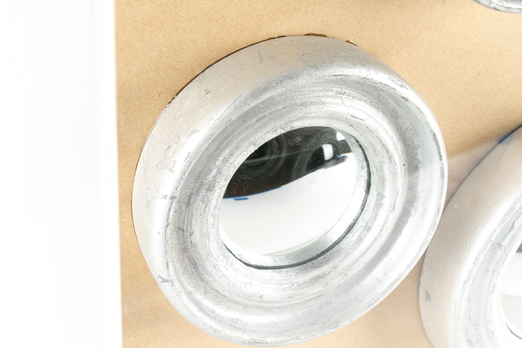 A plexiglass case with chrome rod supports. Silver painted frames for the three graduated convex mirrors mounted on tan board.