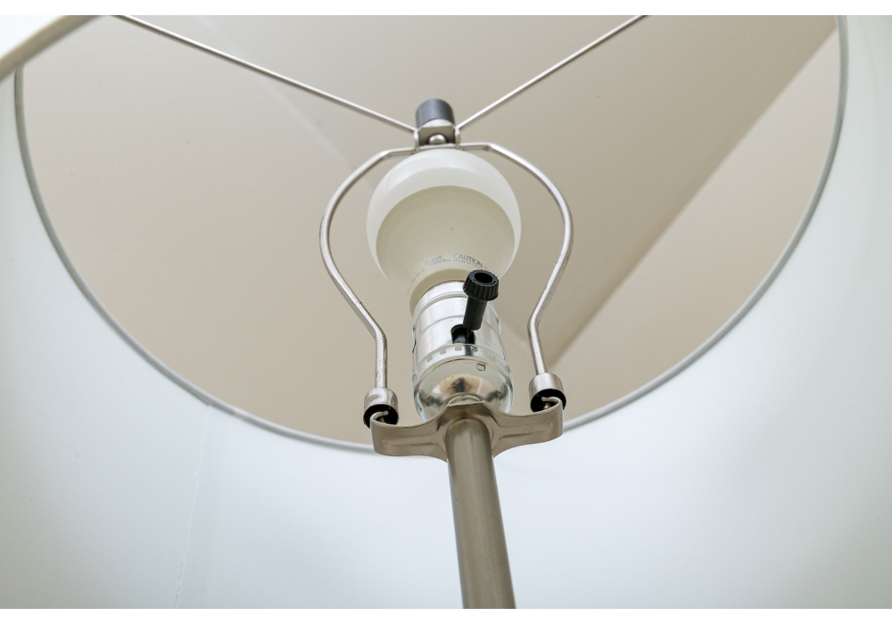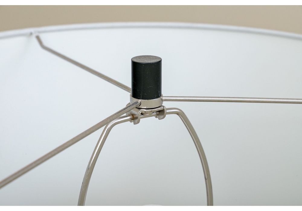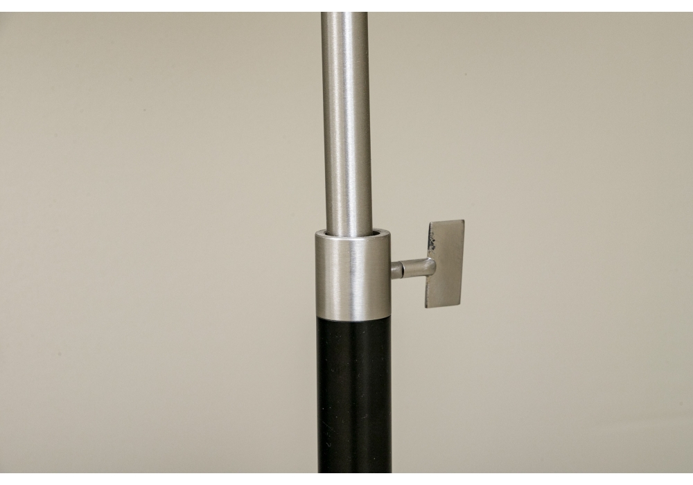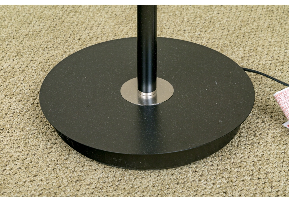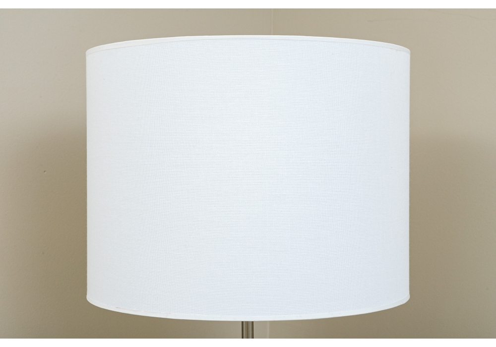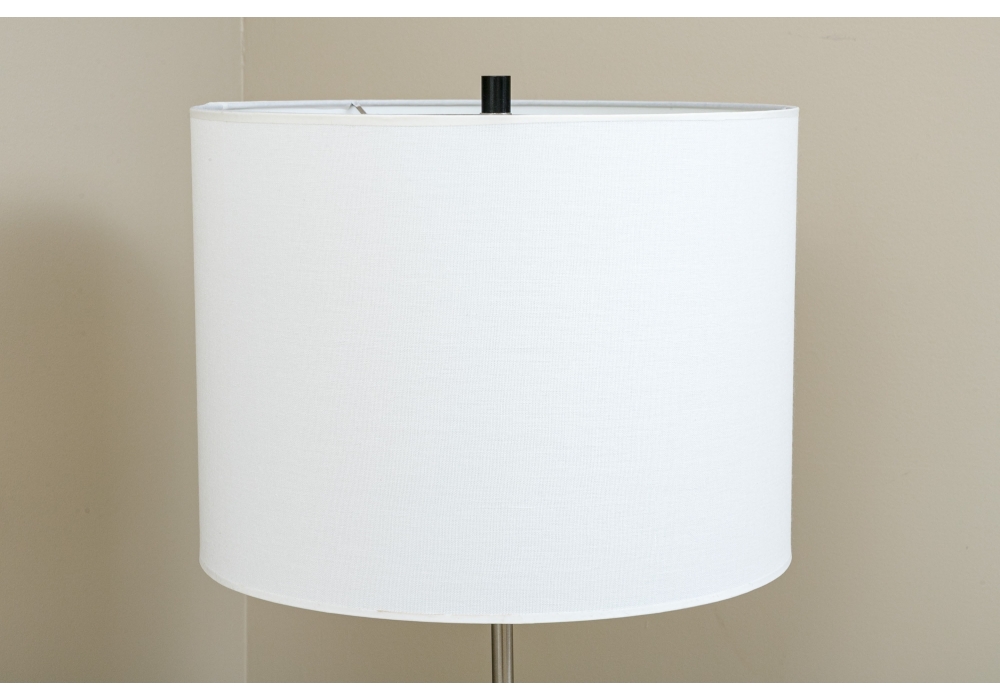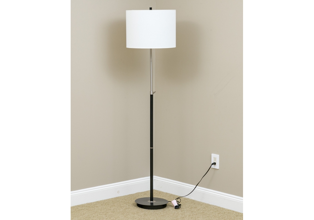 Contemporary black metal and chrome floor lamp with white drum shade. Adjustable height.