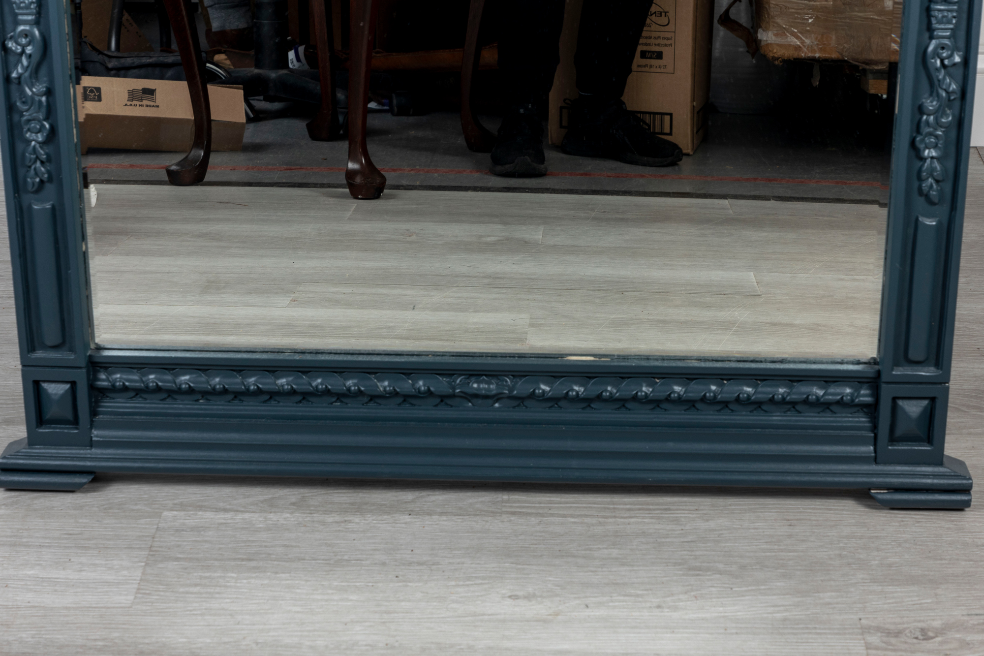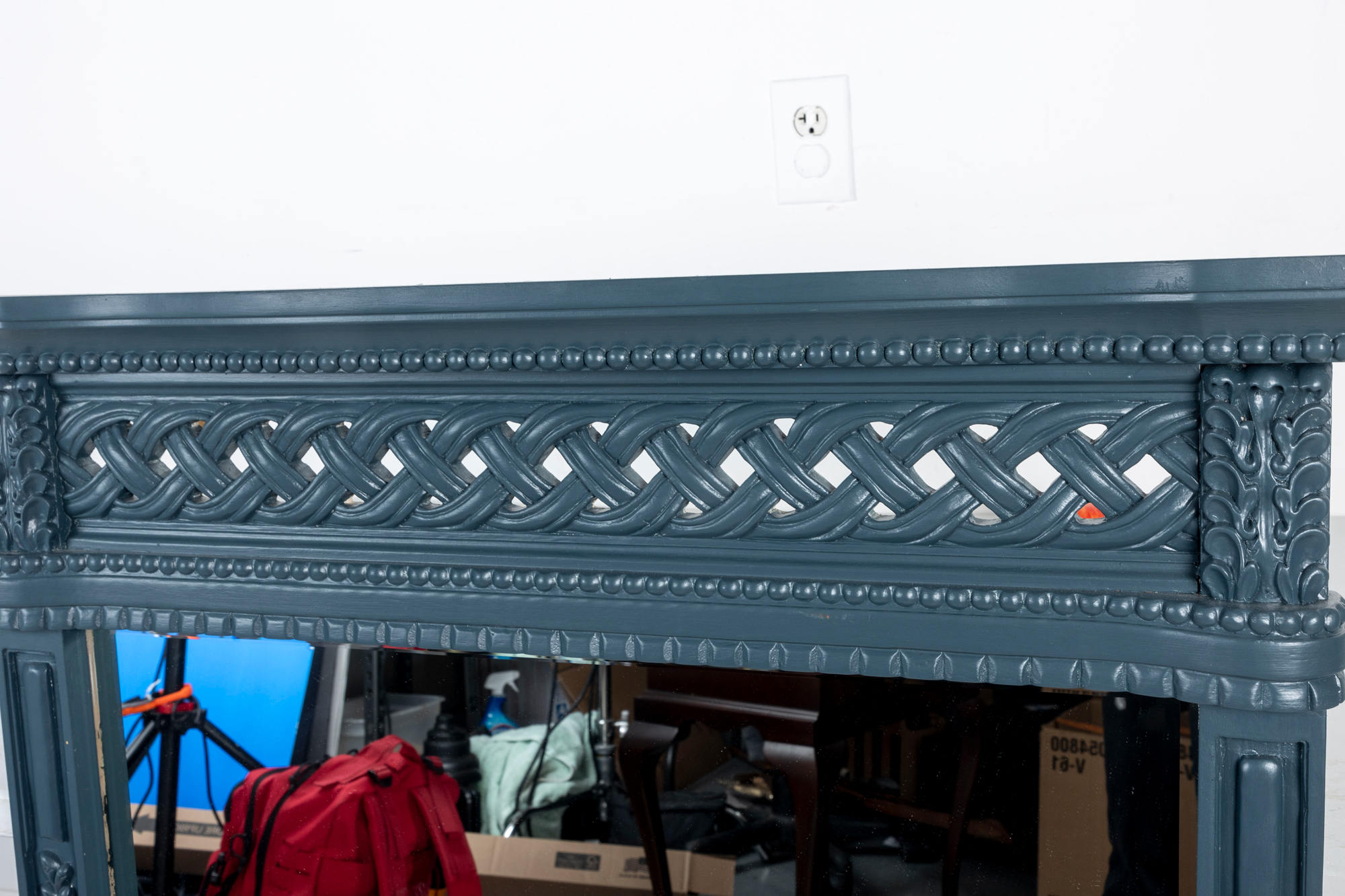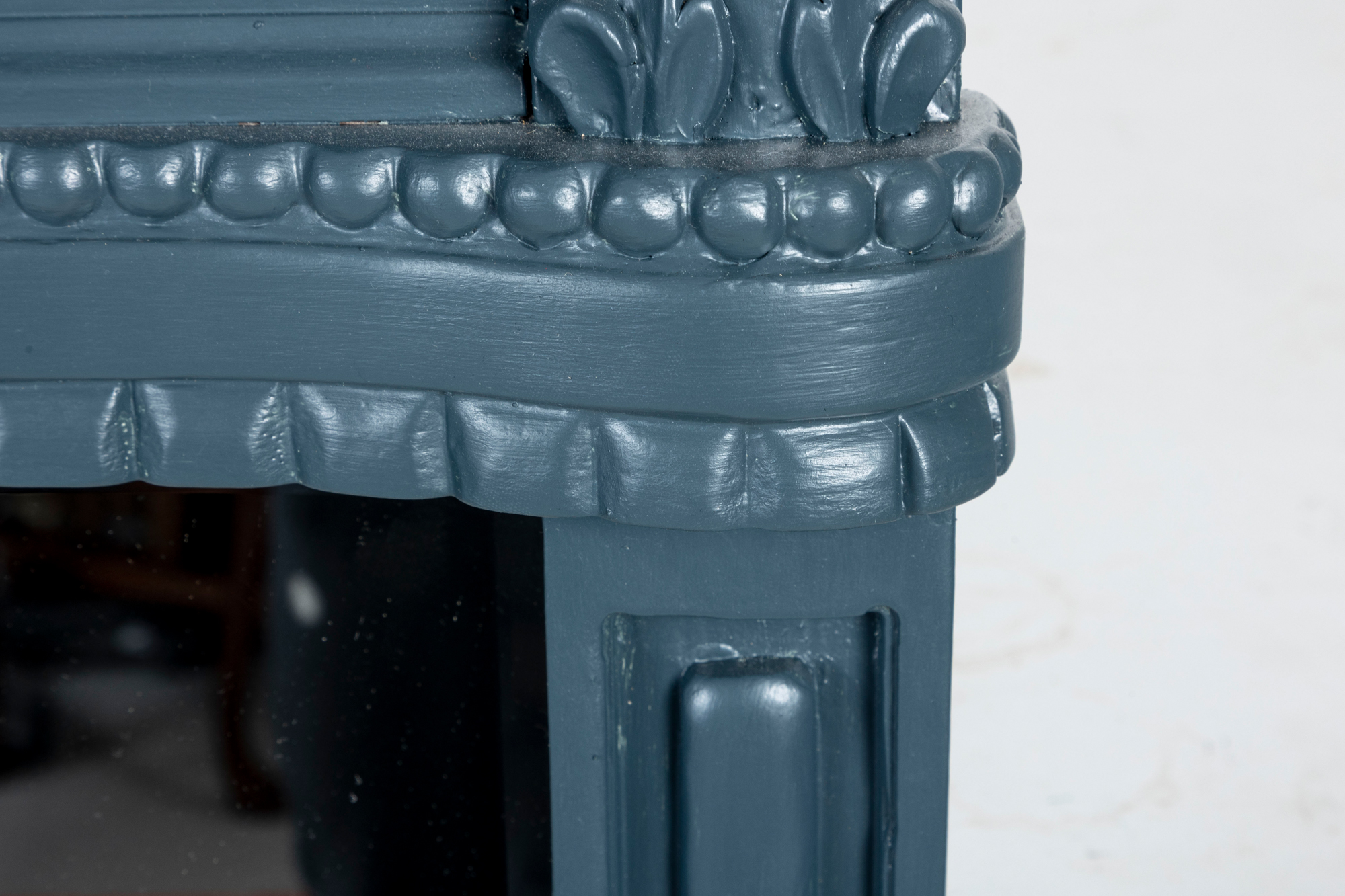 A large and imposing wall mirror largely decorated with carved foliates and woven designs finished in pleasing matte blue.