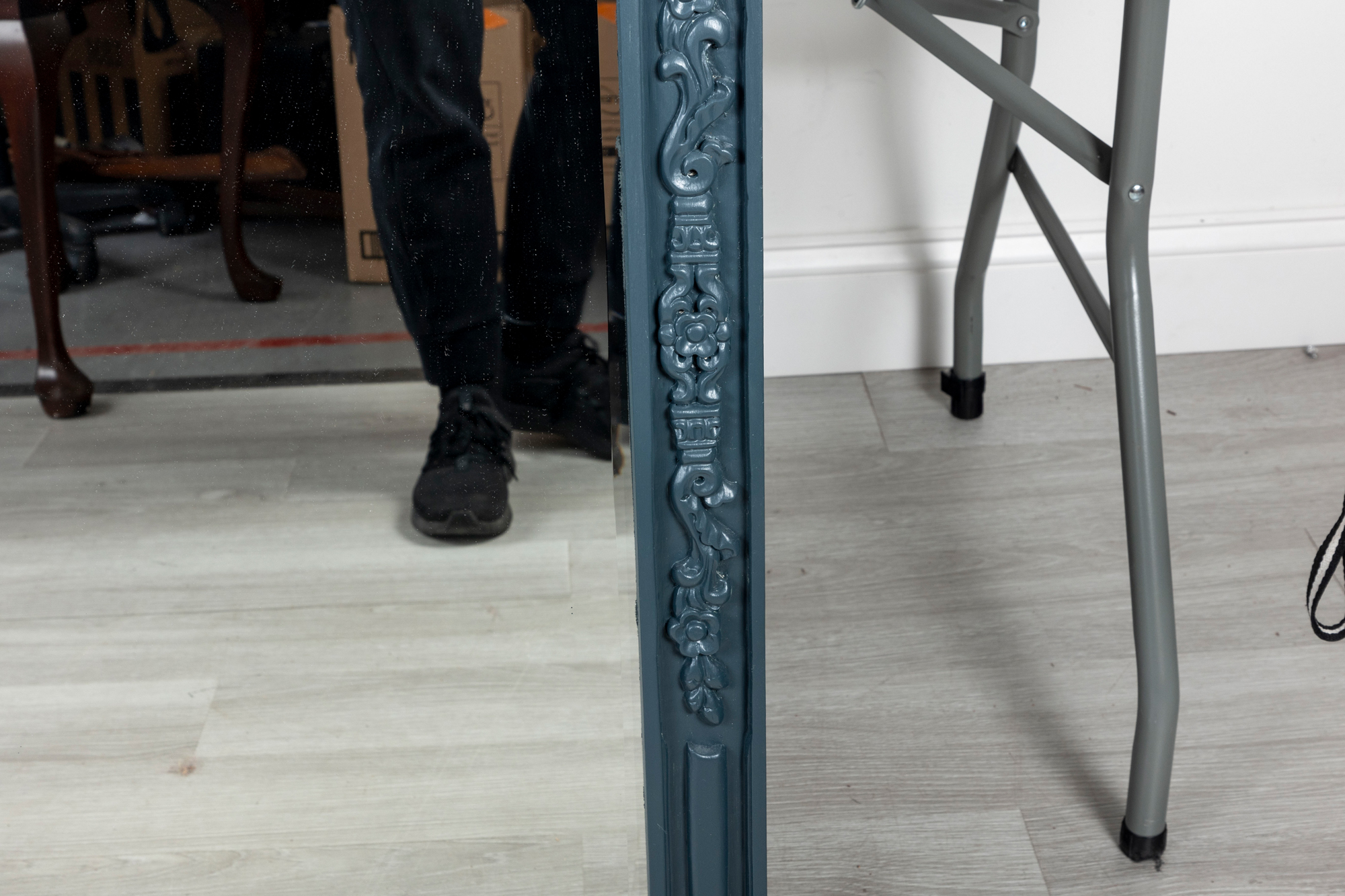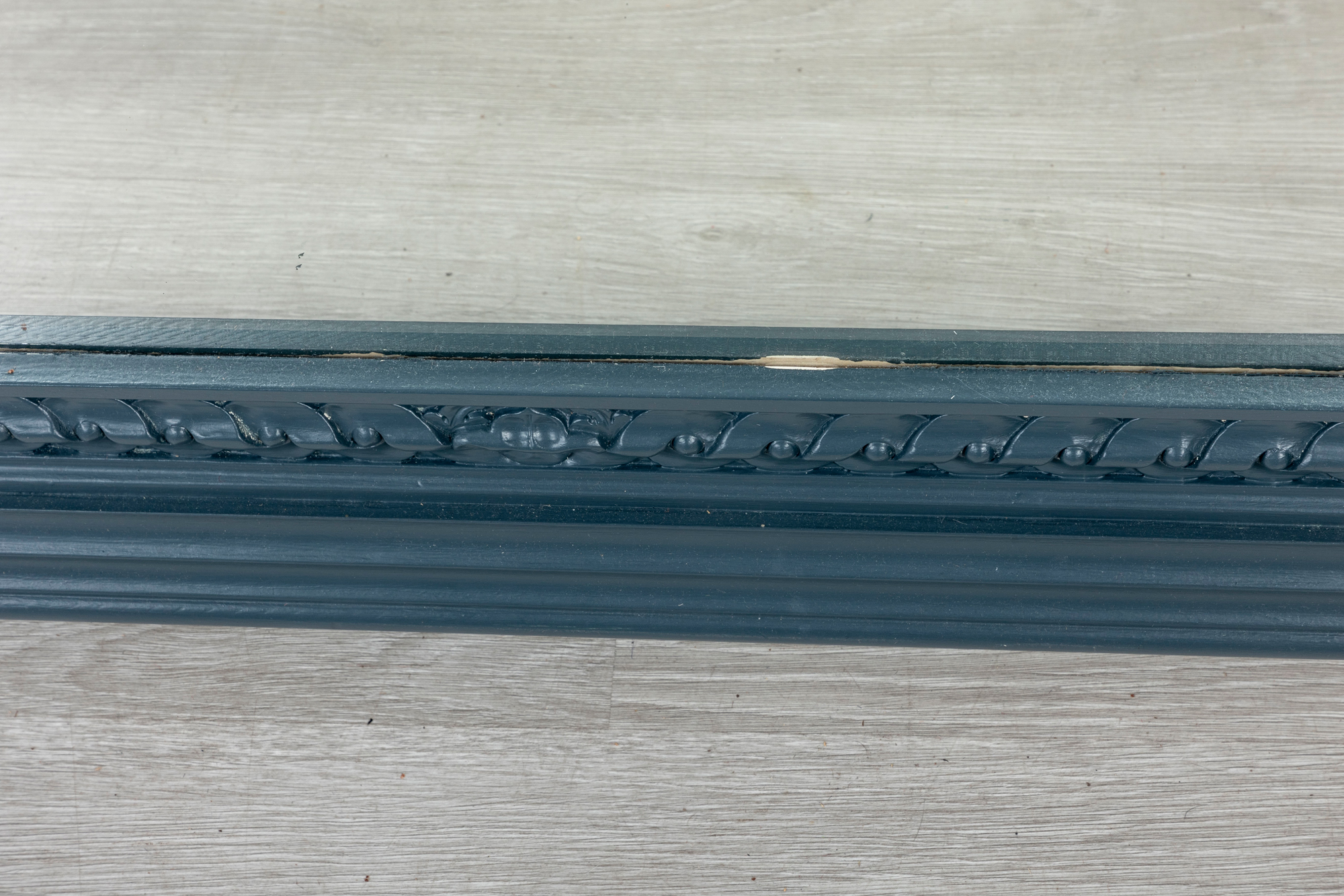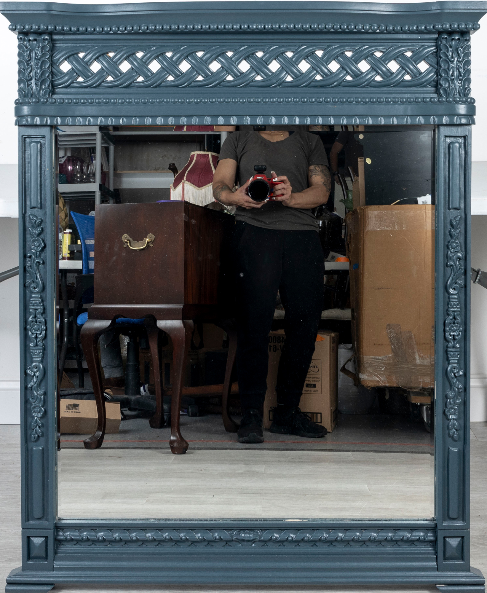 A large and imposing wall mirror largely decorated with carved foliates and woven designs finished in pleasing matte blue.
