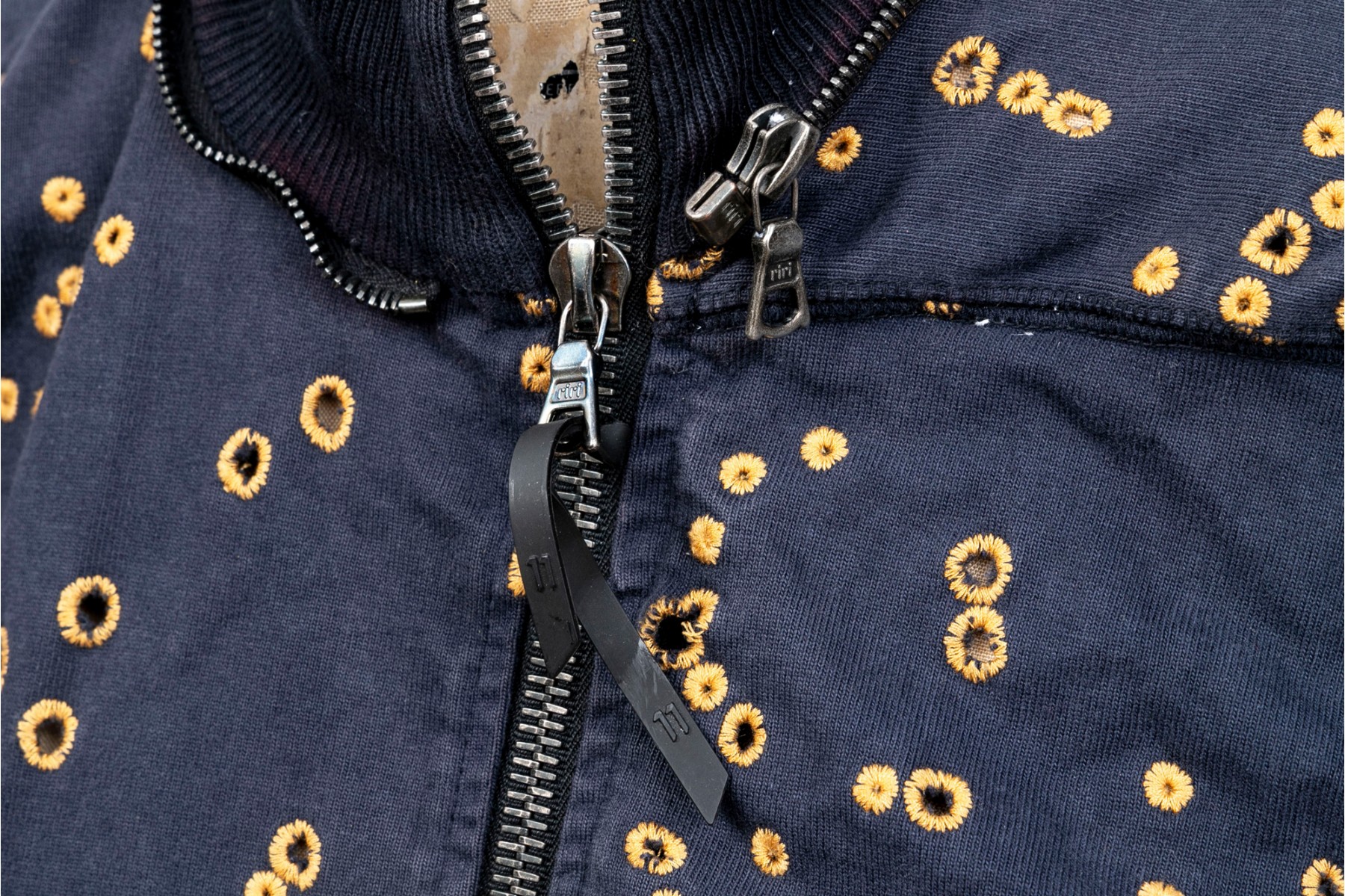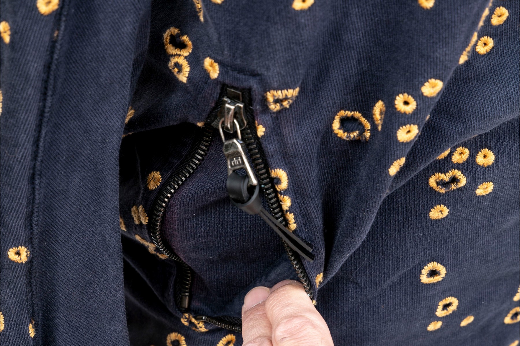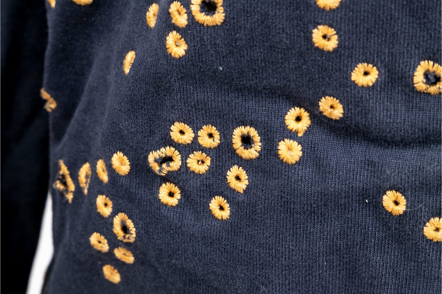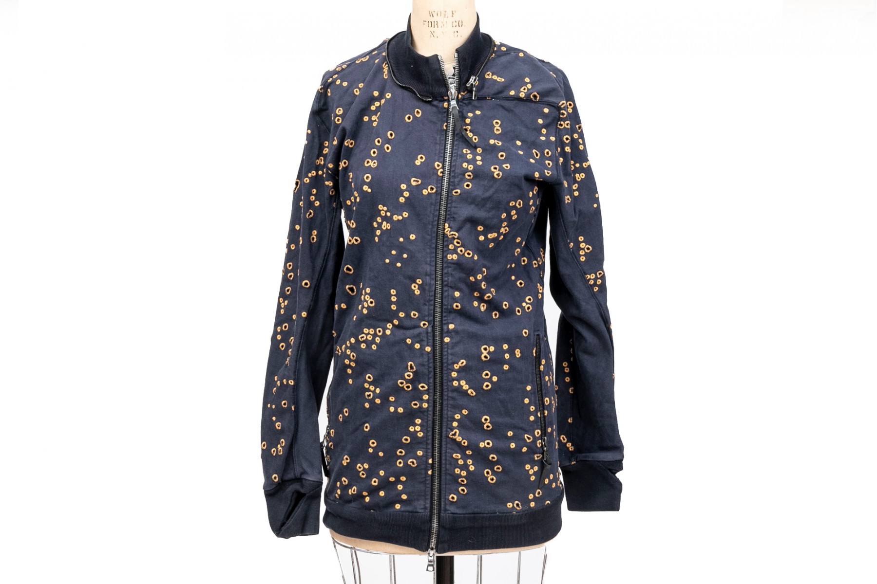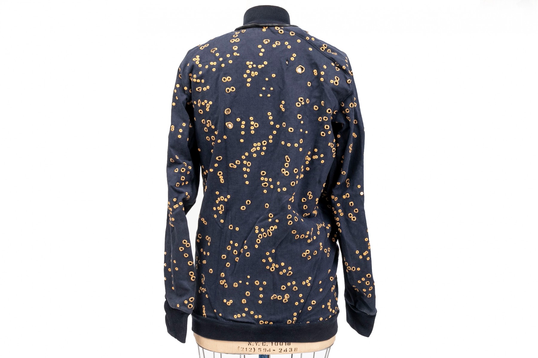 Dark blue zipp-up hooded sweat shirt. Accented with yellow irregular spots and accent holes.
