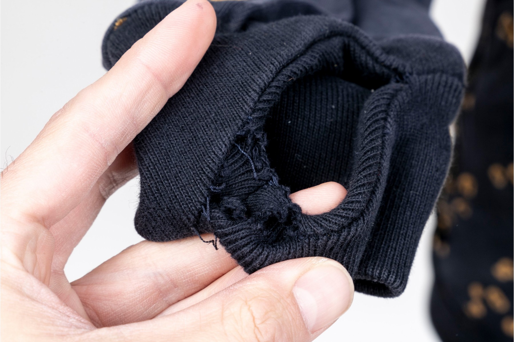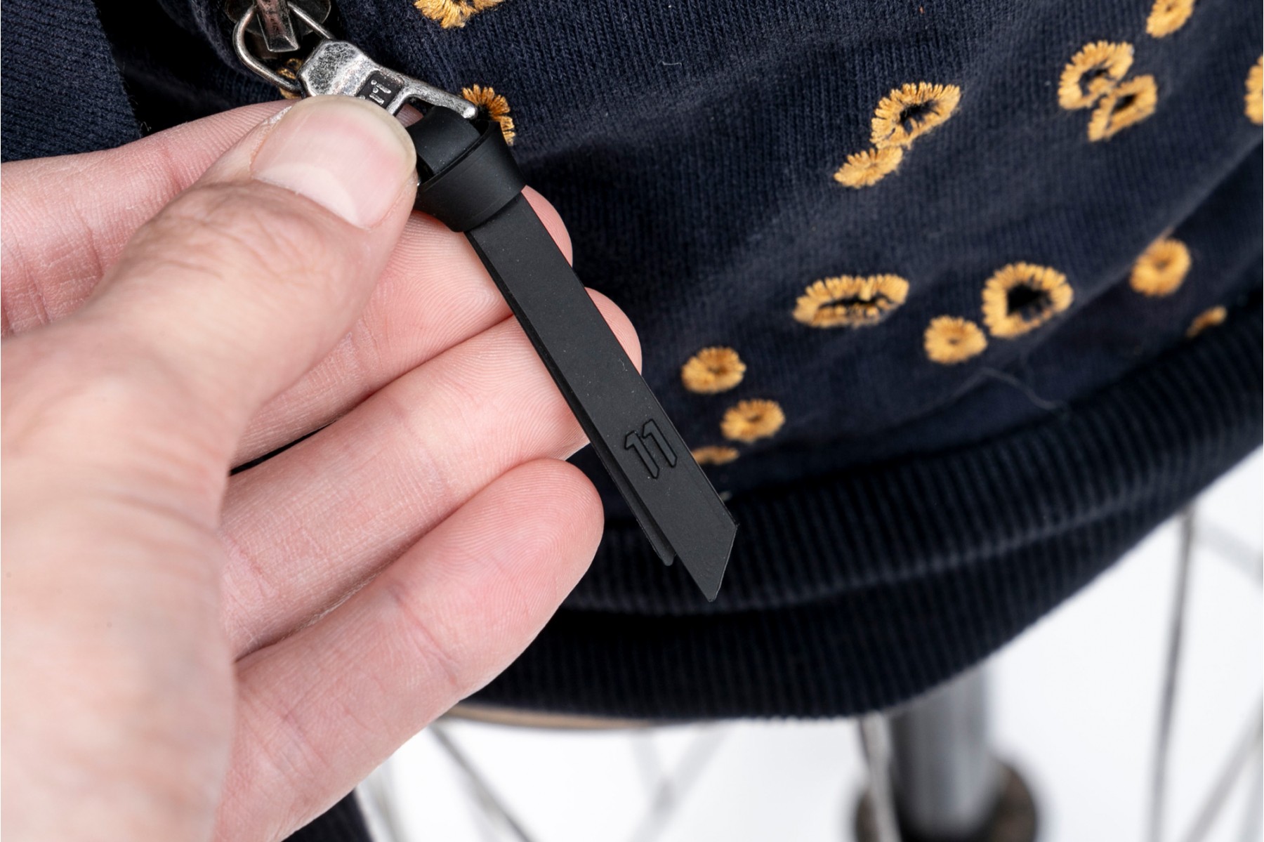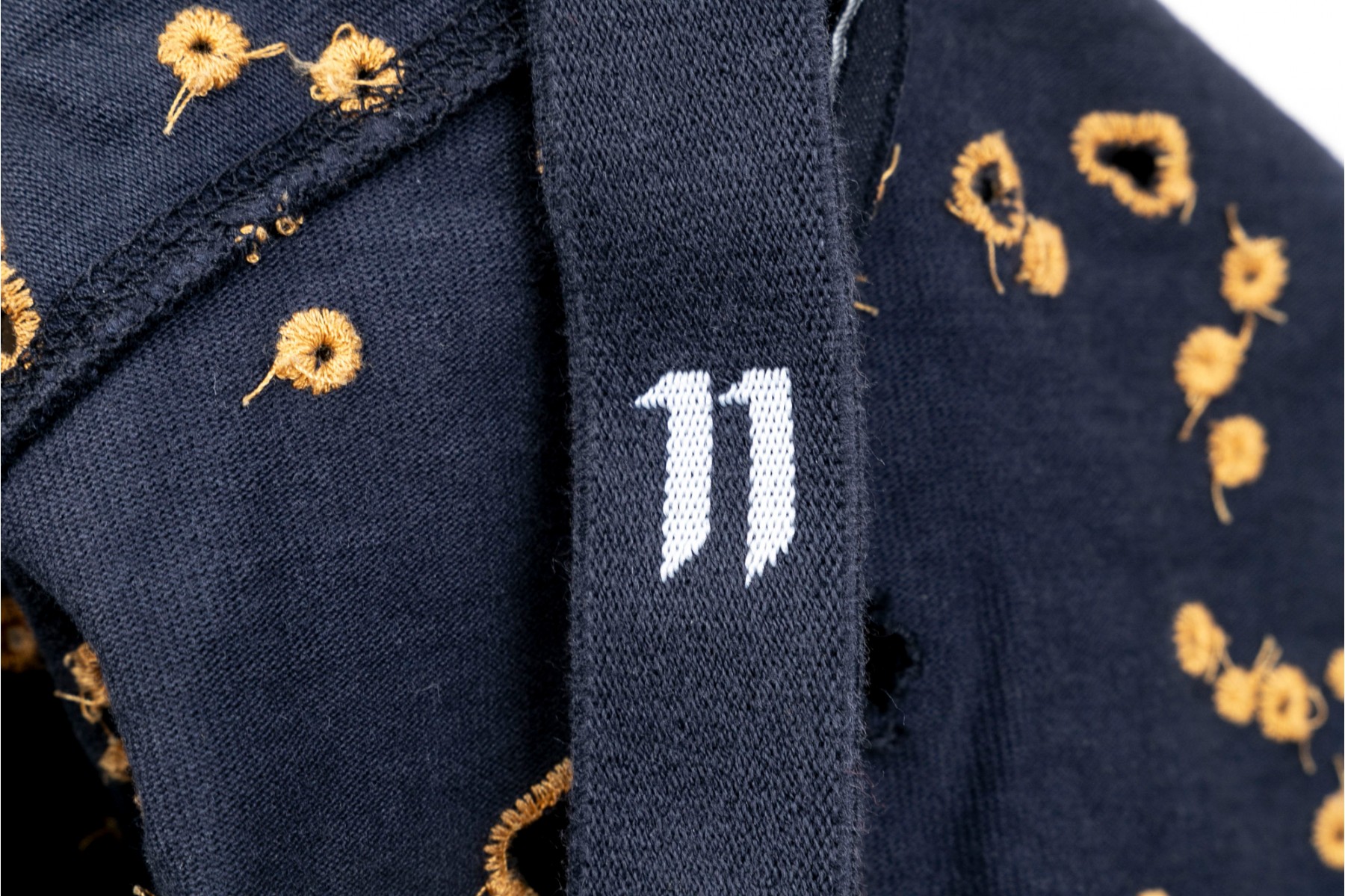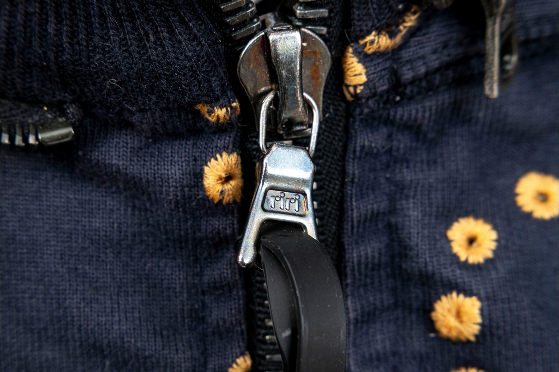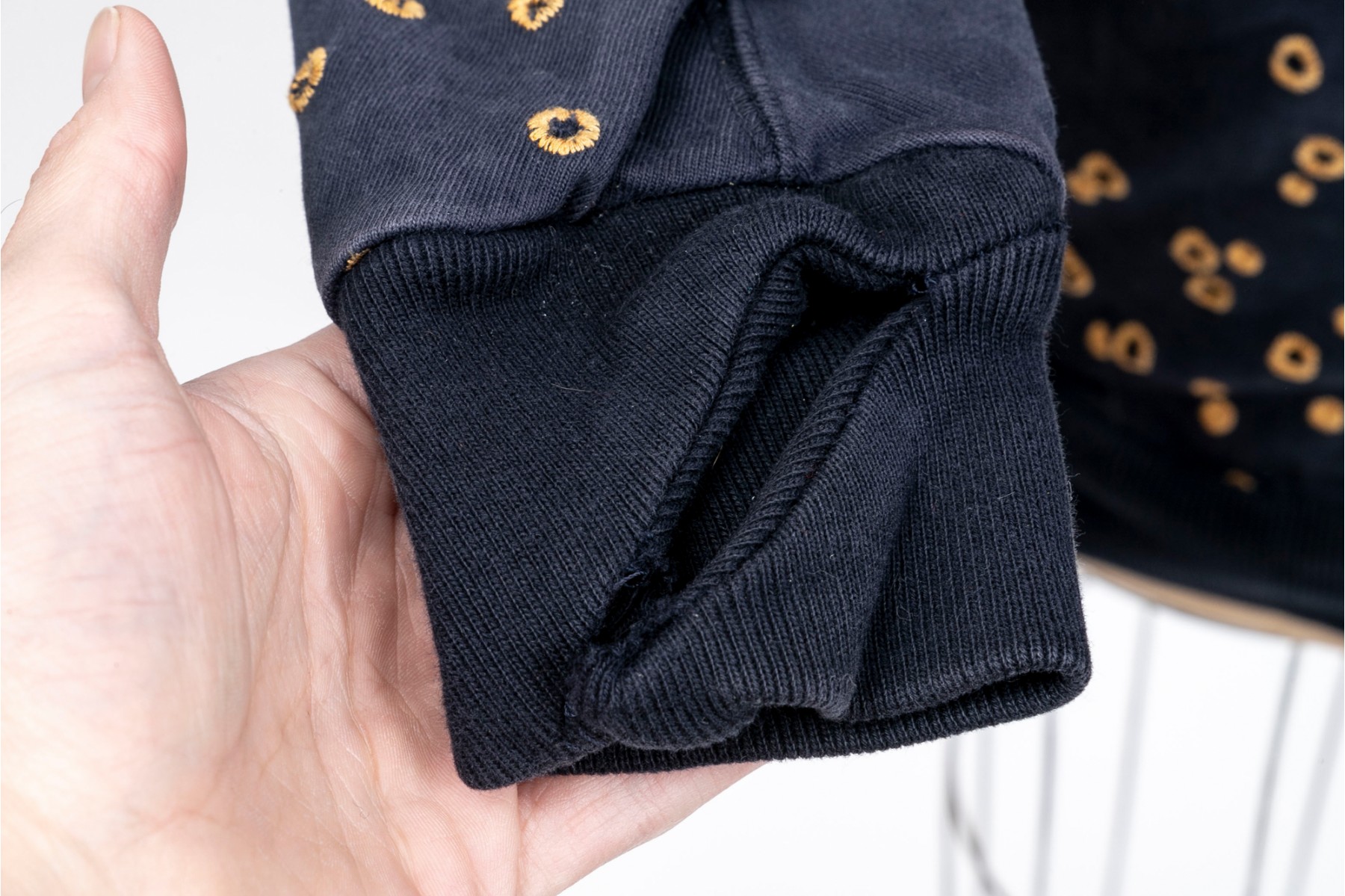 Dark blue zipp-up hooded sweat shirt. Accented with yellow irregular spots and accent holes.