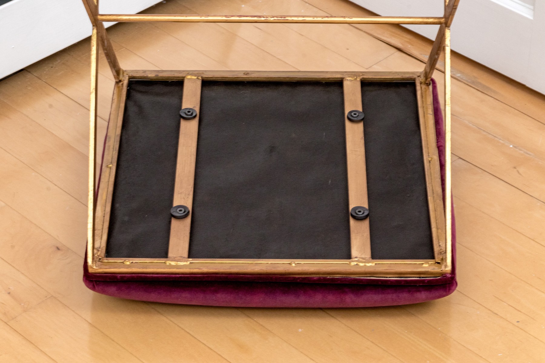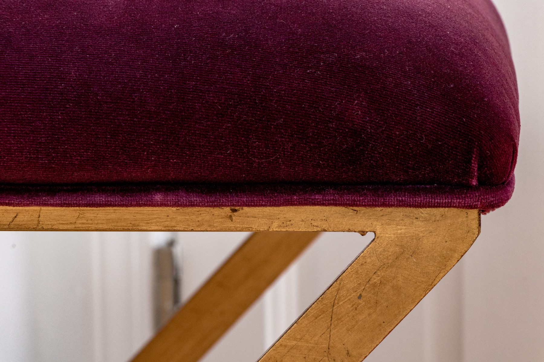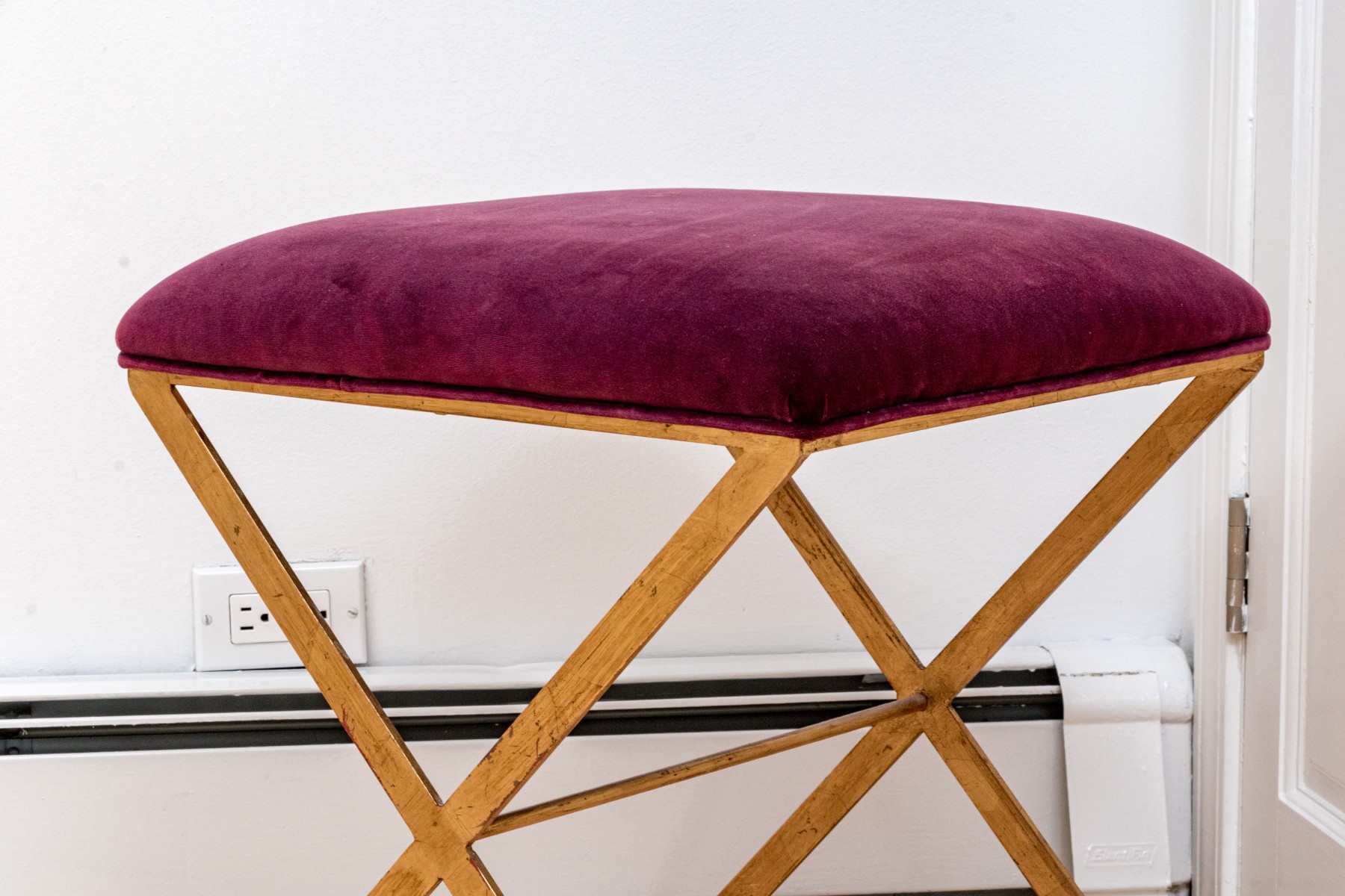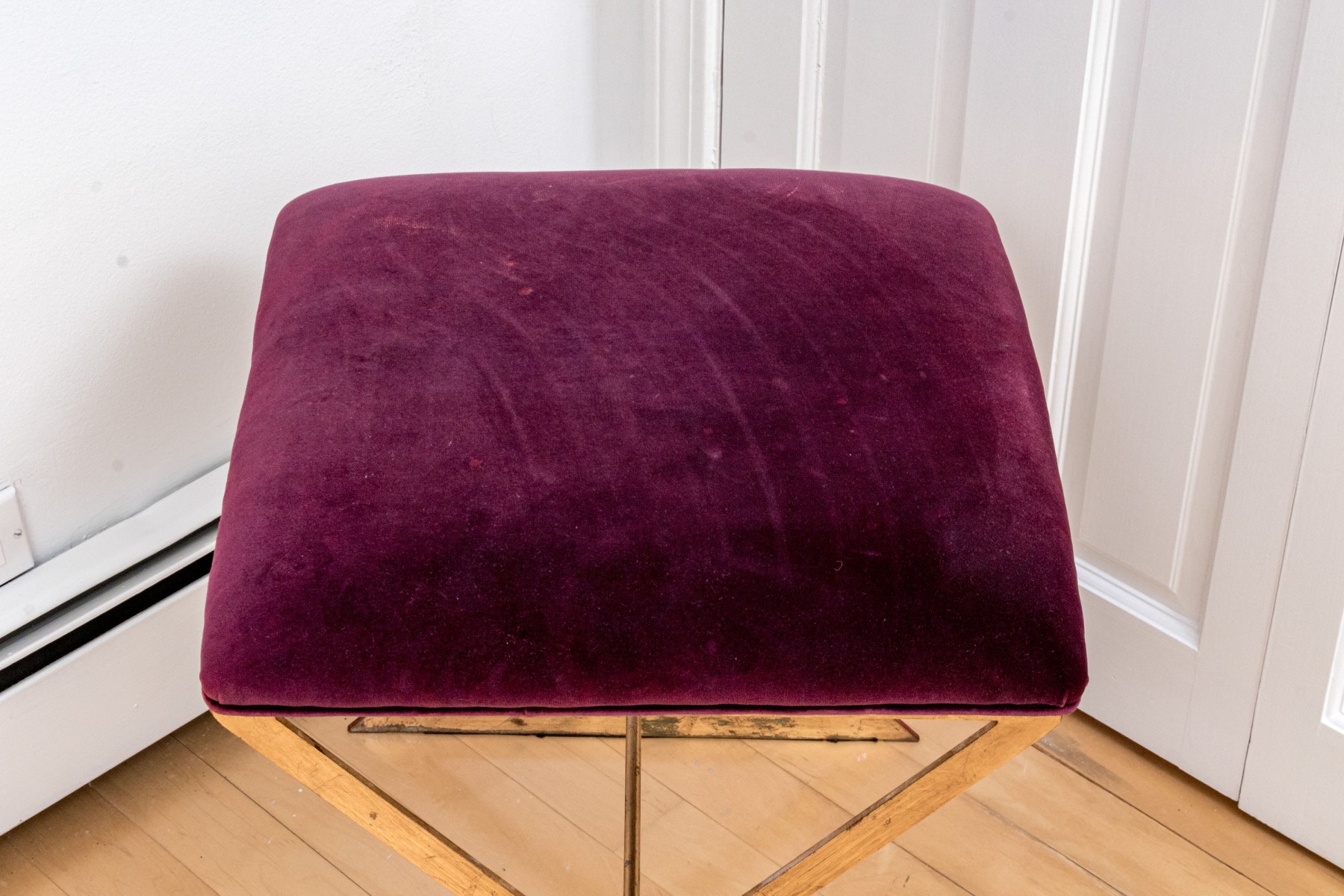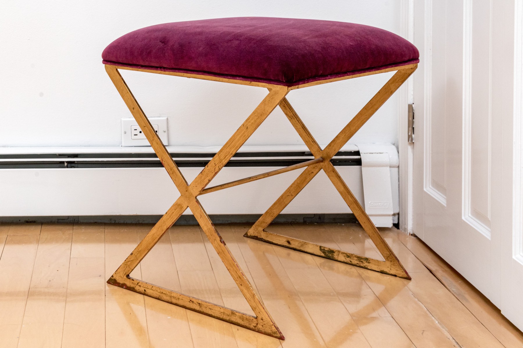 Fantastically chic brass finished "X" form framed stool with a plum hued crushed velvet textured upholstered seat.