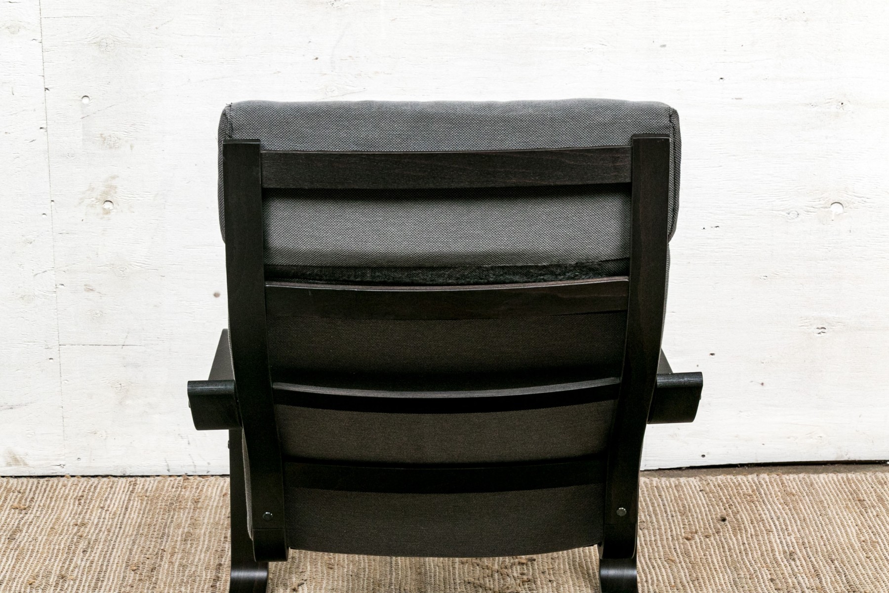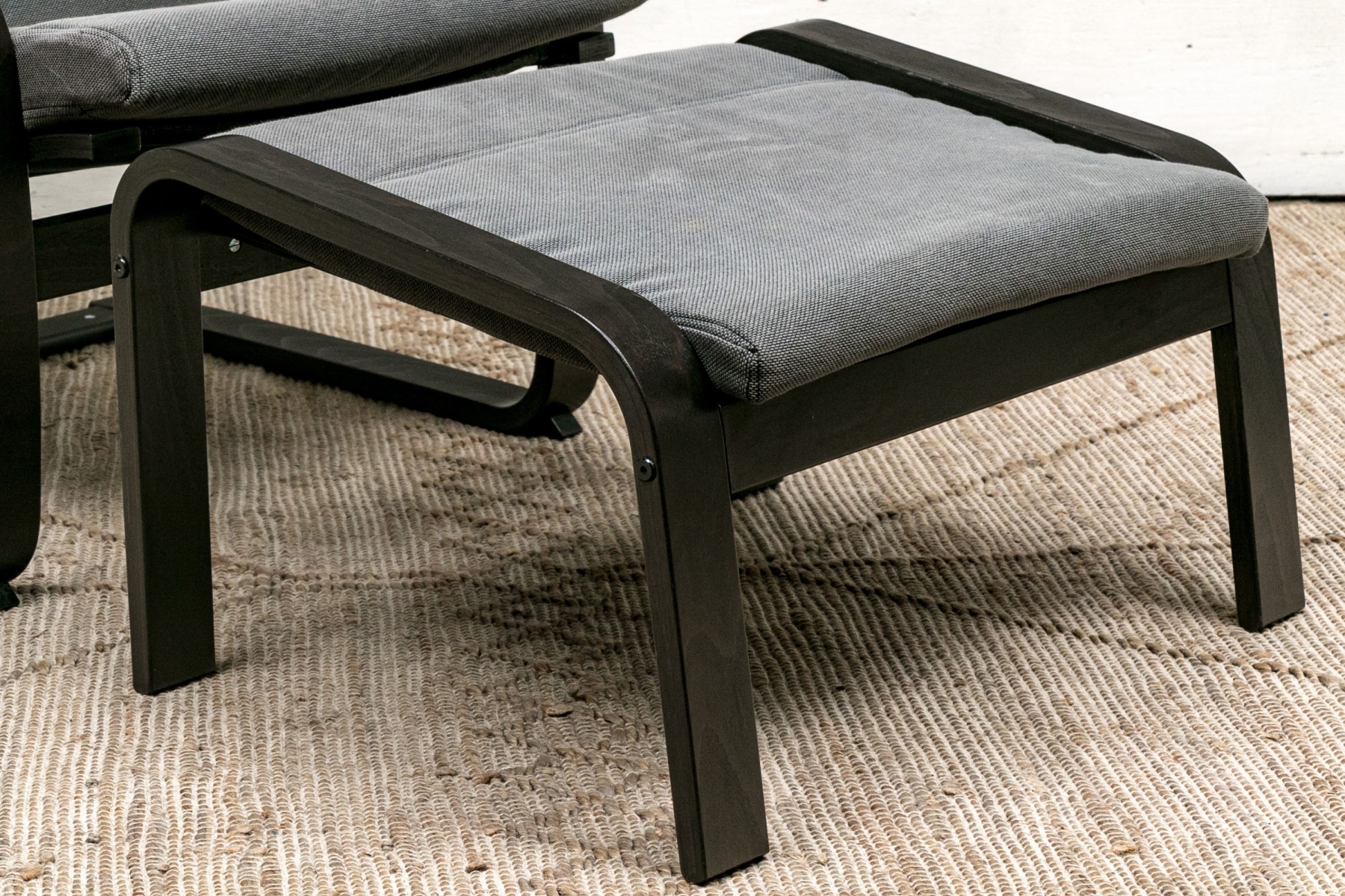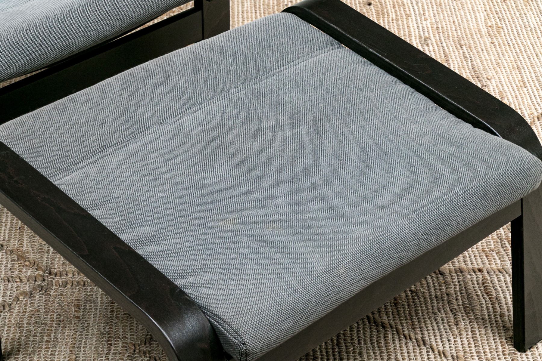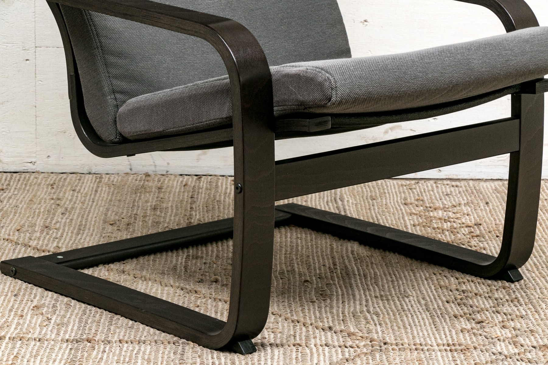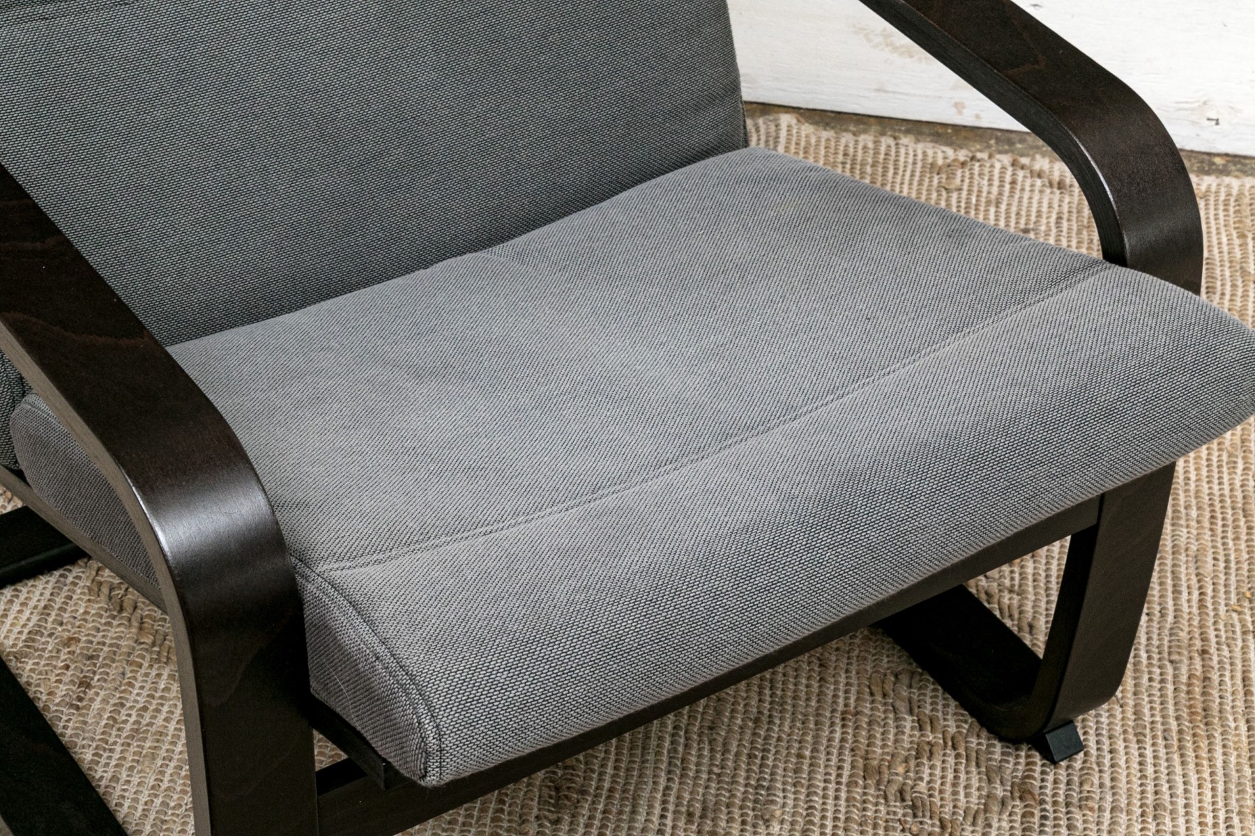 A contemporary design with a dark stained wood open frame. With a separate gray fabric cushion with velcro. The matching ottoman slanted in form also with a separate cushion with velcro.