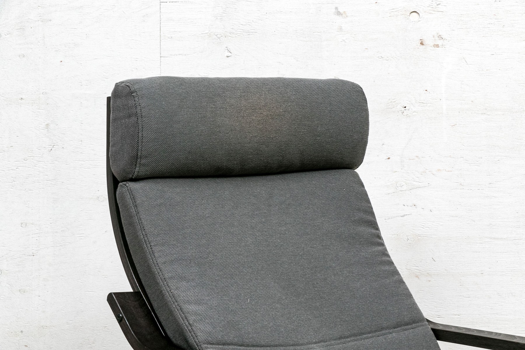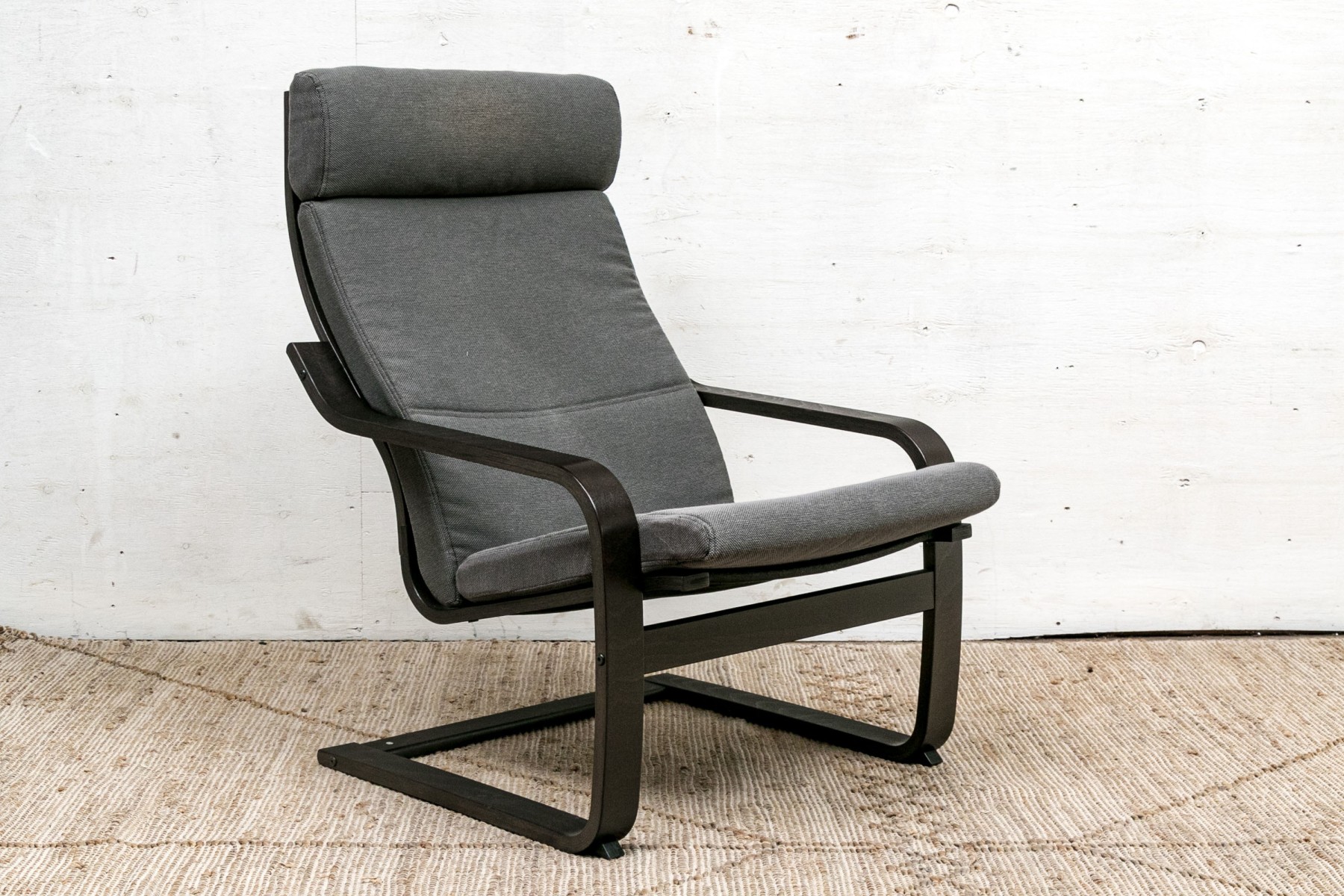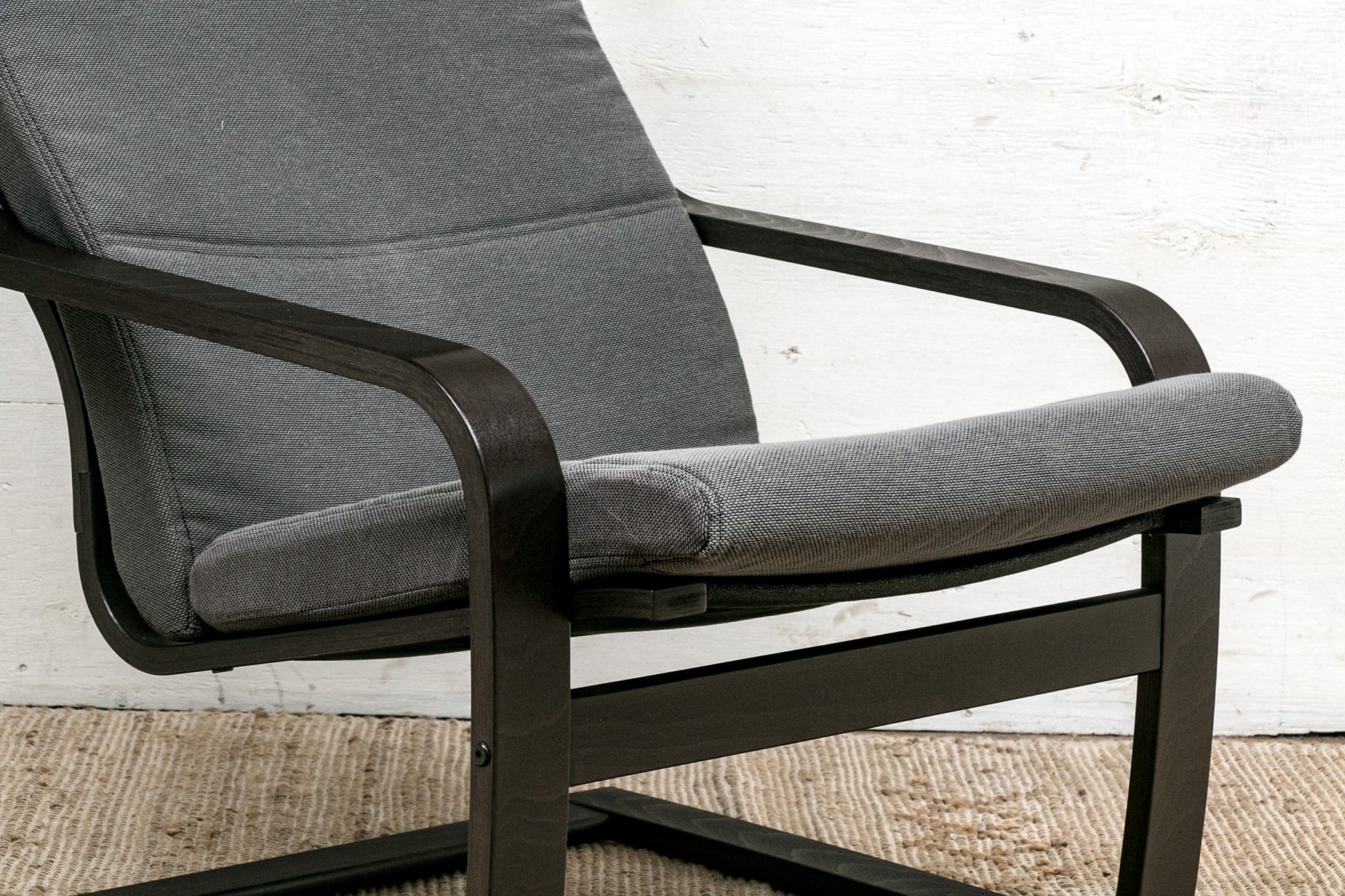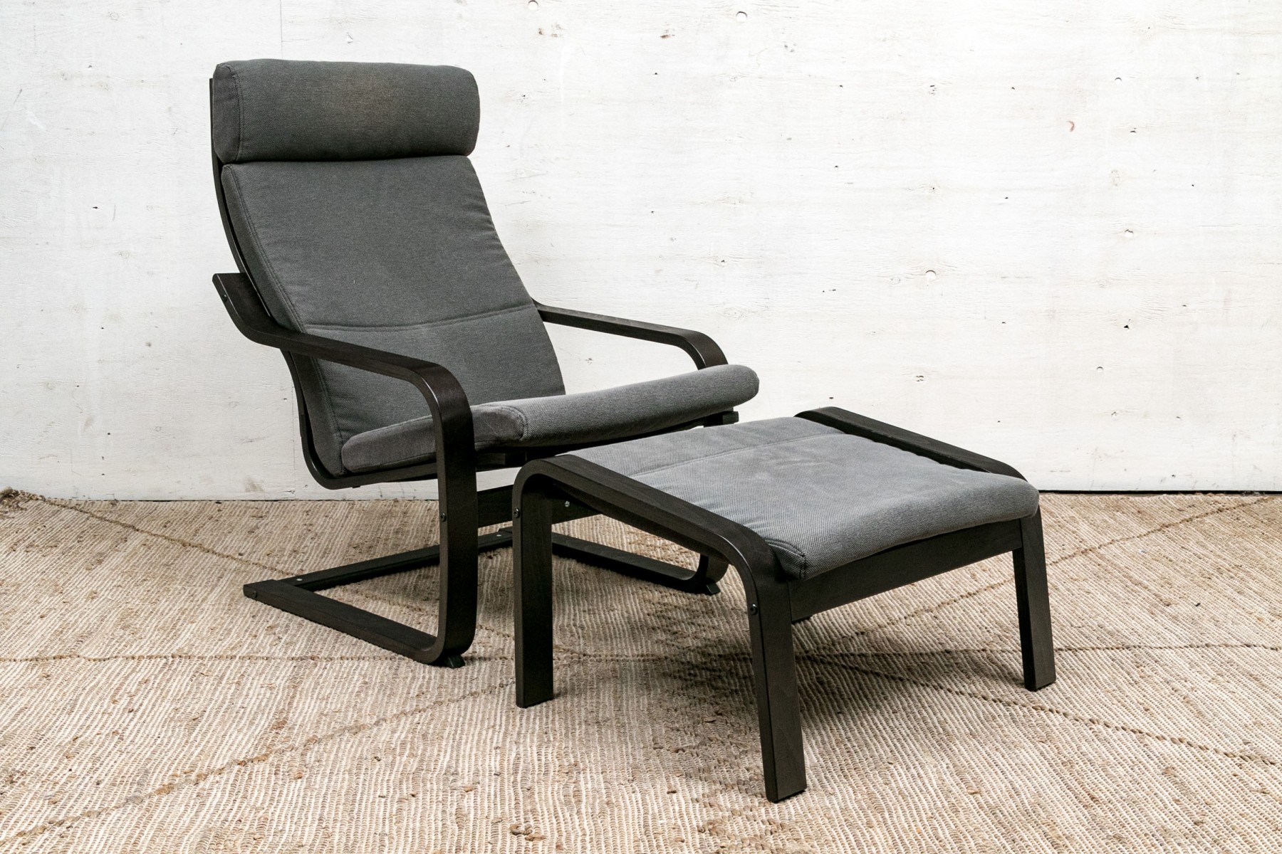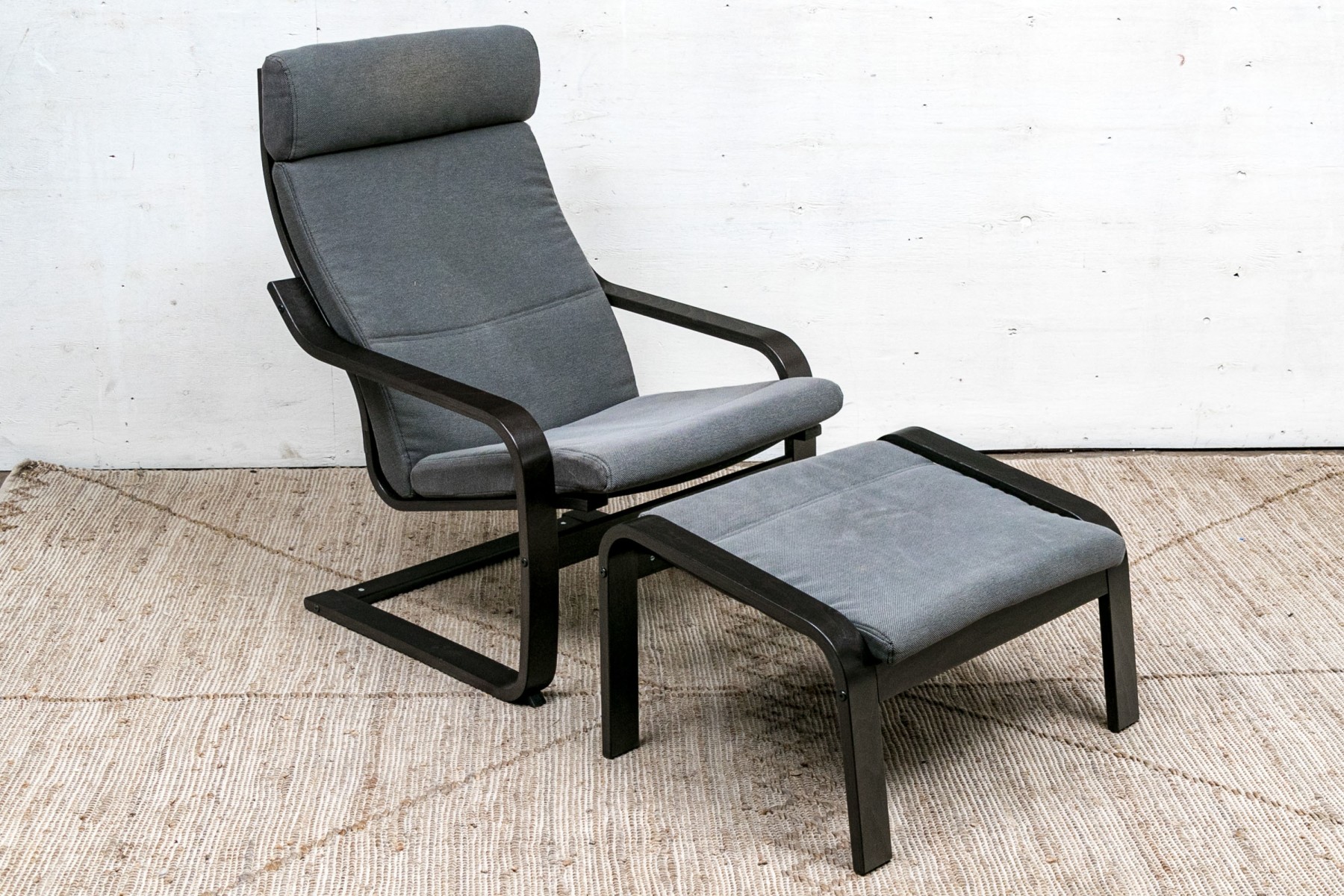 A contemporary design with a dark stained wood open frame. With a separate gray fabric cushion with velcro. The matching ottoman slanted in form also with a separate cushion with velcro.