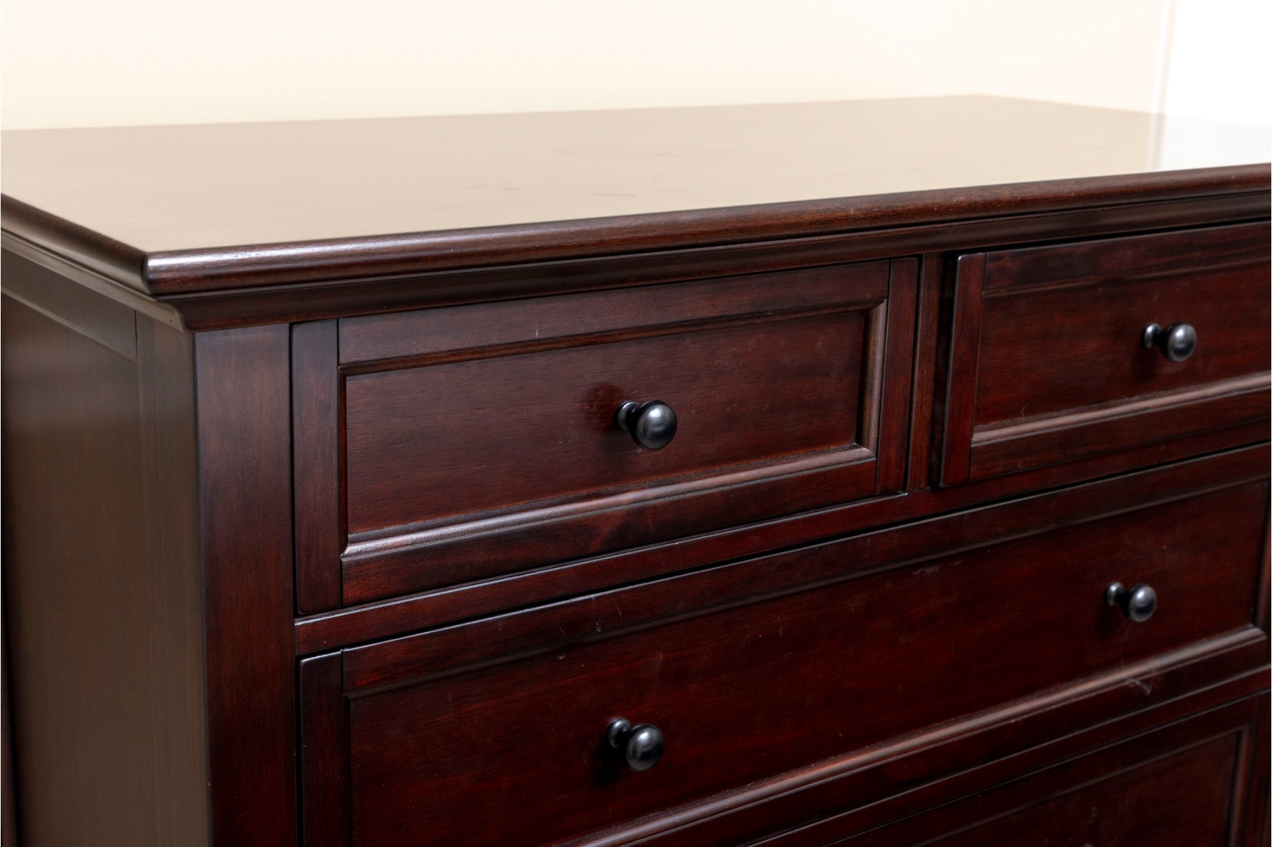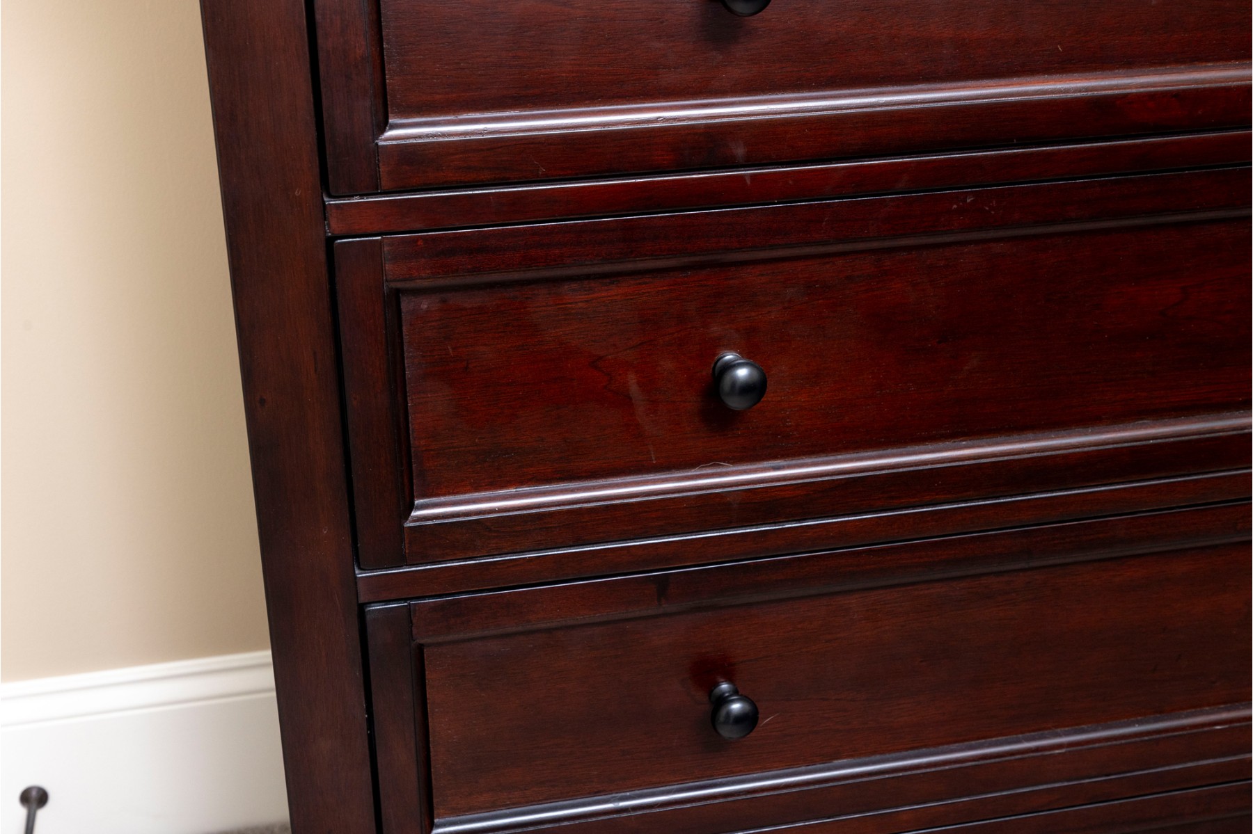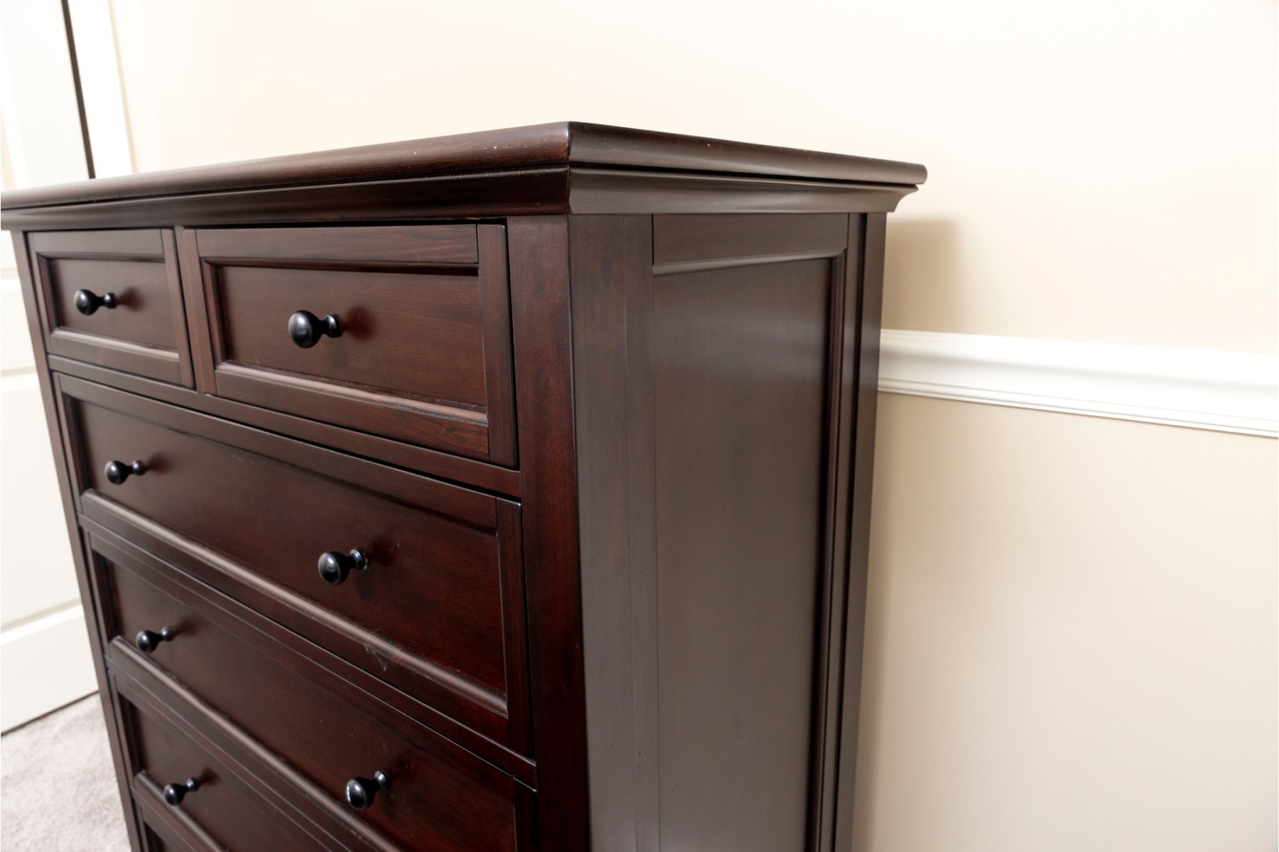 A large contemporary chest of drawers in a deep espresso finish. The shaker front drawers are all showcase dovetailed joinery.