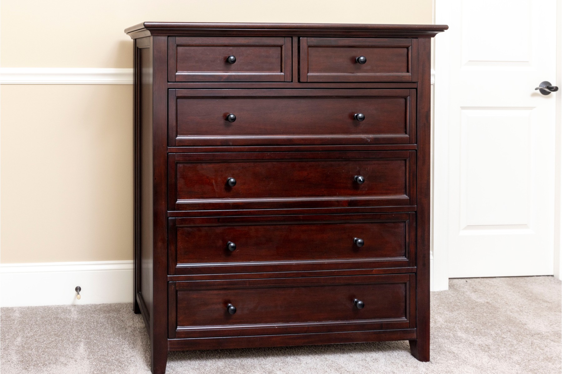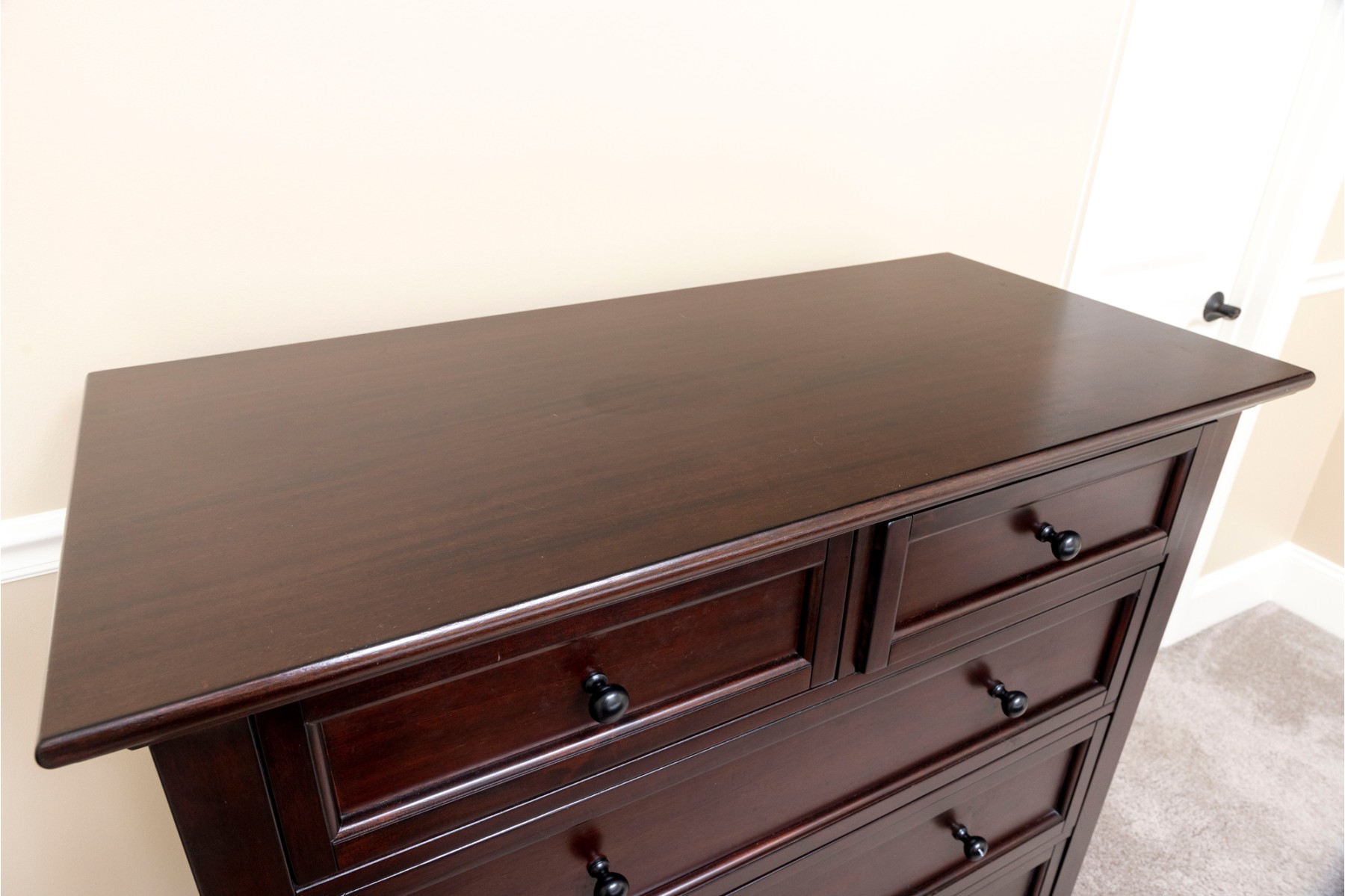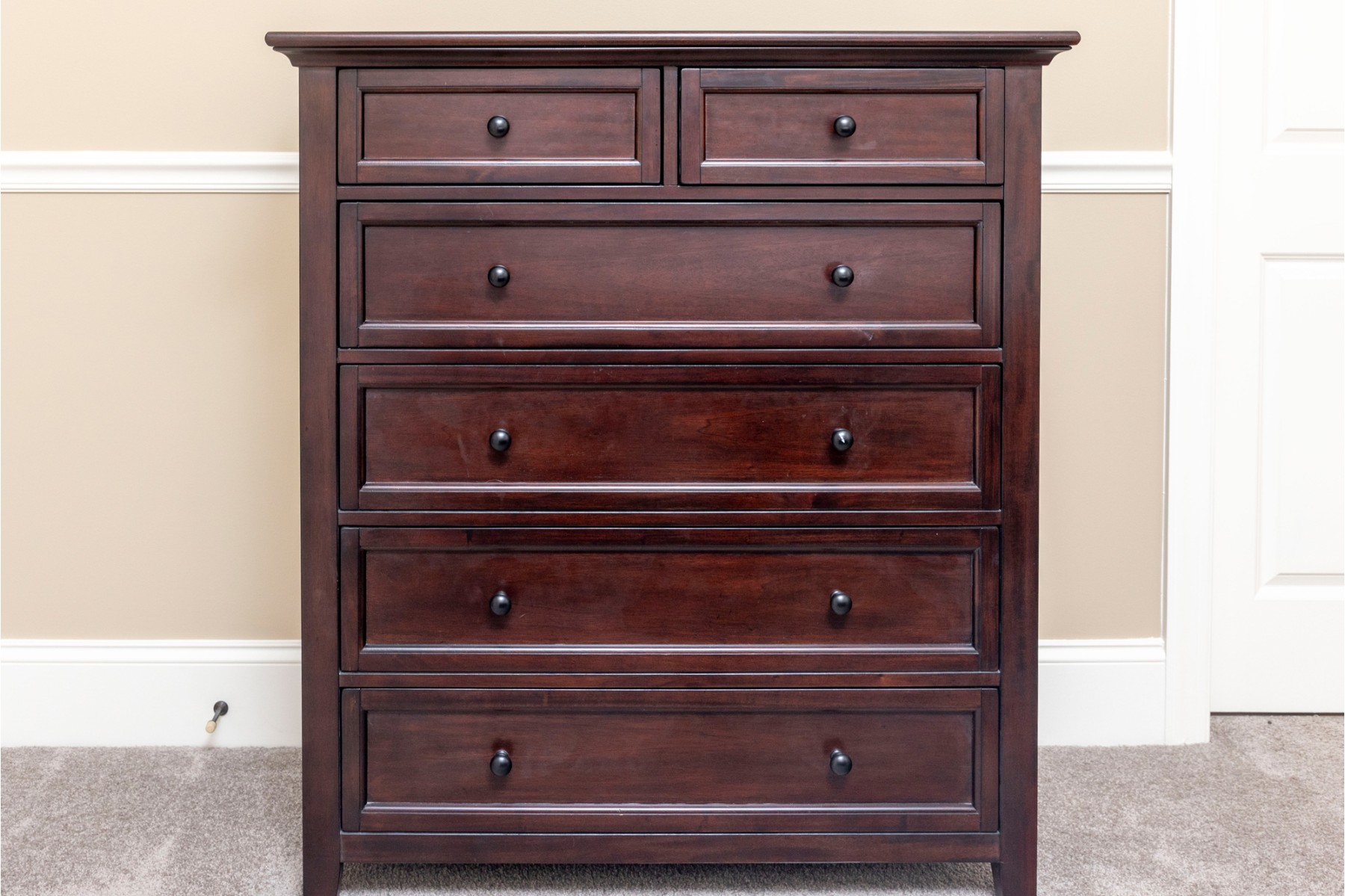A large contemporary chest of drawers in a deep espresso finish. The shaker front drawers are all showcase dovetailed joinery.