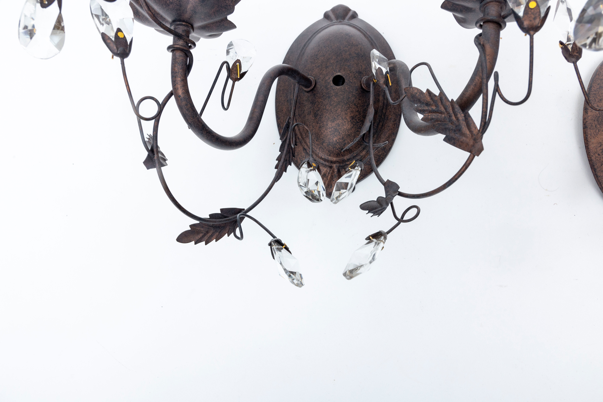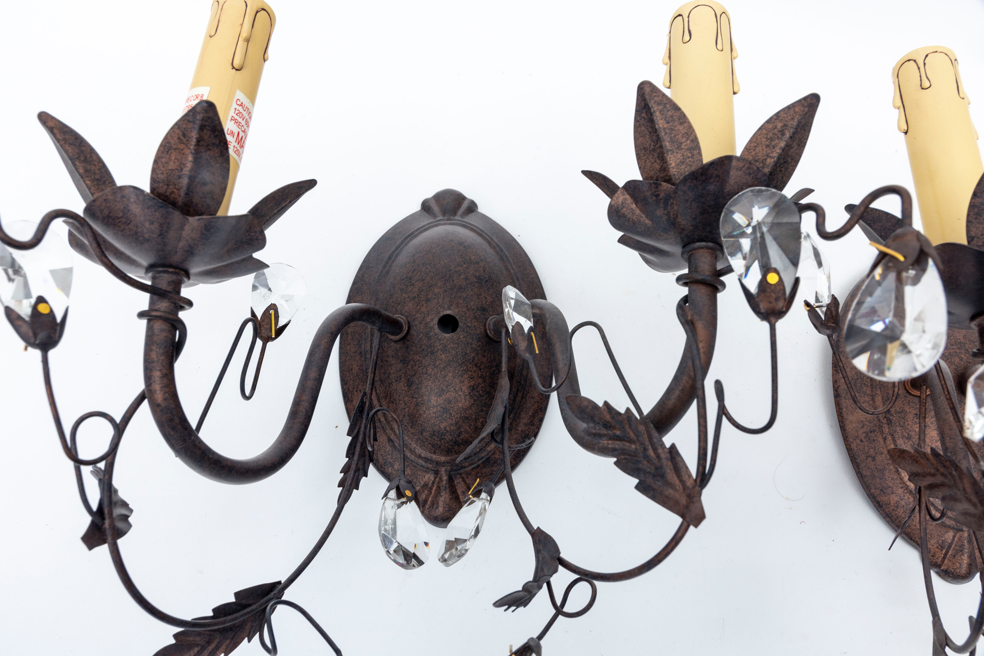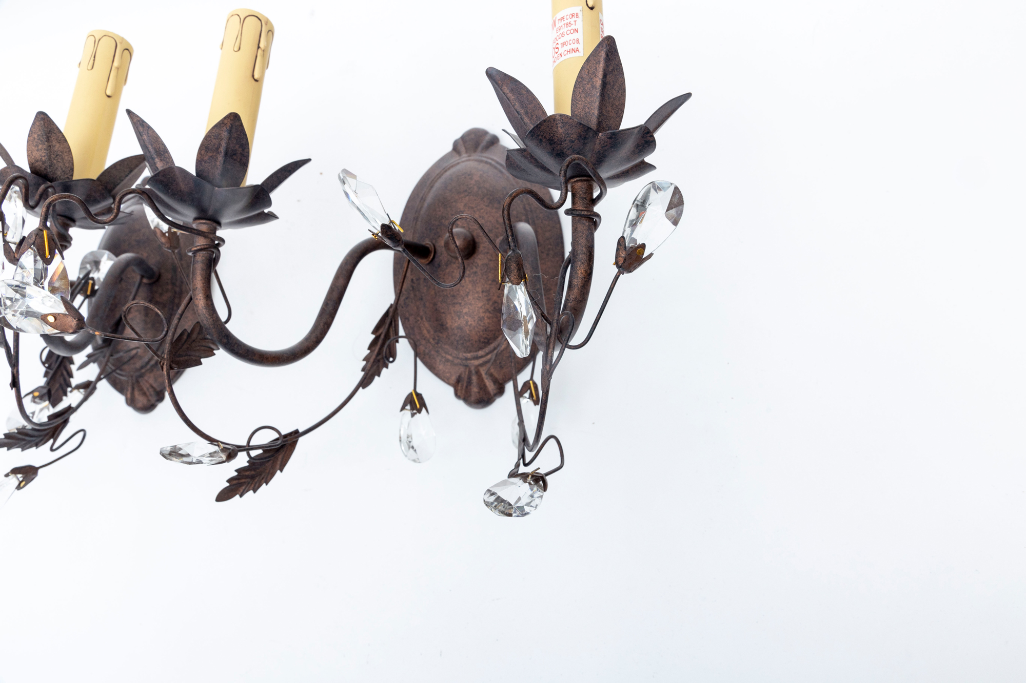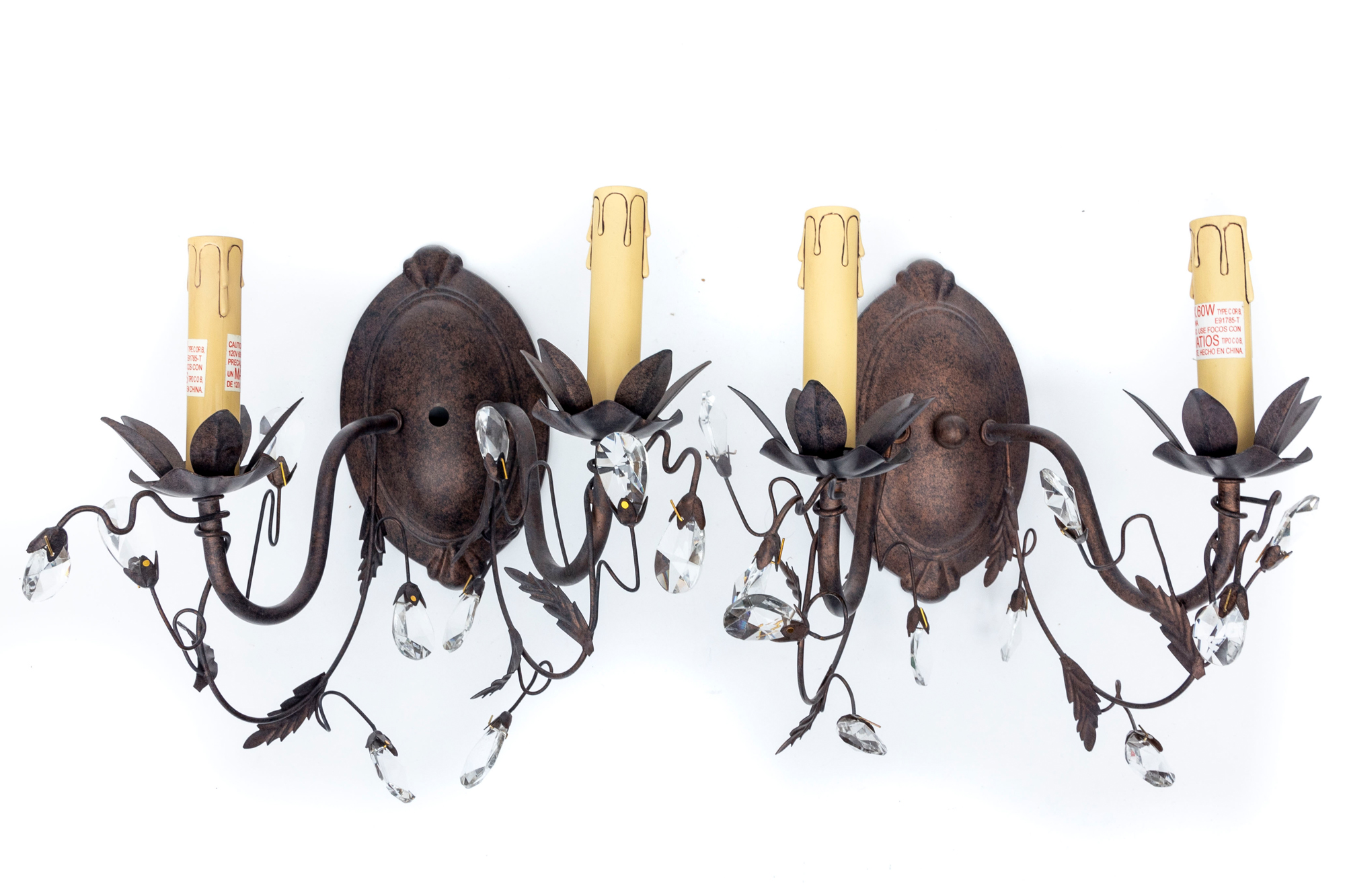 A pair of wall sconces, purposefully distressed with cut crystal foliate accents and faux candlestick two bulb fixtures.