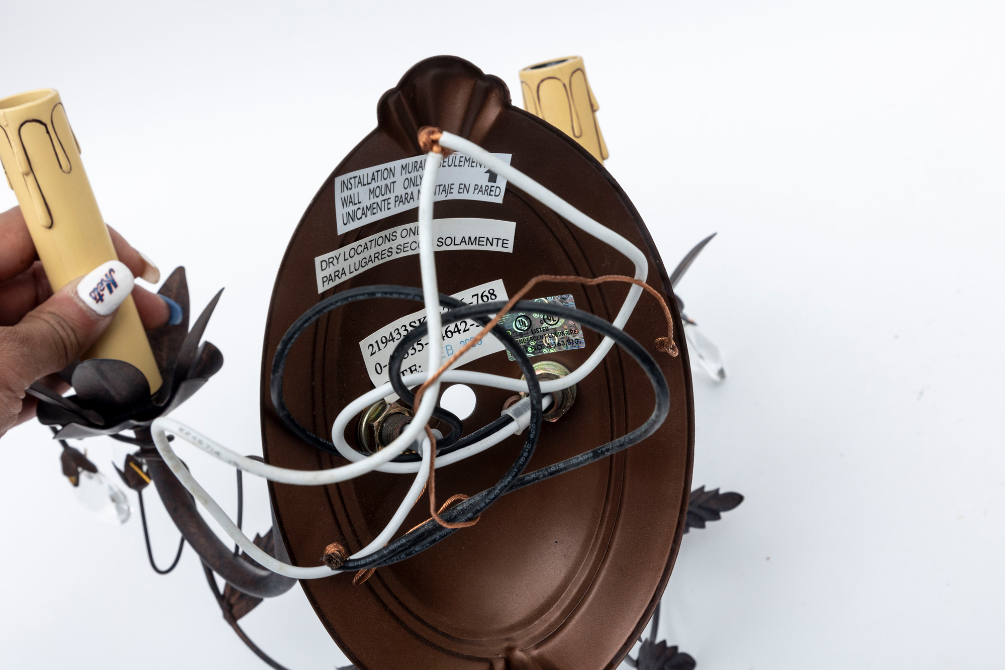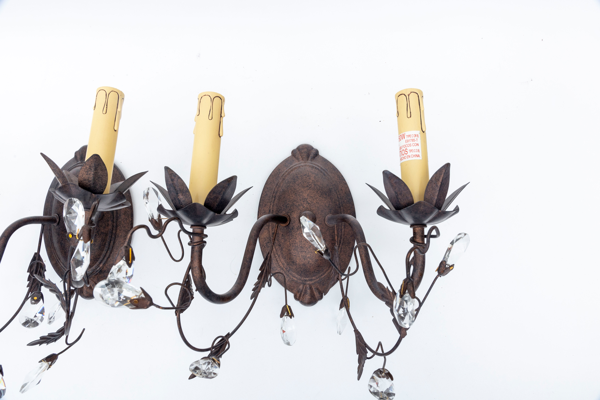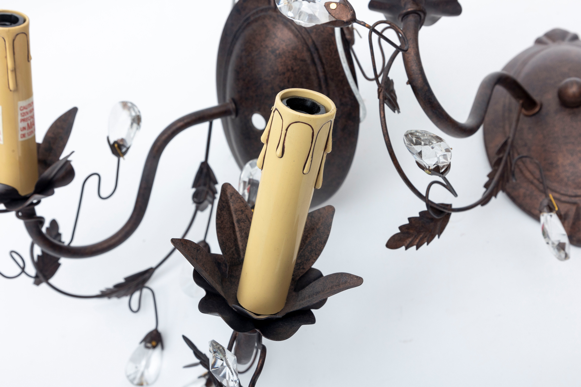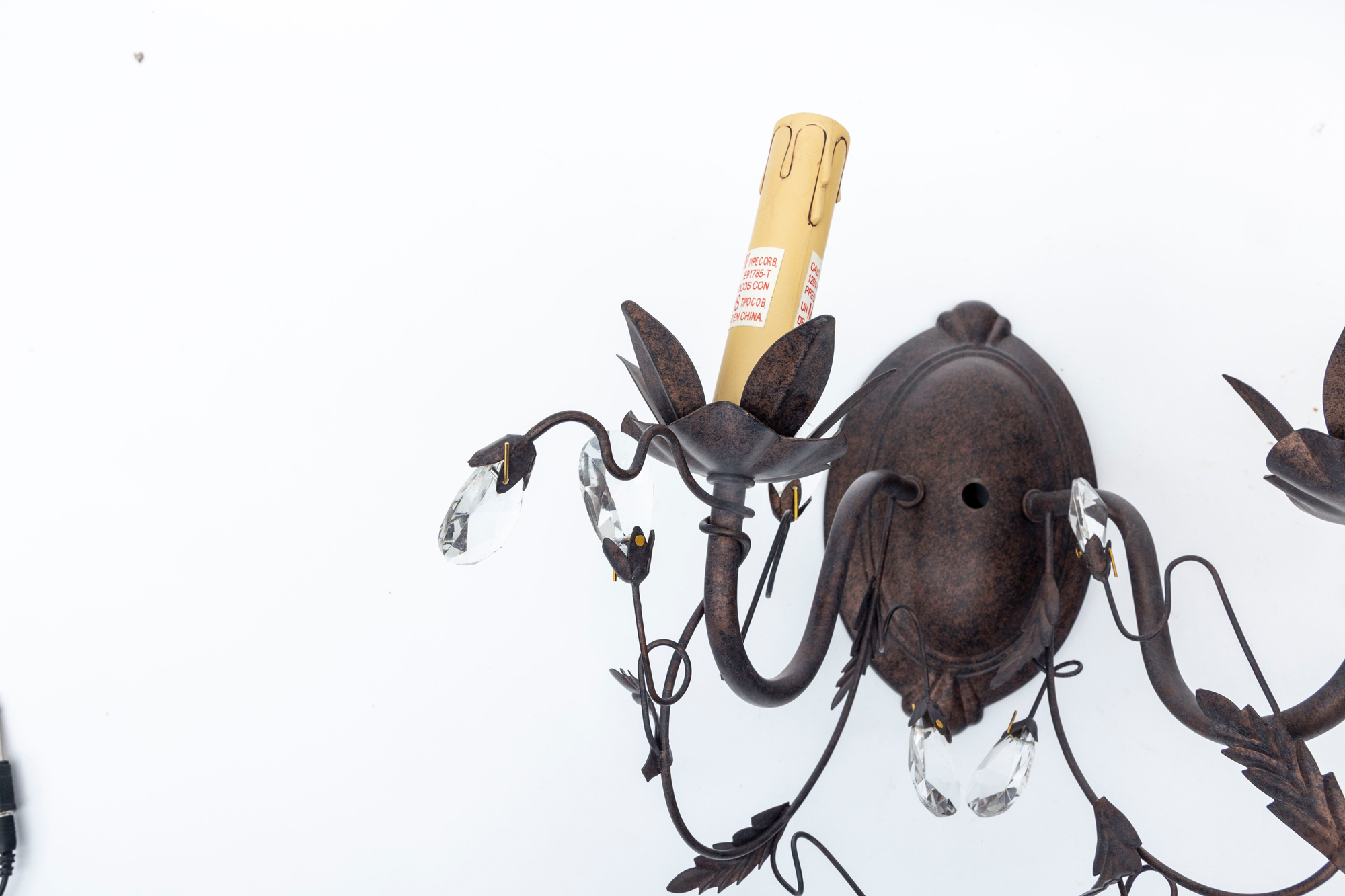 A pair of wall sconces, purposefully distressed with cut crystal foliate accents and faux candlestick two bulb fixtures.