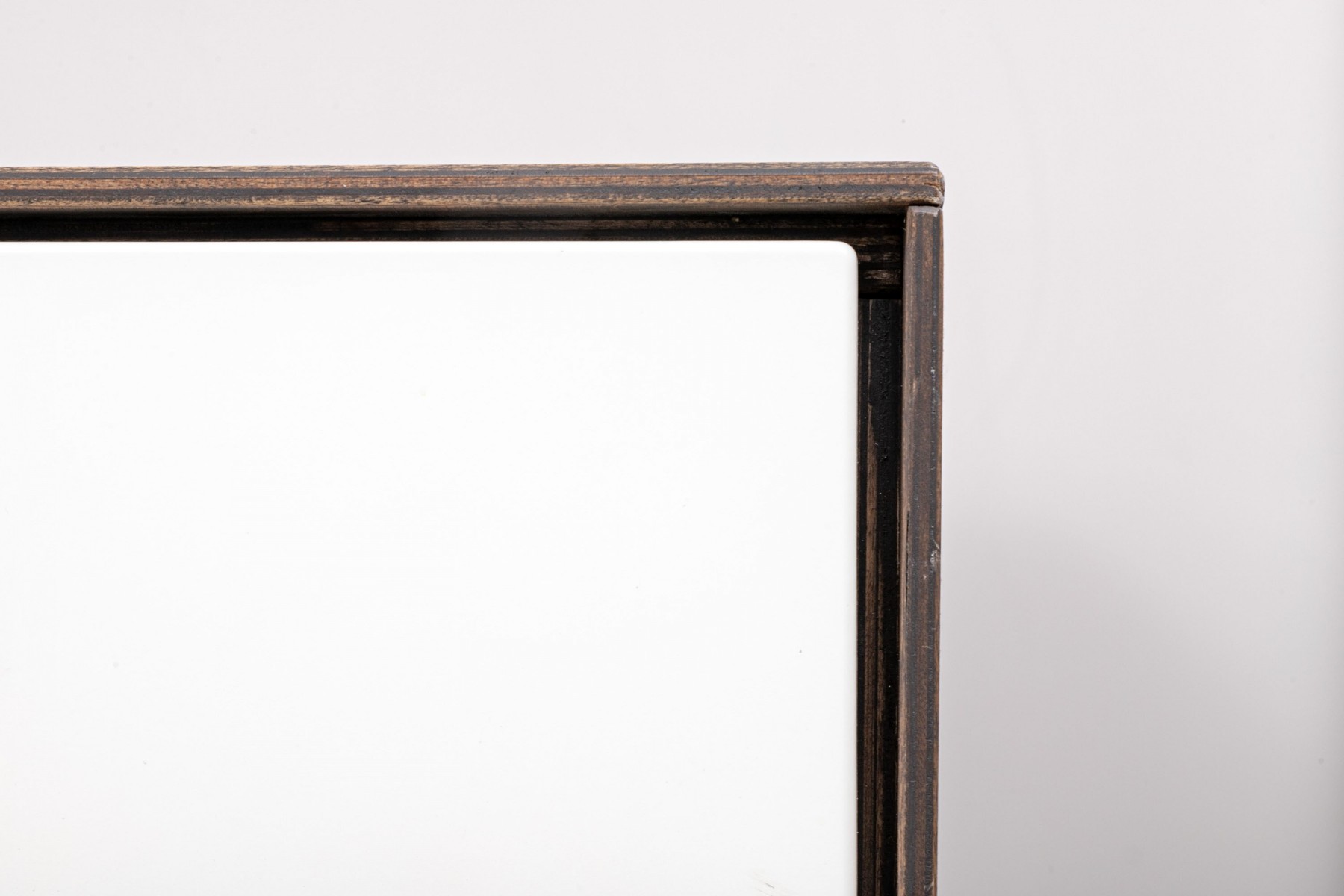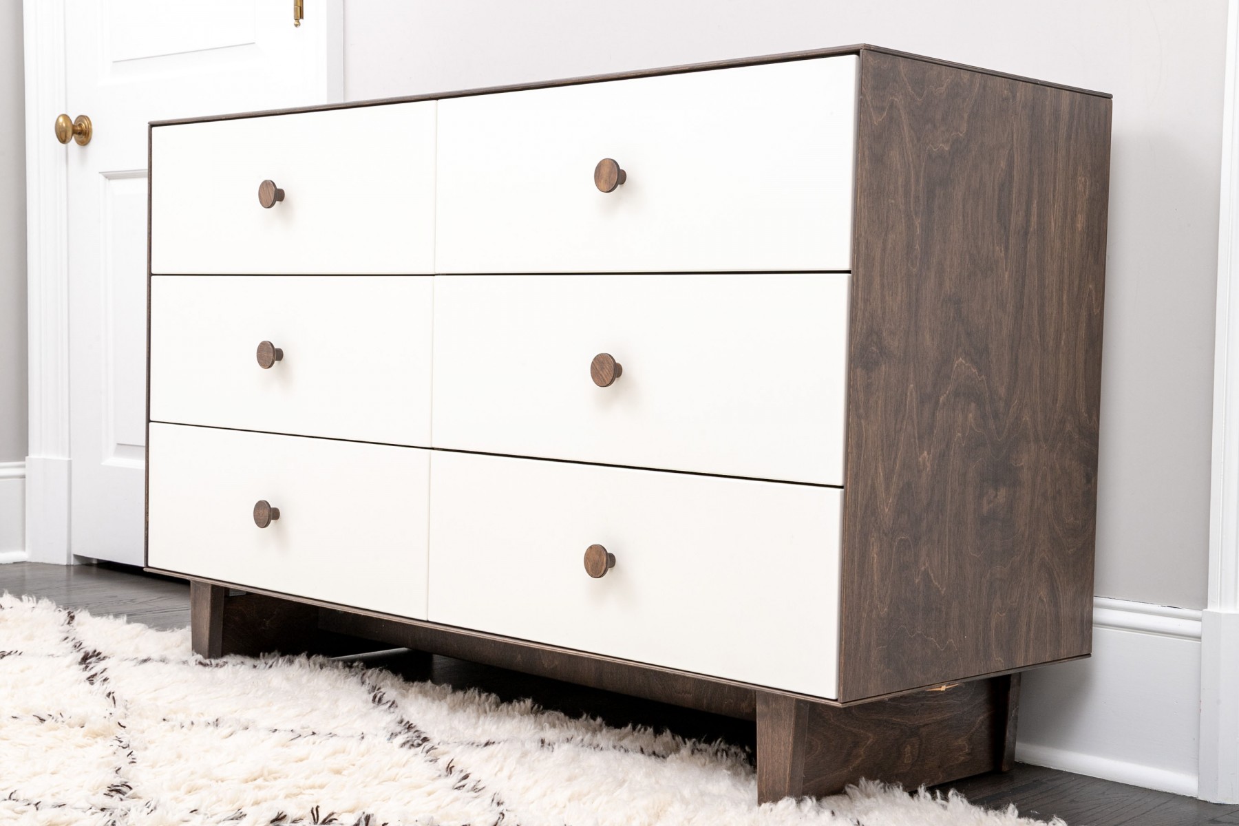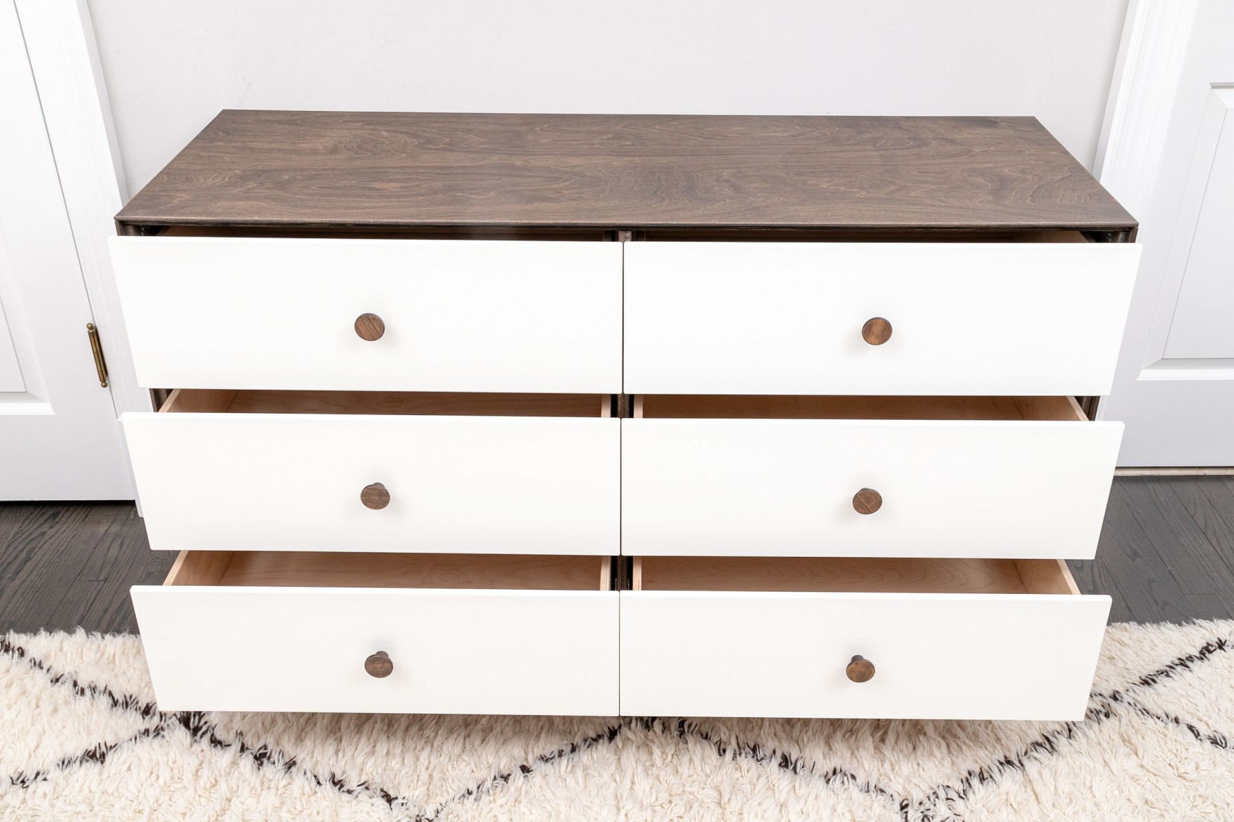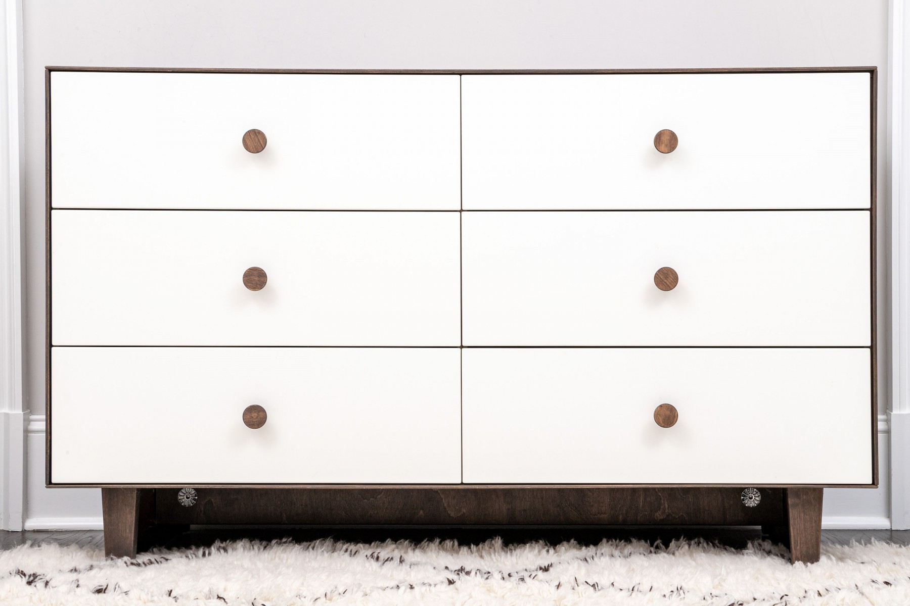 A stained wood frame with white laminate drawers on front with wood pulls. Raised on recessed square wood legs with solid sides.