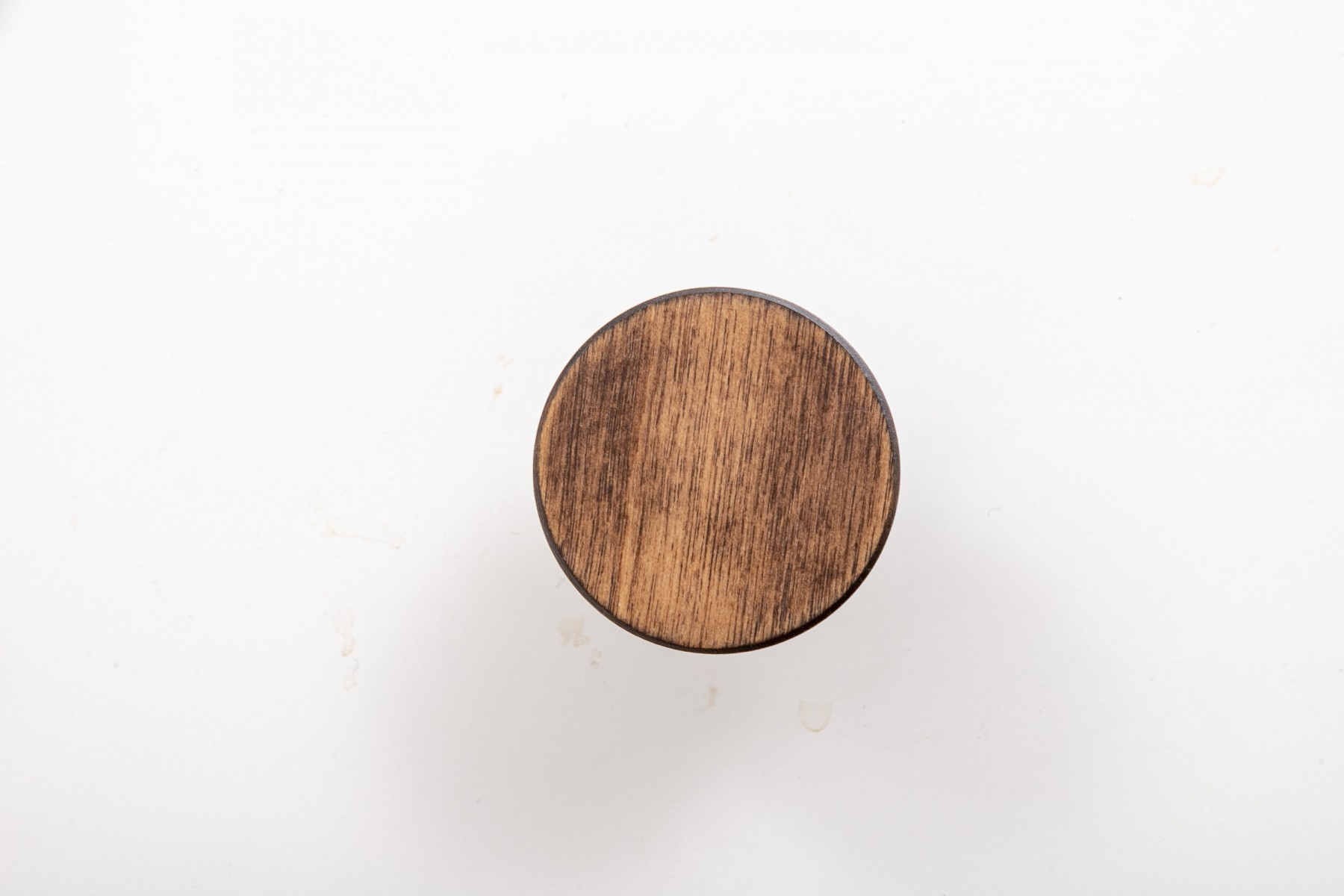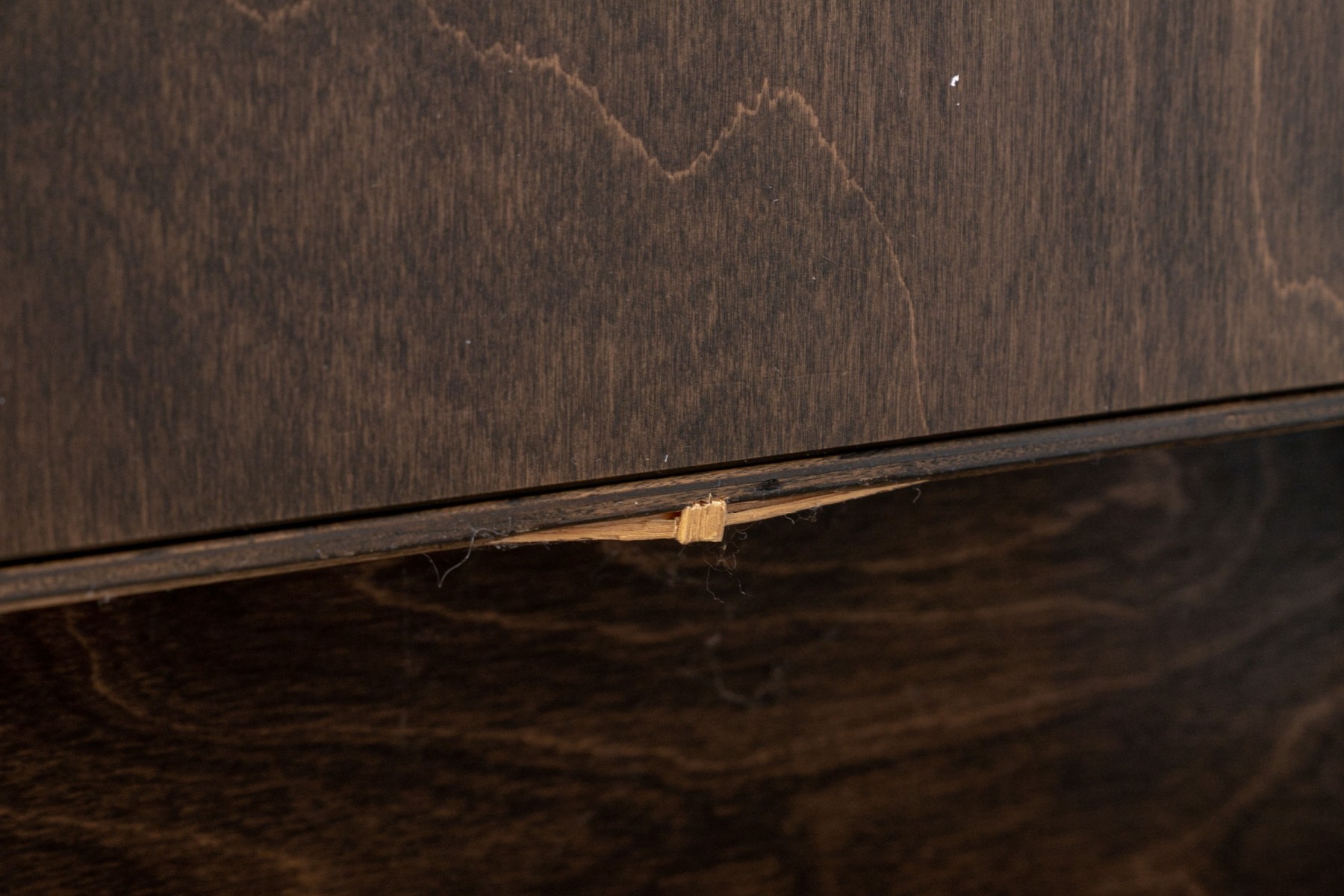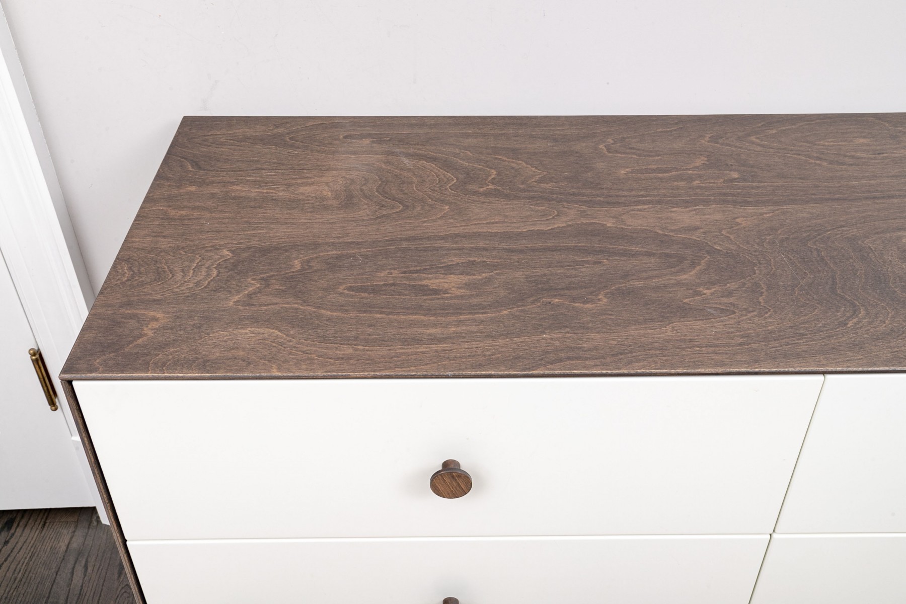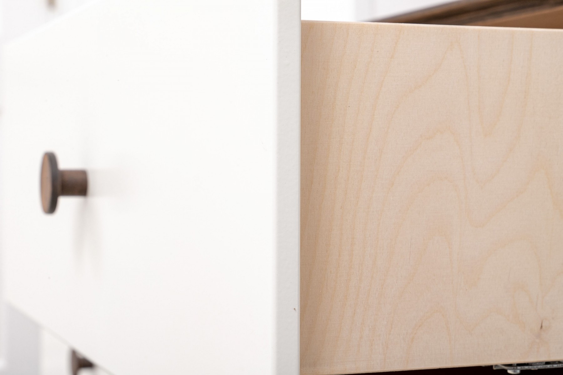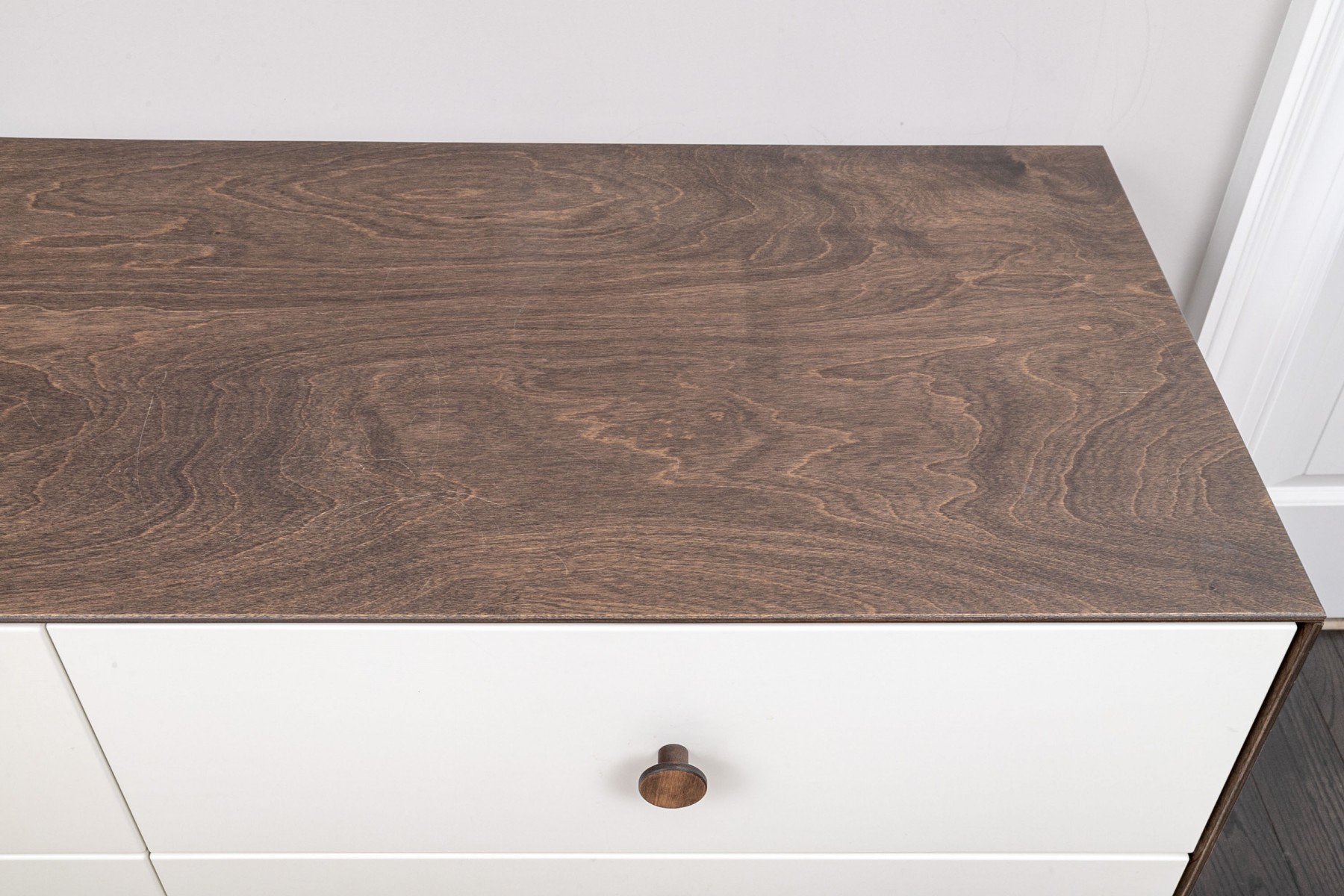A stained wood frame with white laminate drawers on front with wood pulls. Raised on recessed square wood legs with solid sides.