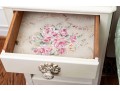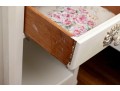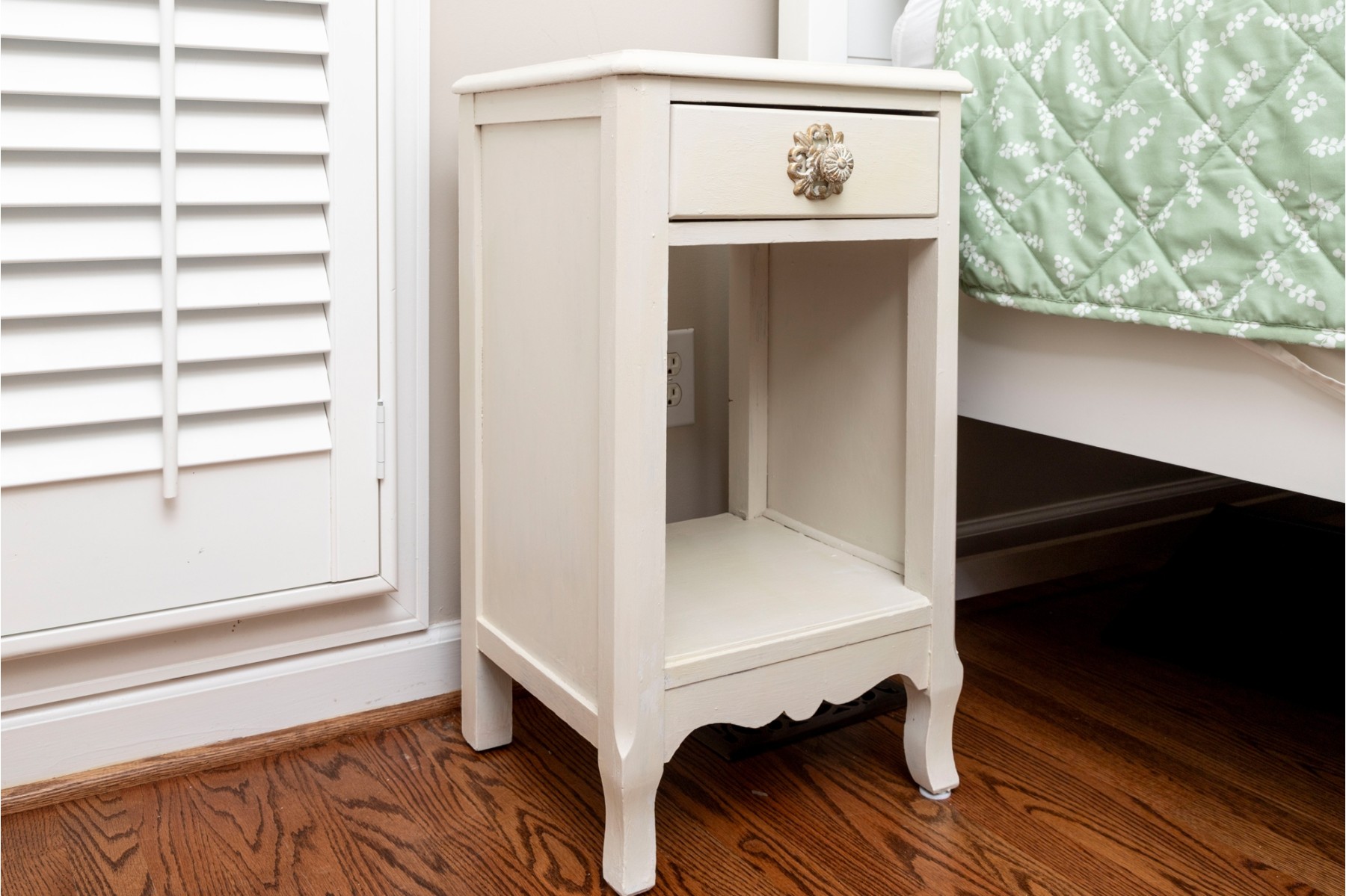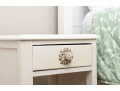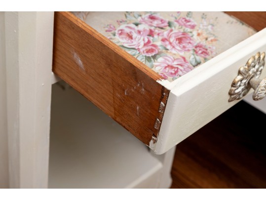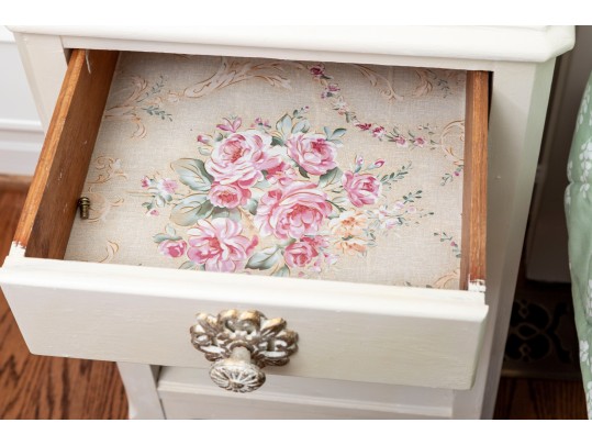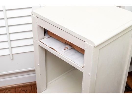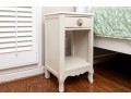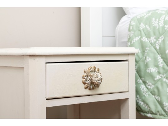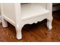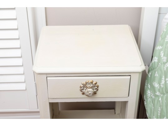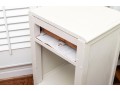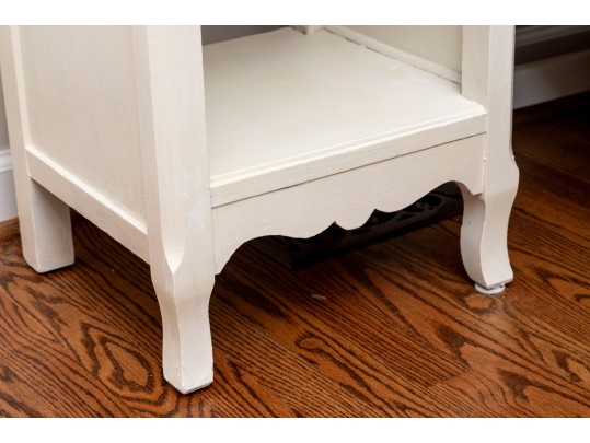 A lovely French country styled end-table -- solid wood frame adorned in an off-white or cream semi-gloss finish, equipped with a single dovetailed drawer set above an open storage display shelf.