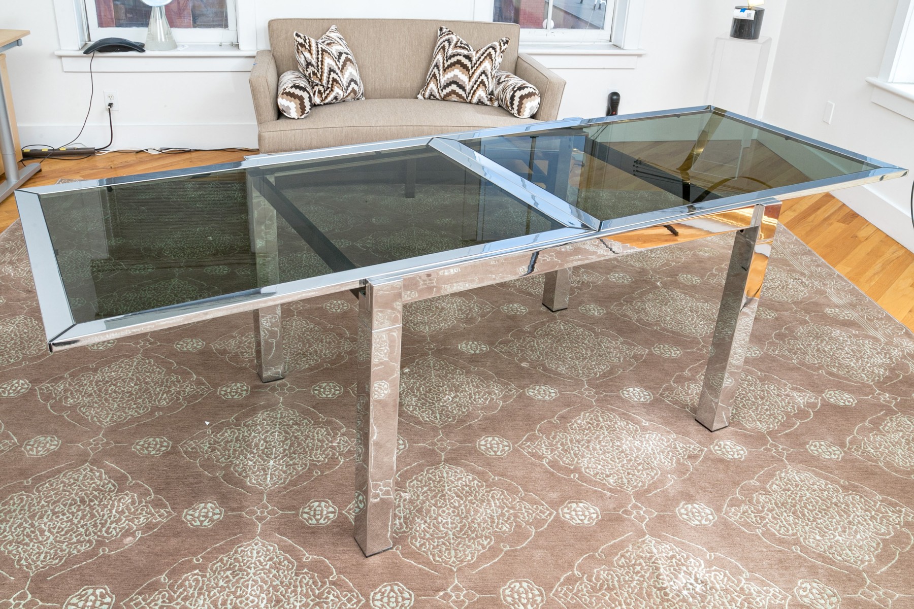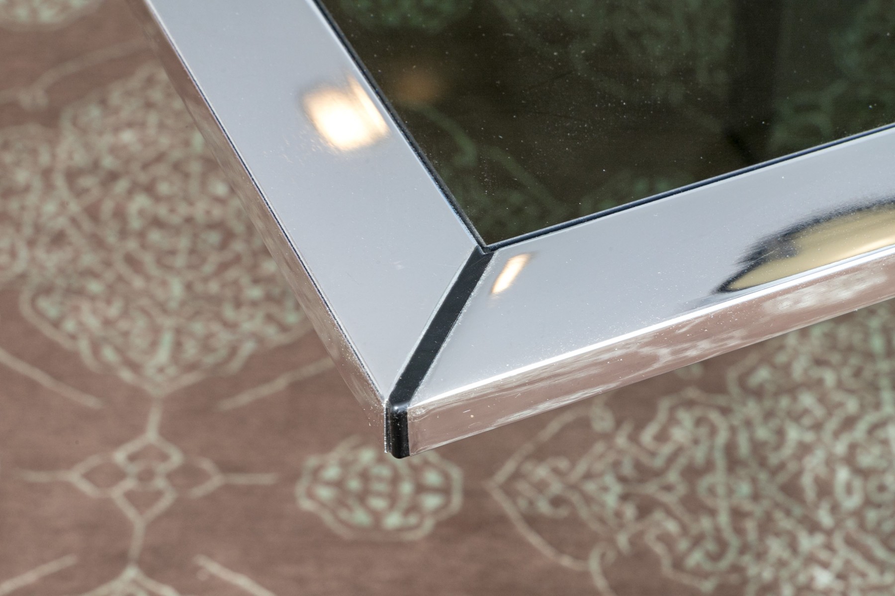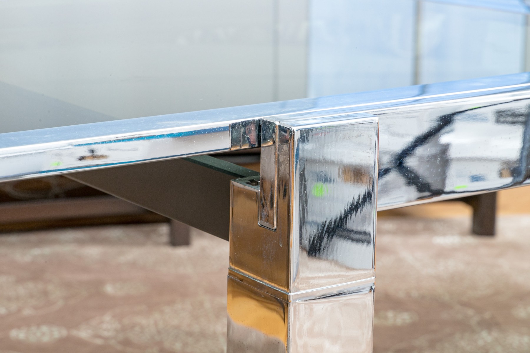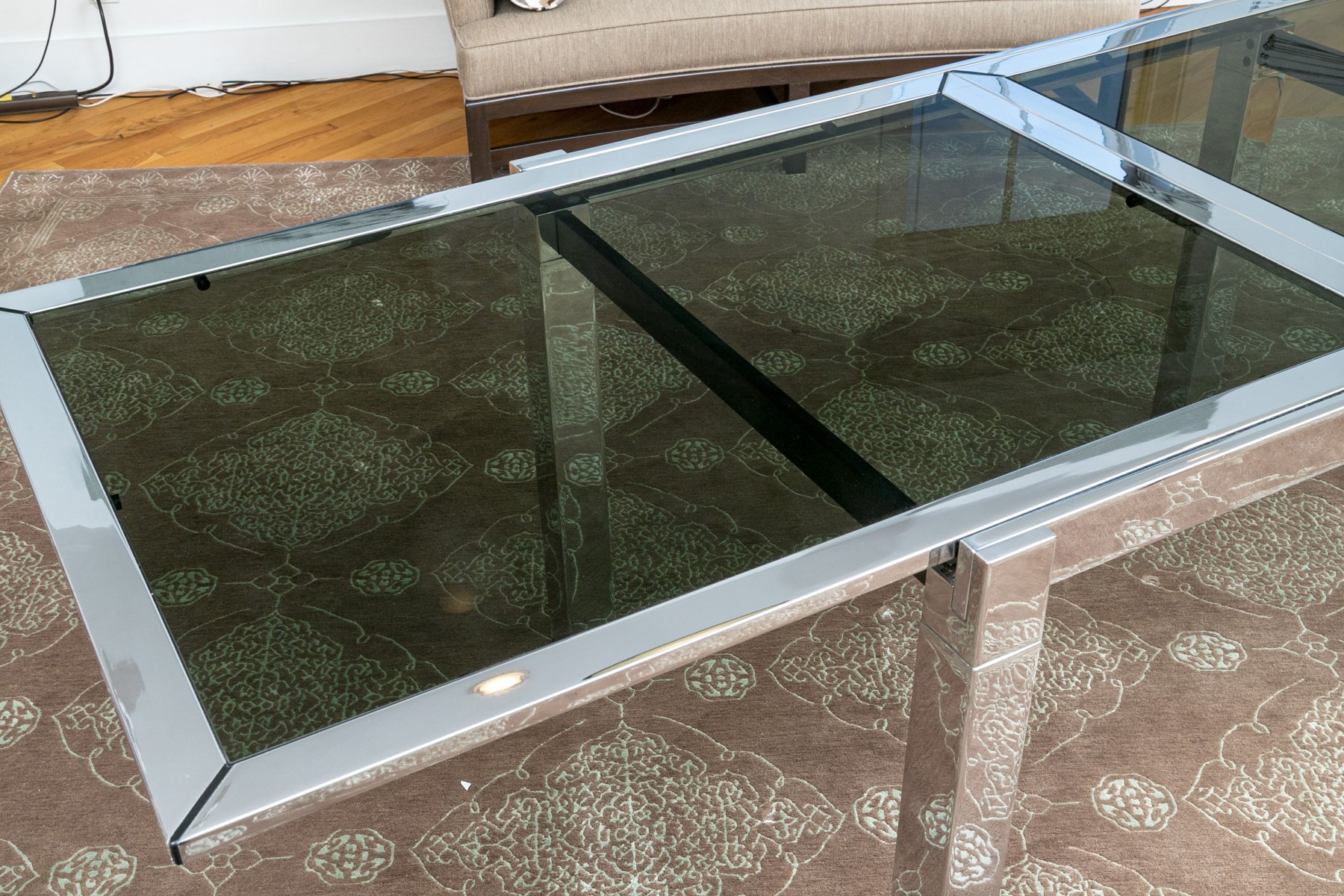 The square Parsons style chrome frame with inset smoky glass top and recessed inset smoky glass leaves that pull out.