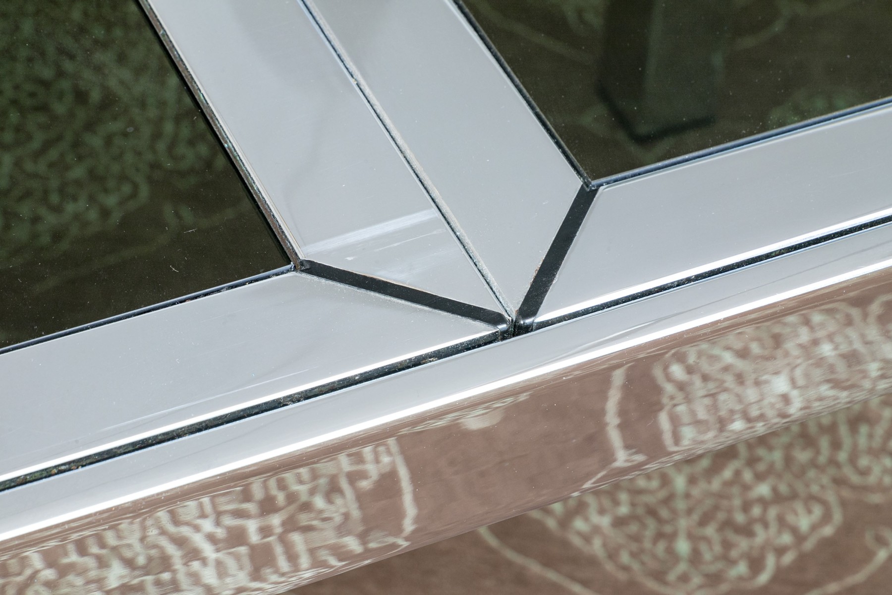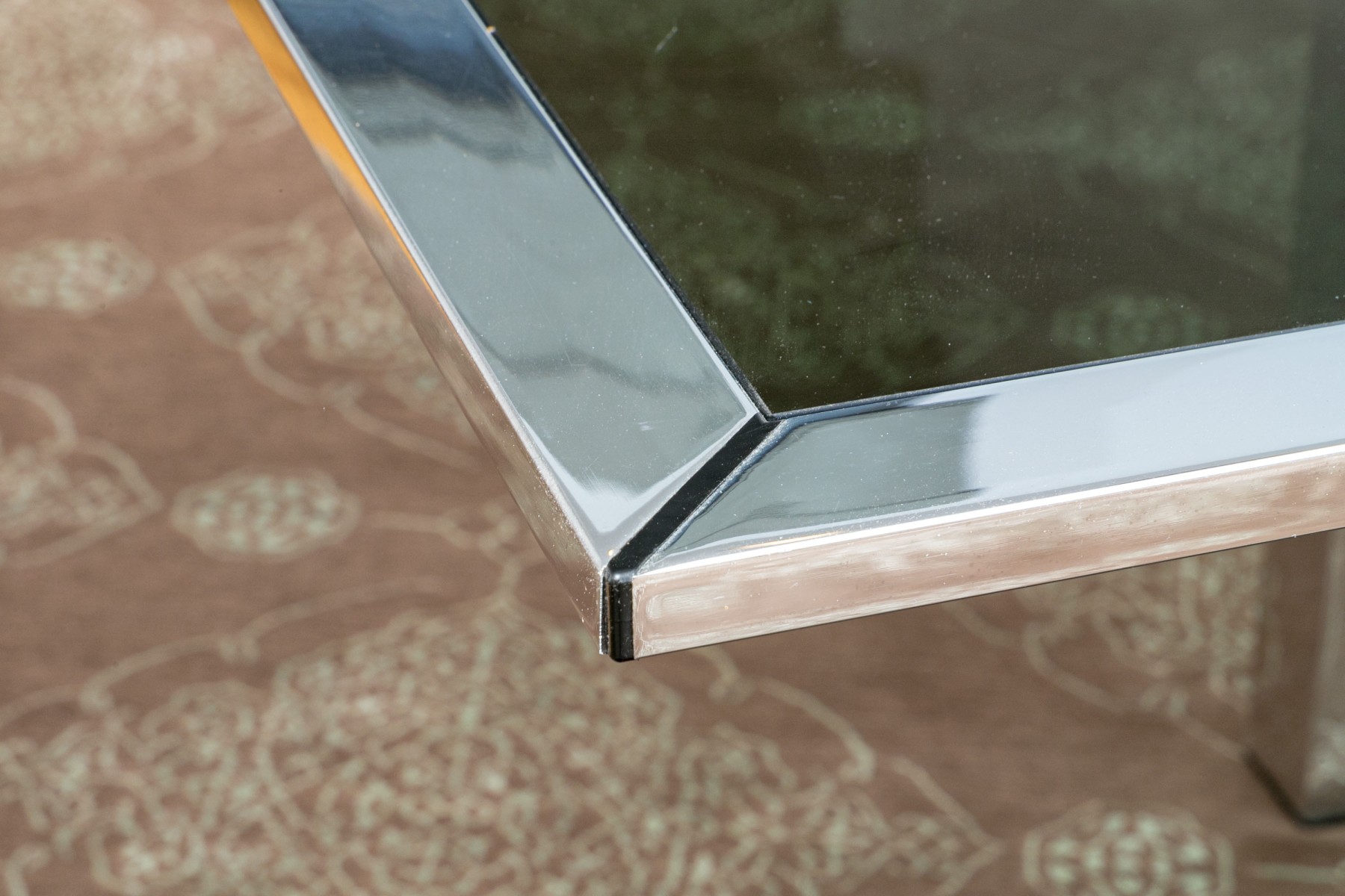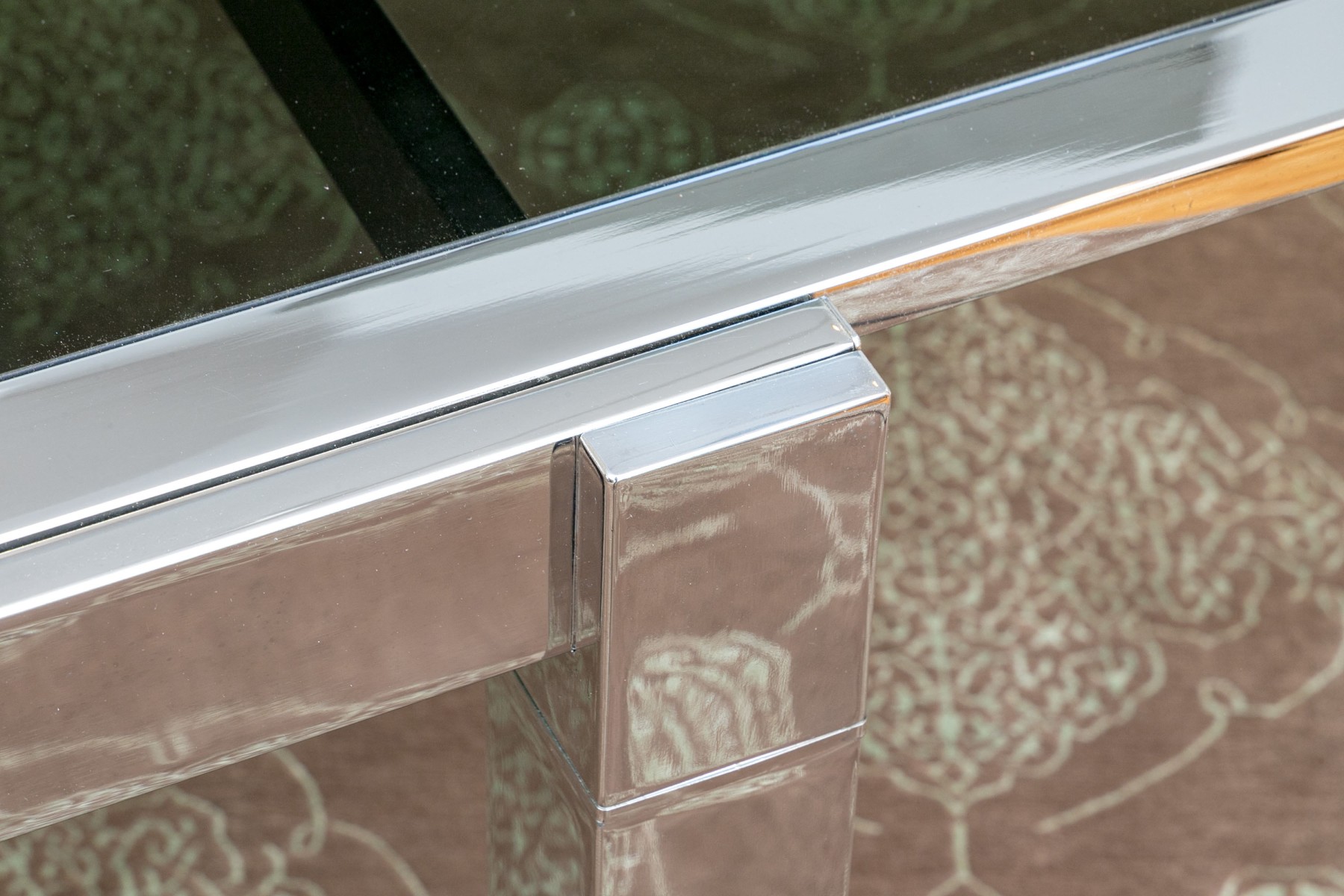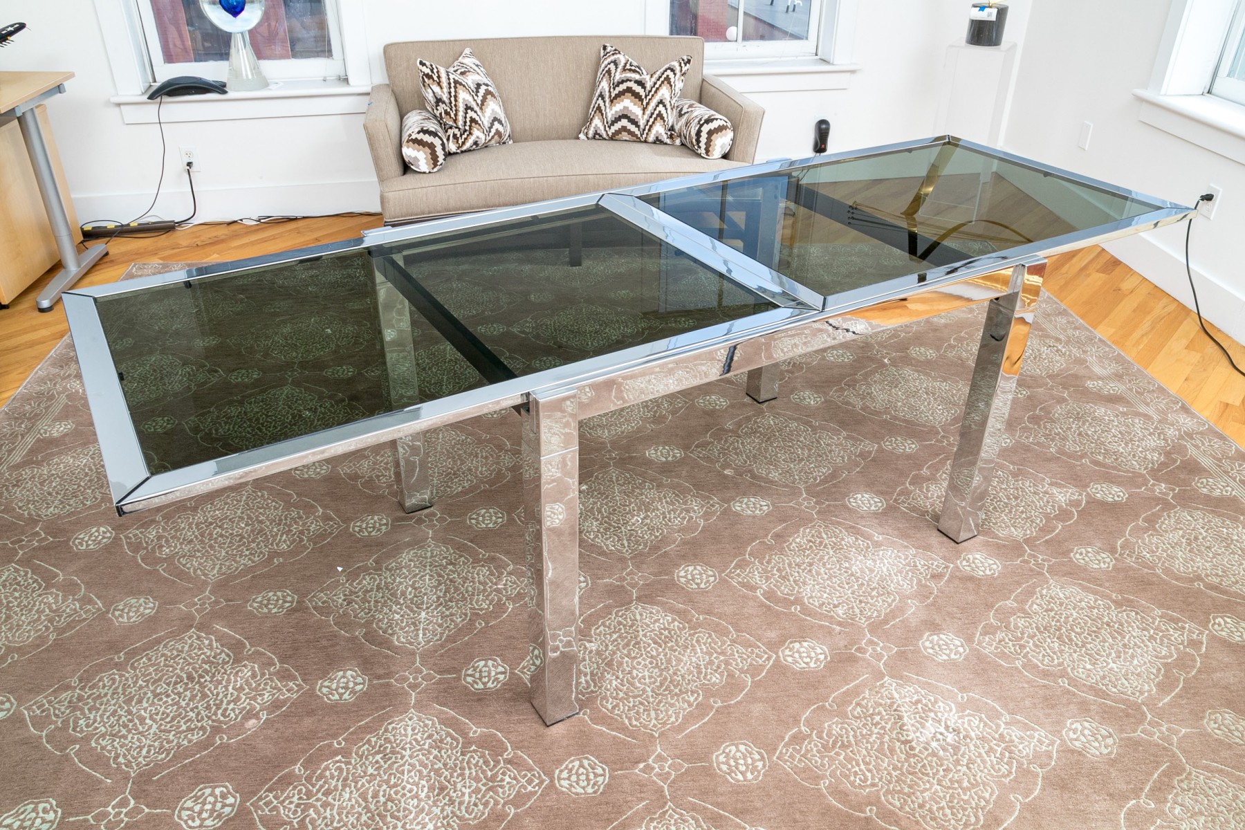 The square Parsons style chrome frame with inset smoky glass top and recessed inset smoky glass leaves that pull out.