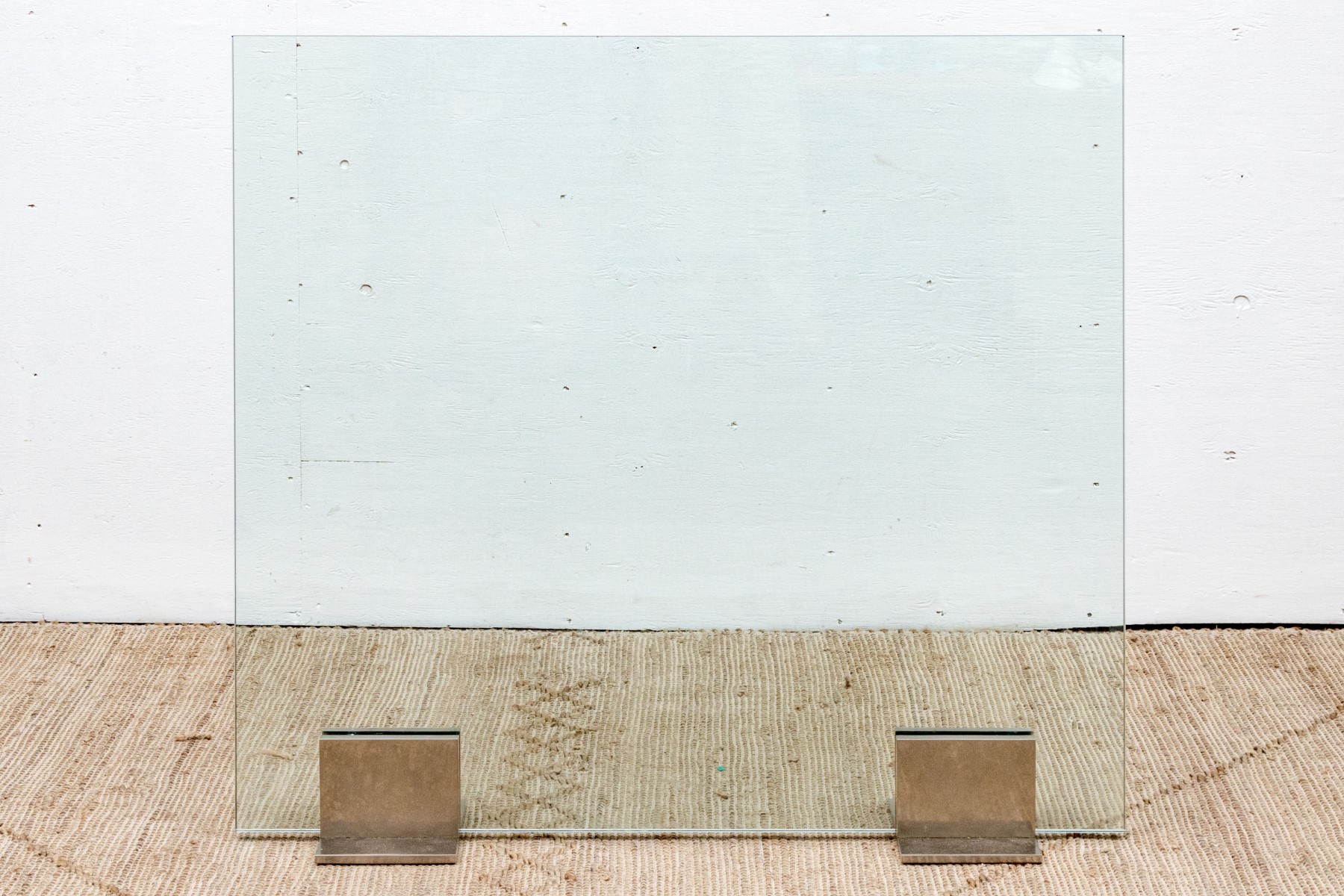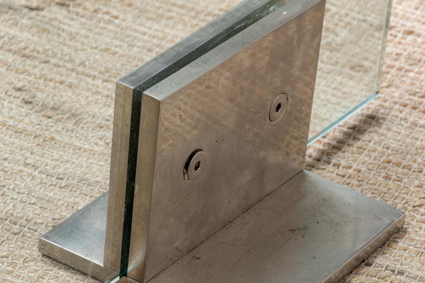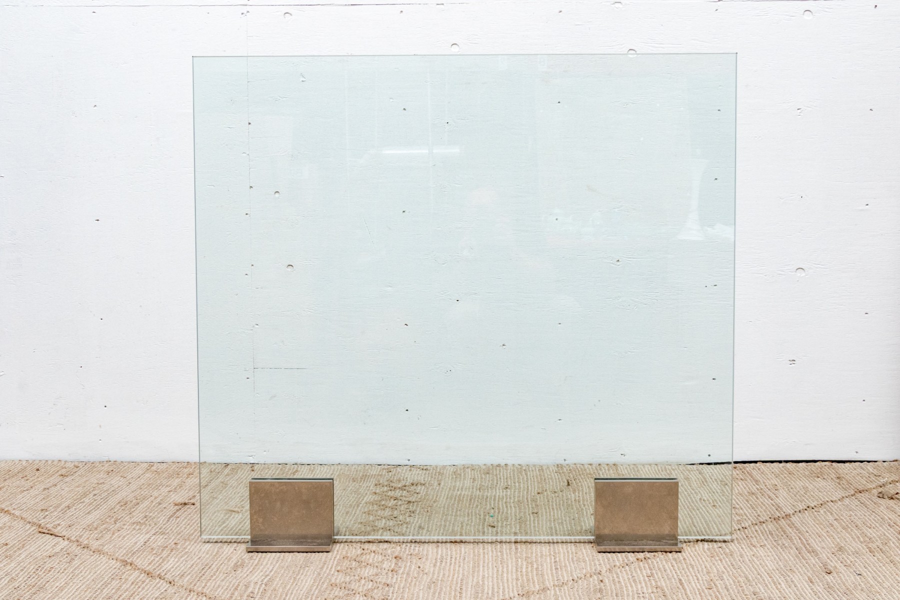 A chic and minimalistic spark screen with a single glass panel, which slots into two brutalist steel bracket supports with footing on either side of the glass panel.