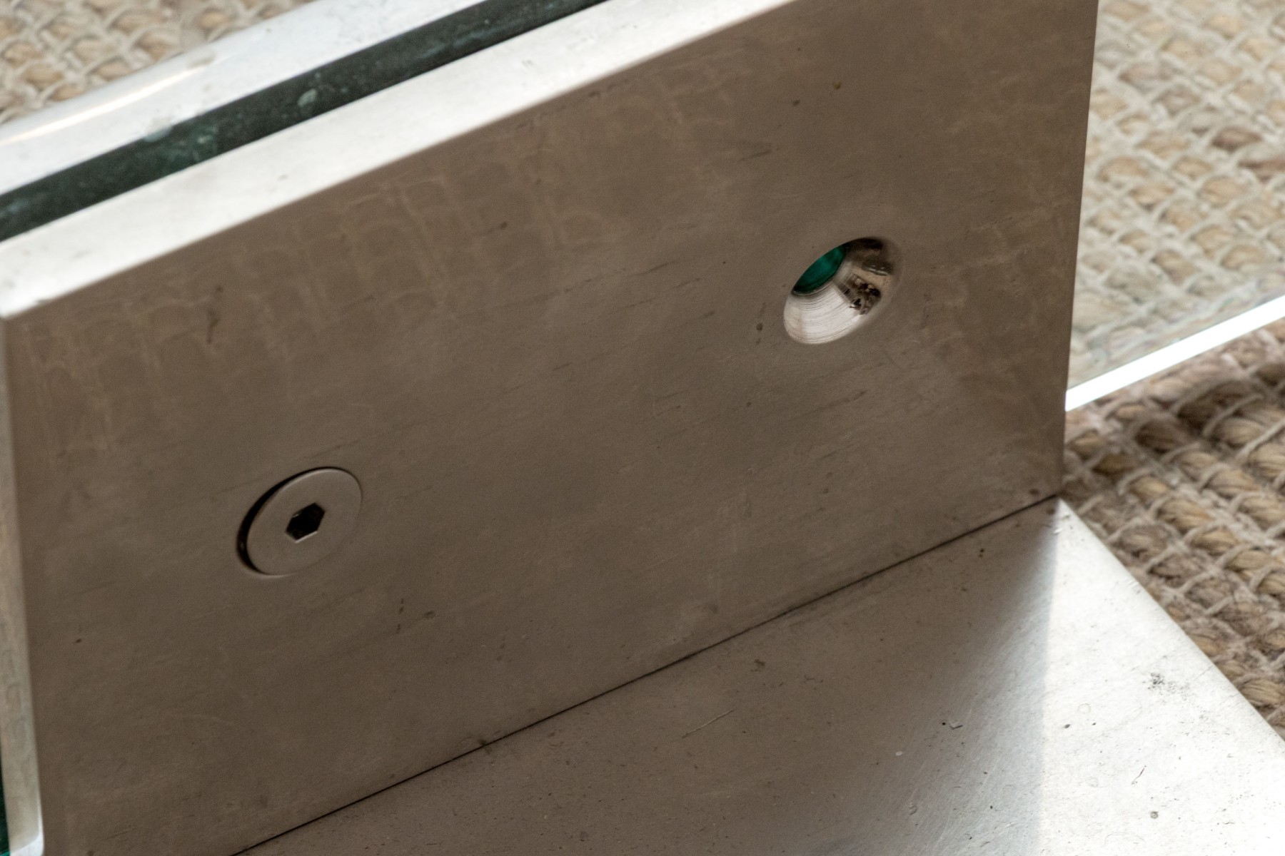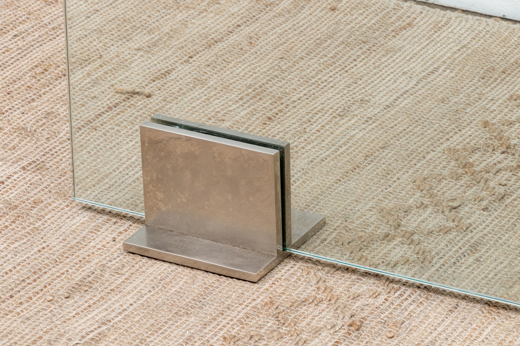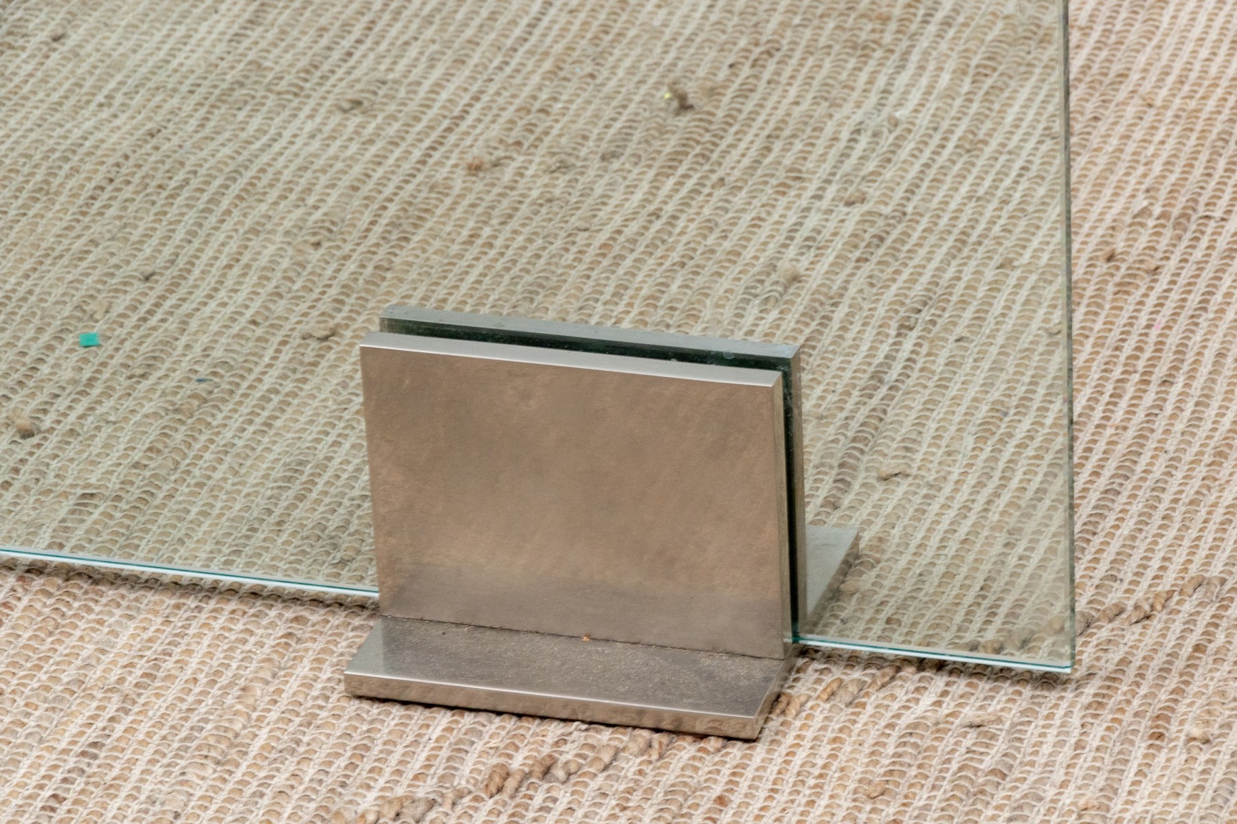 A chic and minimalistic spark screen with a single glass panel, which slots into two brutalist steel bracket supports with footing on either side of the glass panel.