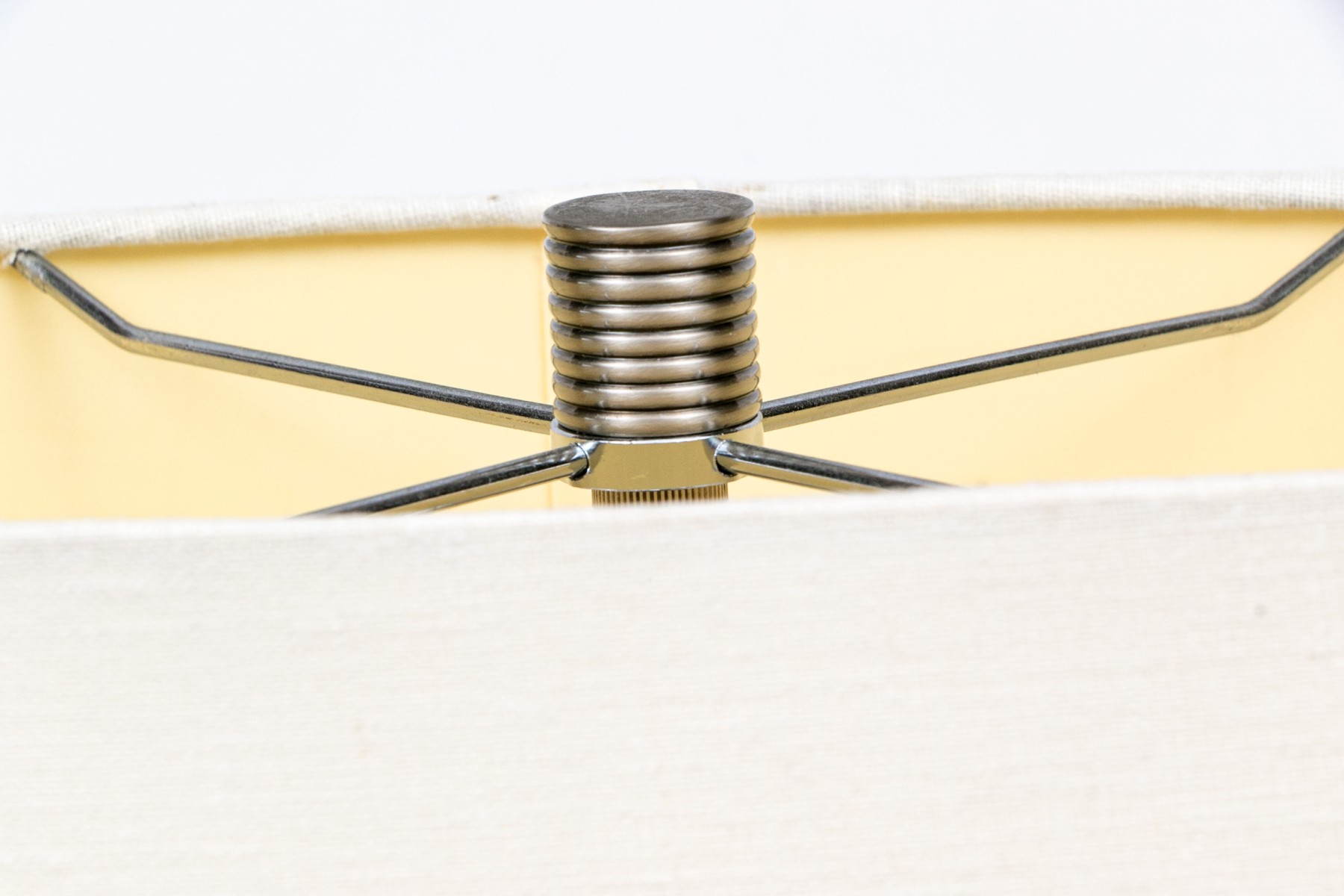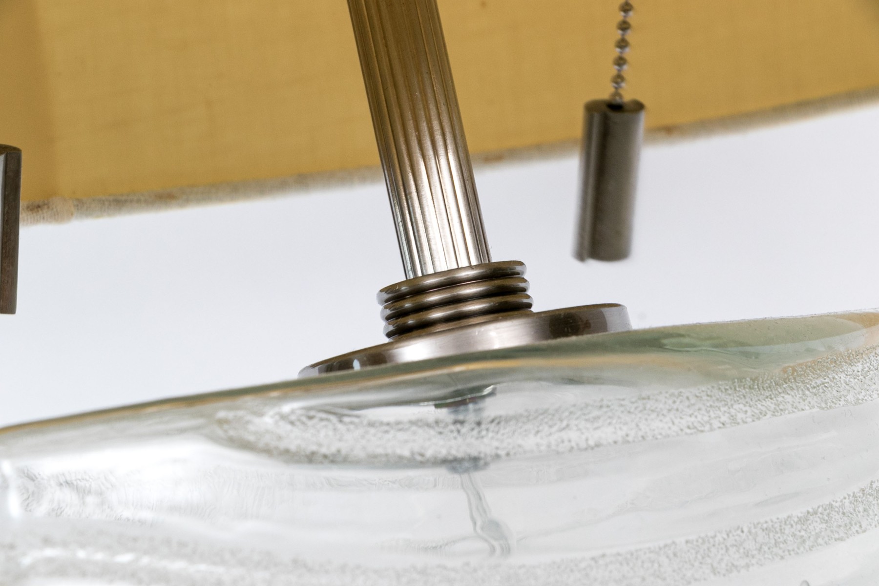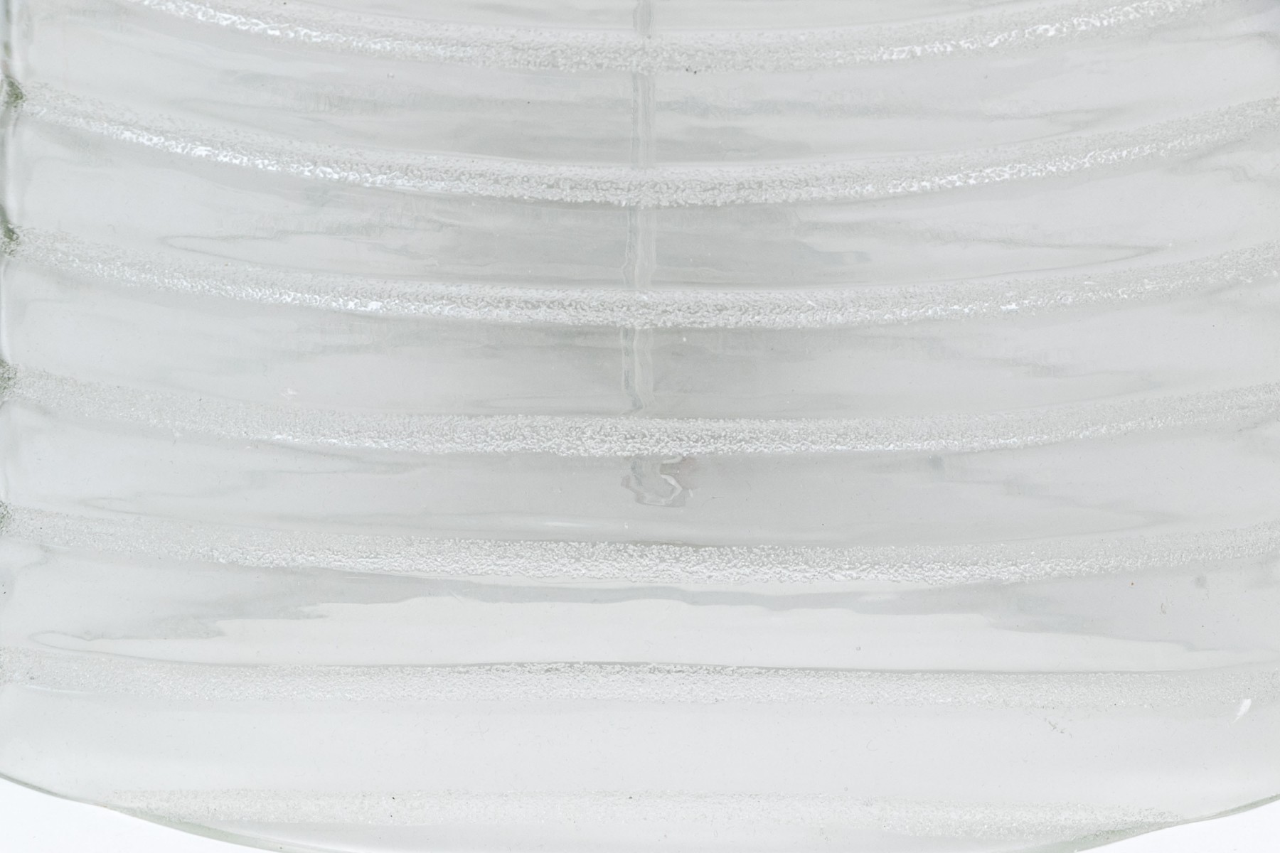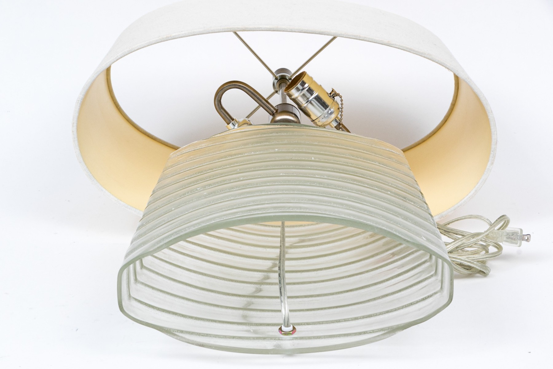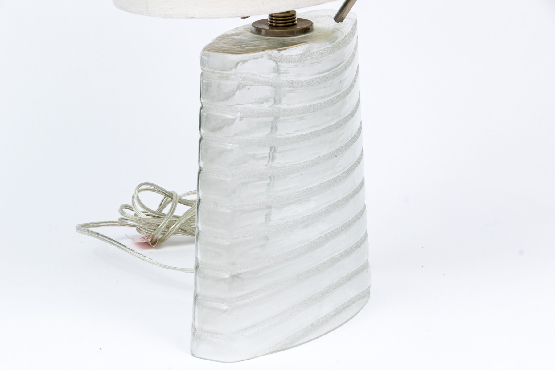 A hollow slim marquise shaped glass lamp in a textured and clear striped pattern with nickel finish mounts and pulls. With an off- white oval linen shade.