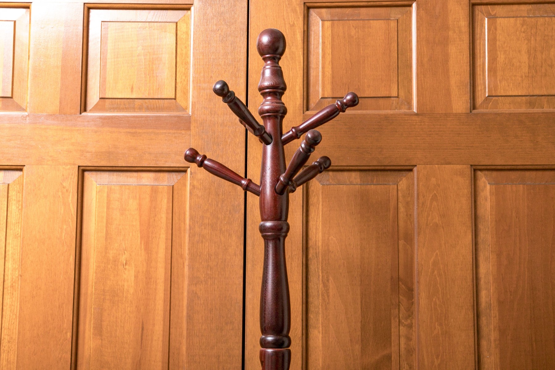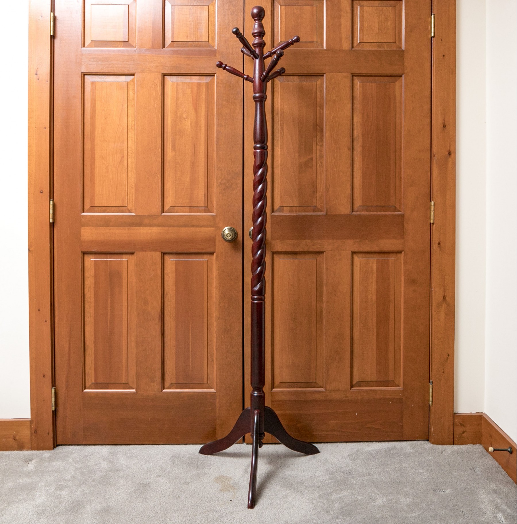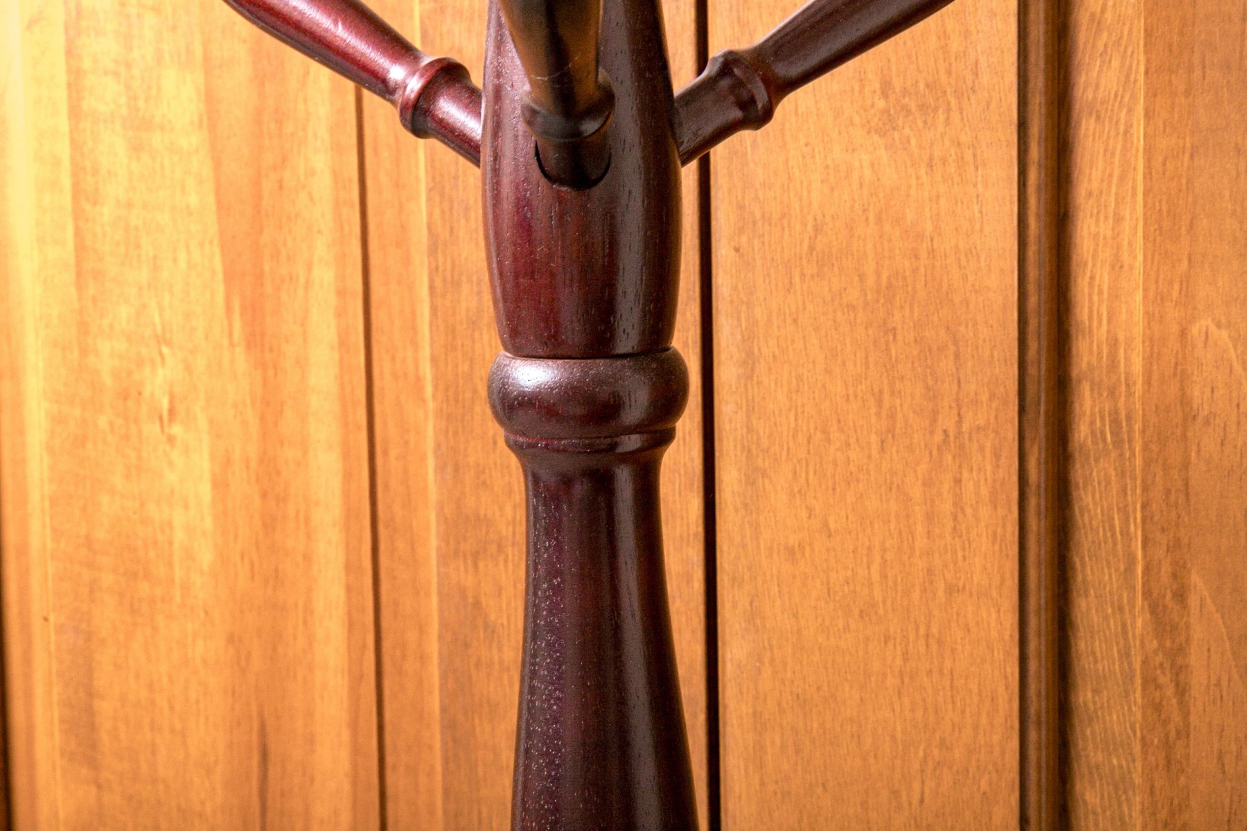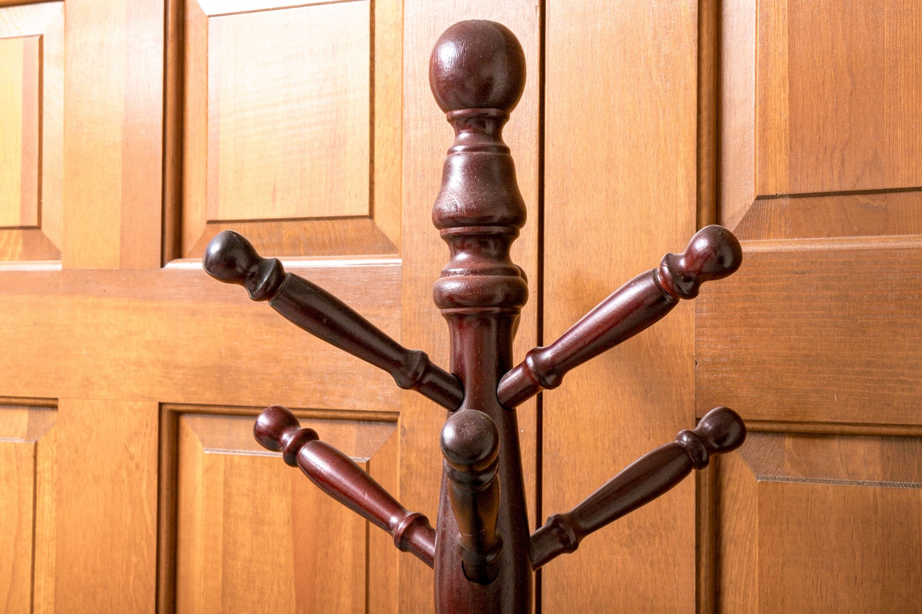 Contemporary mahogany coat/hat stand. In traditional form with turned standard and six turned pegs. Raised on three sloping legs.