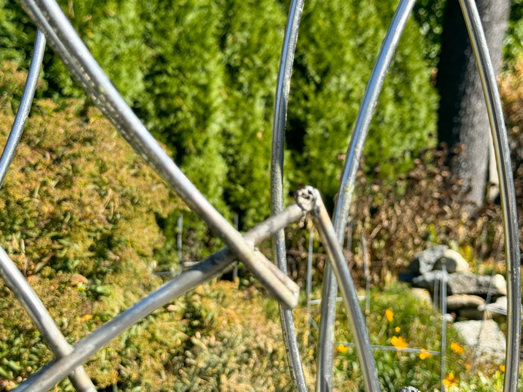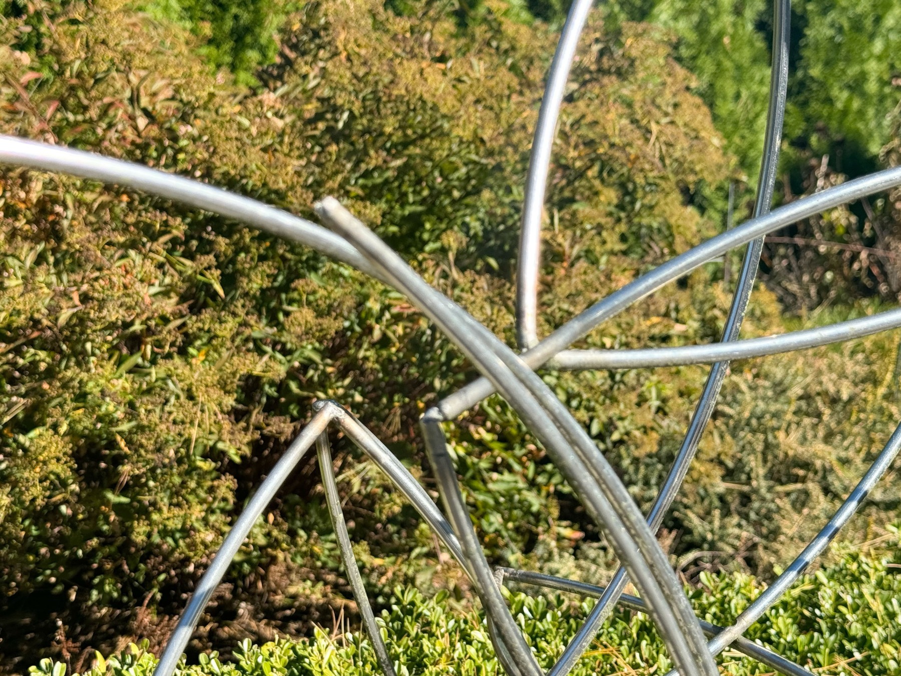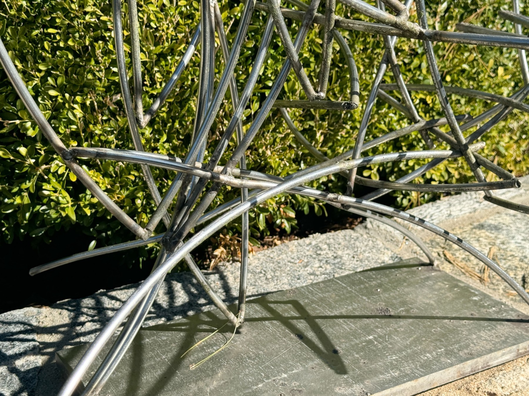 A stylish, contemporary sculpture showcasing chrome arc dowels with welded joints creating a dynamic form with an energetic yet airy aesthetic. Mounted to a sturdy rectangular base.