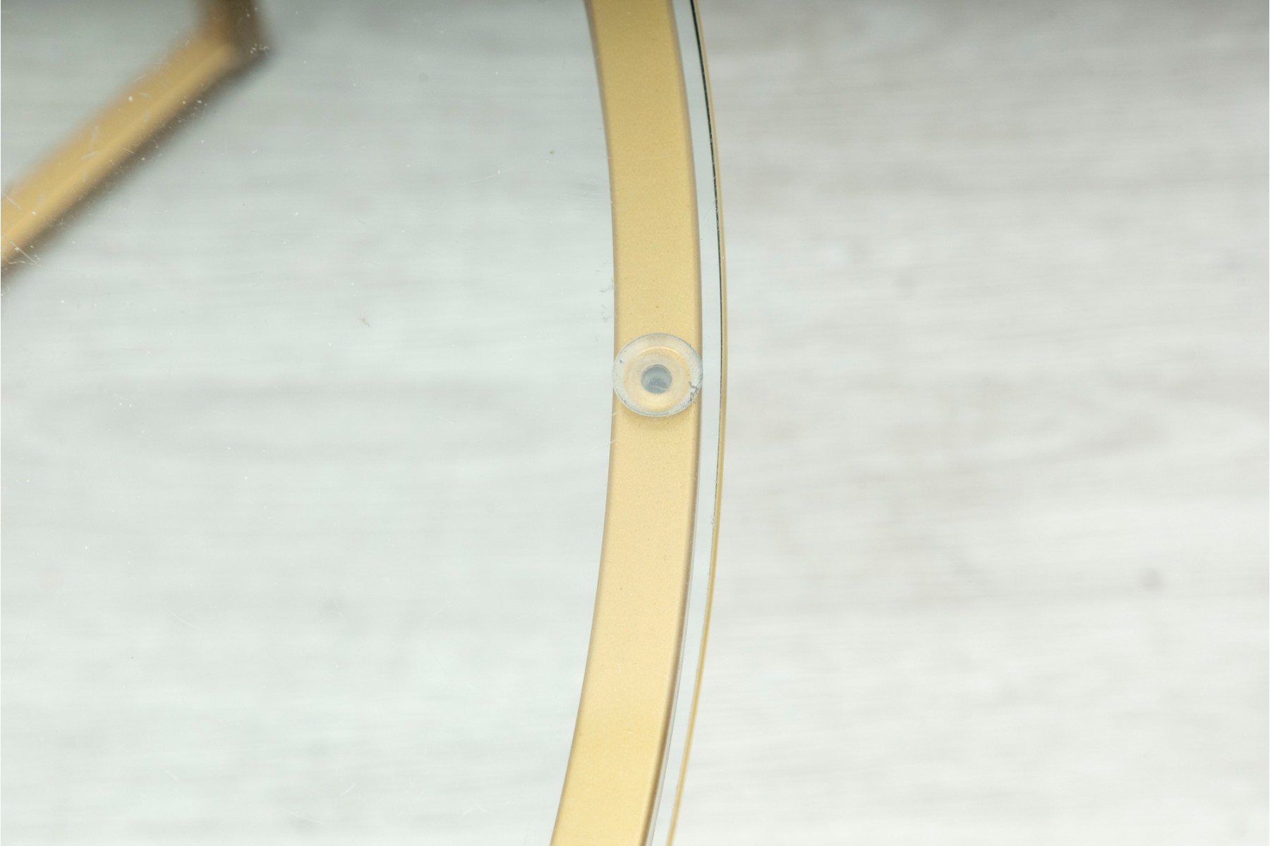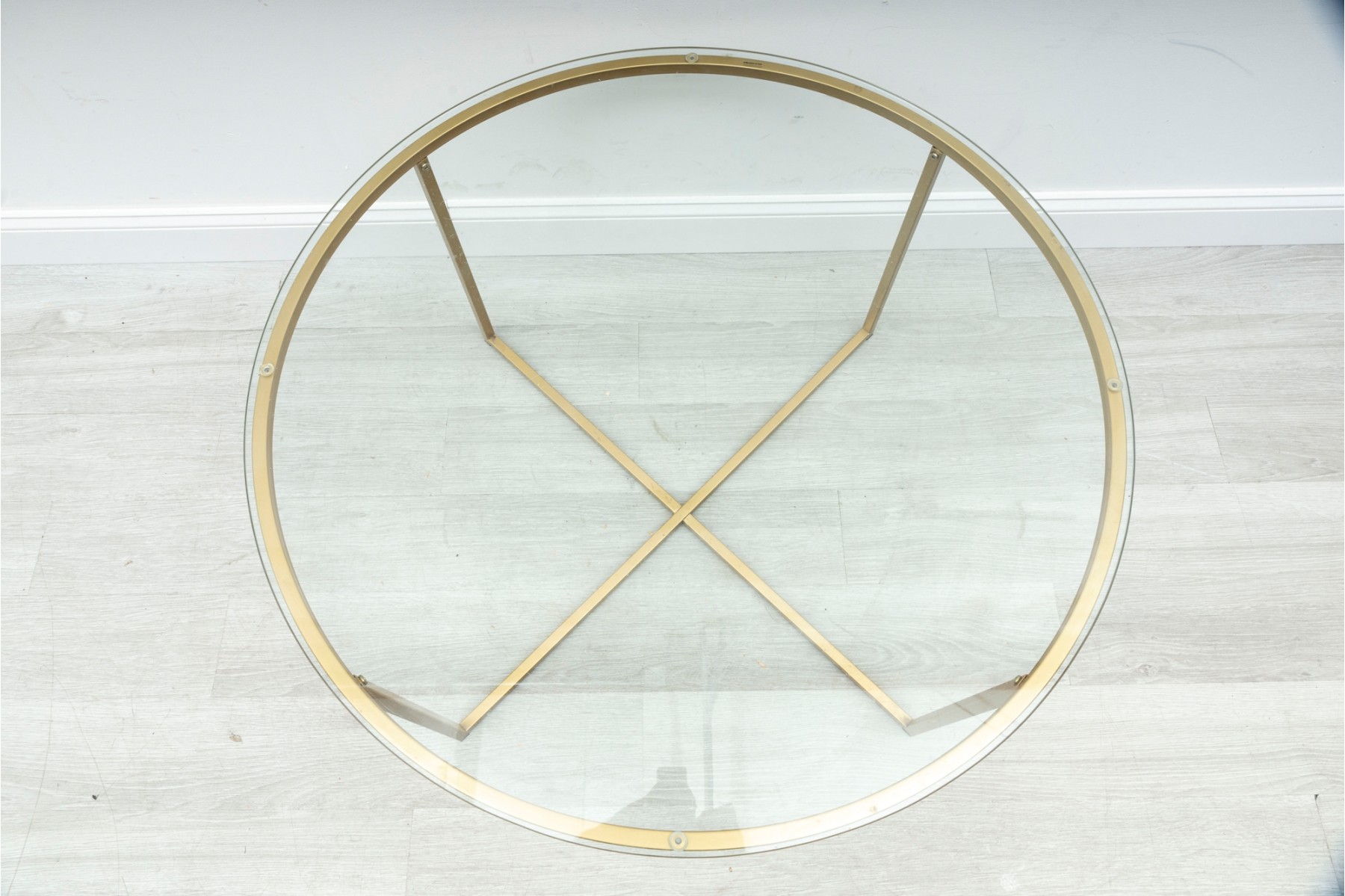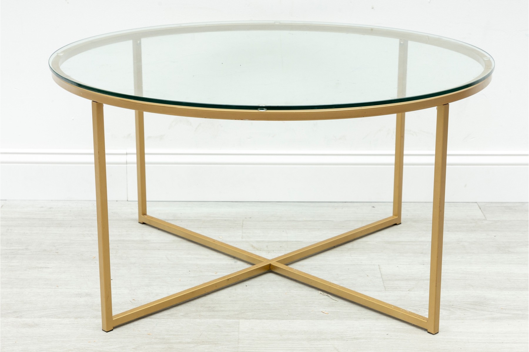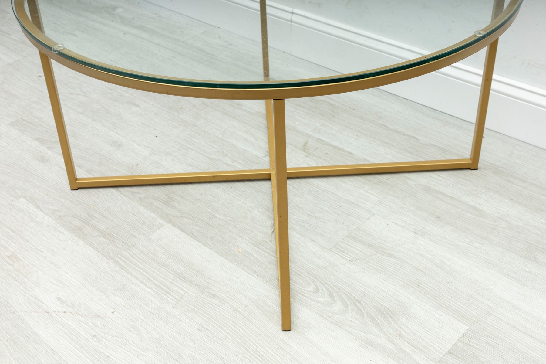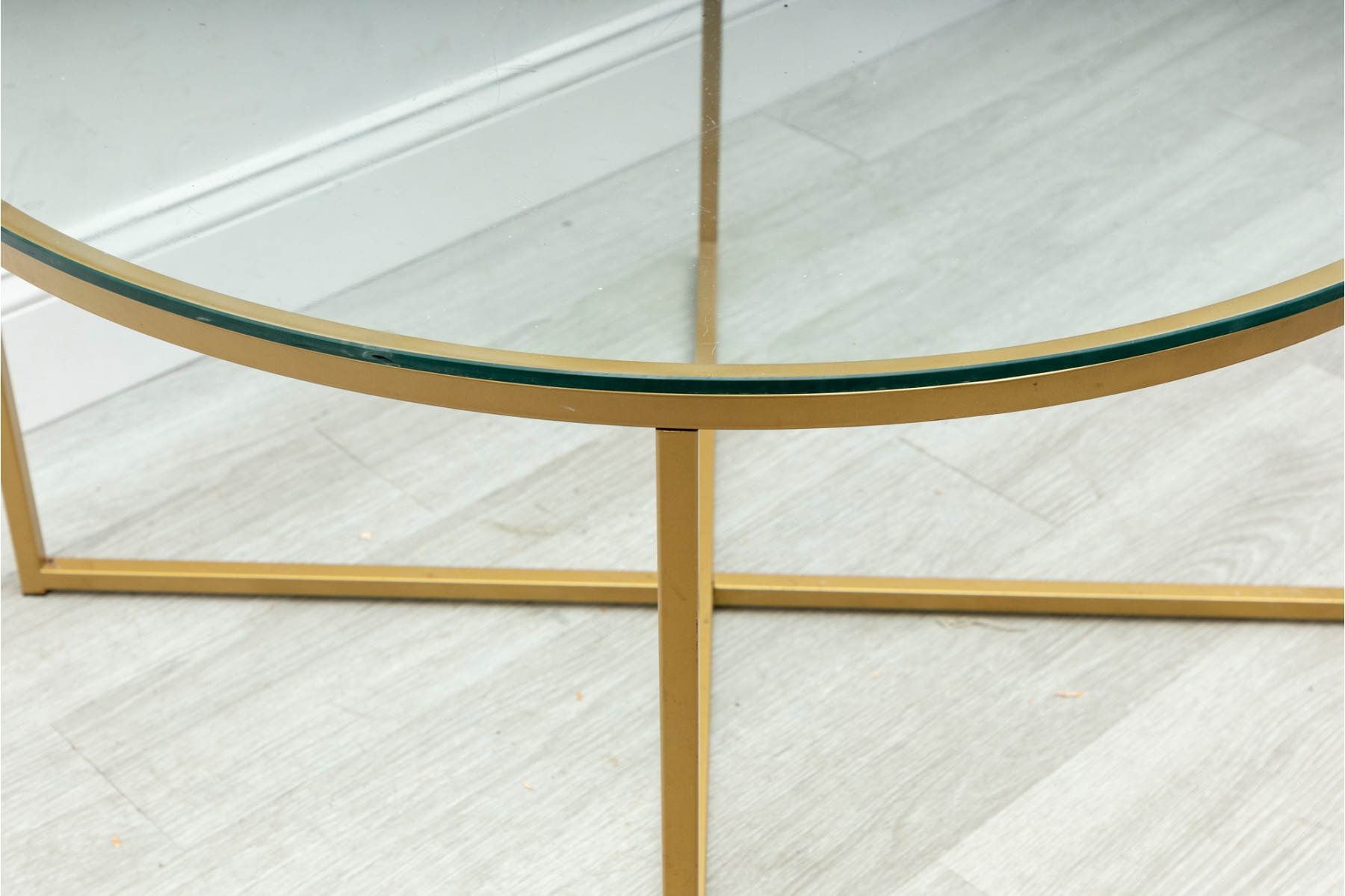 This contemporary gold-tone metal coffee table showcases a minimalist design with a tempered glass top.