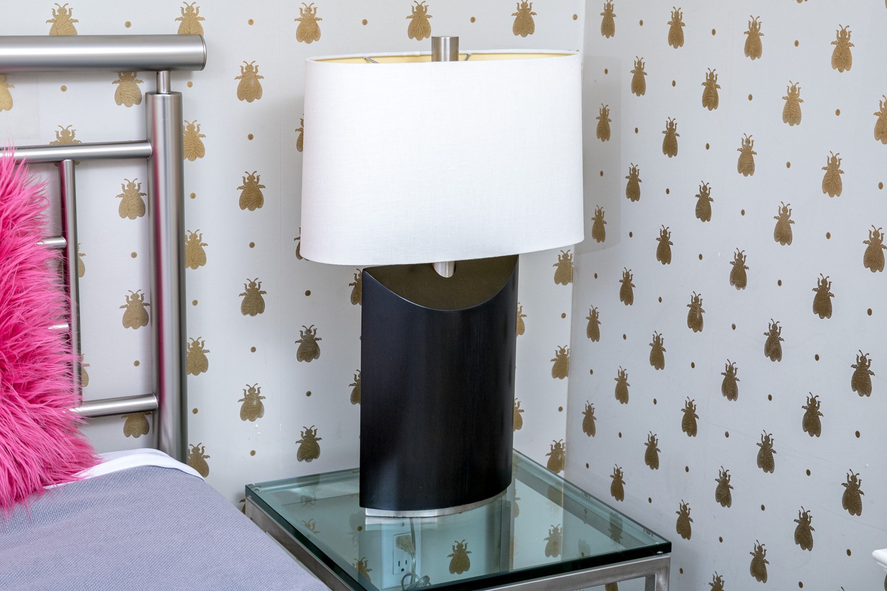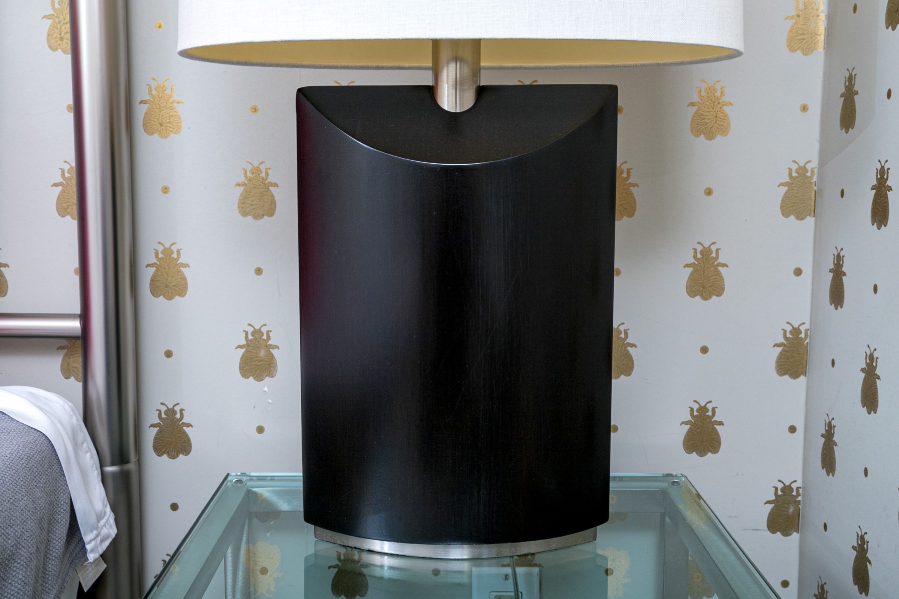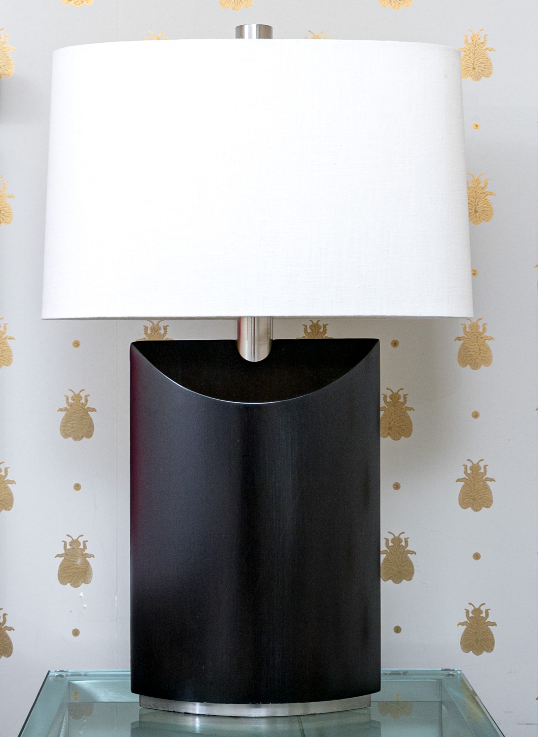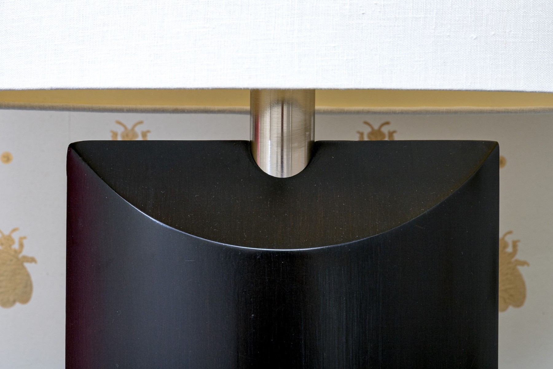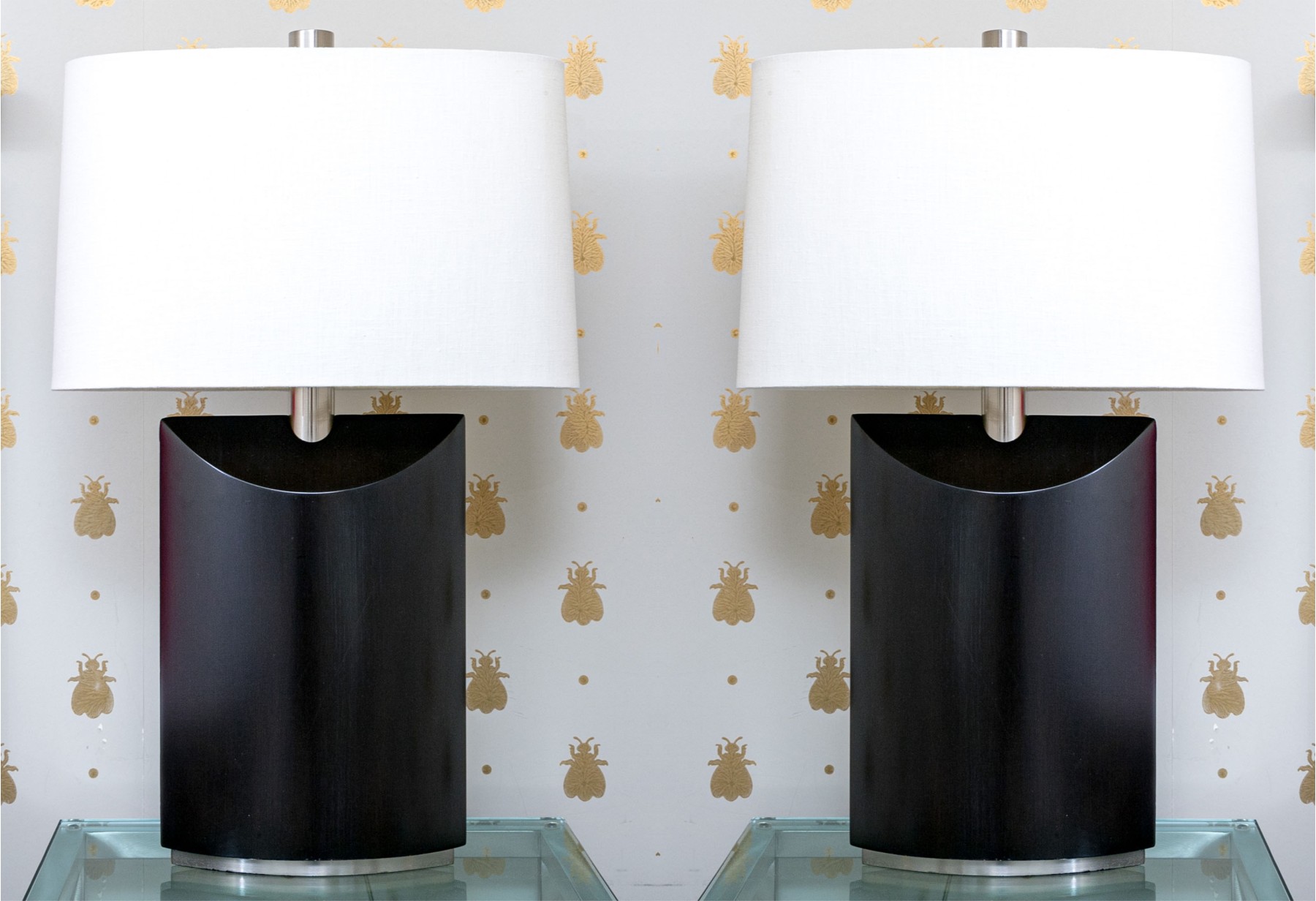 A contemporary pair of sculptural table lamps, likely Bloomingdale's. Feature semi-matte black navette bodies with brushed nickel cylindrical necks over crescent curves along the front edges.