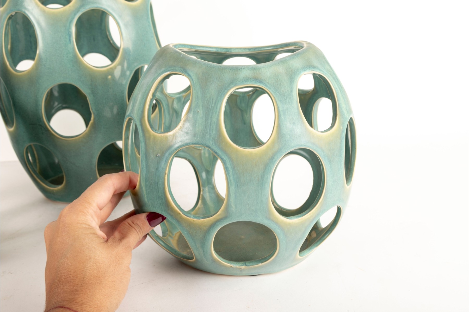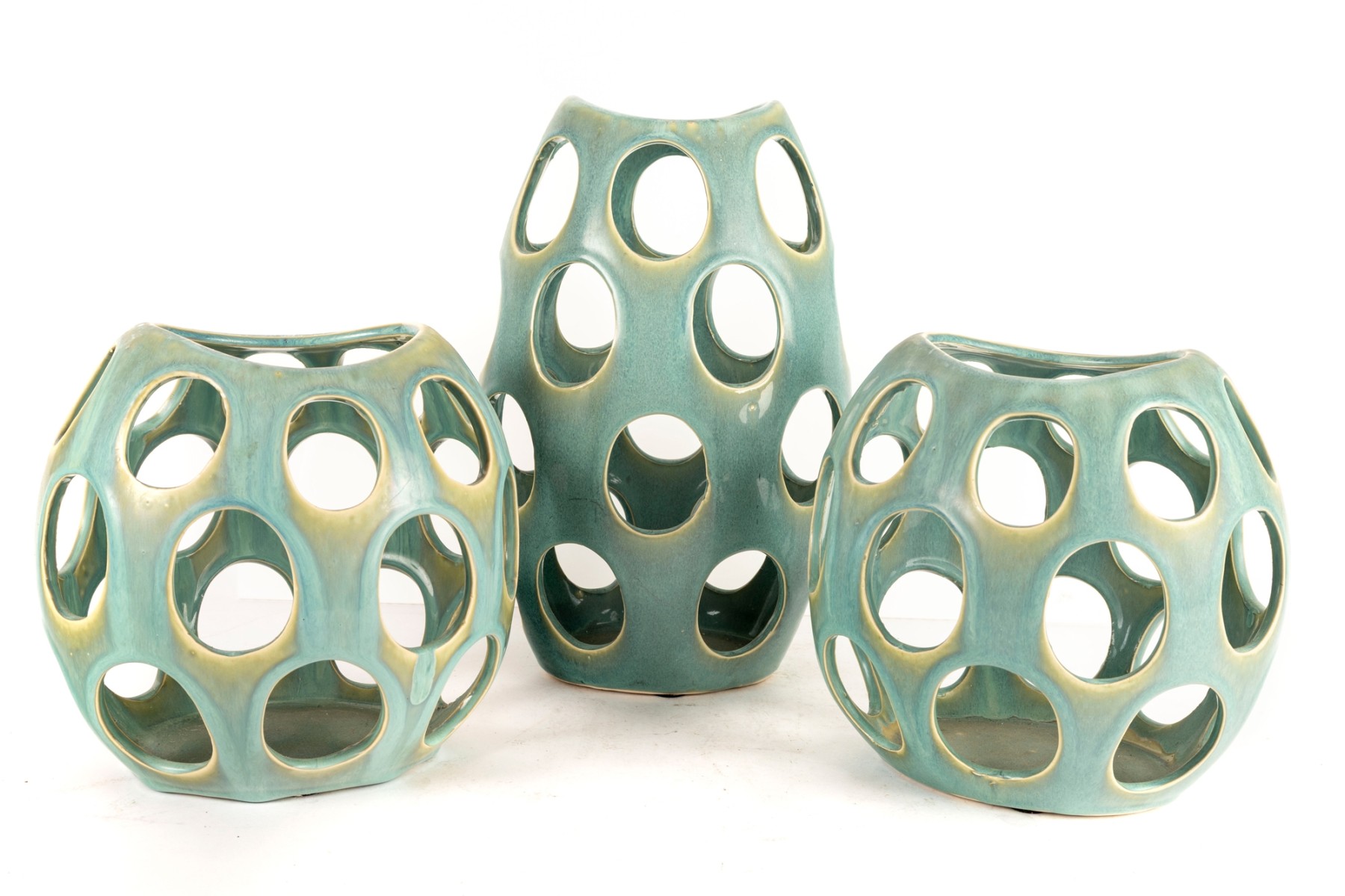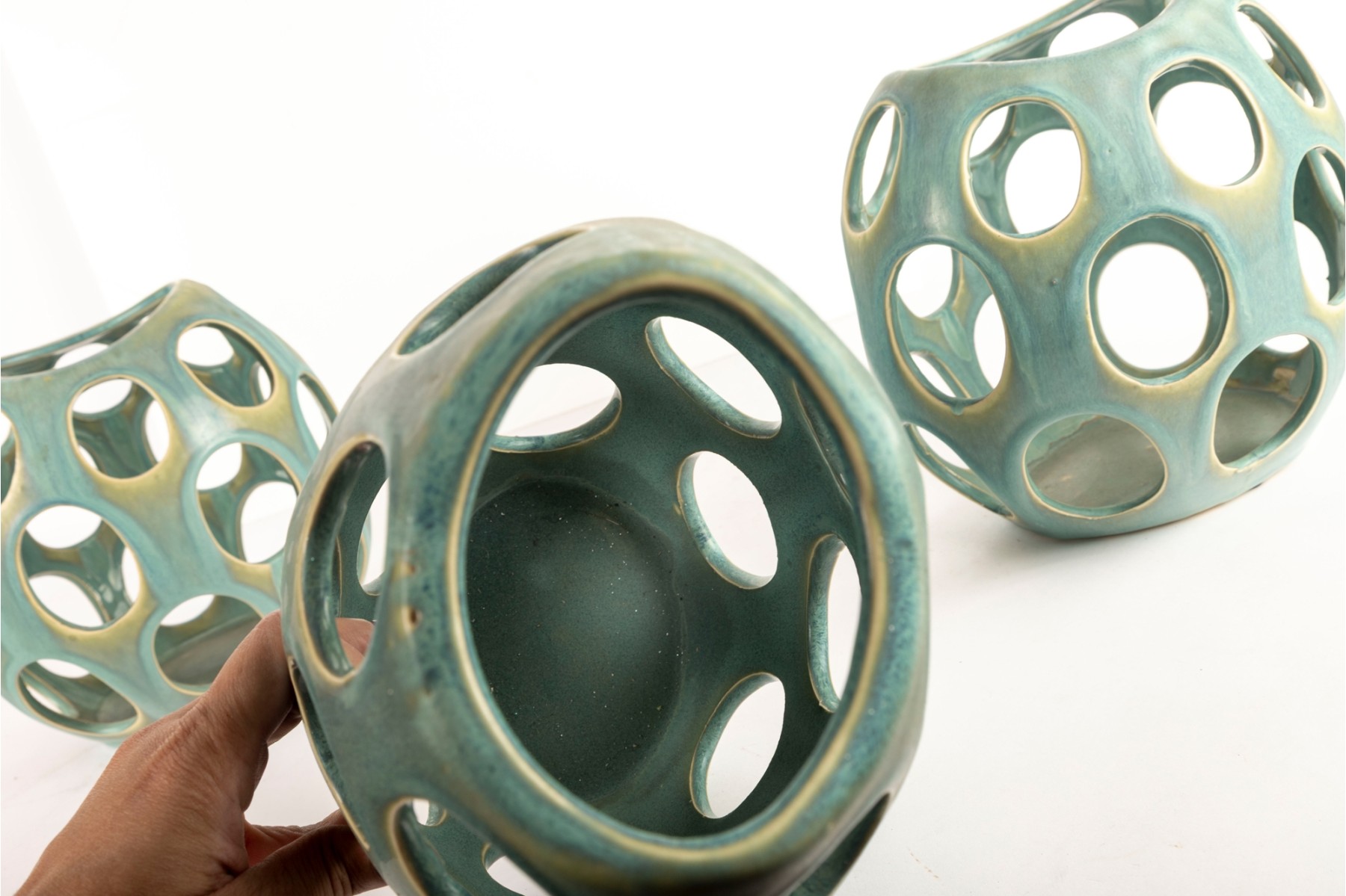 Three glazed turquoise blue tea-light holders with organic forms that sport pierced oval patterns throughout.