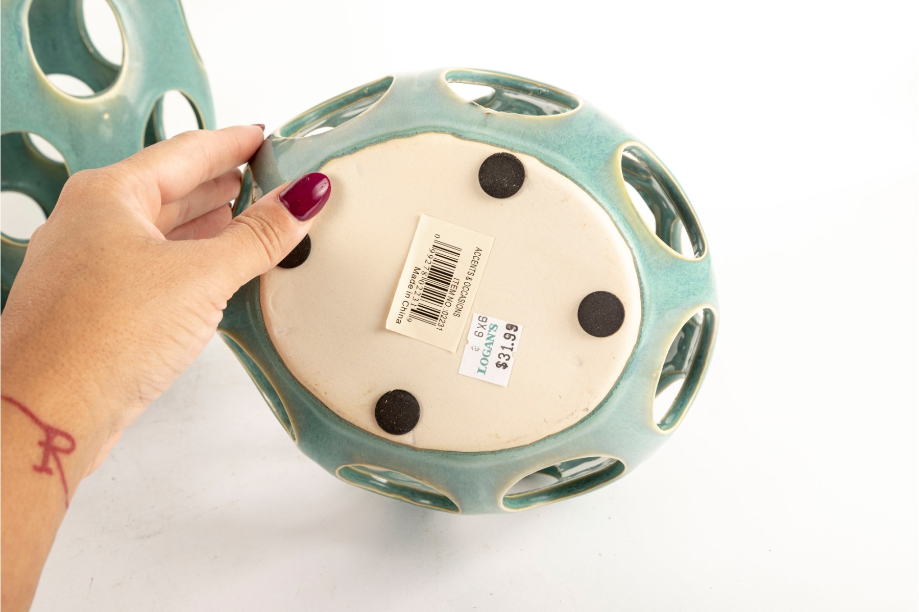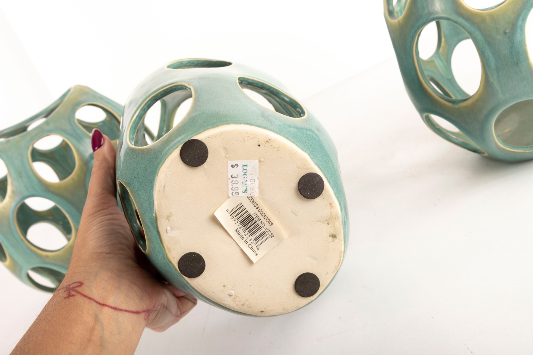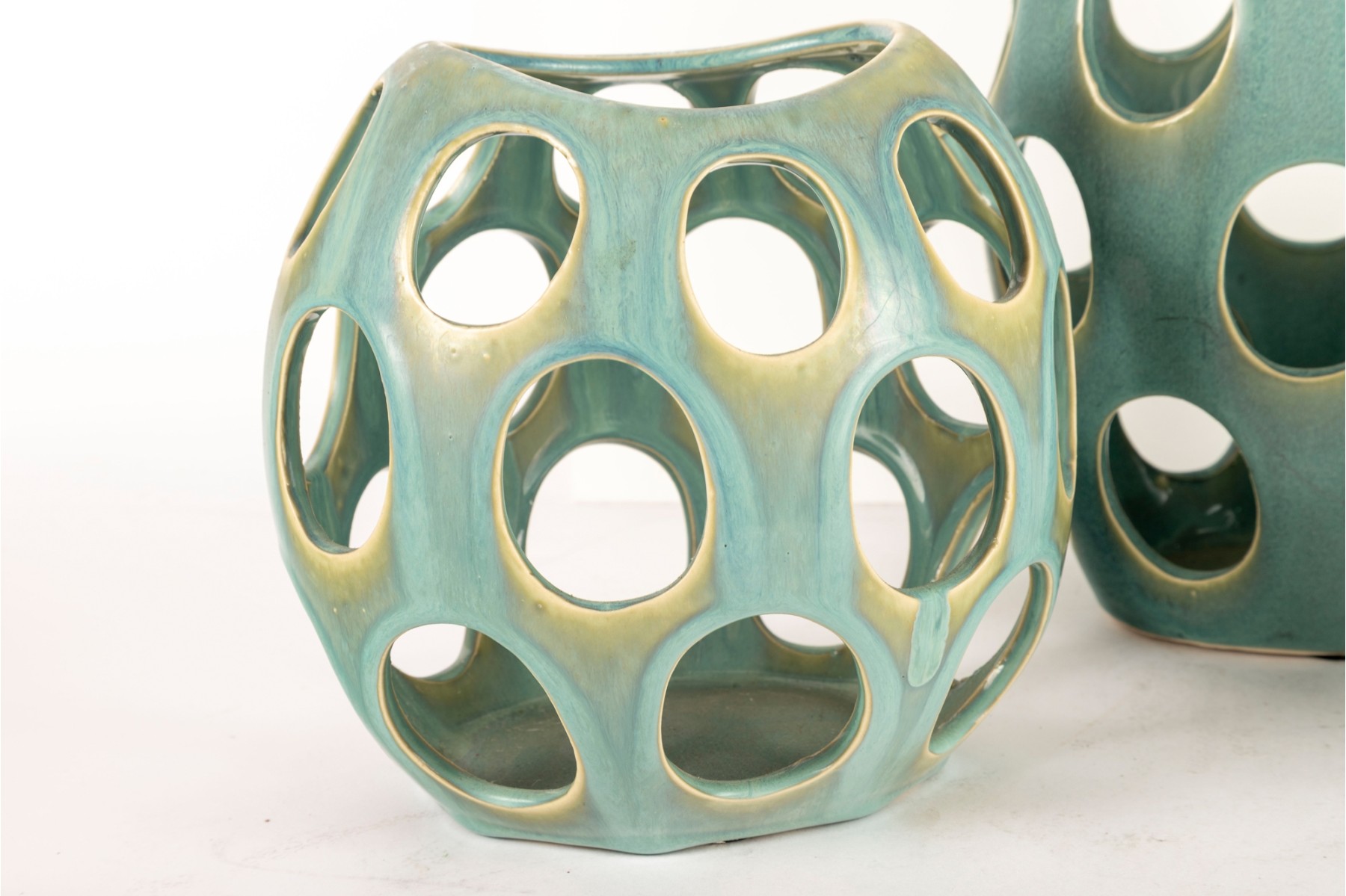 Three glazed turquoise blue tea-light holders with organic forms that sport pierced oval patterns throughout.