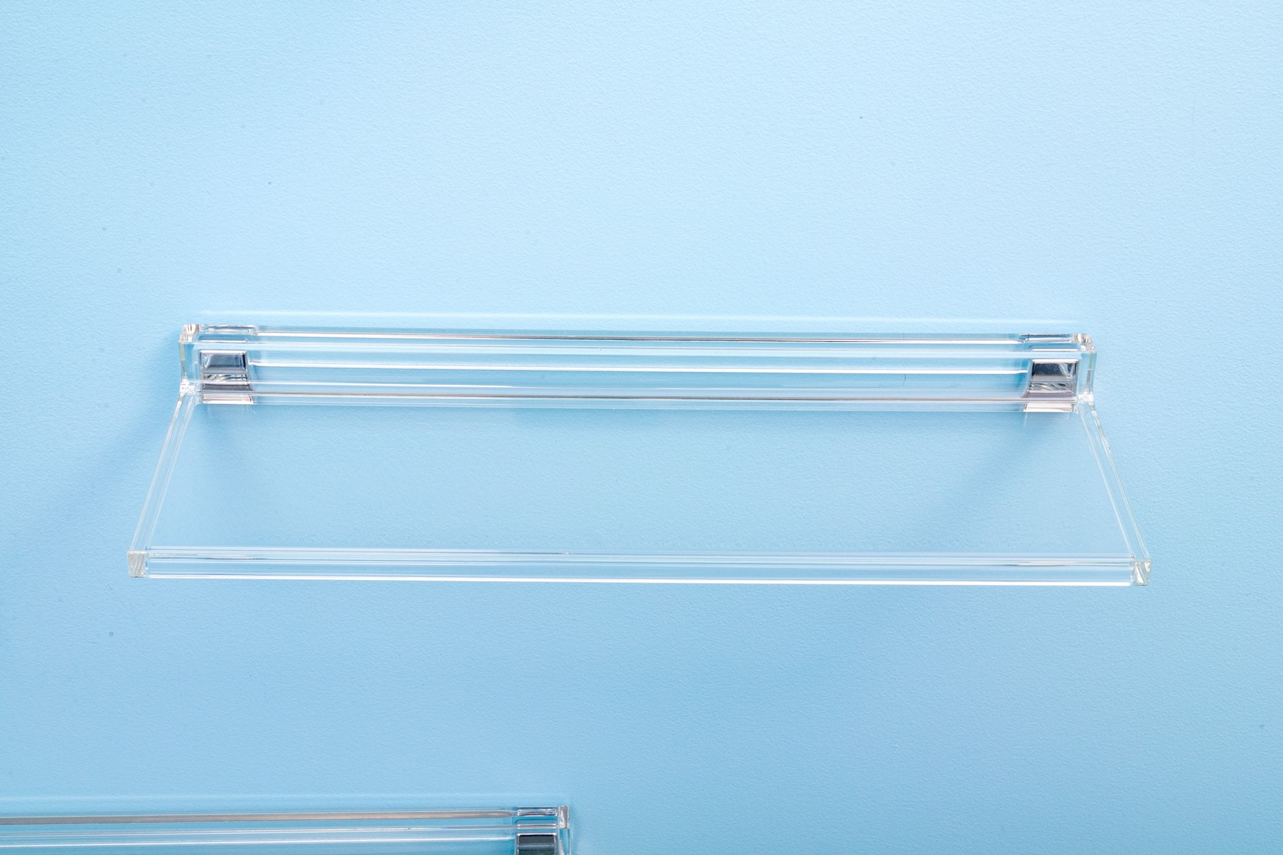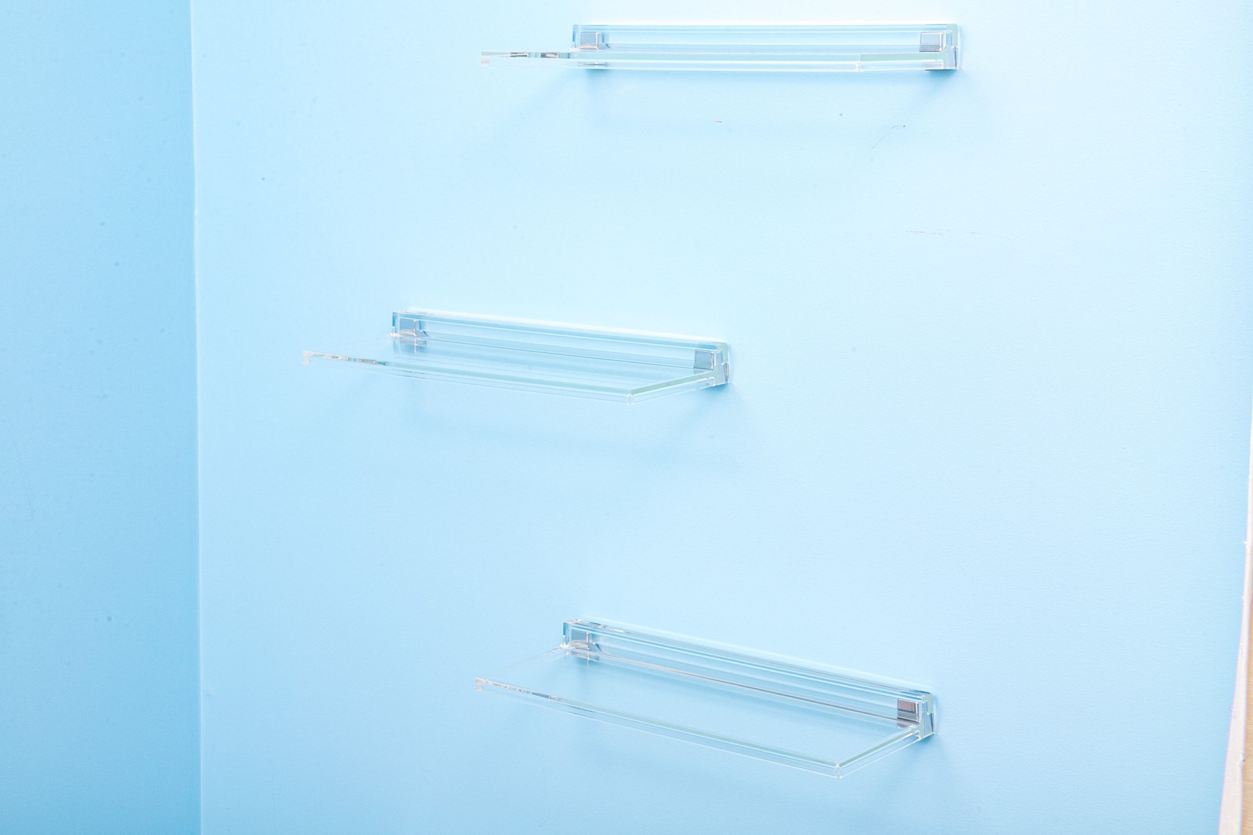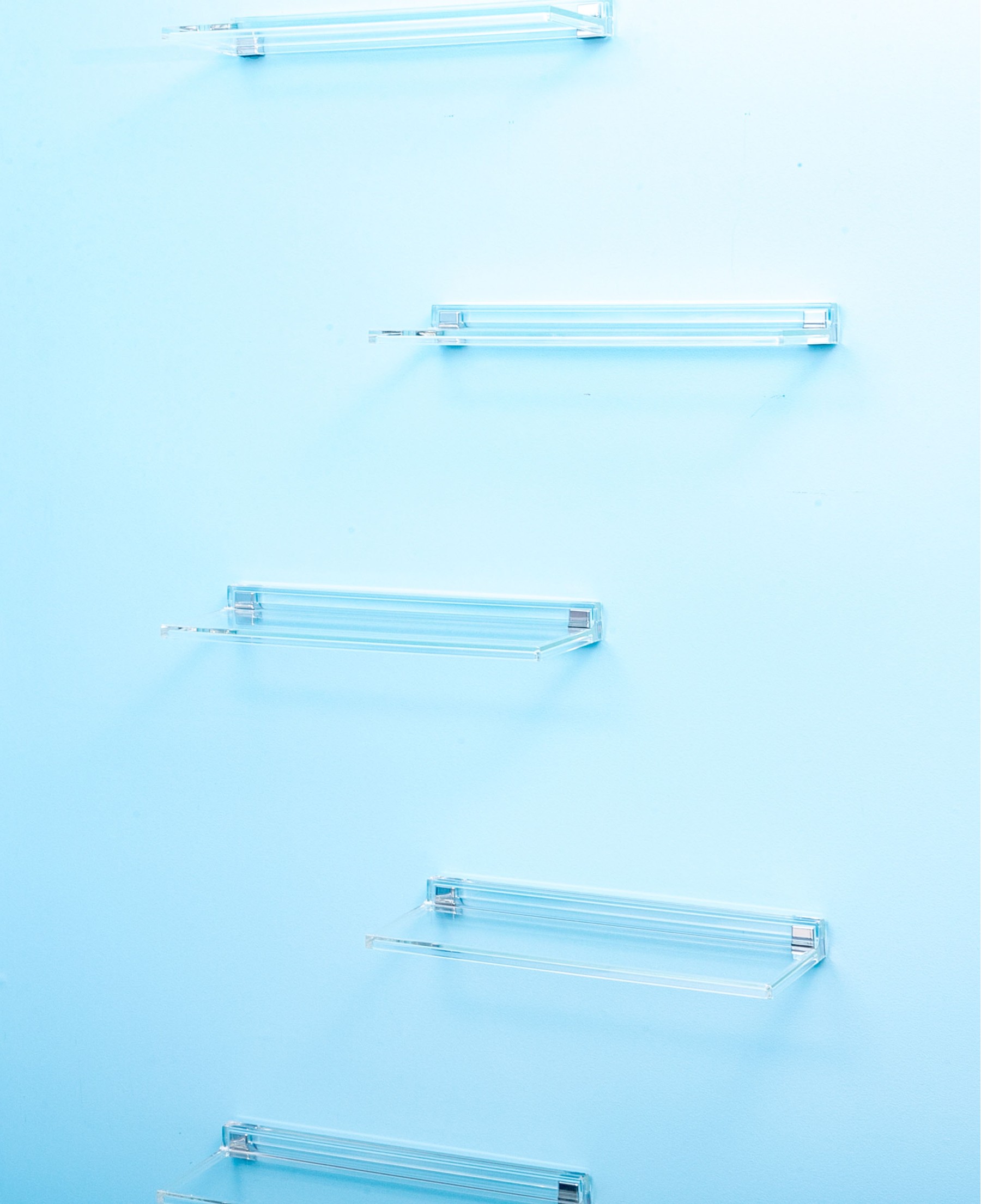 A set of five contemporary clear acrylic wall shelves providing a stylish, minimalist and airy display.