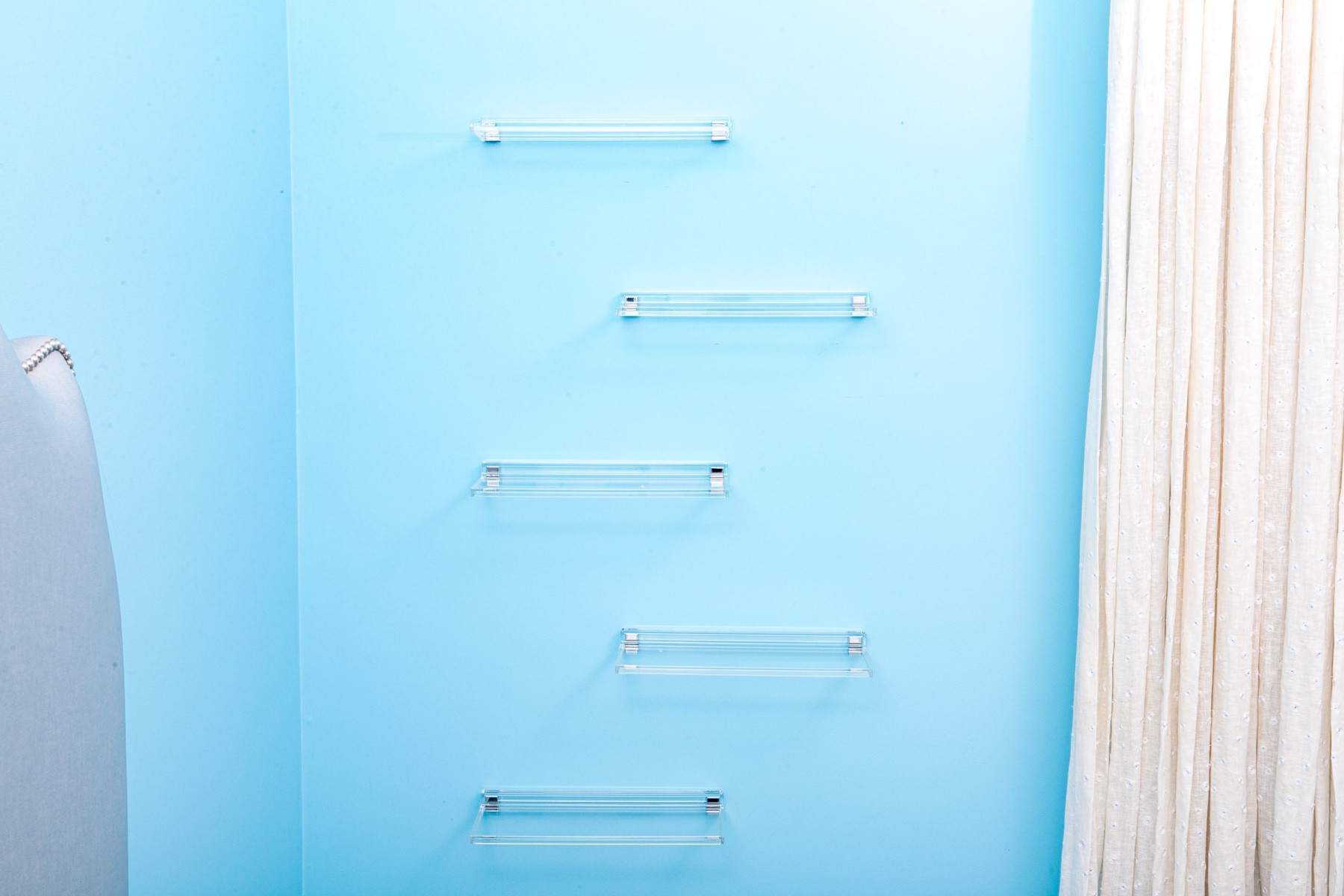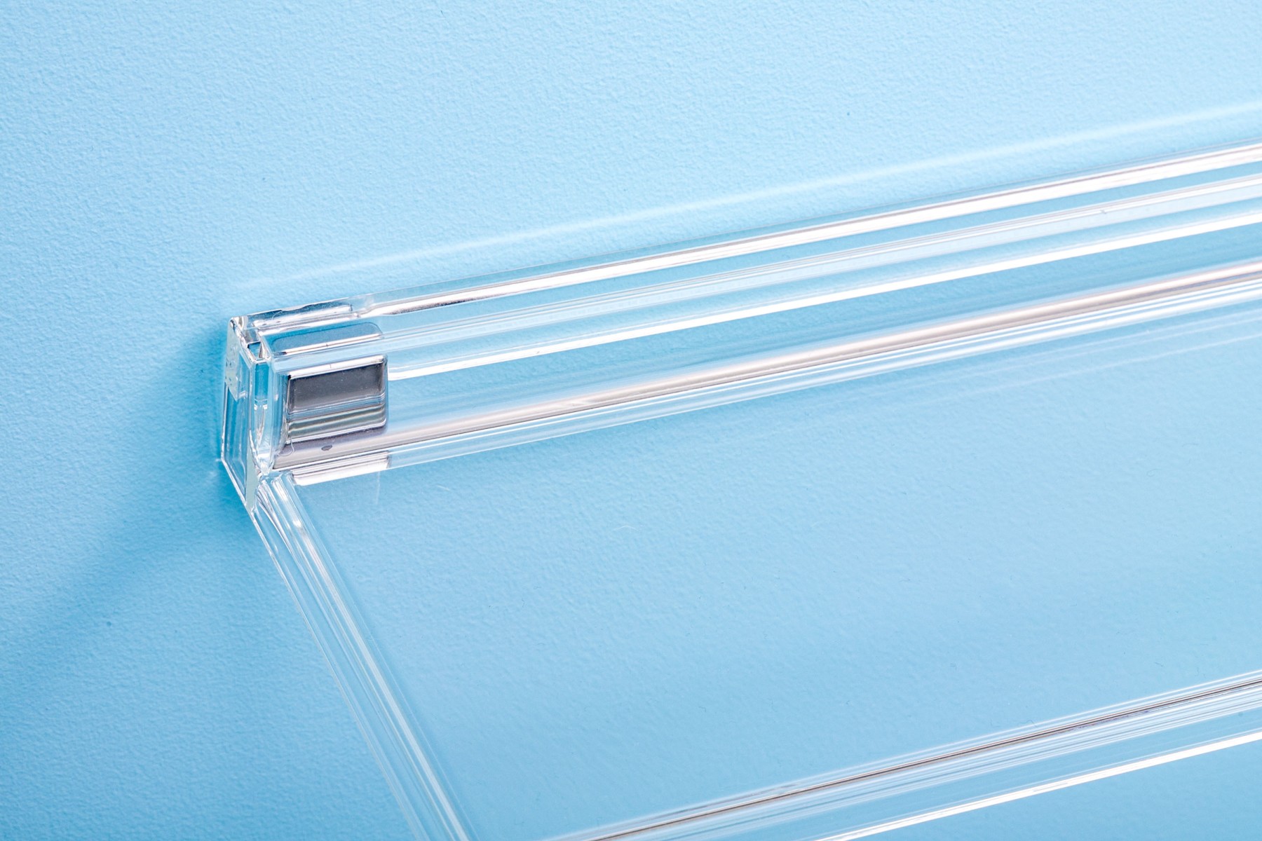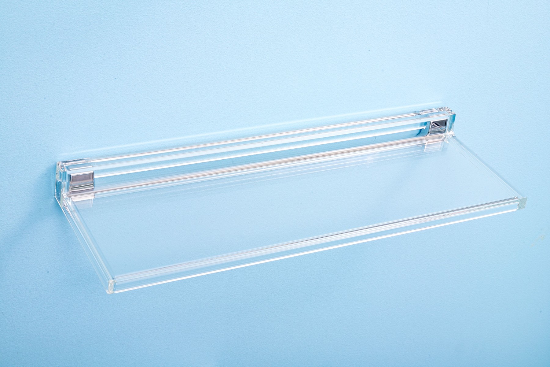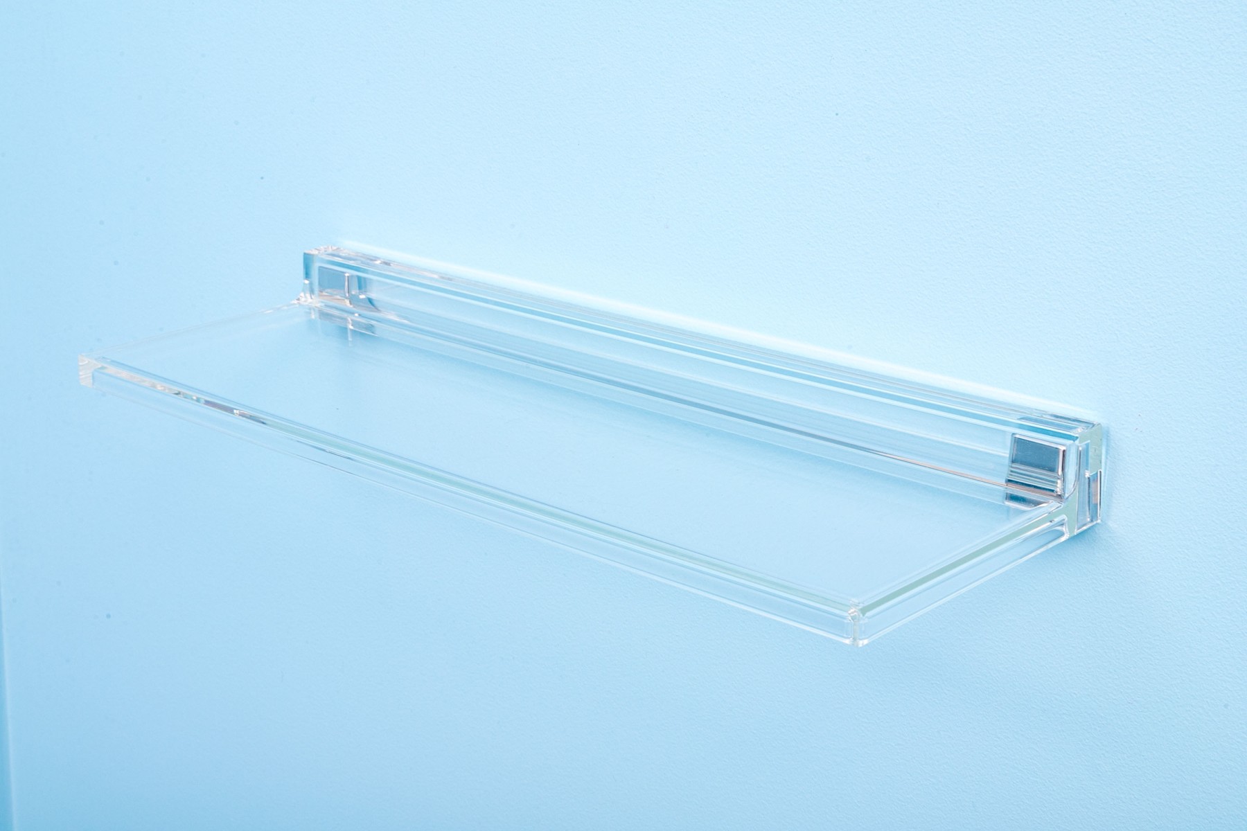 A set of five contemporary clear acrylic wall shelves providing a stylish, minimalist and airy display.