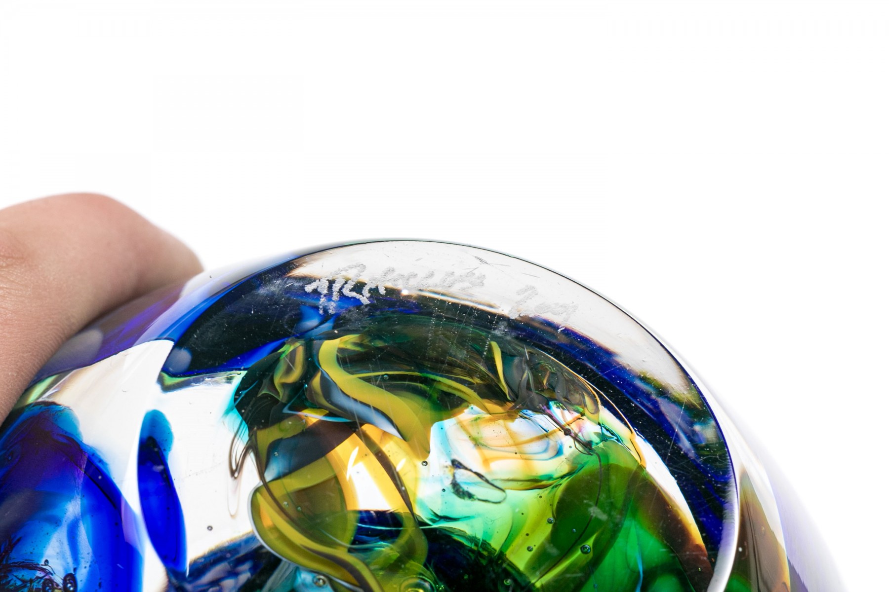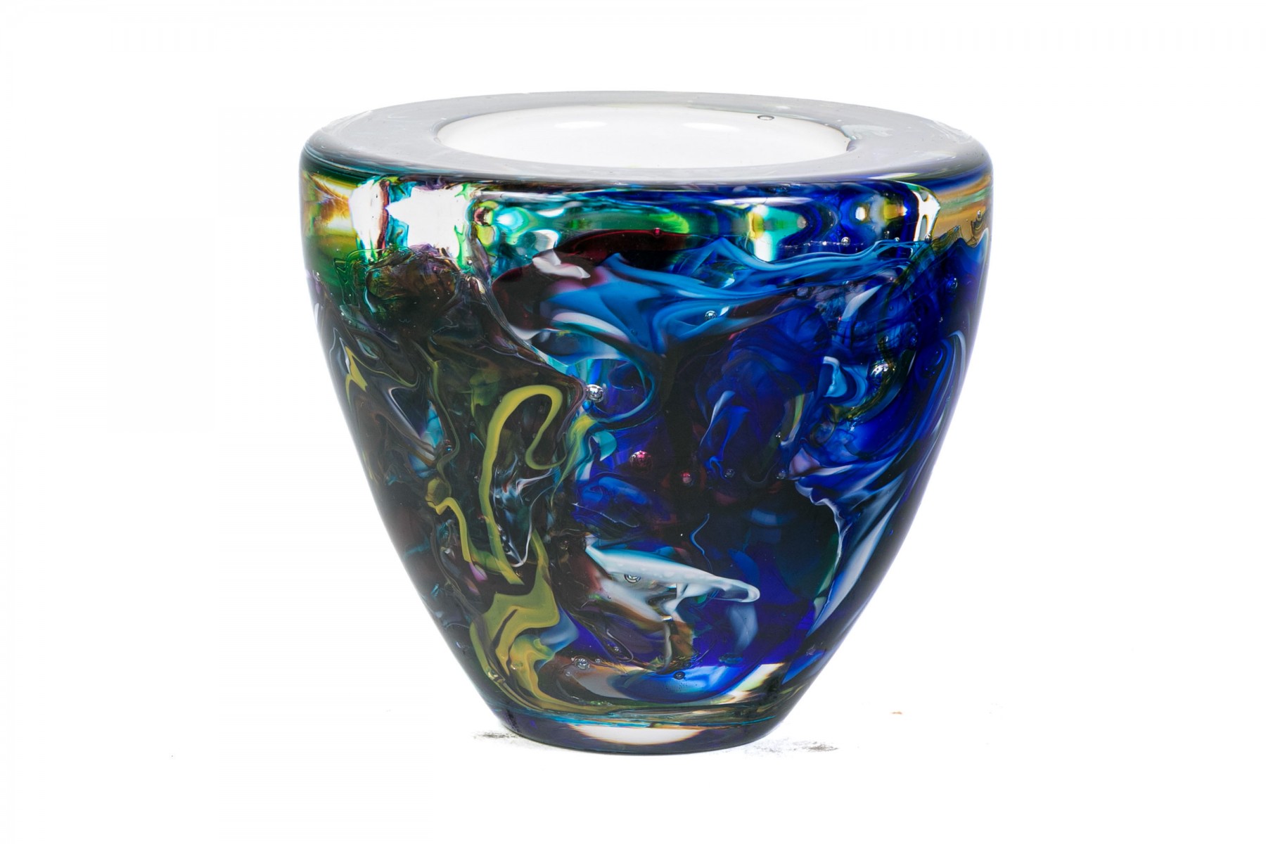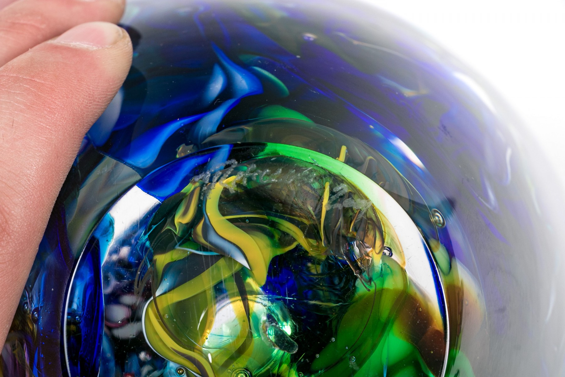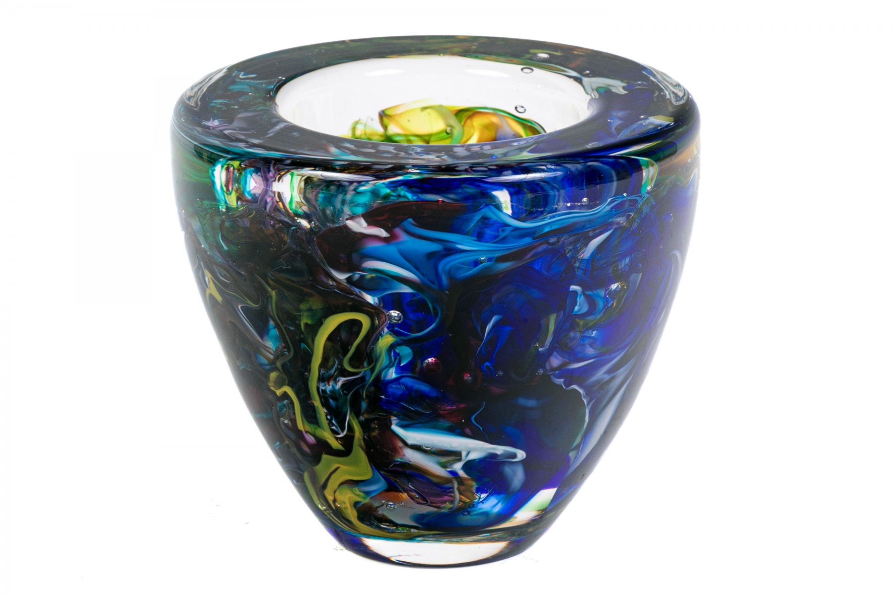 Signed on the base edge. A thick walled tapering round bowl in a millefiori style with colored swirls on blue.
