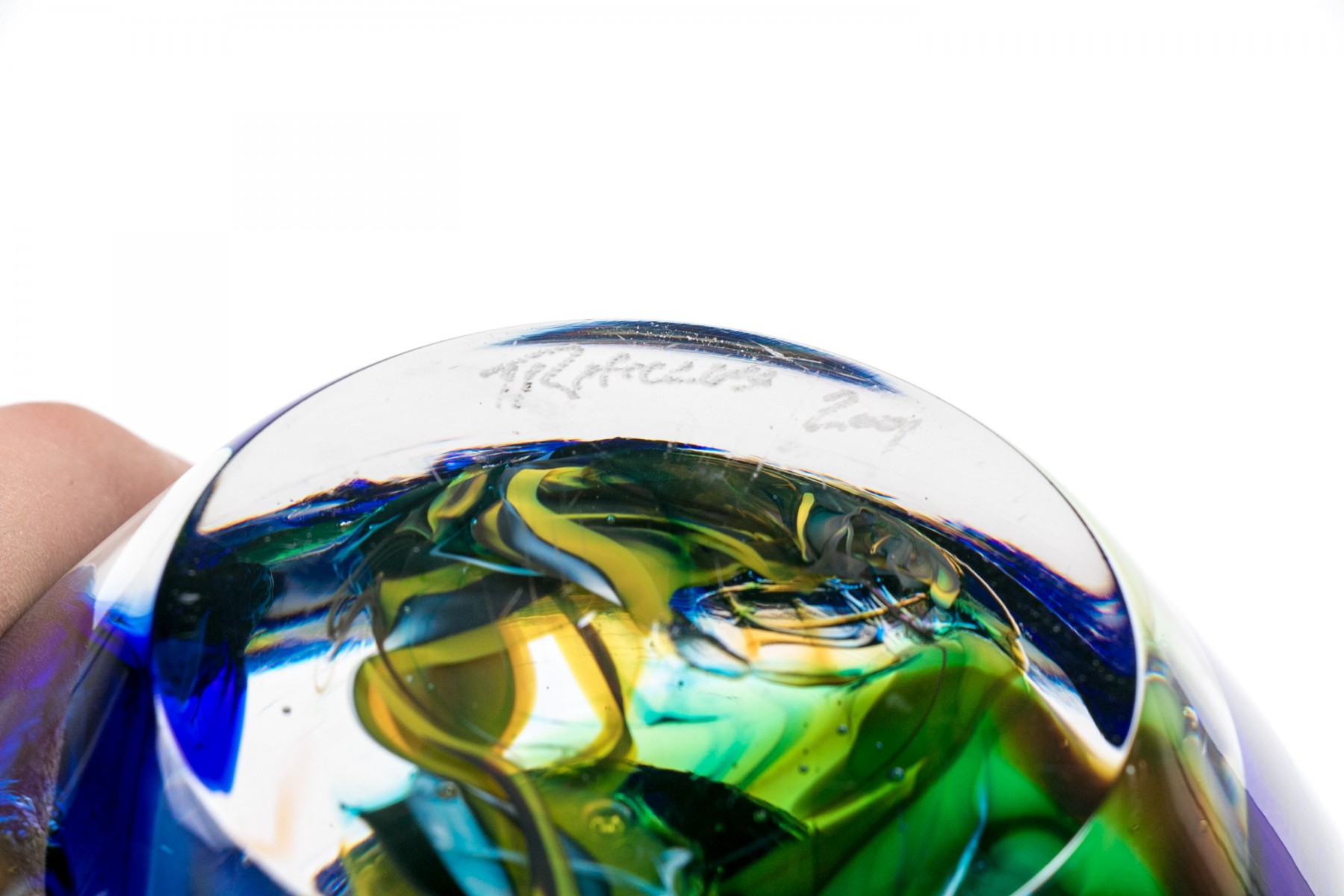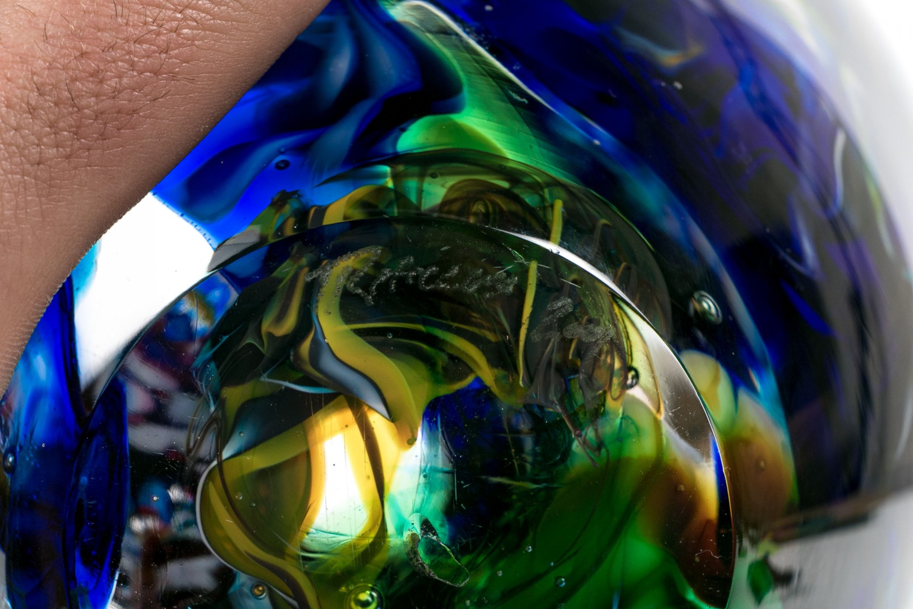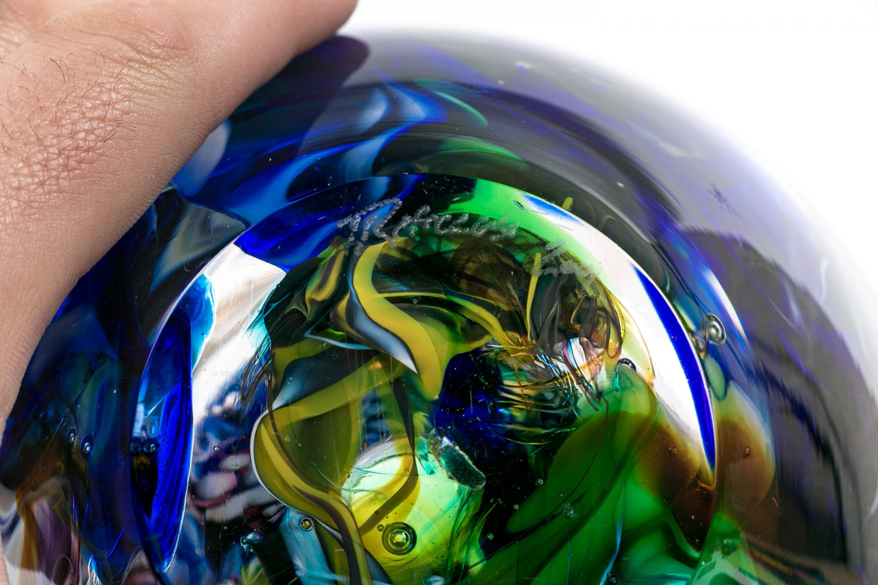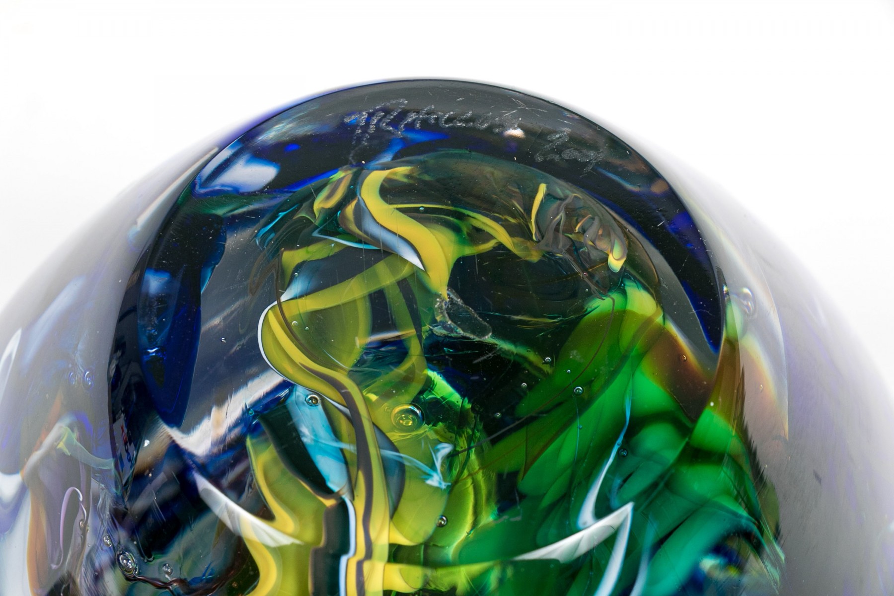 Signed on the base edge. A thick walled tapering round bowl in a millefiori style with colored swirls on blue.