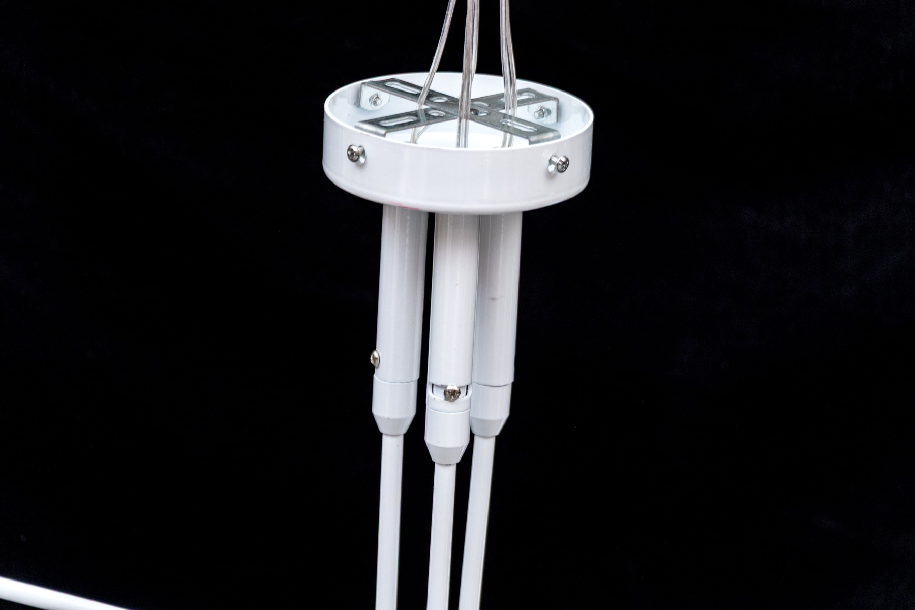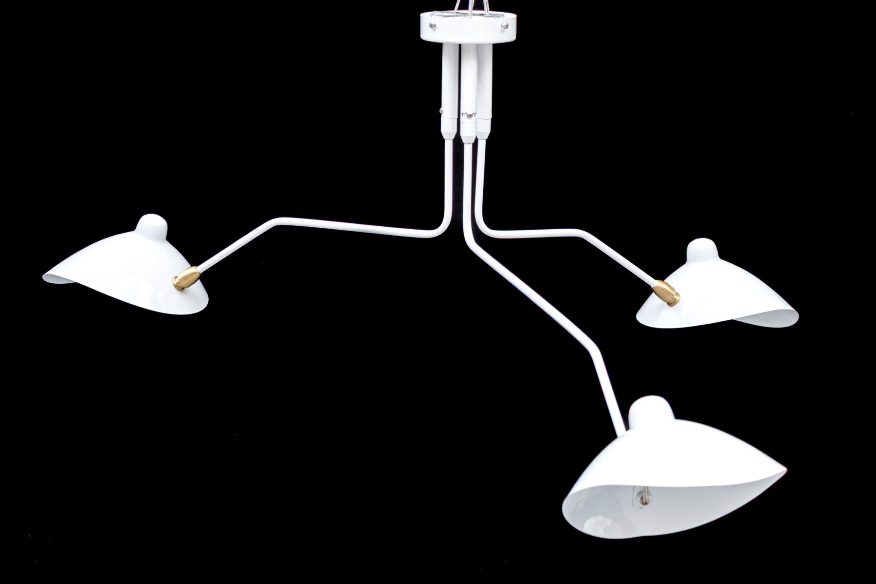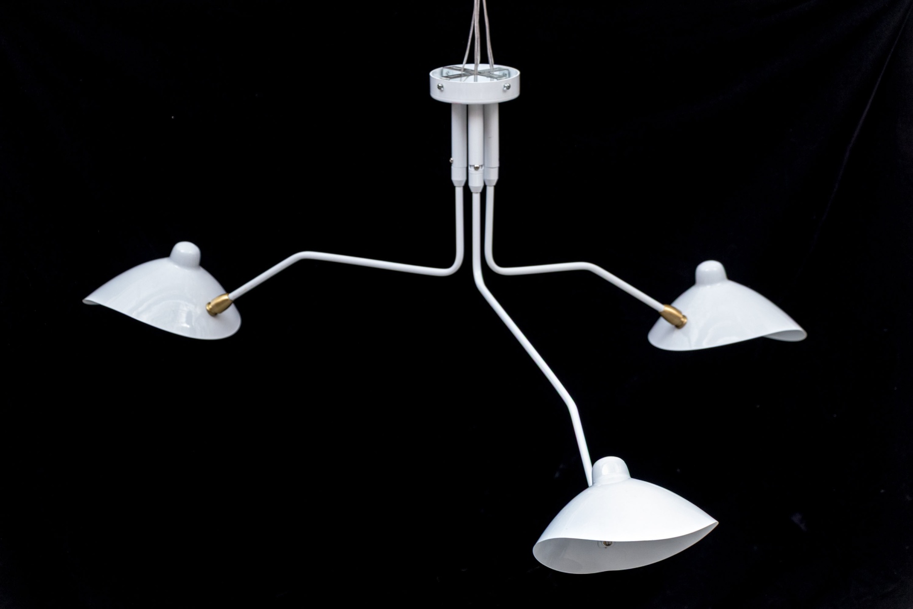 Cieling mounted with short central post having three arms with elbows at varying lengths. Each has a shaped white shade with brass fittings.